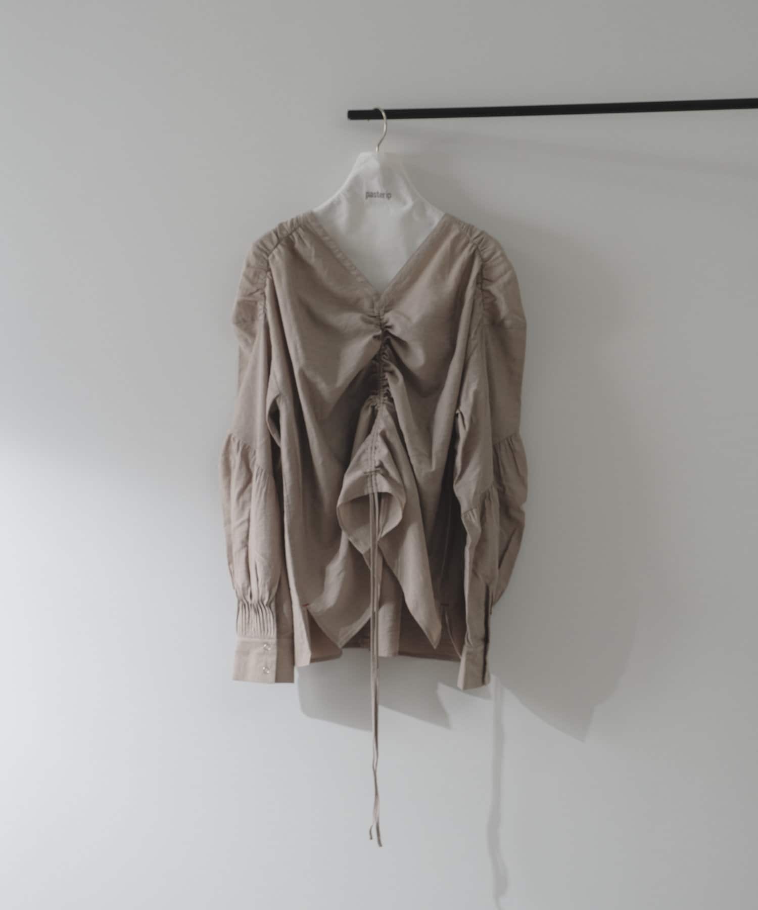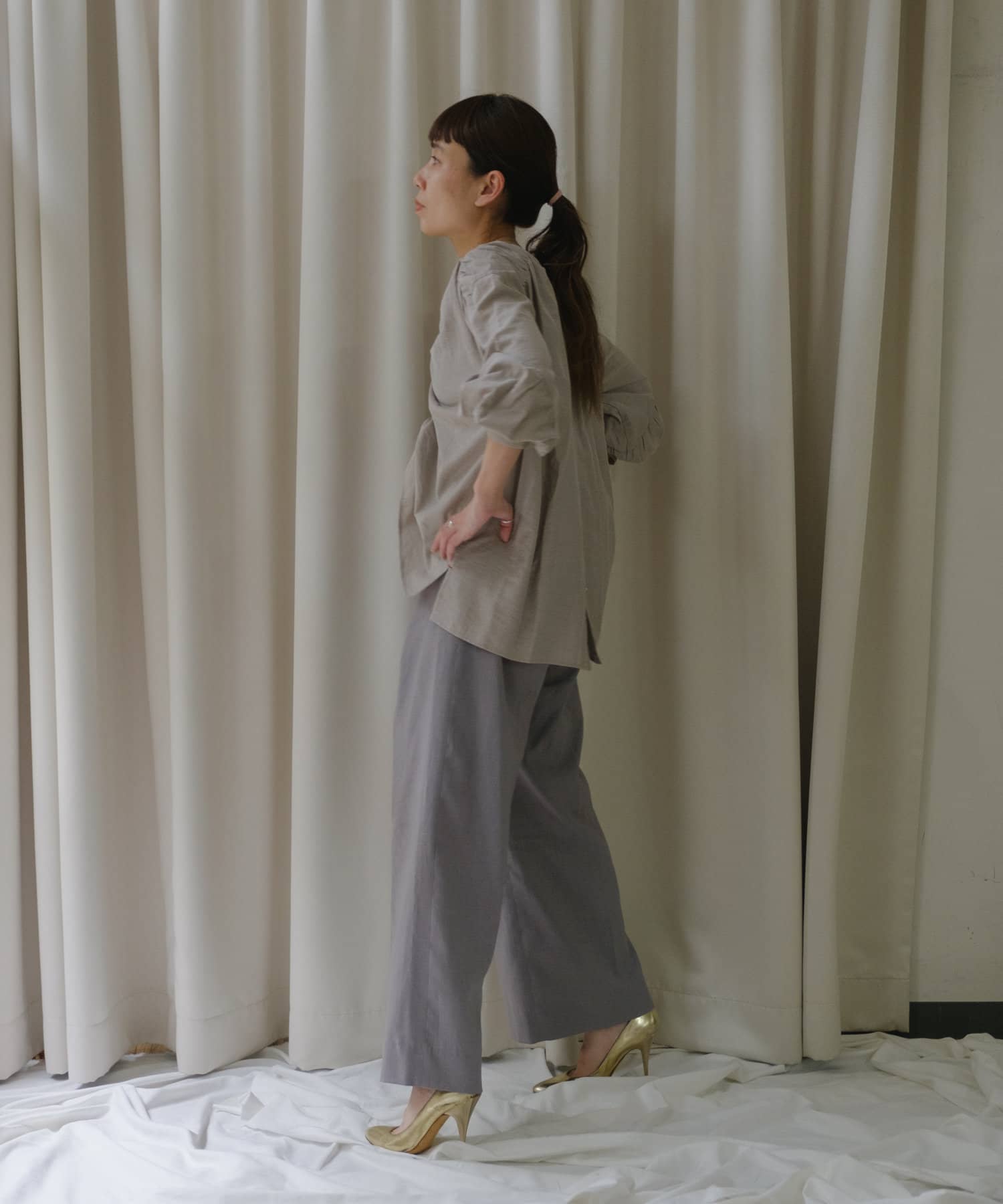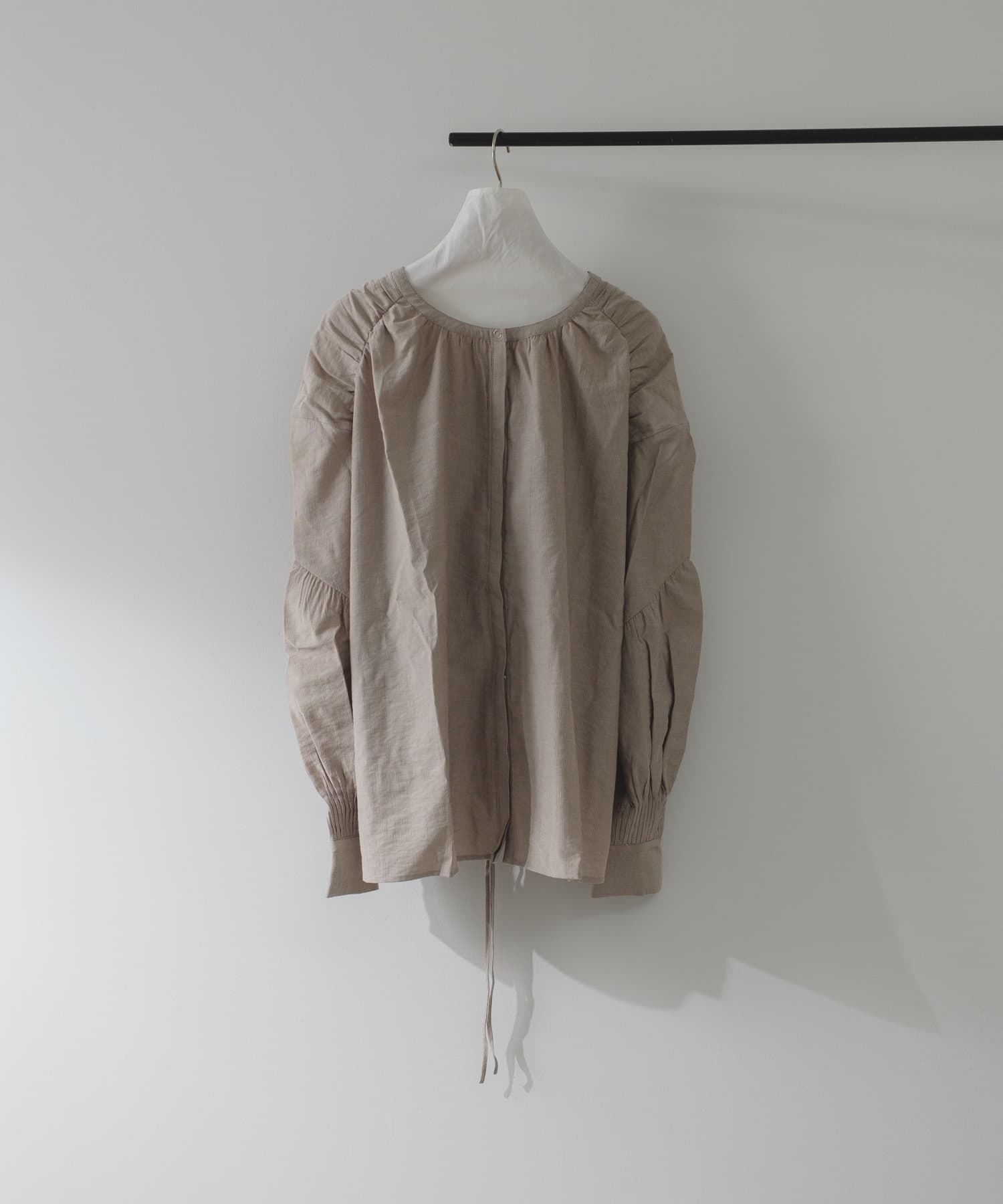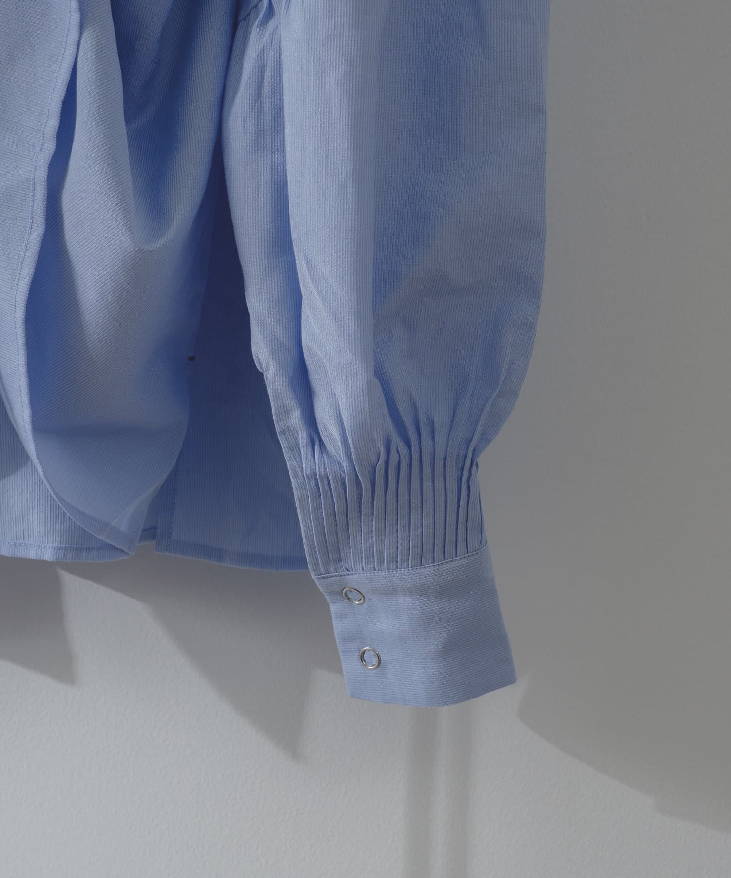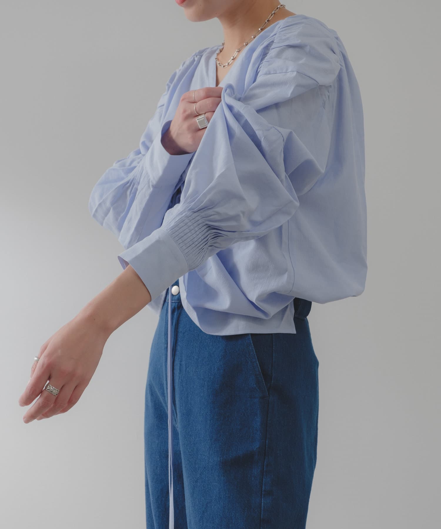 ギャザーとタックをたっぷり使って、袖や肩回りのシルエットに動きを付けました。袖のカフス上の細かいピンタックがデザインポイントです。