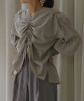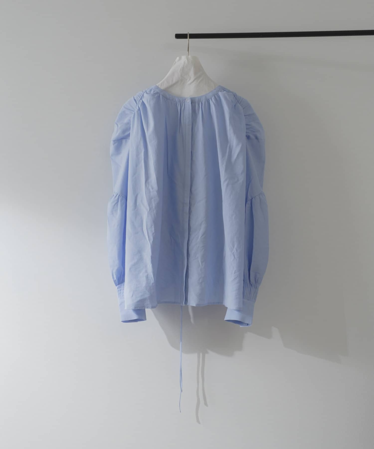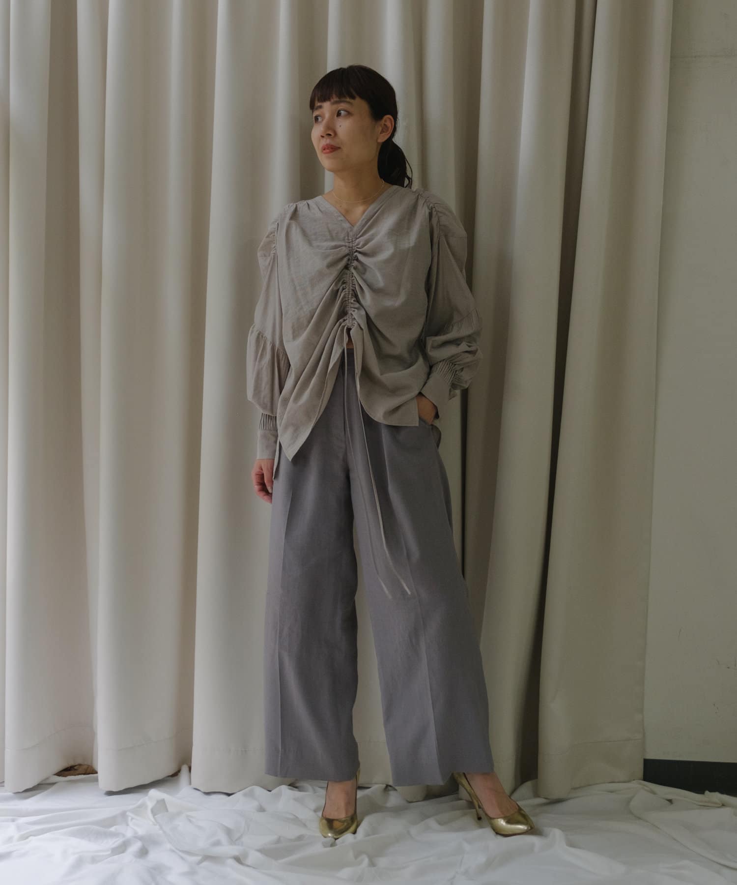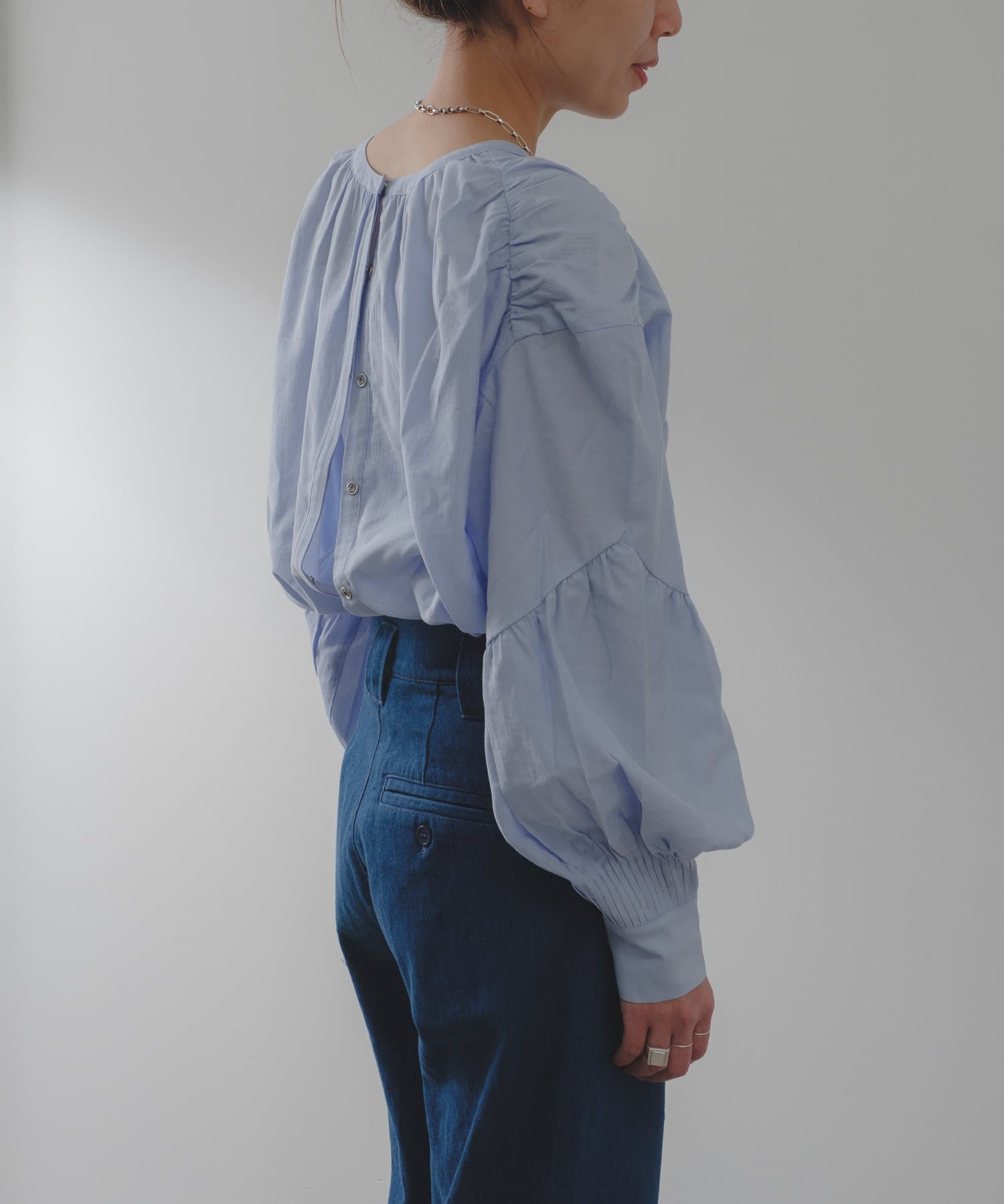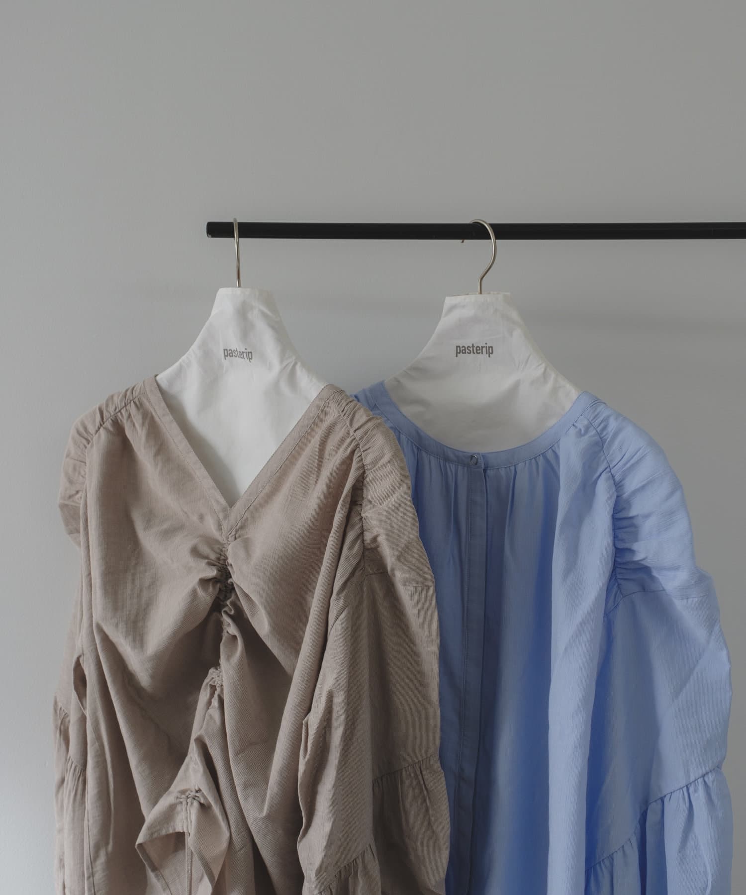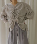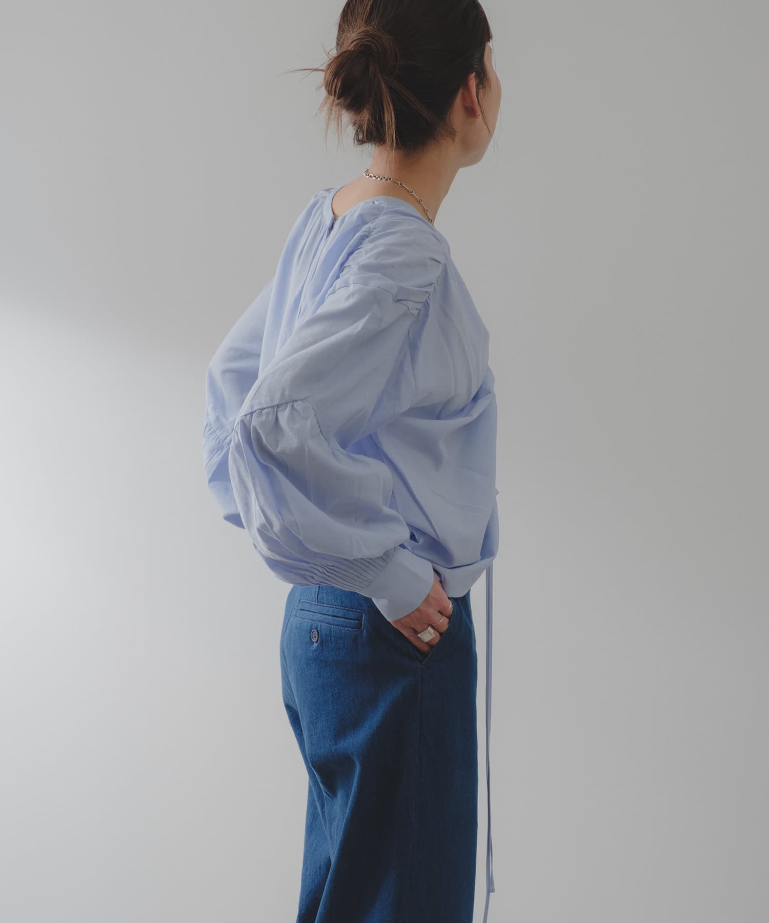 ギャザーとタックをたっぷり使って、袖や肩回りのシルエットに動きを付けました。袖のカフス上の細かいピンタックがデザインポイントです。