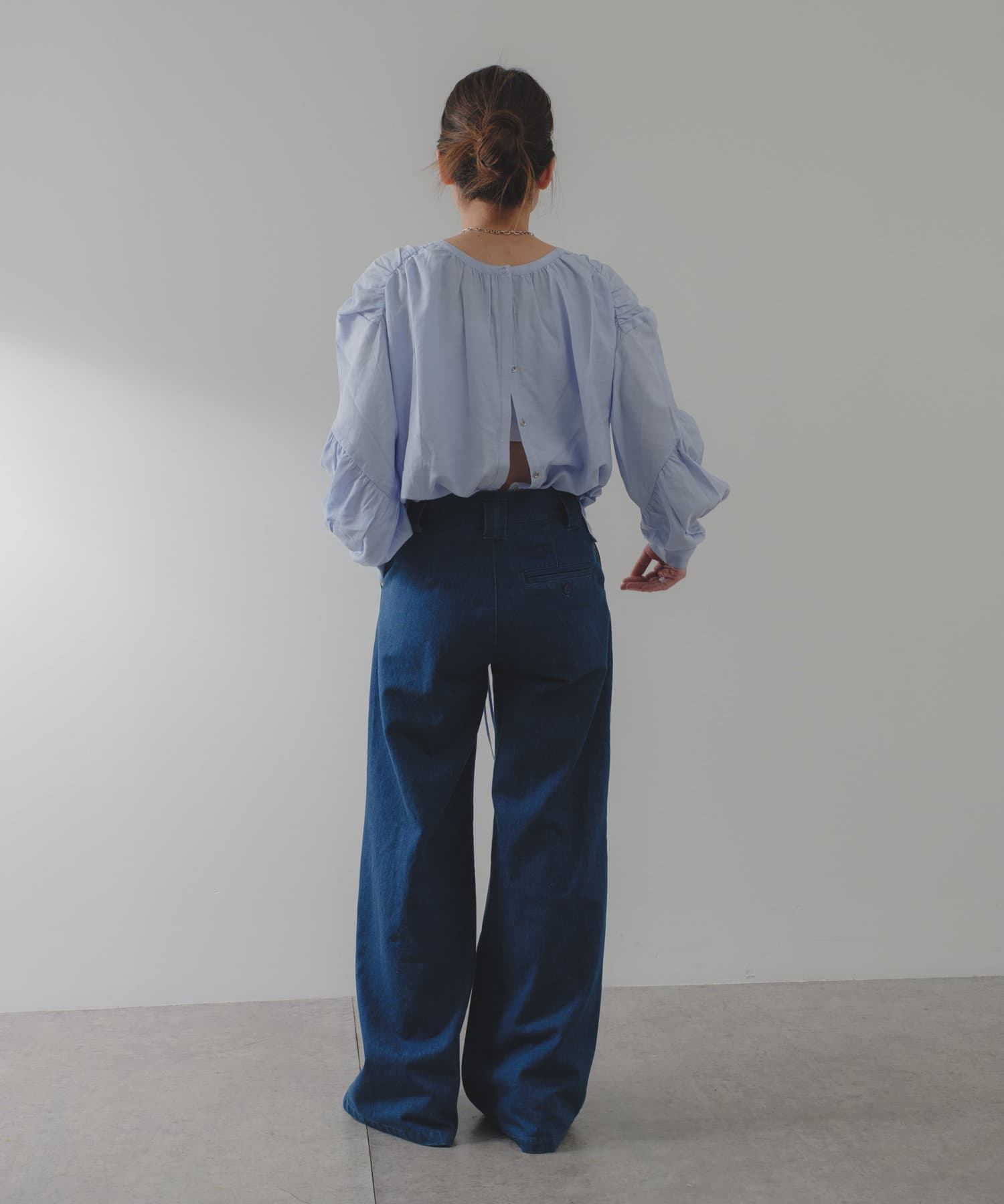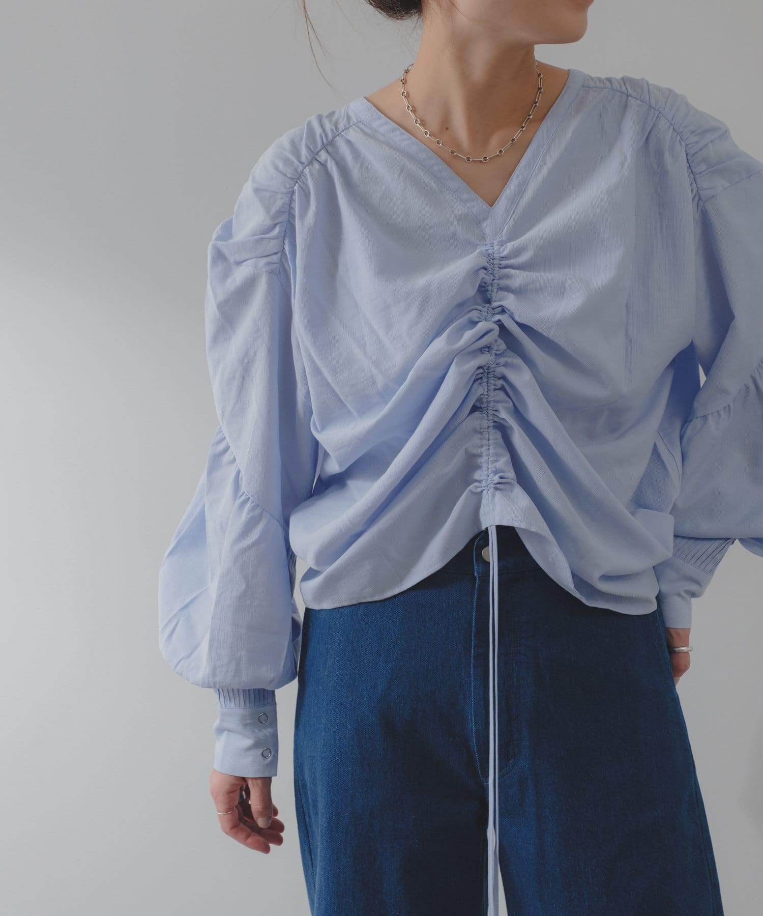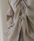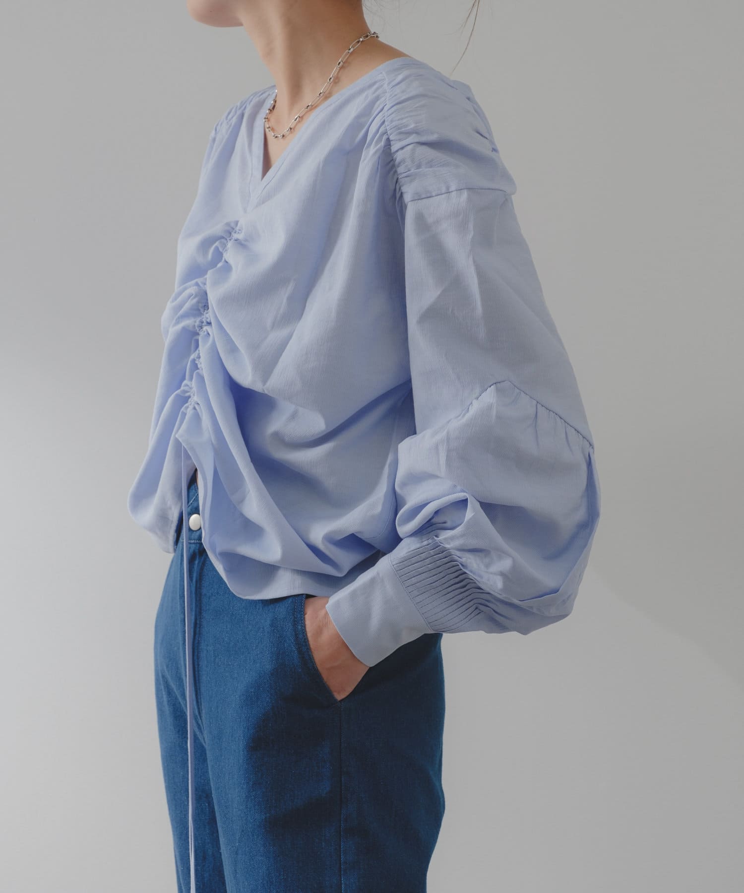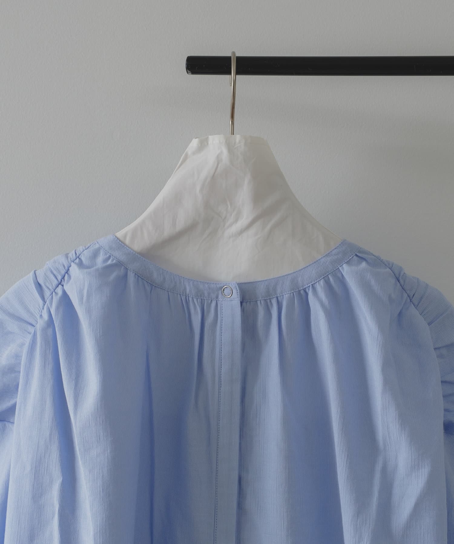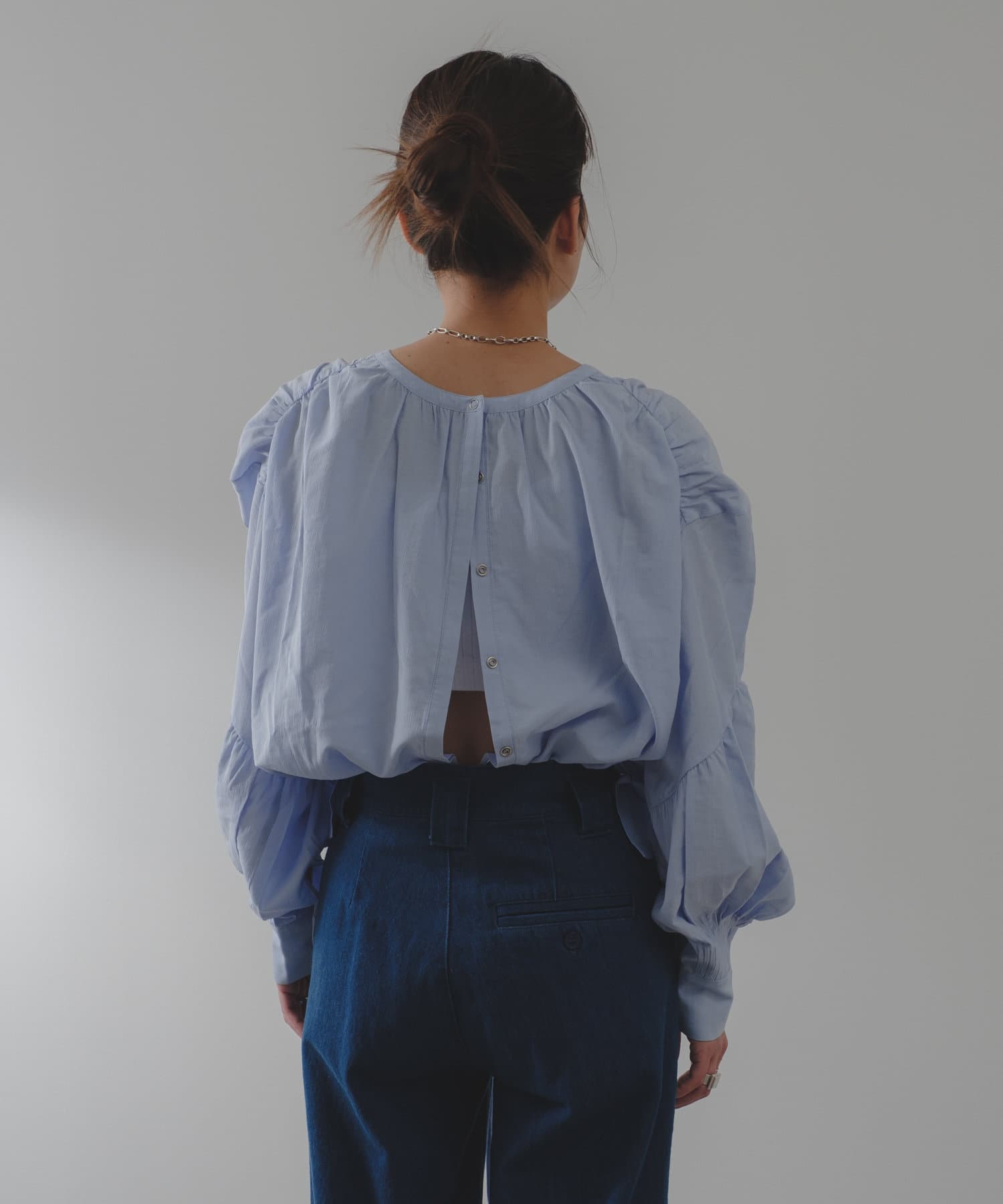 ギャザーとタックをたっぷり使って、袖や肩回りのシルエットに動きを付けました。袖のカフス上の細かいピンタックがデザインポイントです。