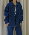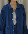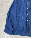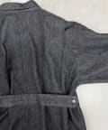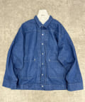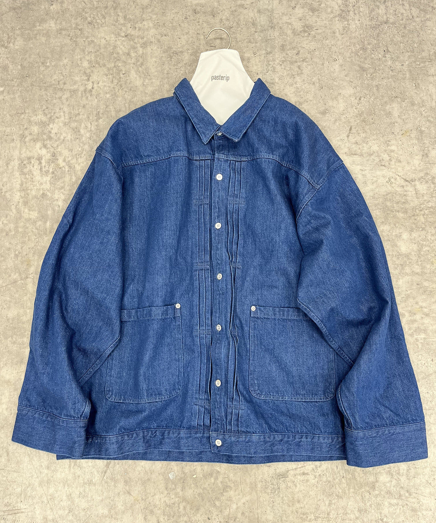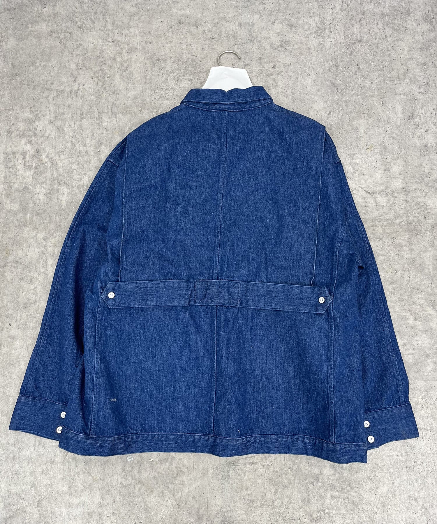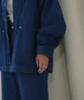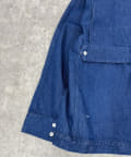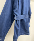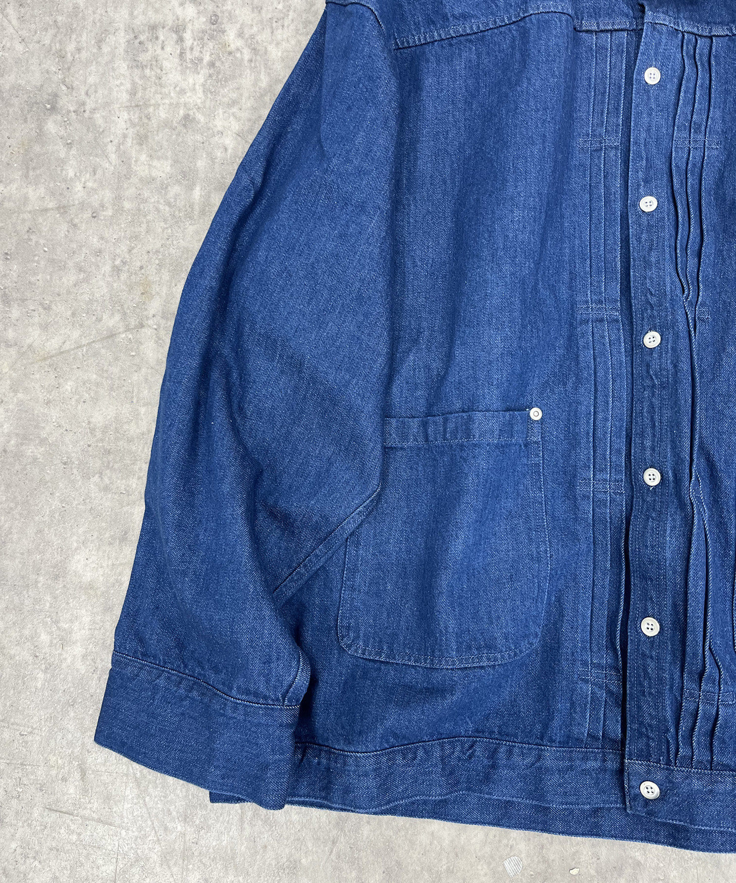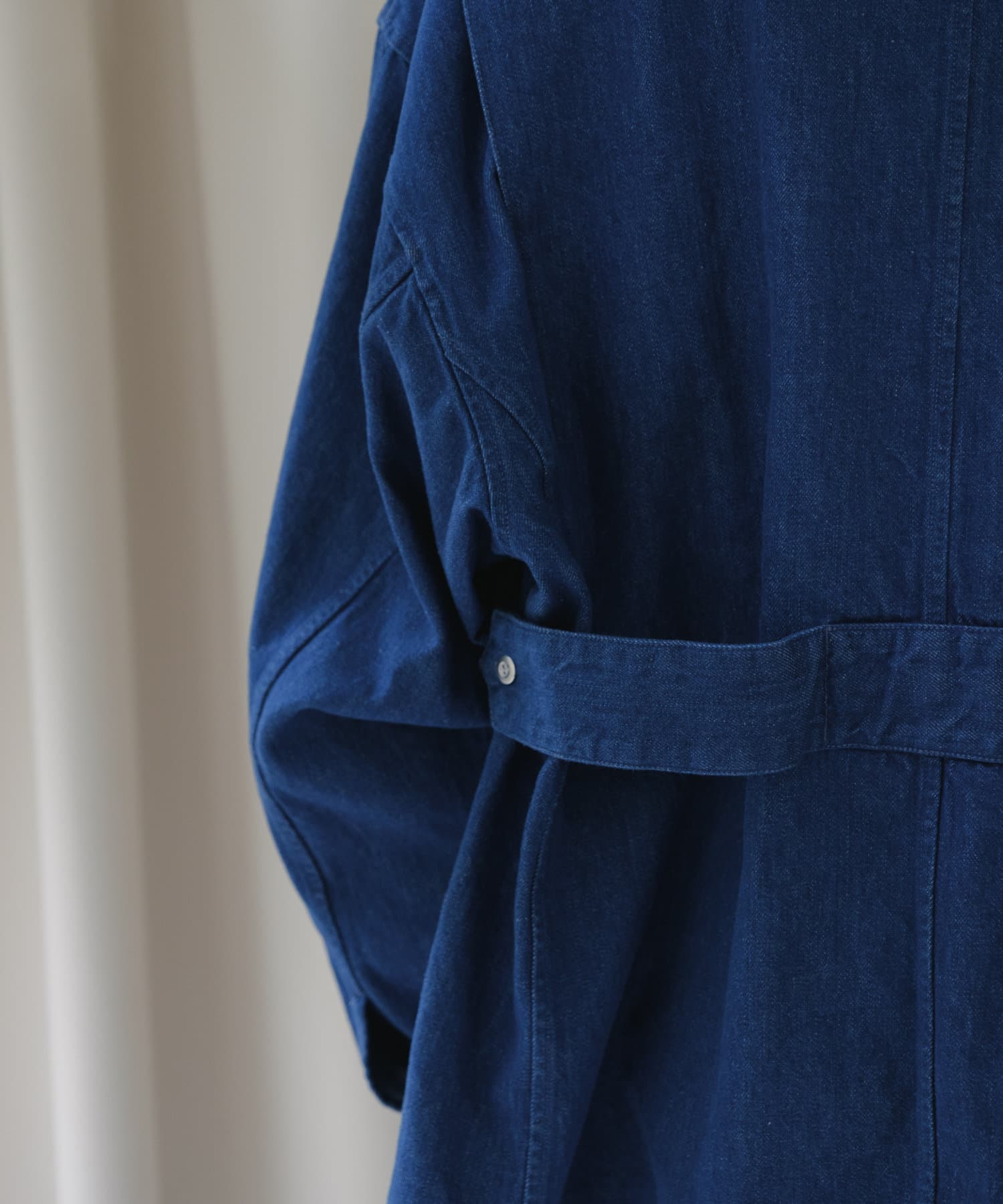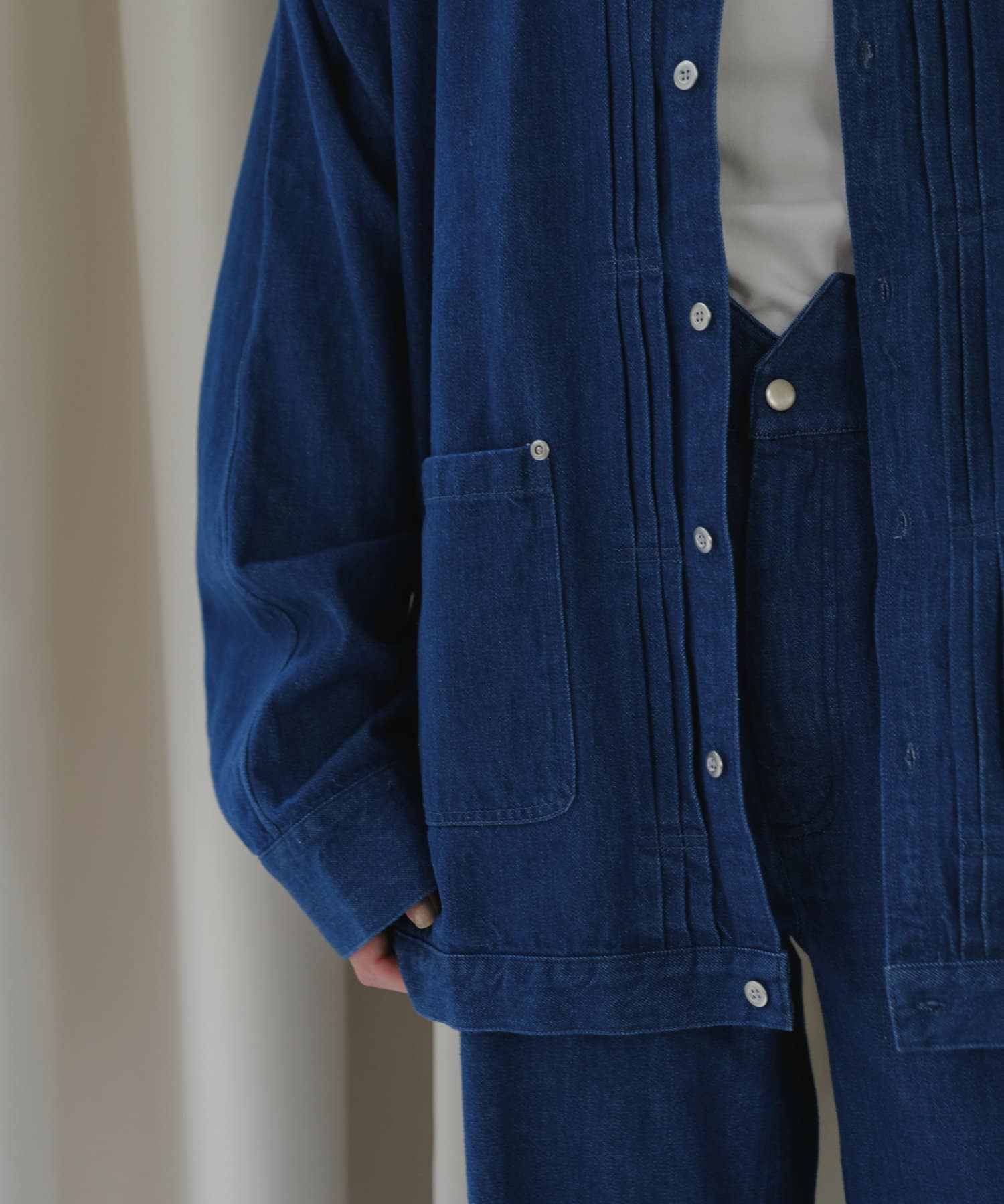 生地を触るとその柔らかに驚きます。使い古した古着のジャケットのような風合いを目指して、生地に柔軟加工をかけてごわつきや窮屈感のない仕上がりになりました。使用したのは11.5オンスの国内生産のデニム生地。たっぷりとアーム幅をとっており、ルーズなサイジングでざっくりと羽織っていただけます。
