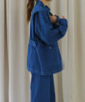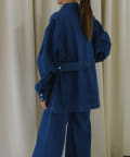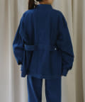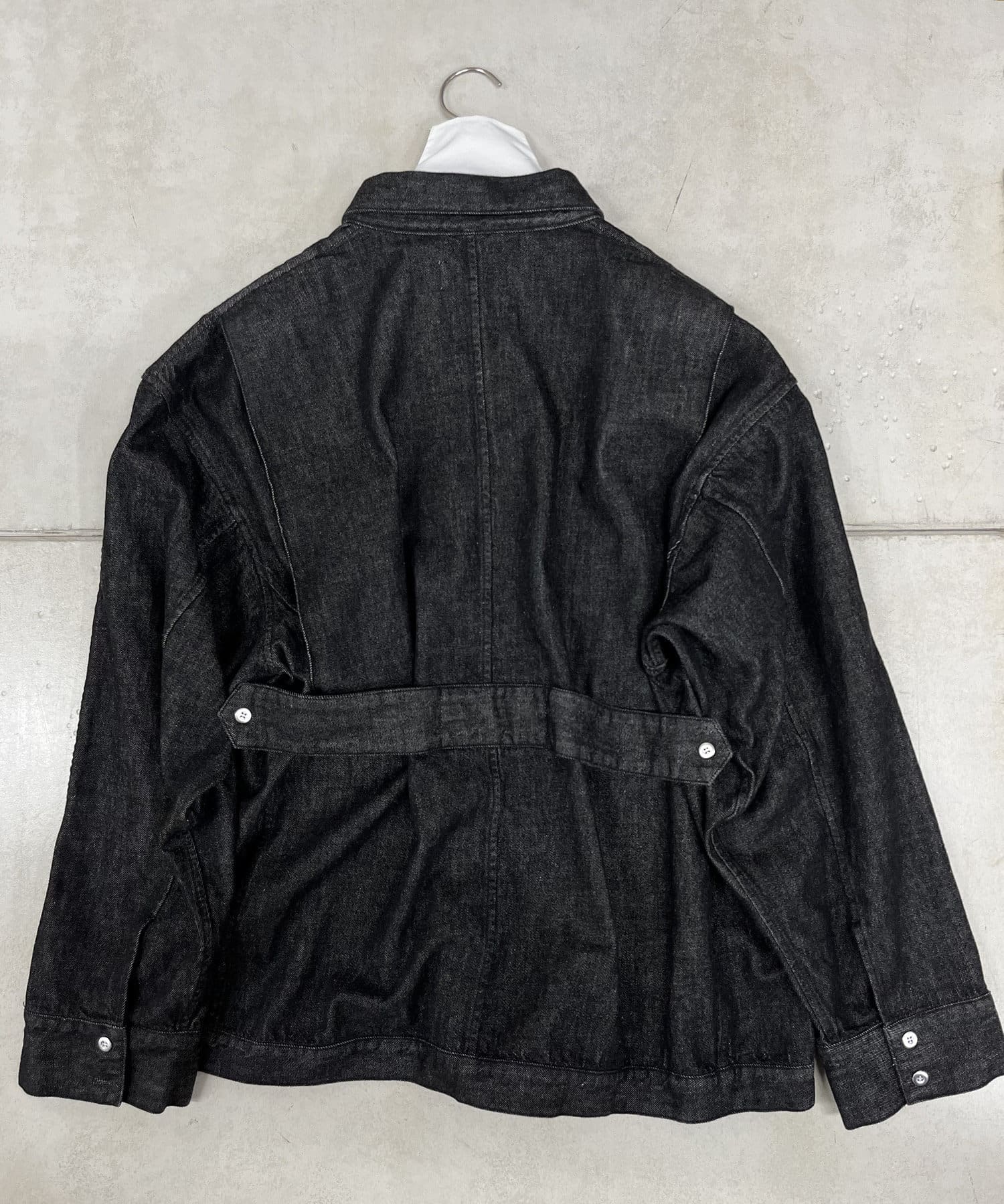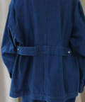 前から見るとシンプルなジャケットですが、拘ったのはBACKデザイン。肩まわりを動かしやすいよう、作業着やミリタリーウェアのディティールに習いアクションプリーツ(肩回りに入ったタック)を入れています。また、共生地のベルトを装着しており、釦でウエストを縮めてシルエットに変化をつけて着用いただくことも可能。
