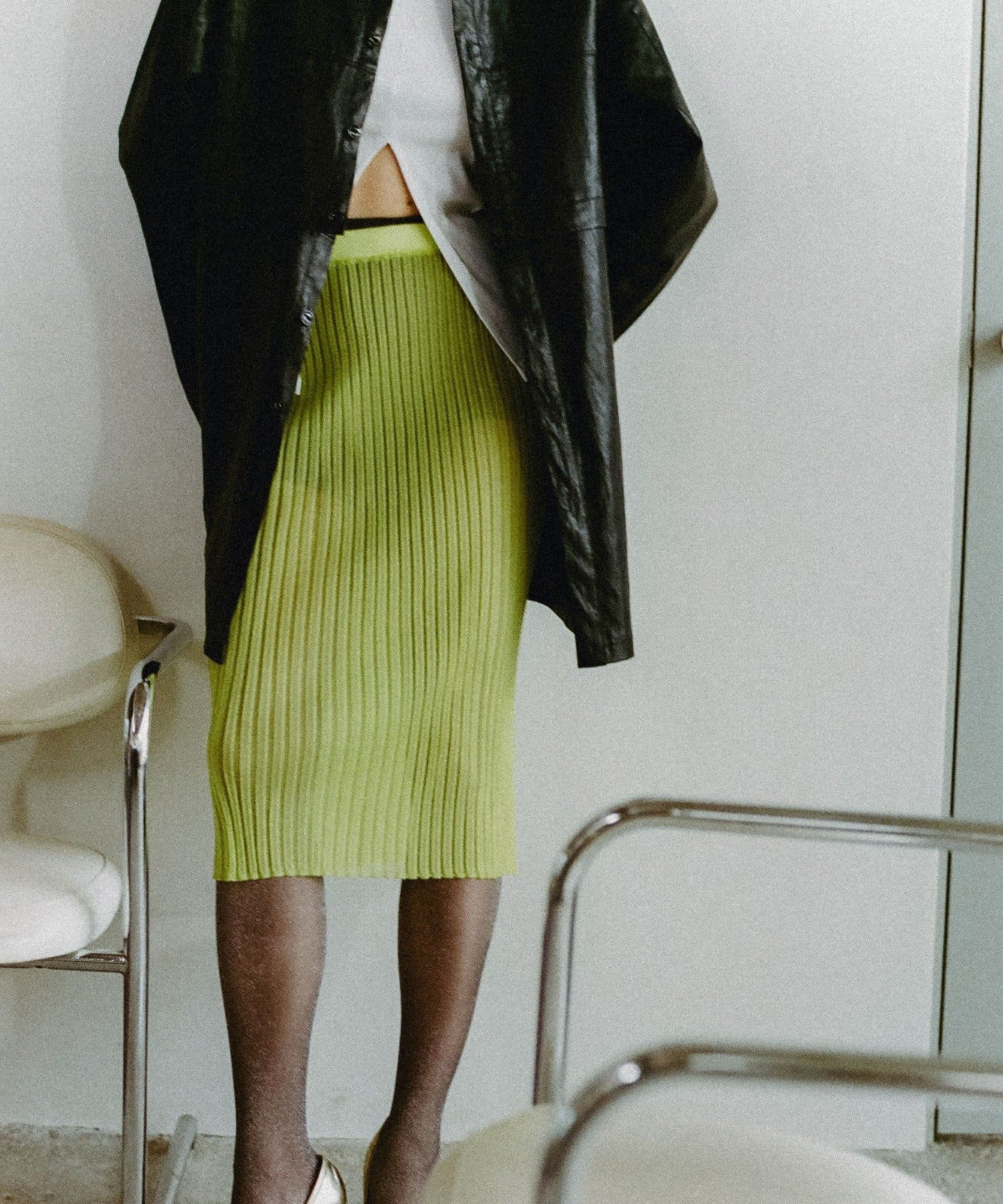 まるでオーガンジーのように透けるニット。極細番手のナイロン×ポリエステルの特殊な糸をリブ編みにすることで透け感の凹凸ができ、その表面感を活かしてミドルスカートとグローブを作成しました。