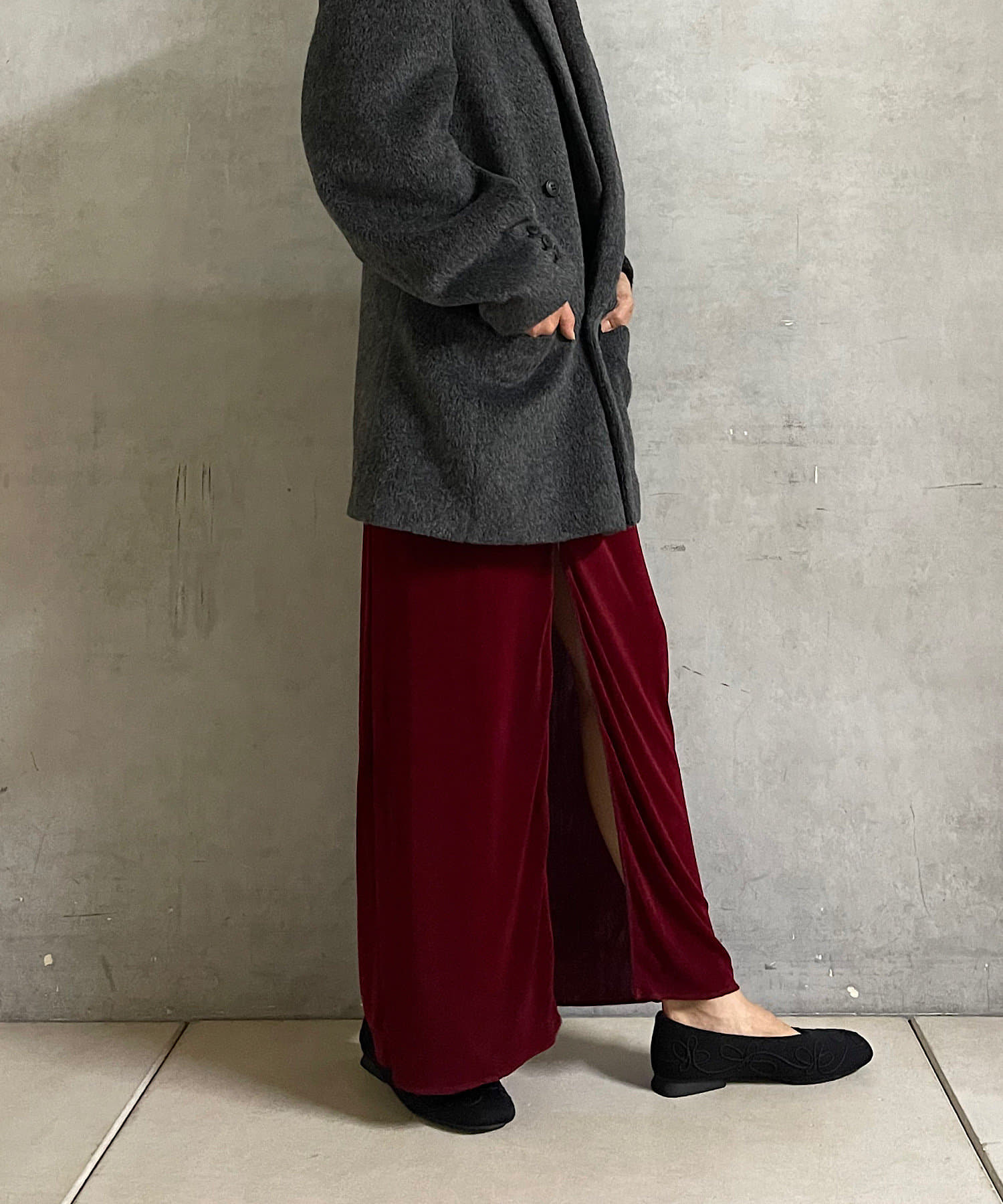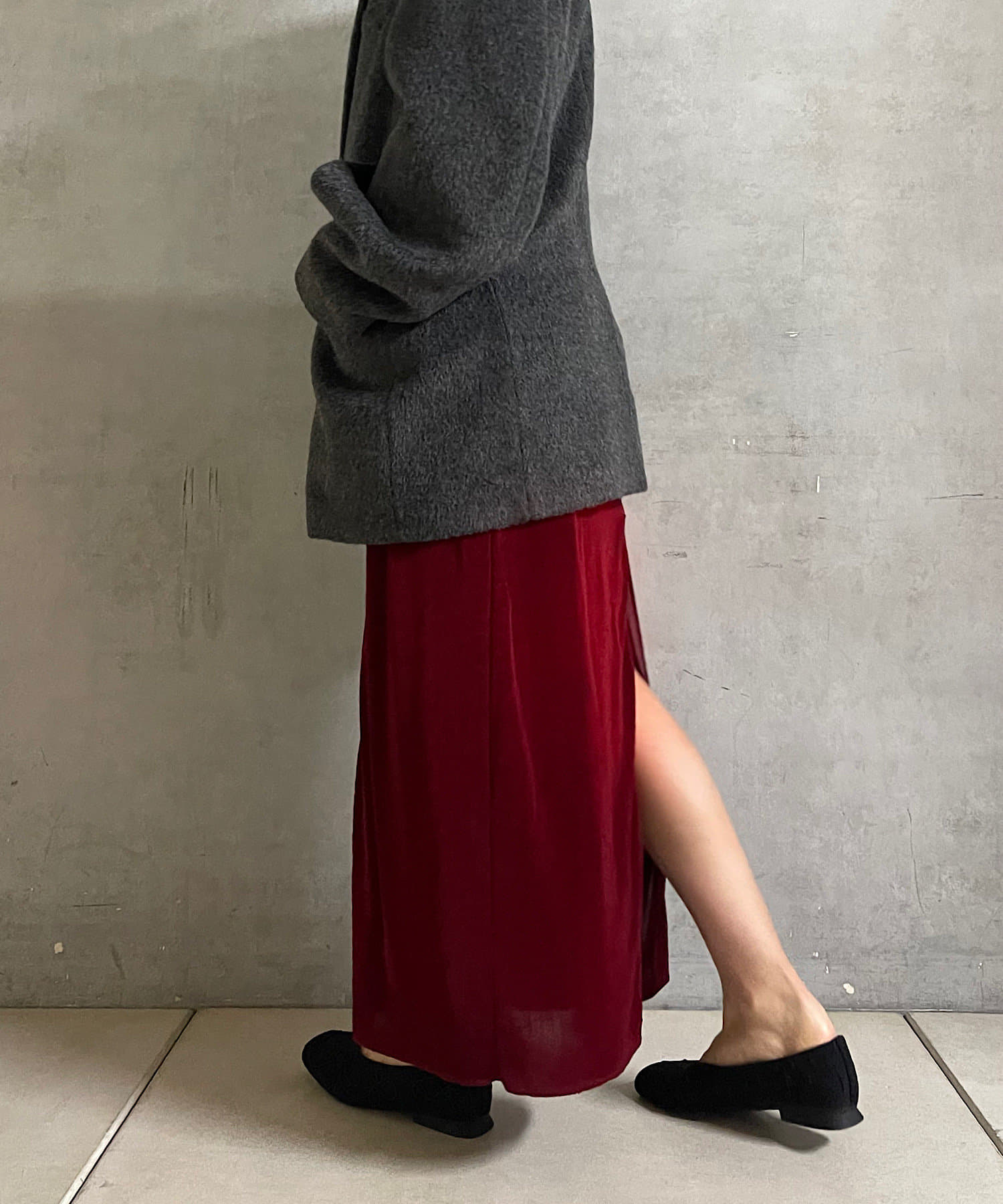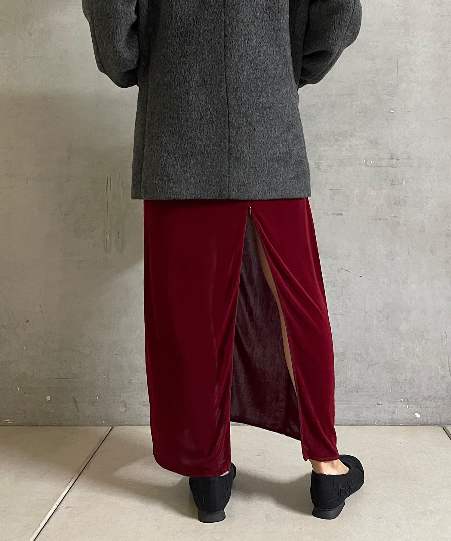 前後身頃中心には裾から57cmのロングファスナーが付いています。開け閉めすることでスリットデザインを自由自在にいれられる仕掛け。