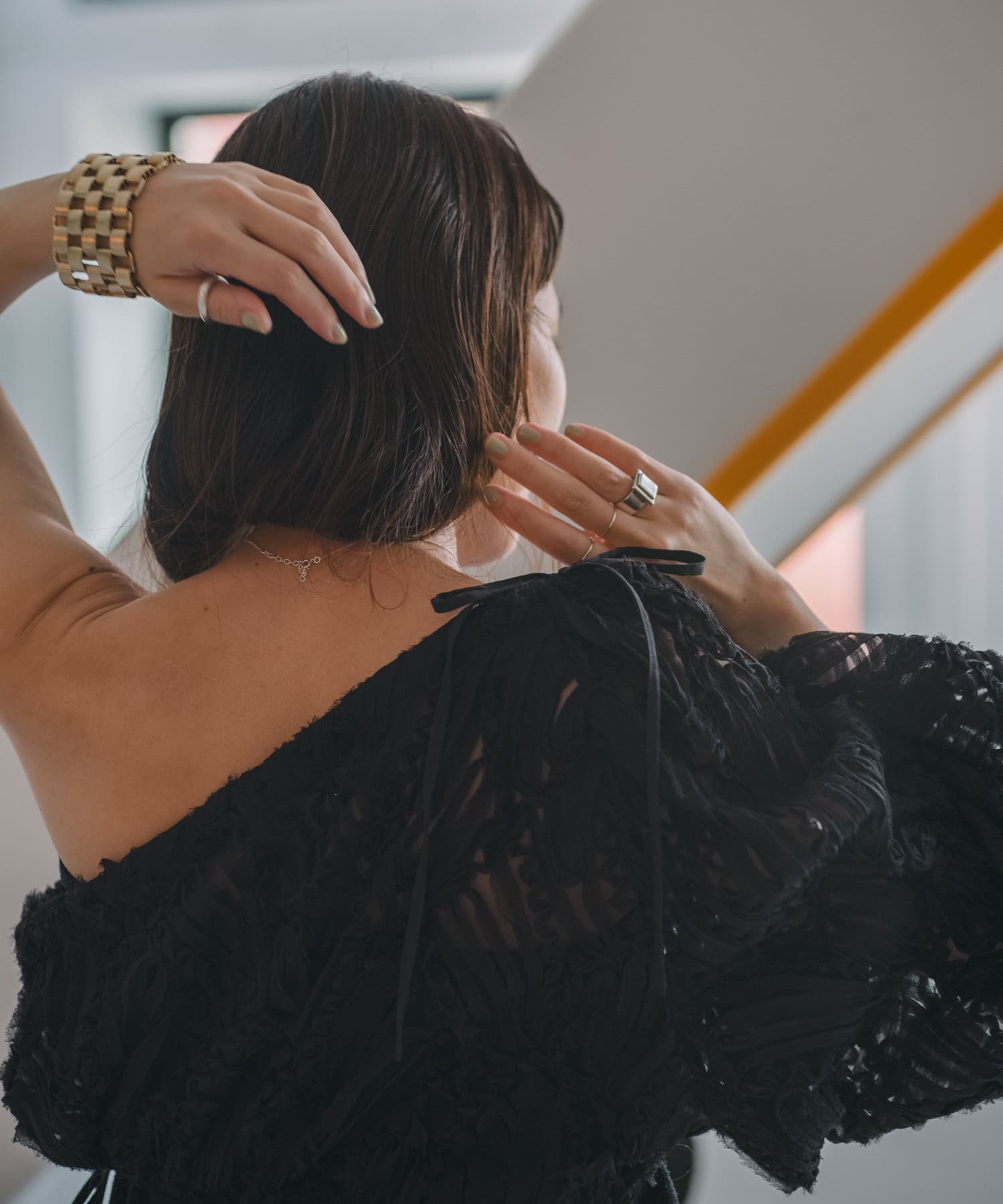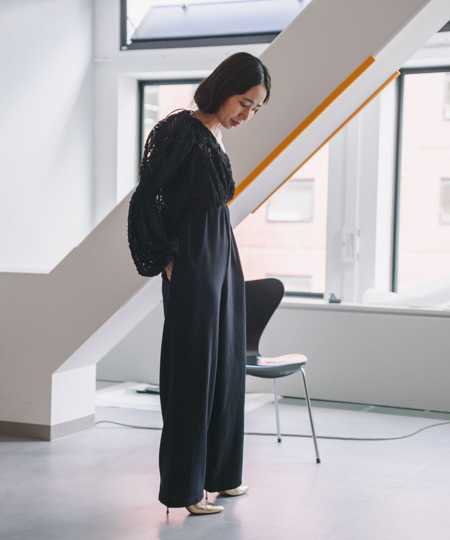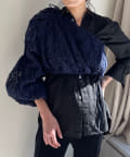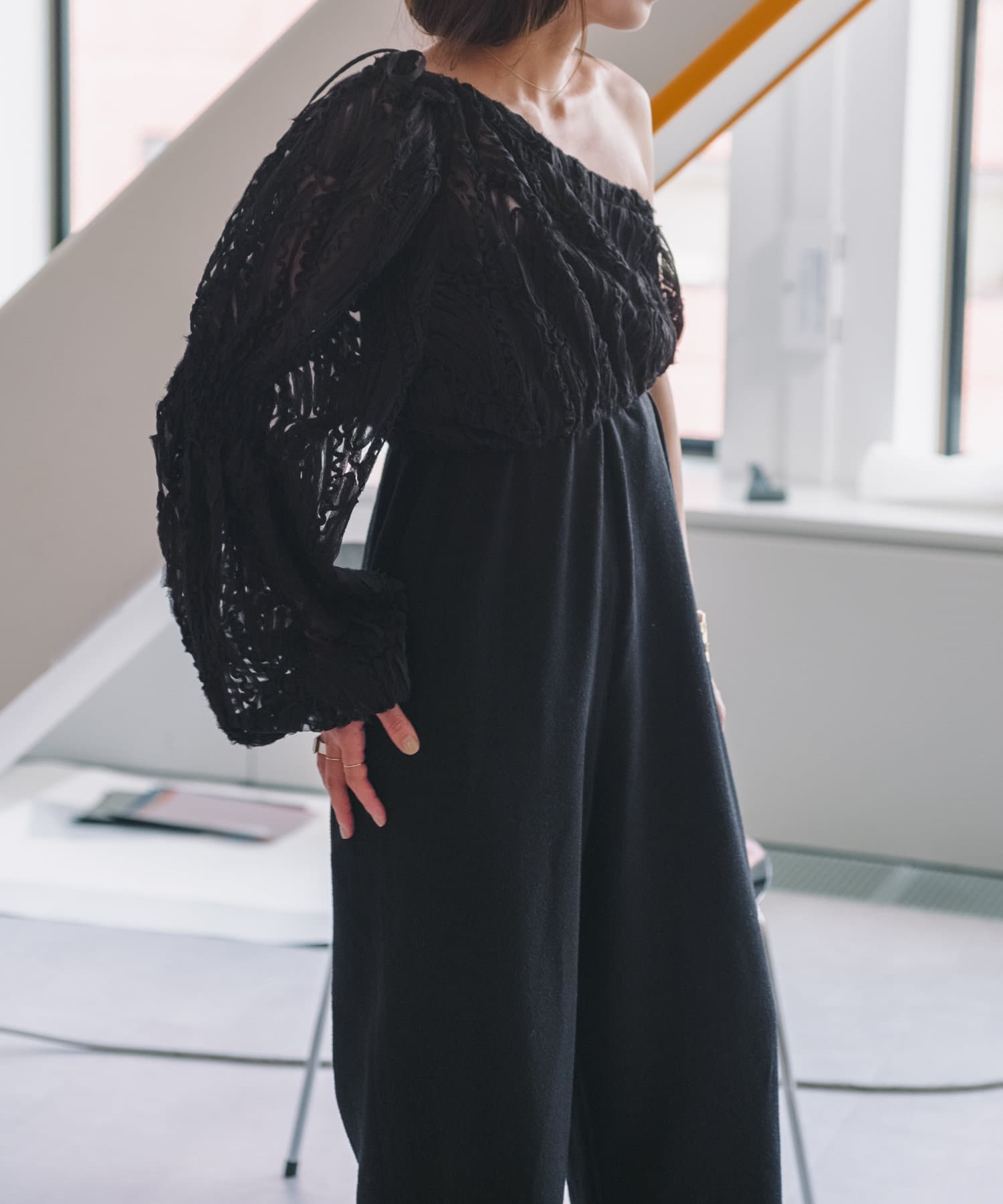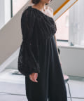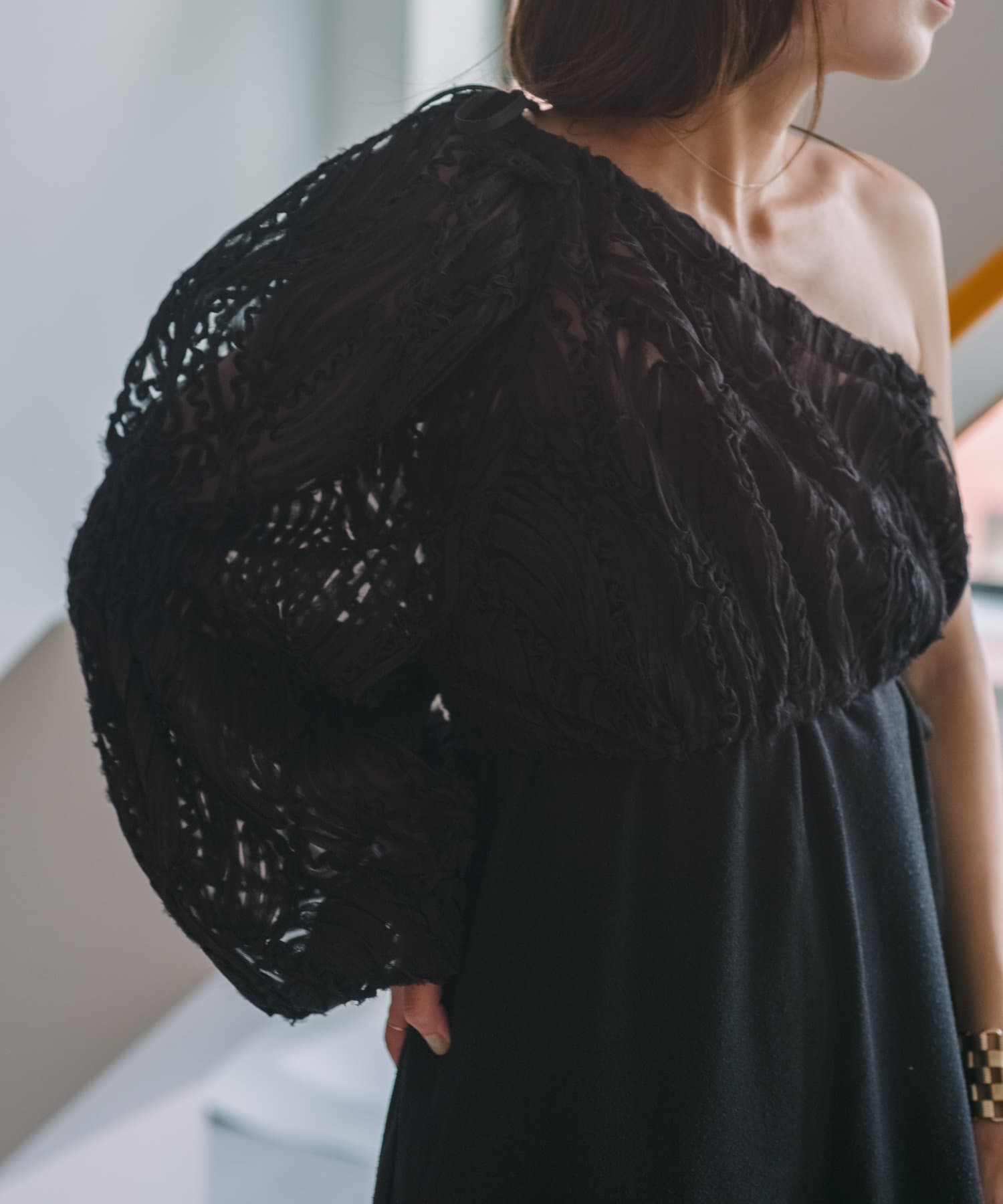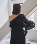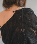 生地はチュールに裁ち切りのシフォンが装飾された特別なバテンレースの生地を使用。袖の中心と袖口にはピンタックを施しており、メリハリのあるシルエットに拘りました。