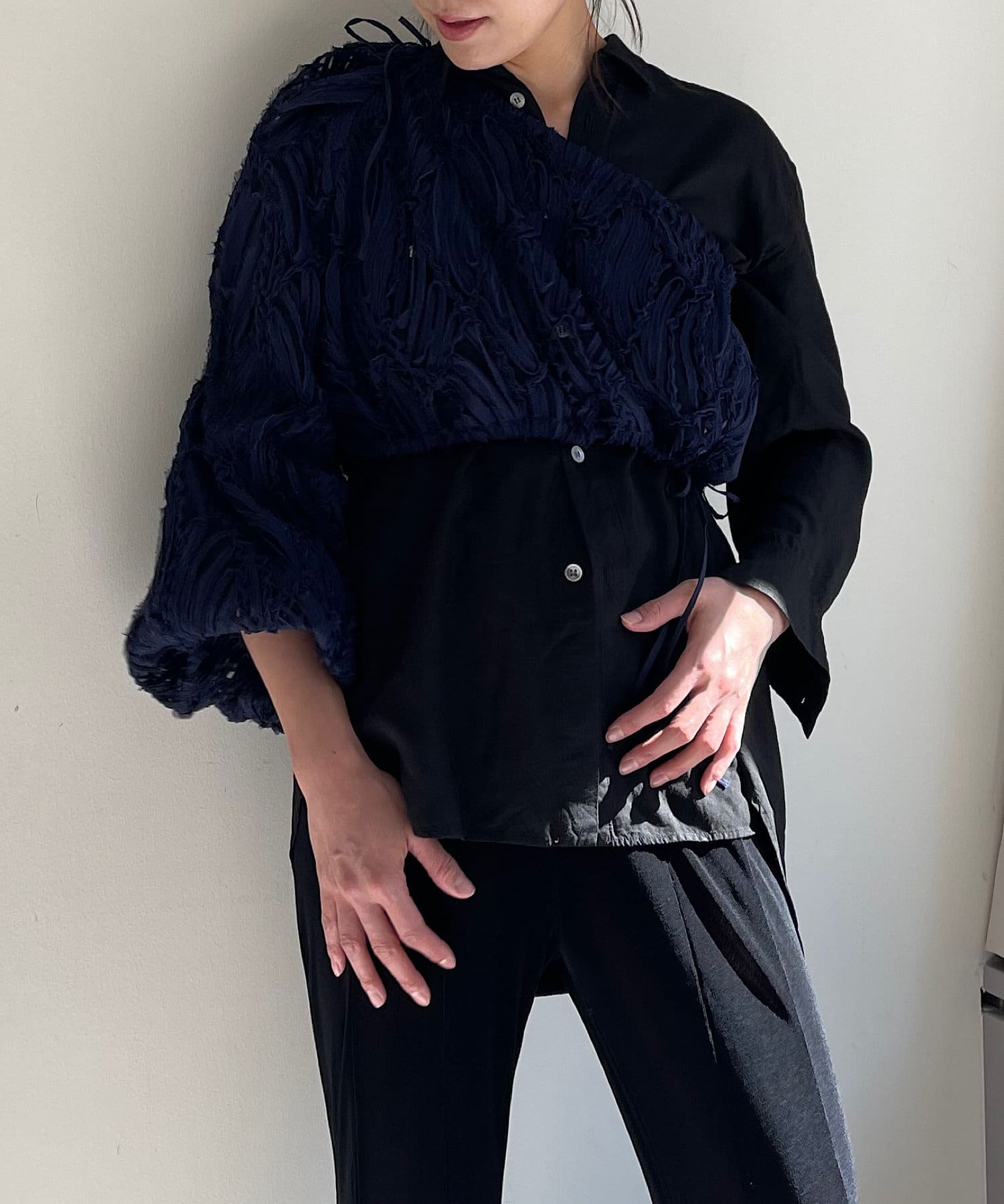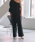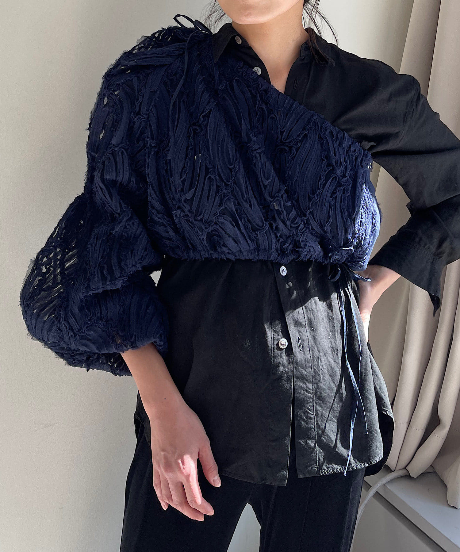 ブラウスの半身を切り取ったような、ユニークなデザインのワンショルダー型レイヤードブラウス。