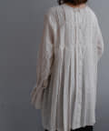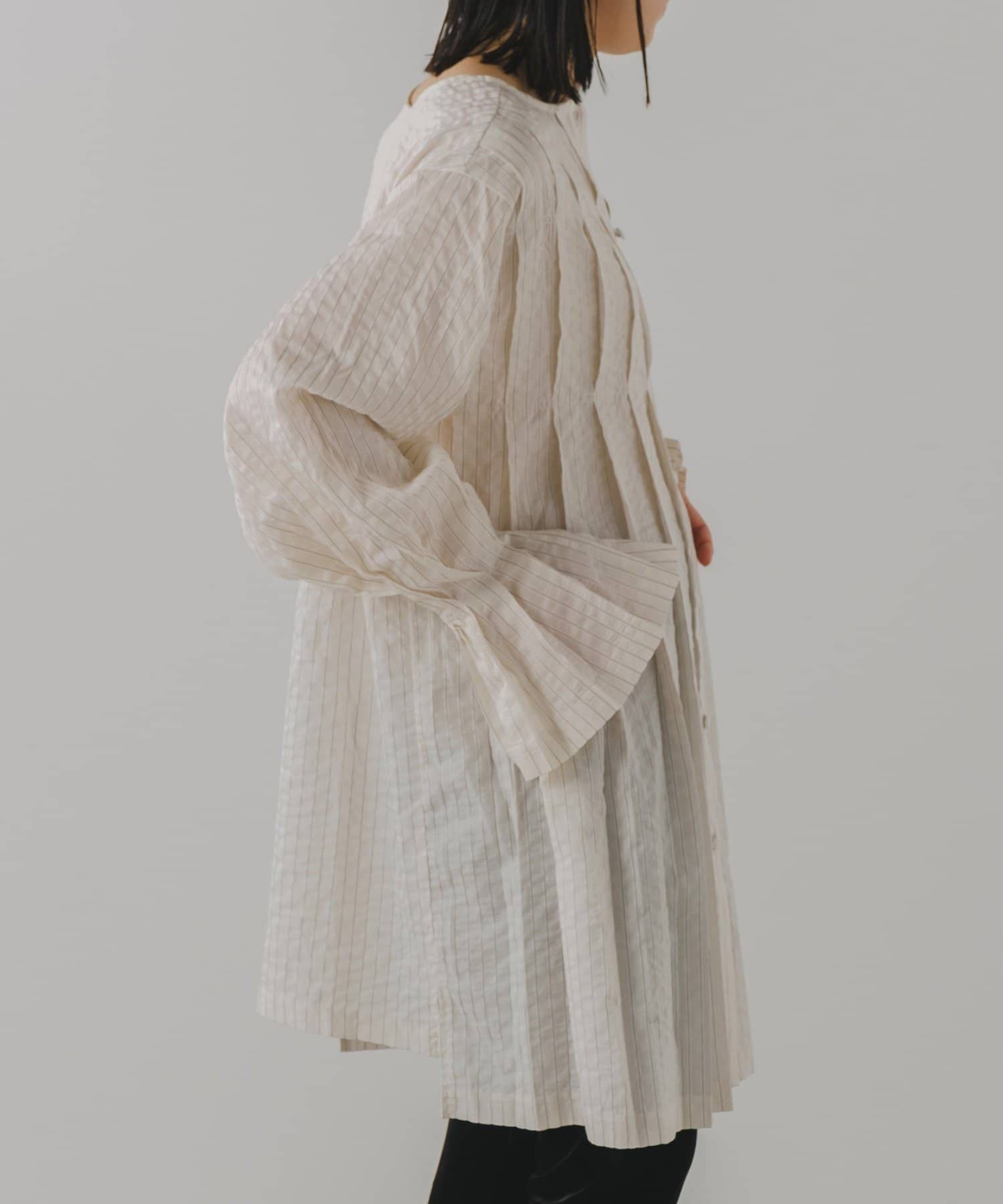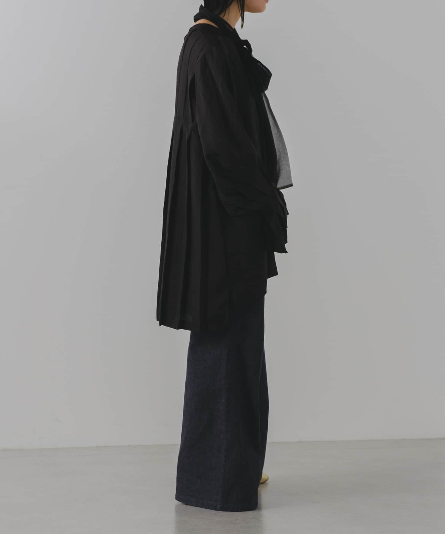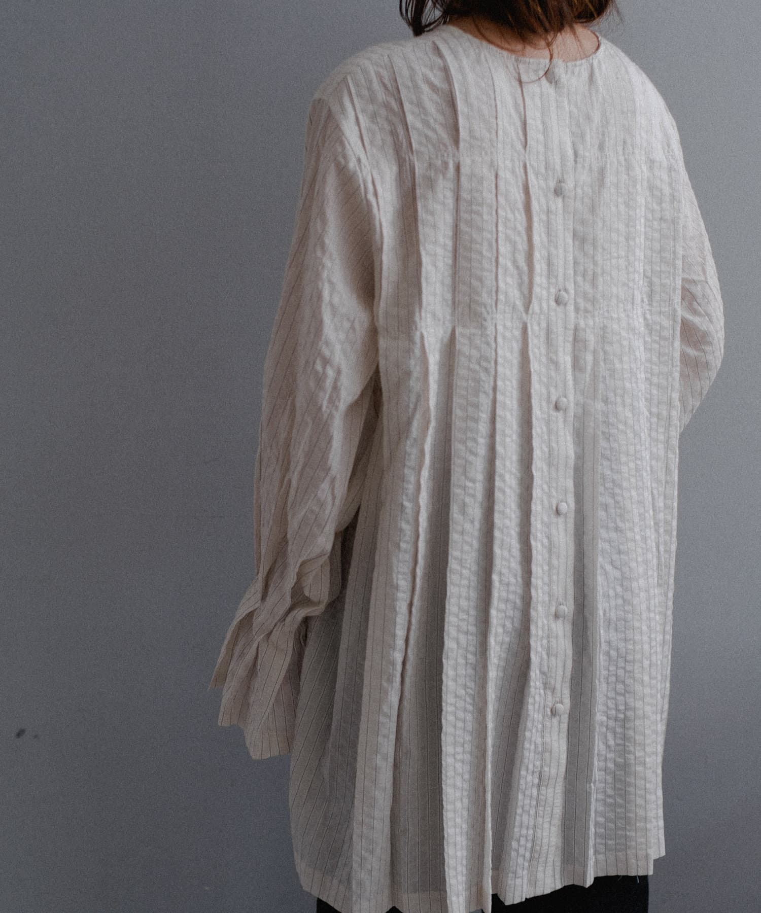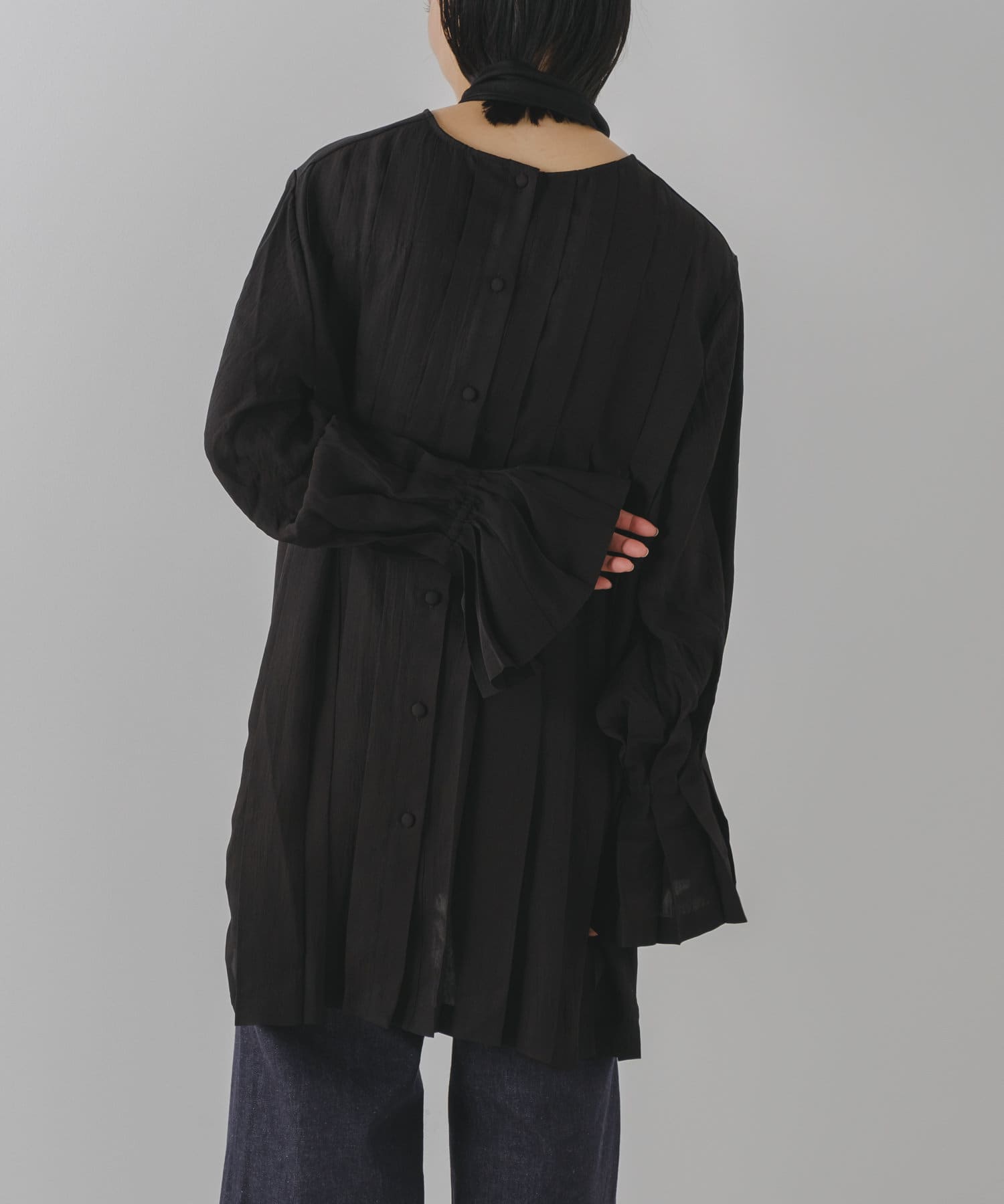 前から見るとシンプルですが、後ろ身頃には太幅のアコーディオンプリーツを入れており、バックシルエットまで楽しめます。また、袖にもプリーツを入れて、たっぷりと広がりのあるフレアースリーブに仕立てました。動くたびに袖や裾がヒラヒラとなびくので、レザージャケットやスウェットの中に重ね着して、ちらりと春の気分を覗かせるのもお勧めです。後ろはクルミ釦開き使用なので、前後で着用して夏の軽羽織りとして使っていただくこともできます。ミニワンピース程しっかりとお尻が隠れる丈があり、レギンスやスリムパンツなど今シーズンの気分なボトムスにも相性が良い1着です。