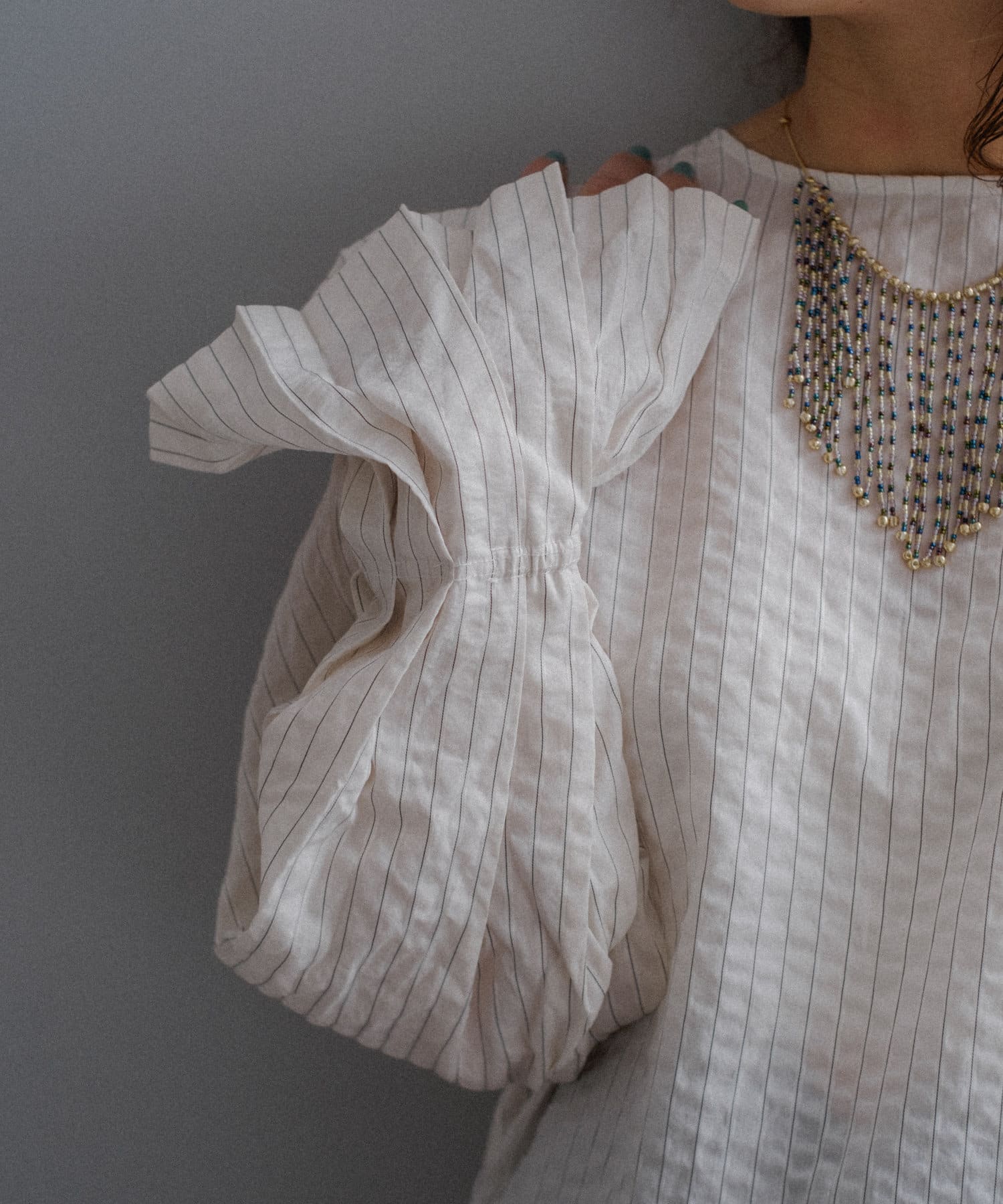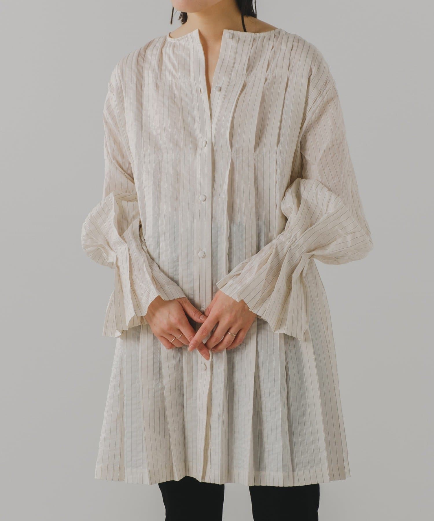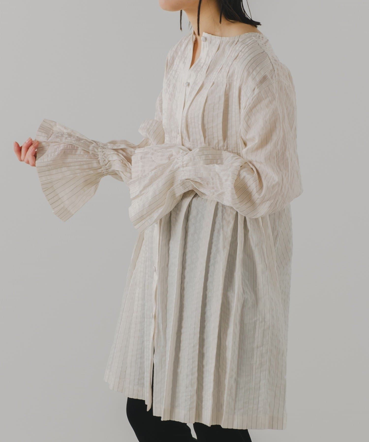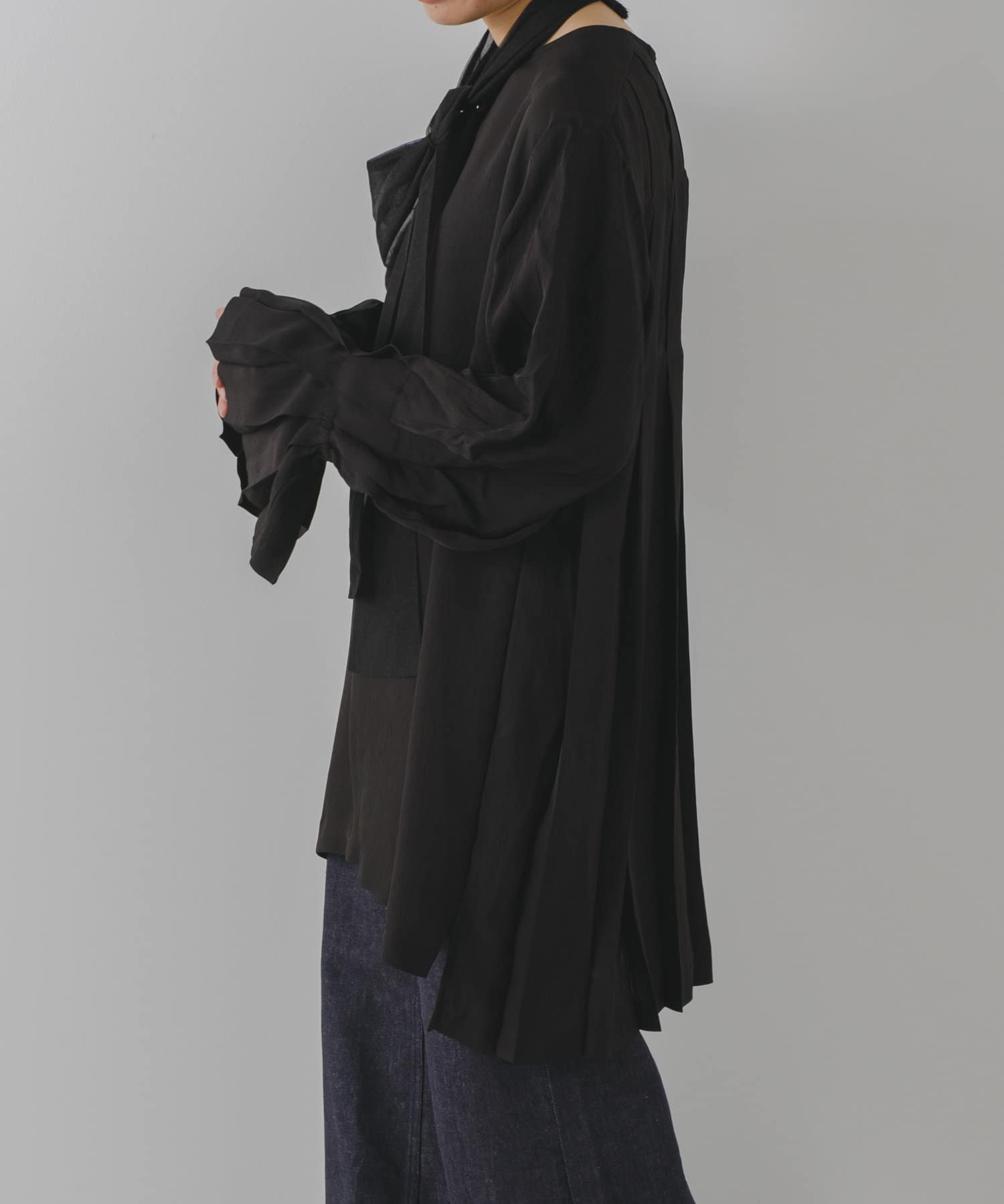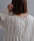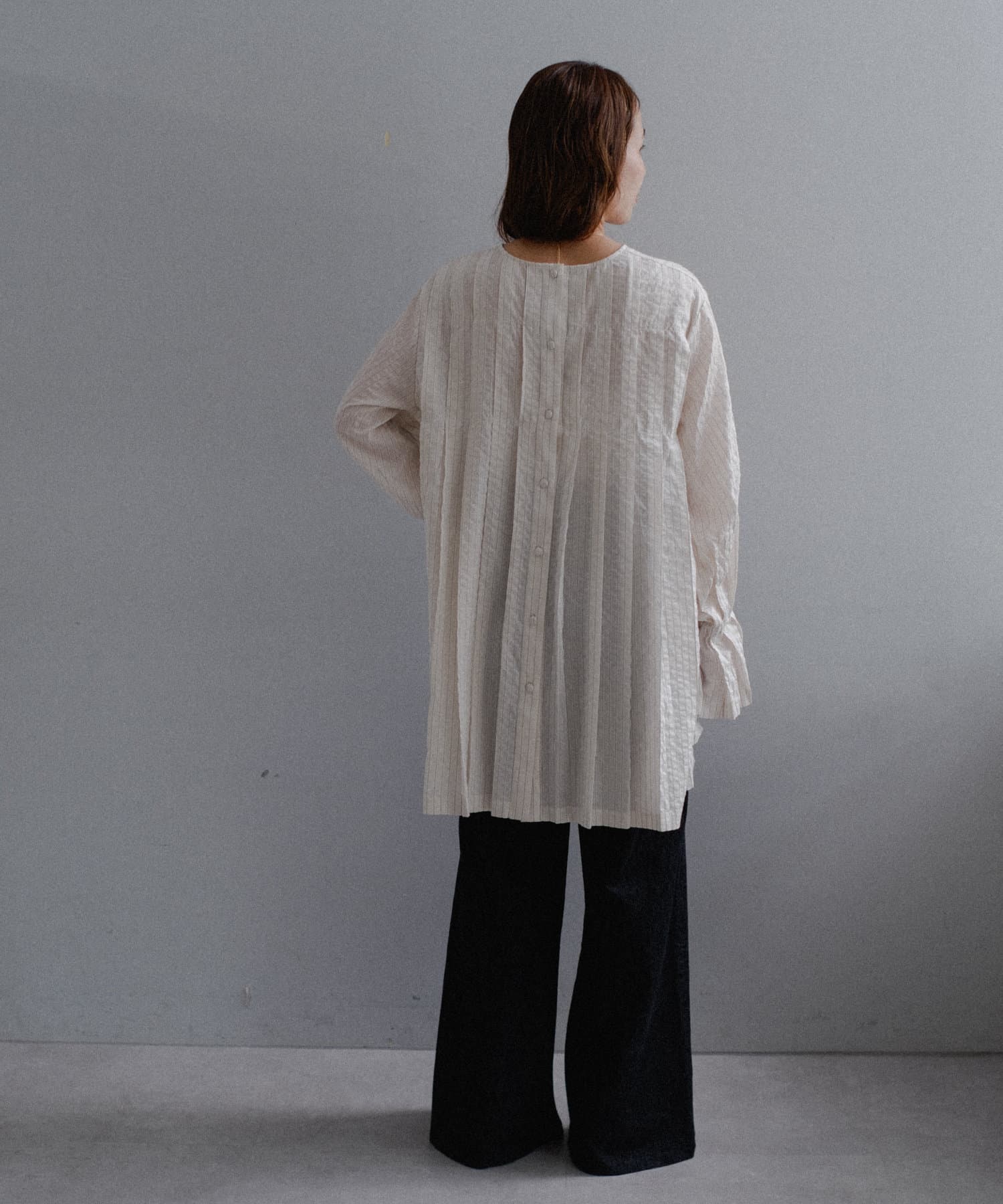 前から見るとシンプルですが、後ろ身頃には太幅のアコーディオンプリーツを入れており、バックシルエットまで楽しめます。また、袖にもプリーツを入れて、たっぷりと広がりのあるフレアースリーブに仕立てました。動くたびに袖や裾がヒラヒラとなびくので、レザージャケットやスウェットの中に重ね着して、ちらりと春の気分を覗かせるのもお勧めです。後ろはクルミ釦開き使用なので、前後で着用して夏の軽羽織りとして使っていただくこともできます。ミニワンピース程しっかりとお尻が隠れる丈があり、レギンスやスリムパンツなど今シーズンの気分なボトムスにも相性が良い1着です。