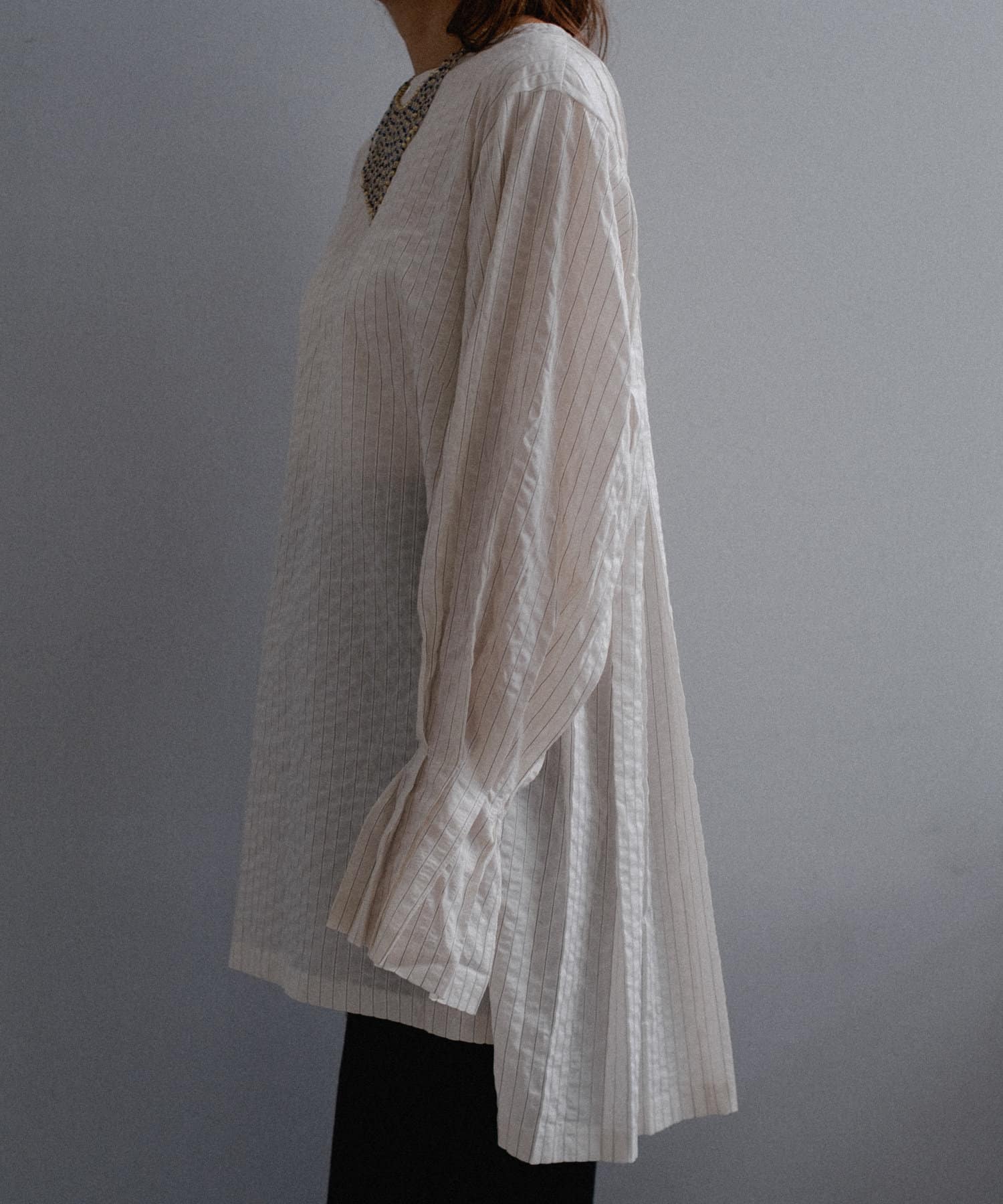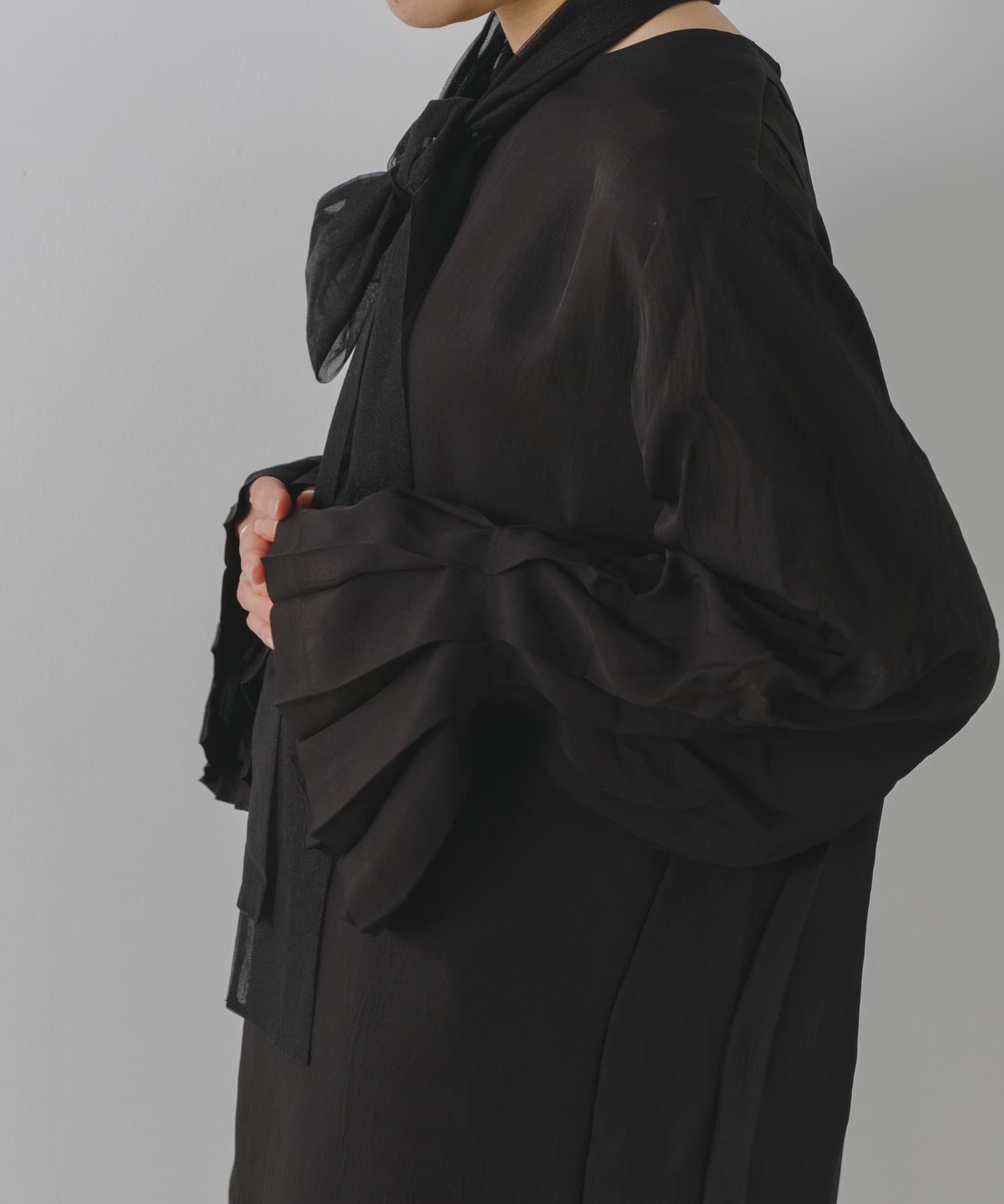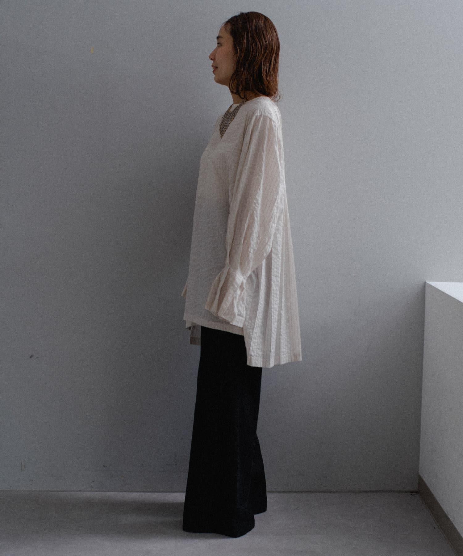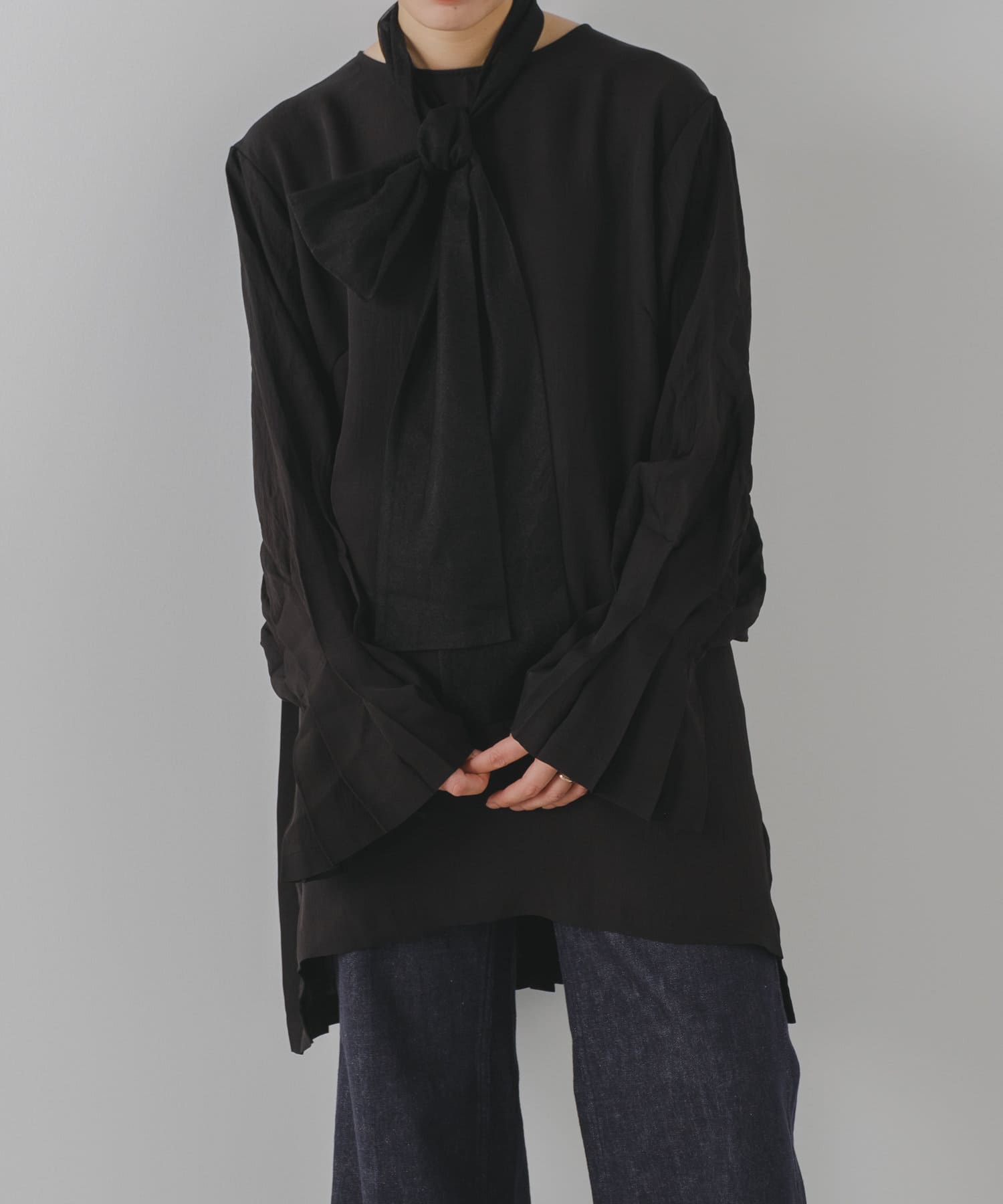 前から見るとシンプルですが、後ろ身頃には太幅のアコーディオンプリーツを入れており、バックシルエットまで楽しめます。また、袖にもプリーツを入れて、たっぷりと広がりのあるフレアースリーブに仕立てました。動くたびに袖や裾がヒラヒラとなびくので、レザージャケットやスウェットの中に重ね着して、ちらりと春の気分を覗かせるのもお勧めです。後ろはクルミ釦開き使用なので、前後で着用して夏の軽羽織りとして使っていただくこともできます。ミニワンピース程しっかりとお尻が隠れる丈があり、レギンスやスリムパンツなど今シーズンの気分なボトムスにも相性が良い1着です。