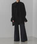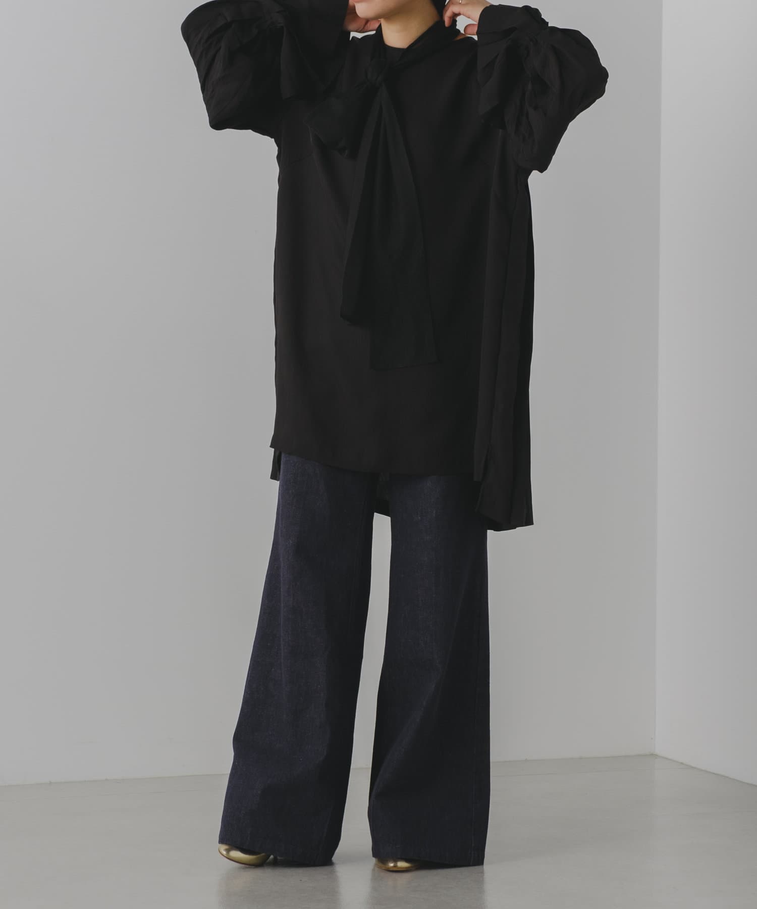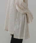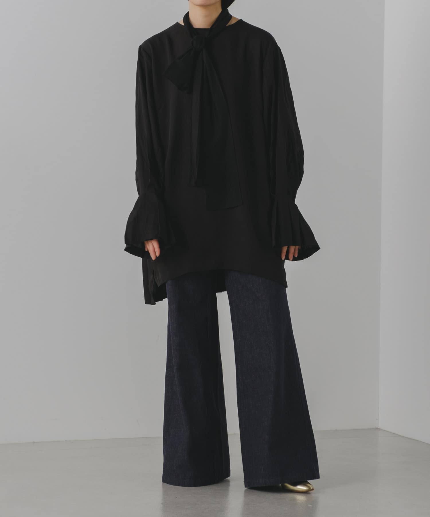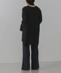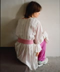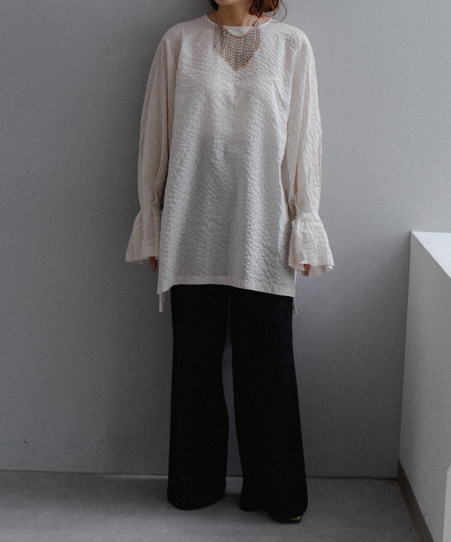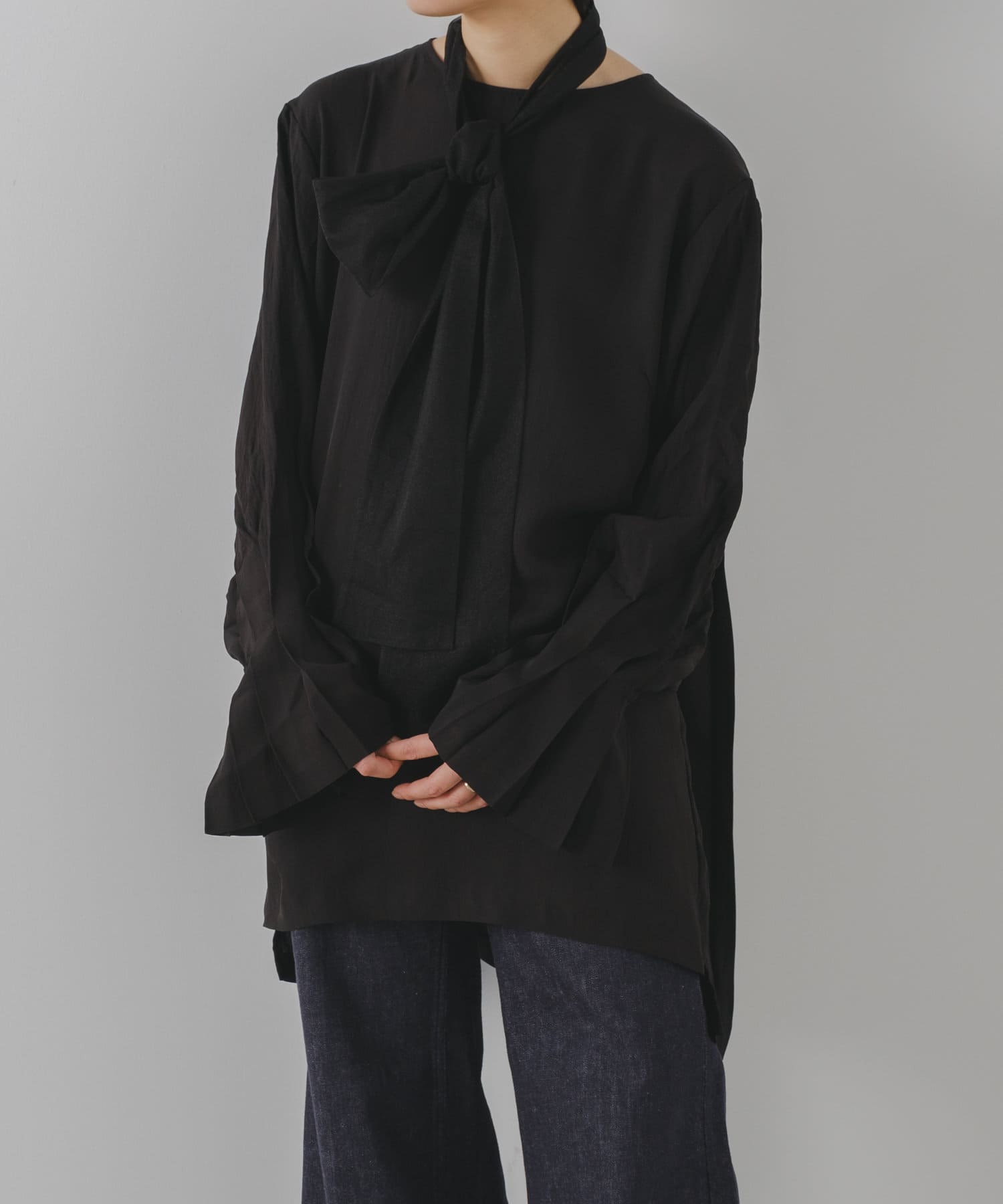 前から見るとシンプルですが、後ろ身頃には太幅のアコーディオンプリーツを入れており、バックシルエットまで楽しめます。また、袖にもプリーツを入れて、たっぷりと広がりのあるフレアースリーブに仕立てました。動くたびに袖や裾がヒラヒラとなびくので、レザージャケットやスウェットの中に重ね着して、ちらりと春の気分を覗かせるのもお勧めです。後ろはクルミ釦開き使用なので、前後で着用して夏の軽羽織りとして使っていただくこともできます。ミニワンピース程しっかりとお尻が隠れる丈があり、レギンスやスリムパンツなど今シーズンの気分なボトムスにも相性が良い1着です。