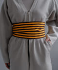 ヴィンテージ感のあるメタリックヤーンを使用した編地を表地に、マットなポリエステル糸の編地を裏地に使用してボンディングさせたダブルフェイスの編地を採用。しっかりと編地にハリ感をもたせることで袖のカーブシルエットを立体的に形作っています。