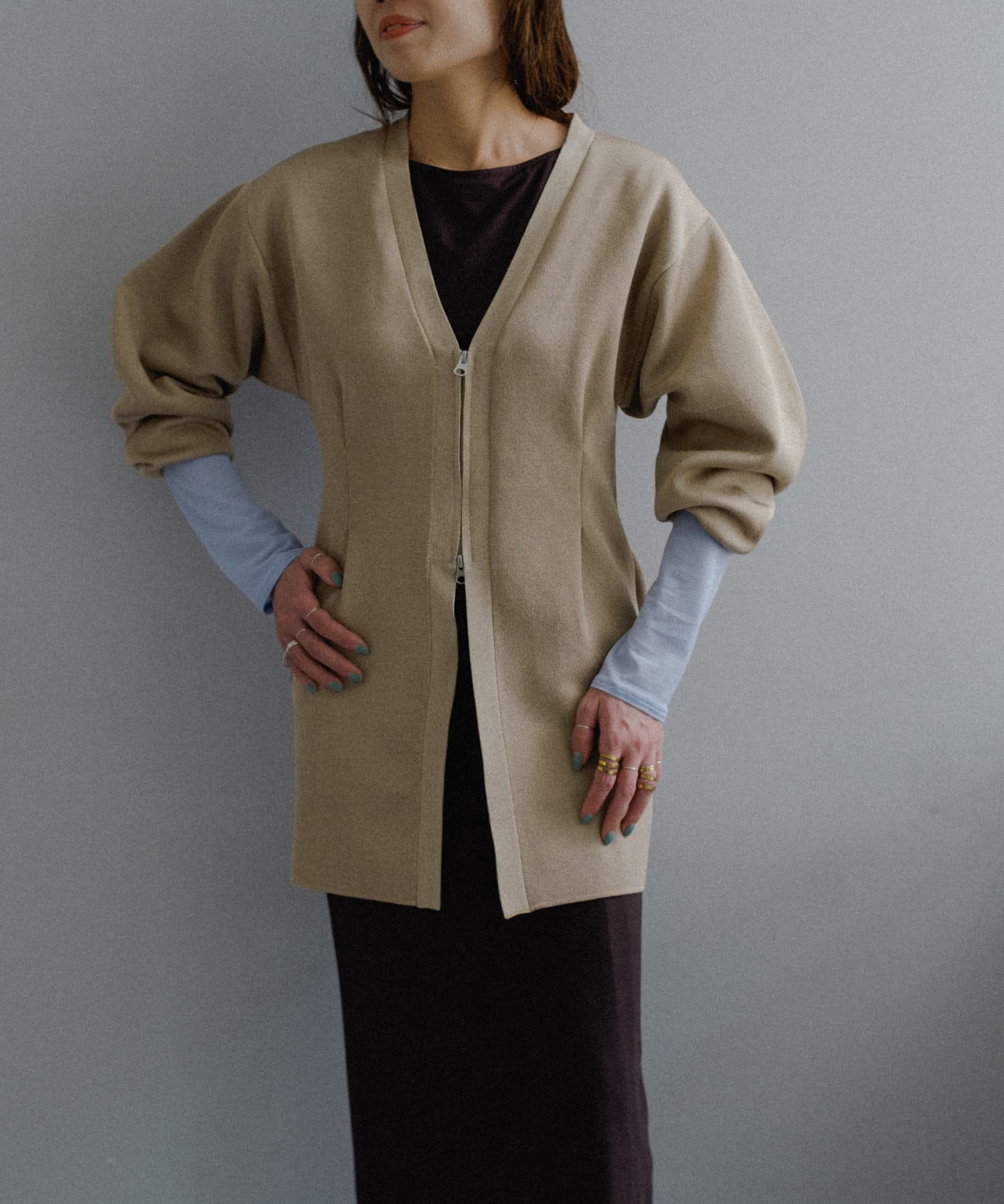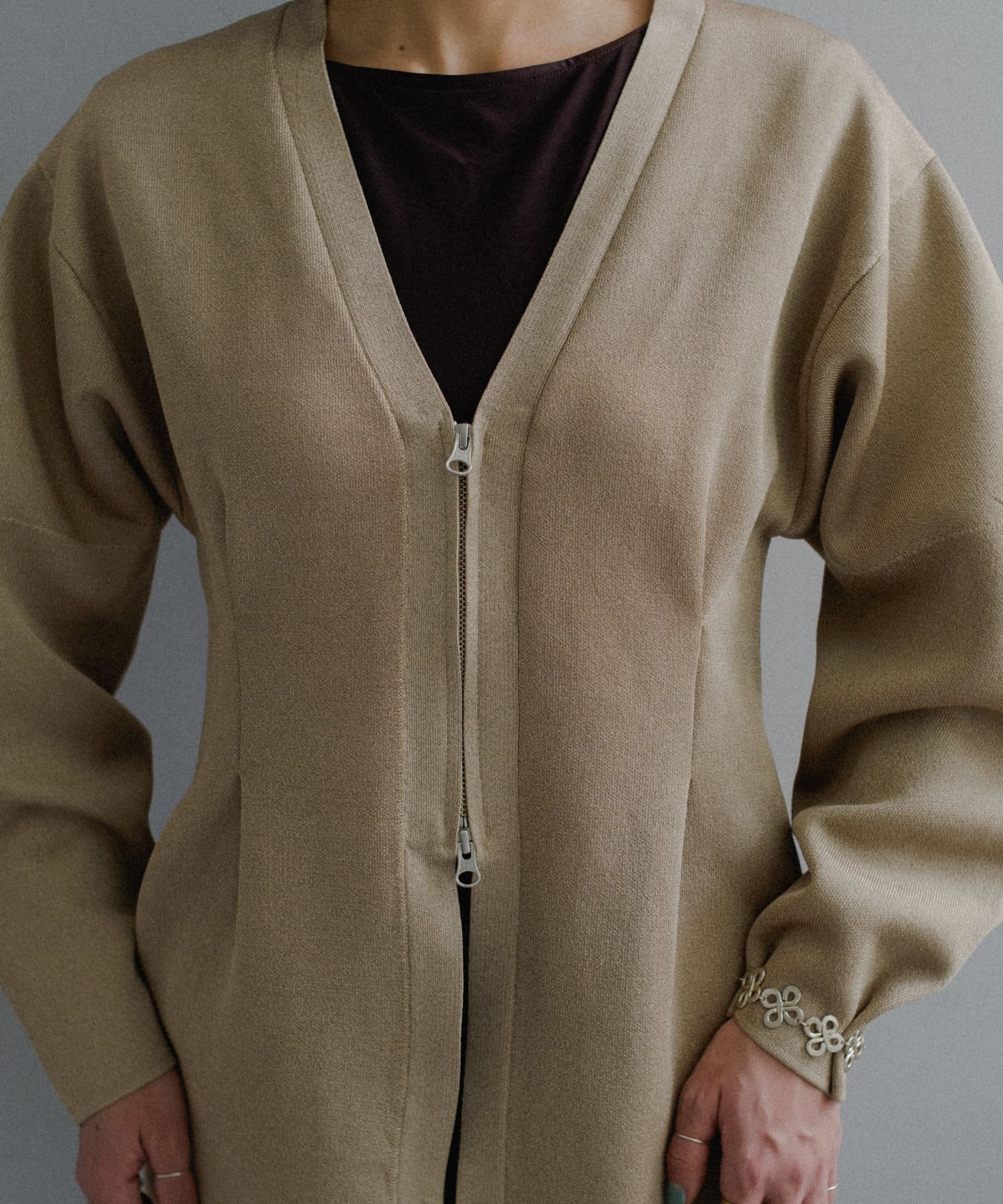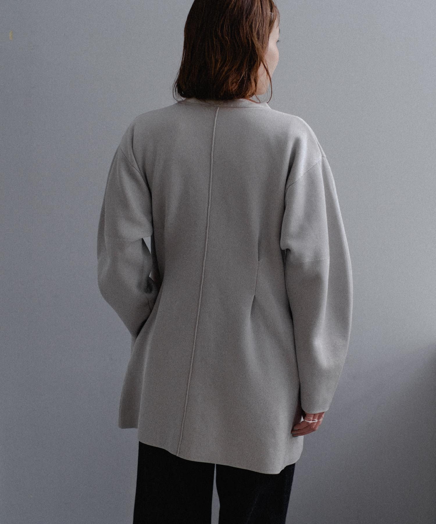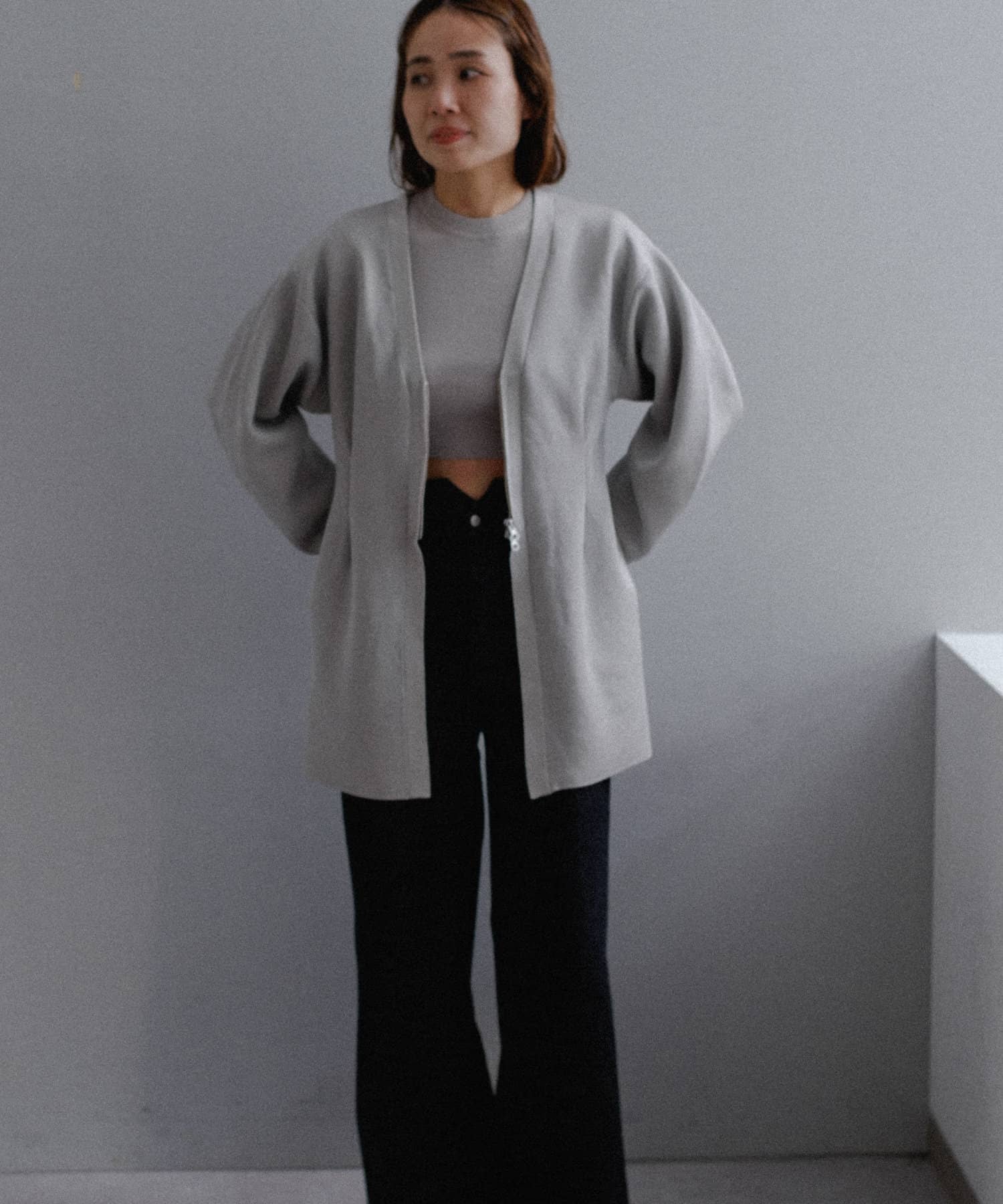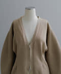 フロントはボタンでなく逆開ファスナーを使用。ニット地ジャケットのような印象で着用いただけます。