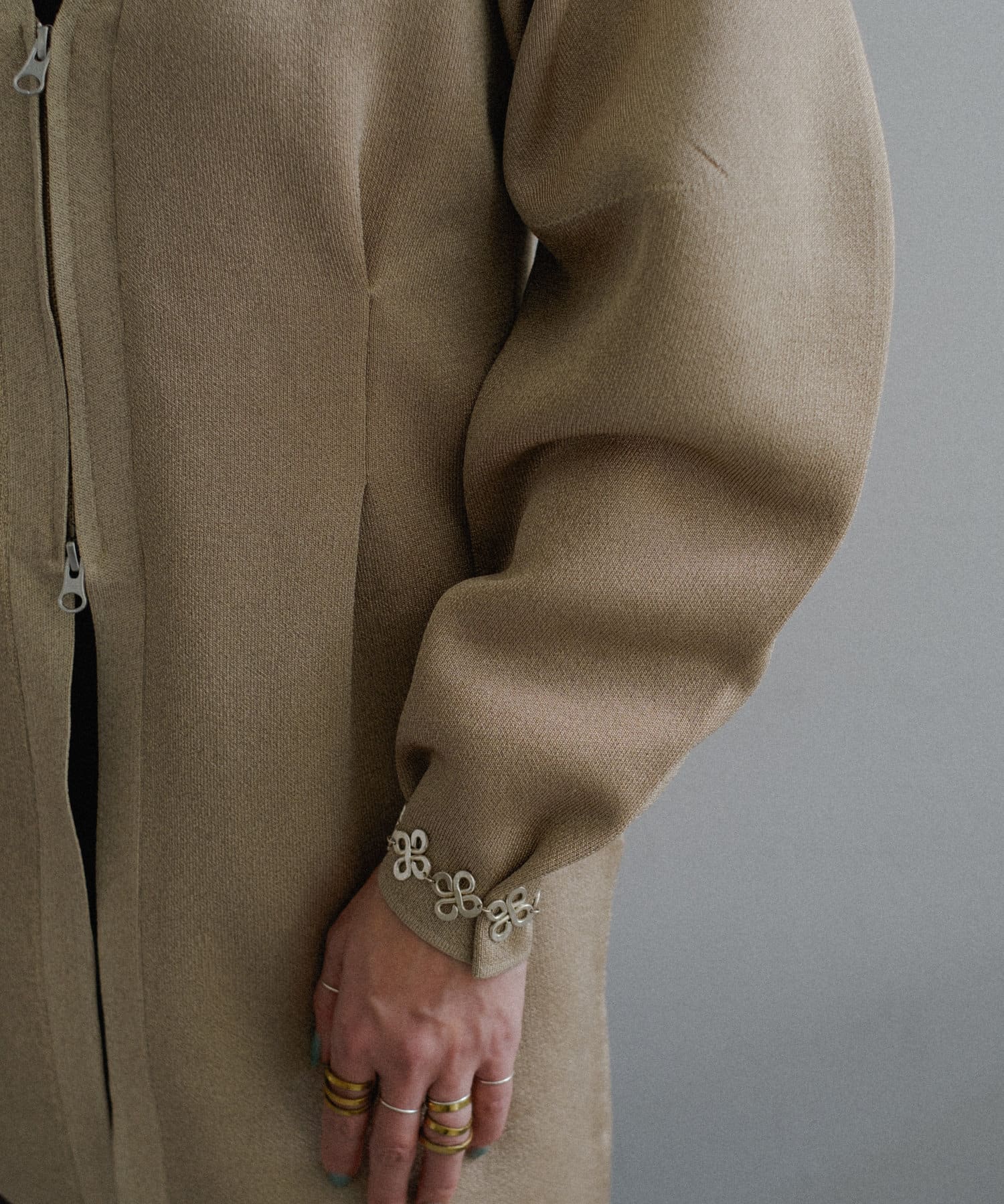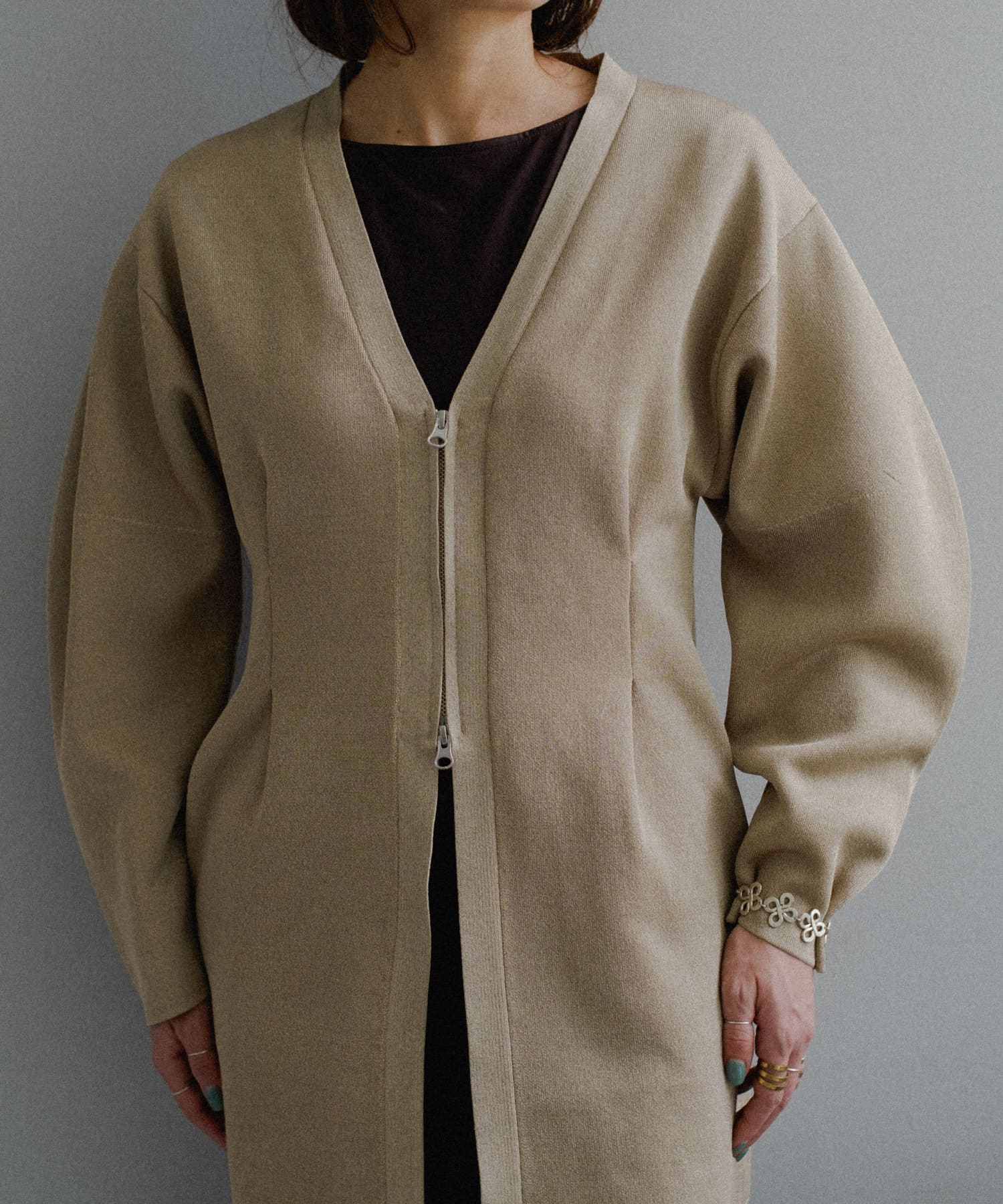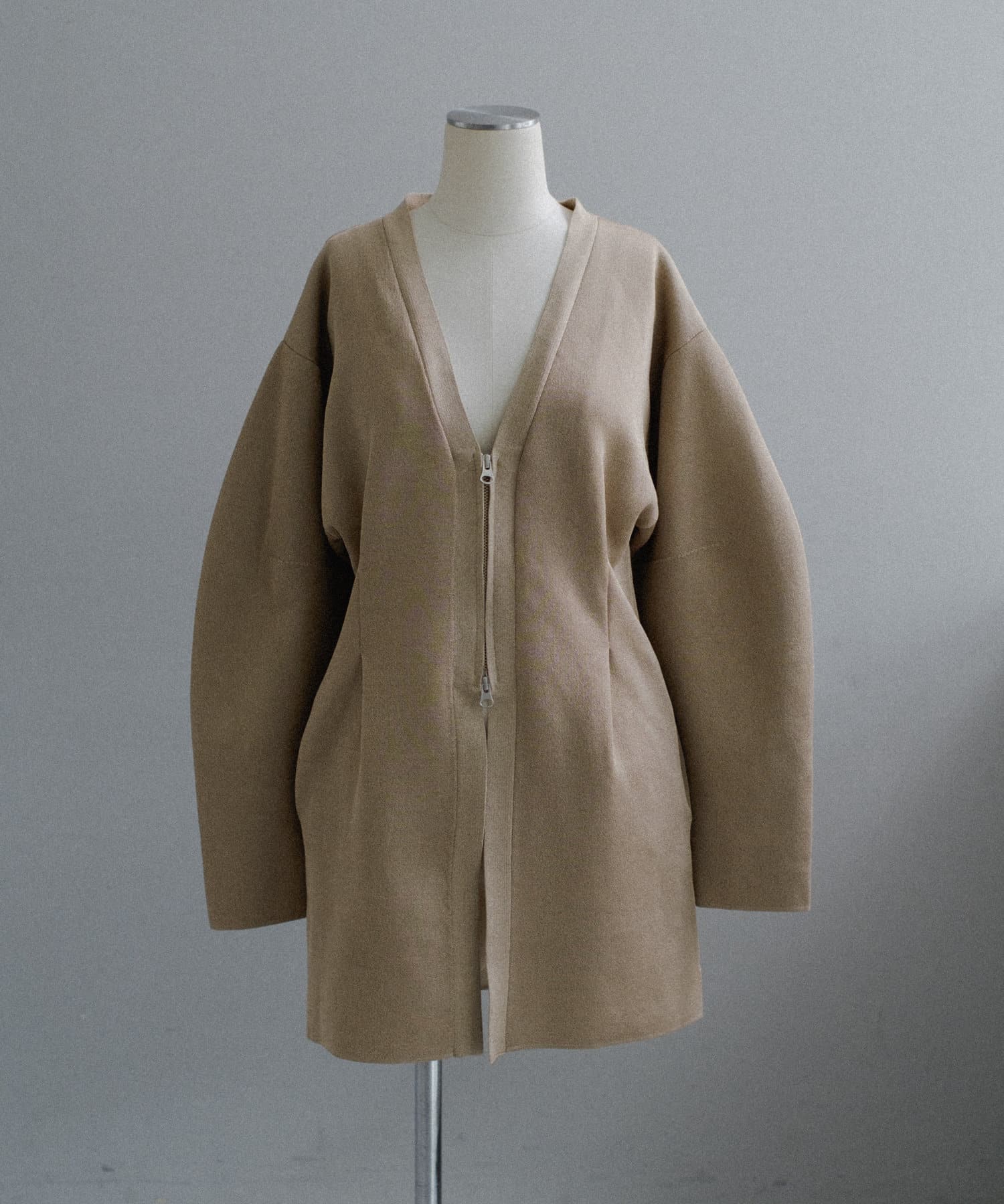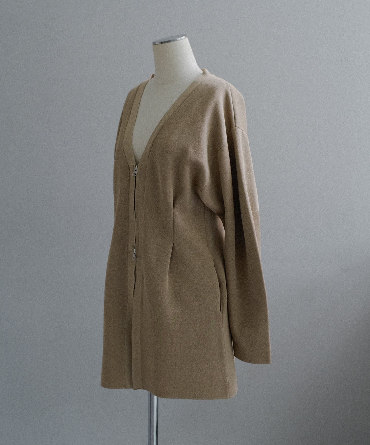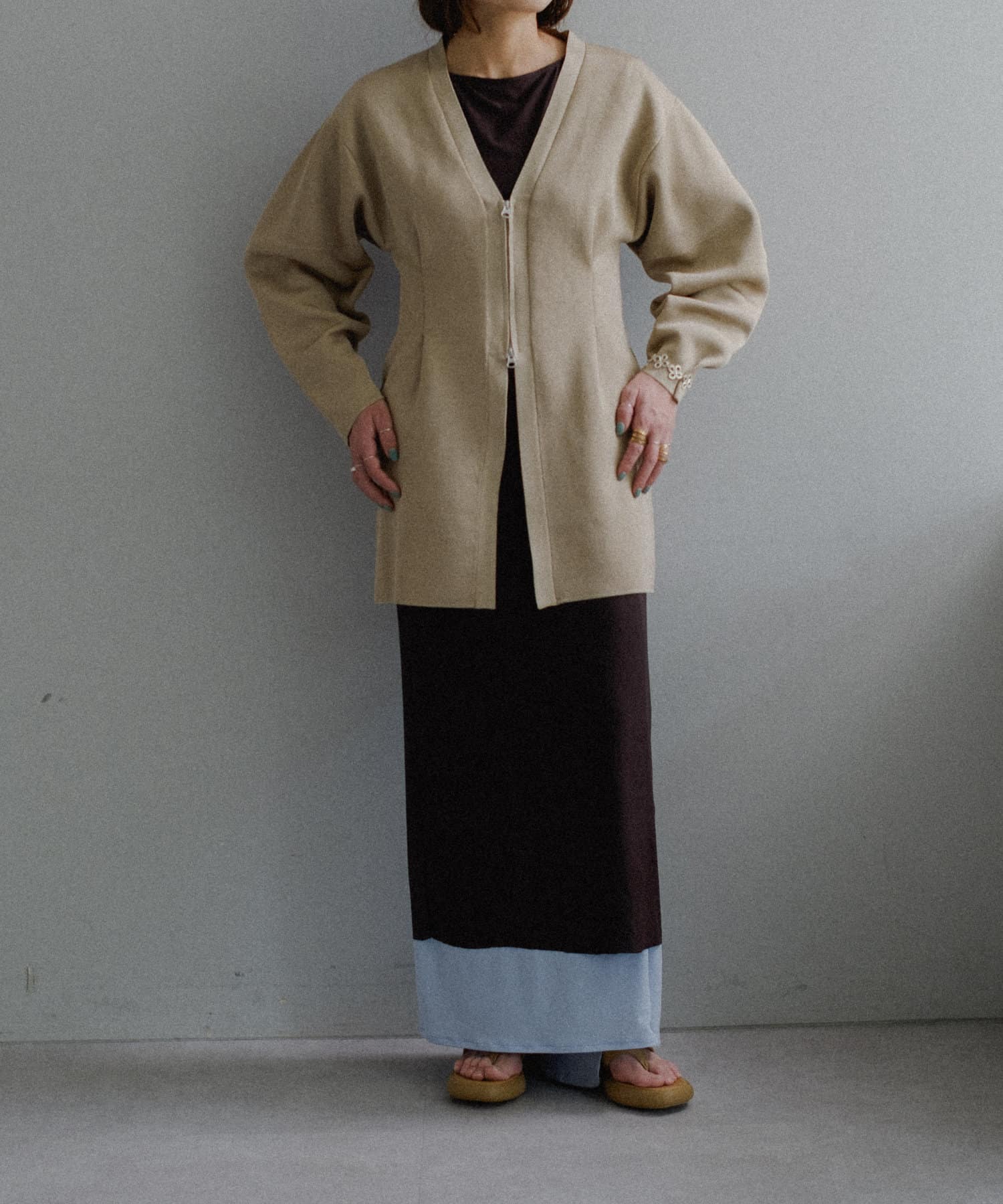 フロントはボタンでなく逆開ファスナーを使用。ニット地ジャケットのような印象で着用いただけます。