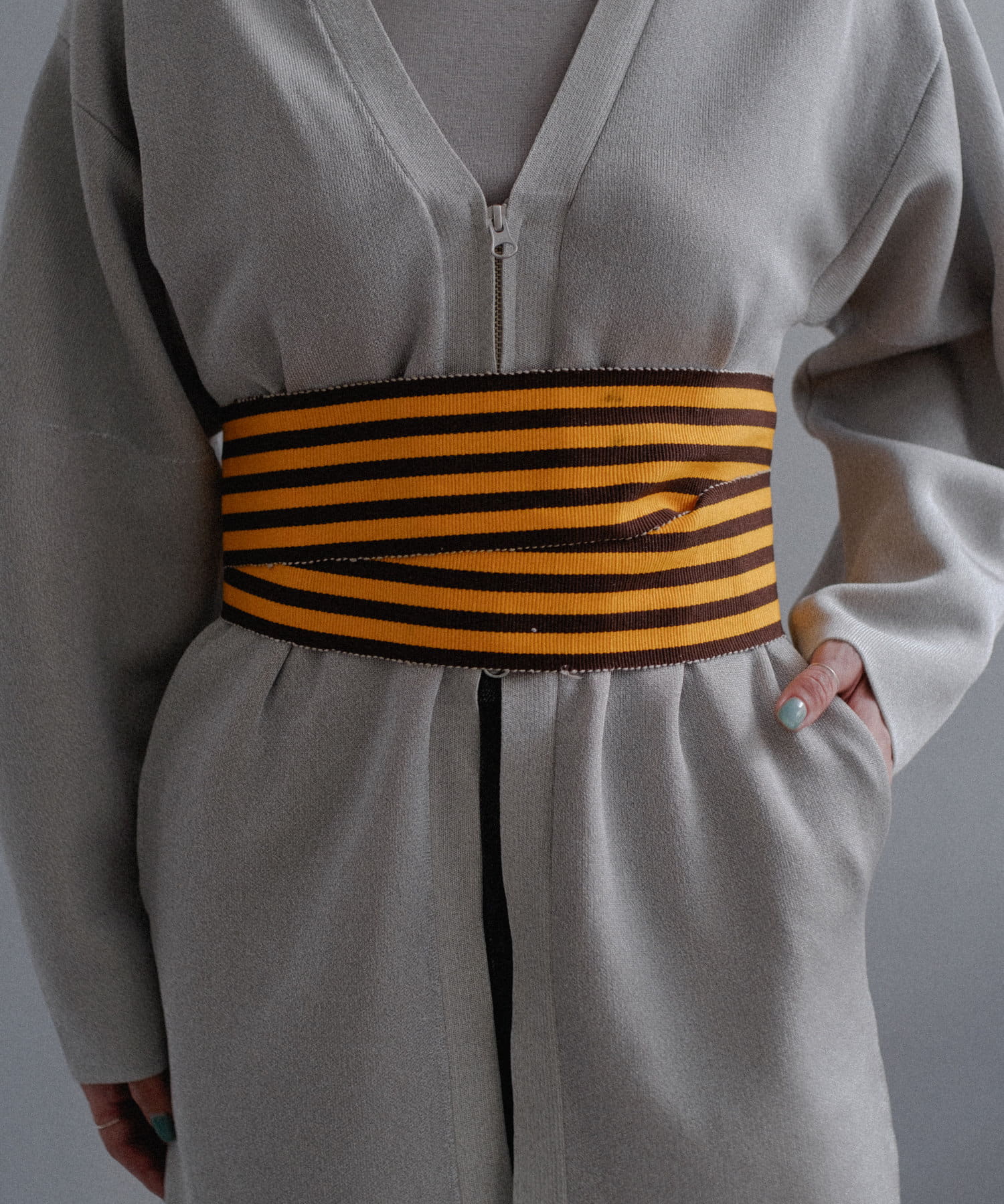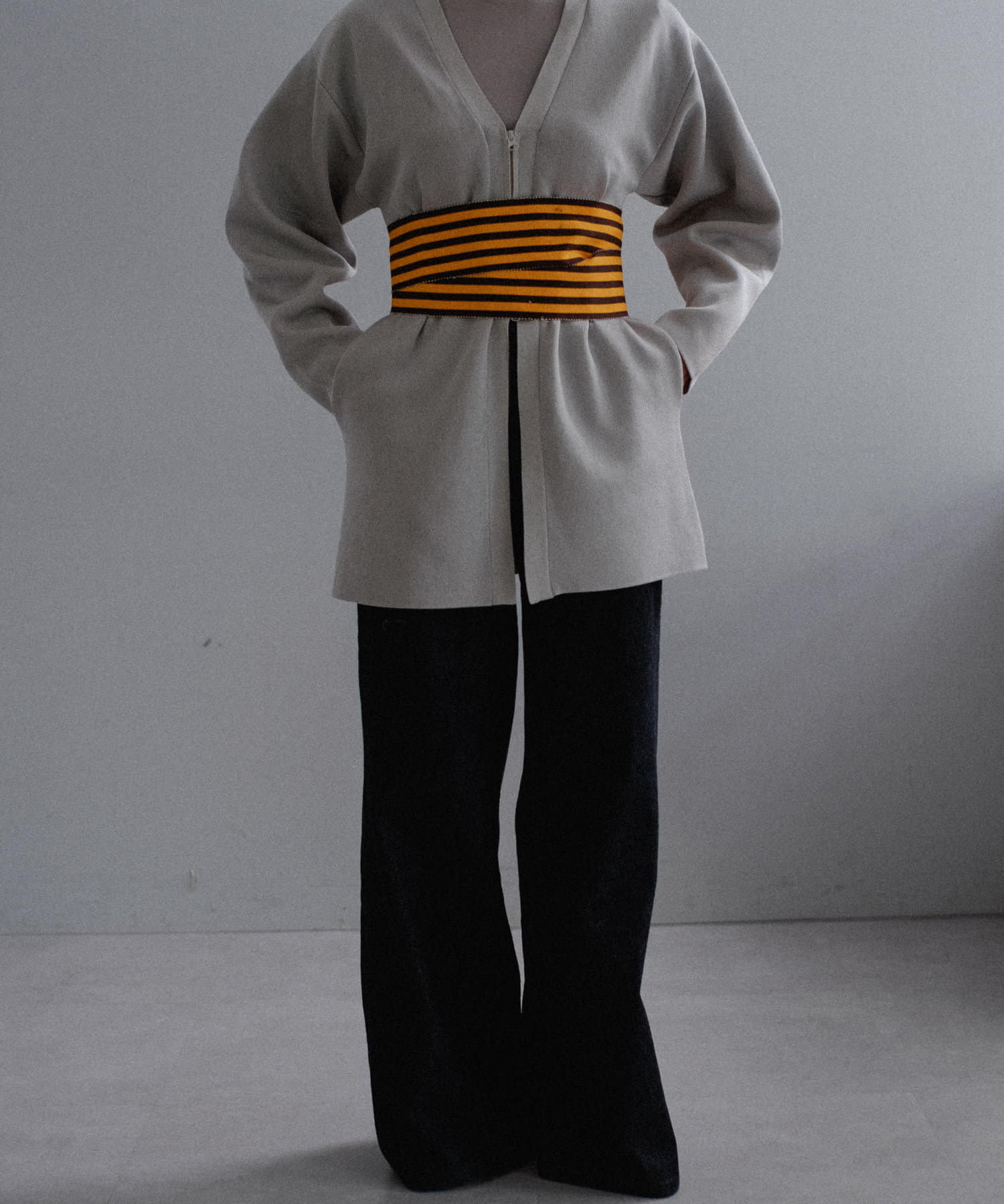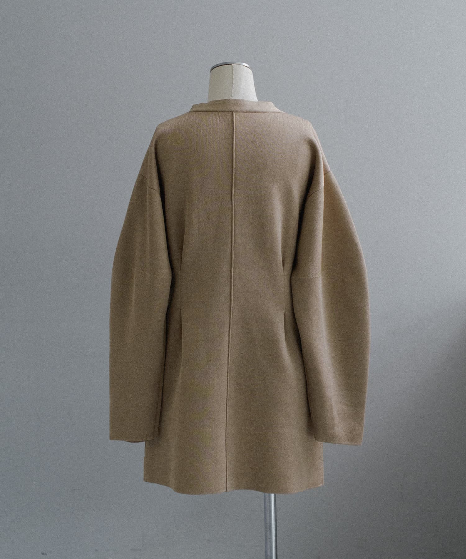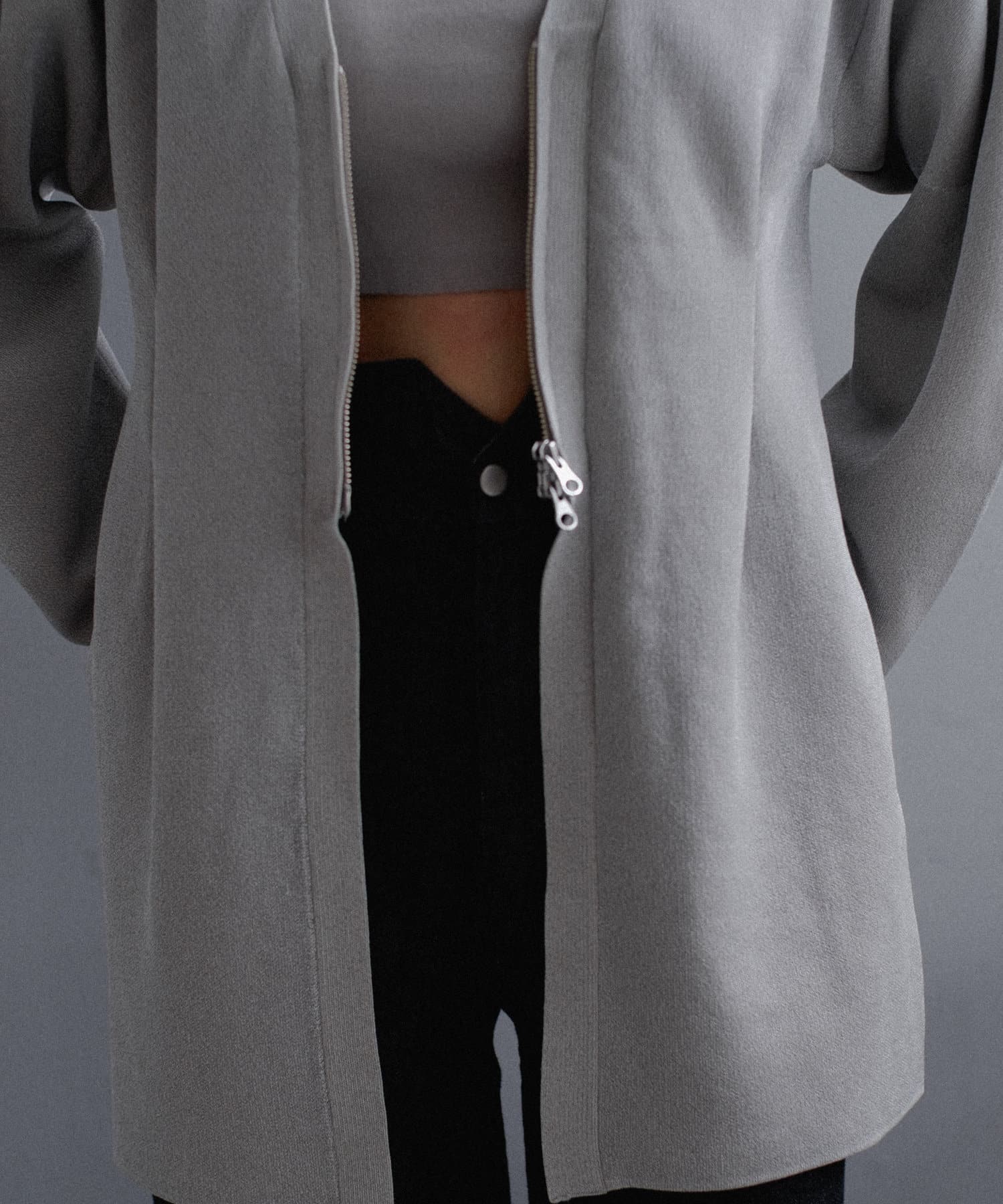 フロントはボタンでなく逆開ファスナーを使用。ニット地ジャケットのような印象で着用いただけます。