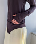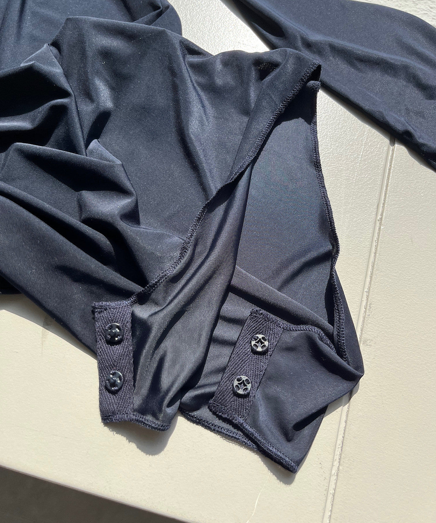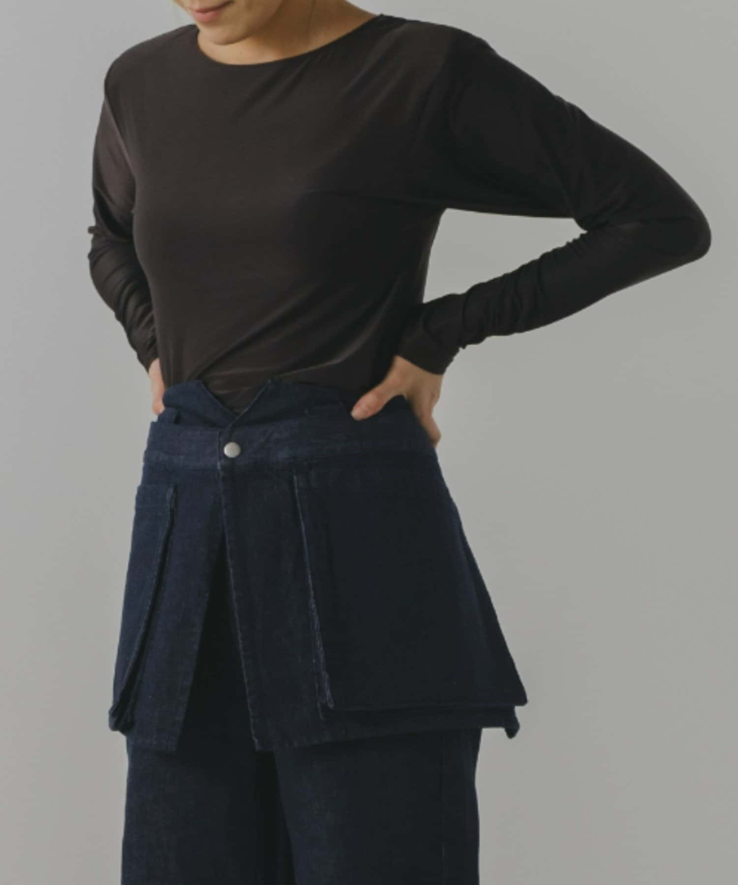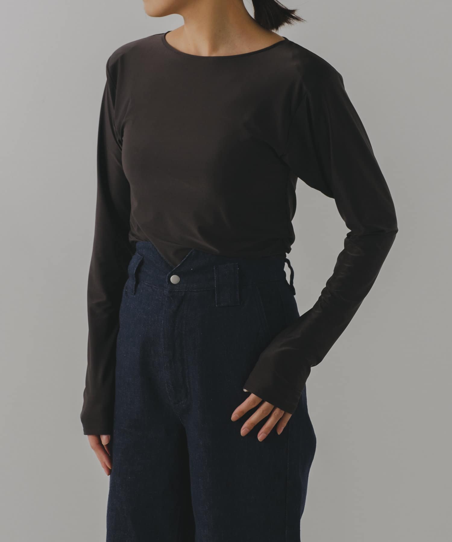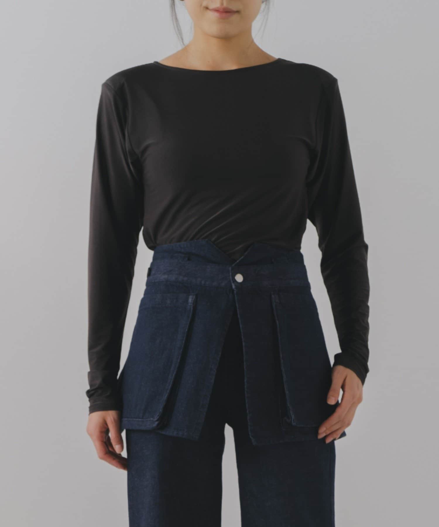 股ぐりのボタンは外したまま垂らして使用しても、もちろん留めてボディスーツとしても着用OK。ボタンを留めたままデニムやパンツを上から履くと、手の上げ下げで首周りのシルエットがくずれたり、腰回りがもたついたりしにくく、一度着たらきっとこの快適さに病みつきになると思います。