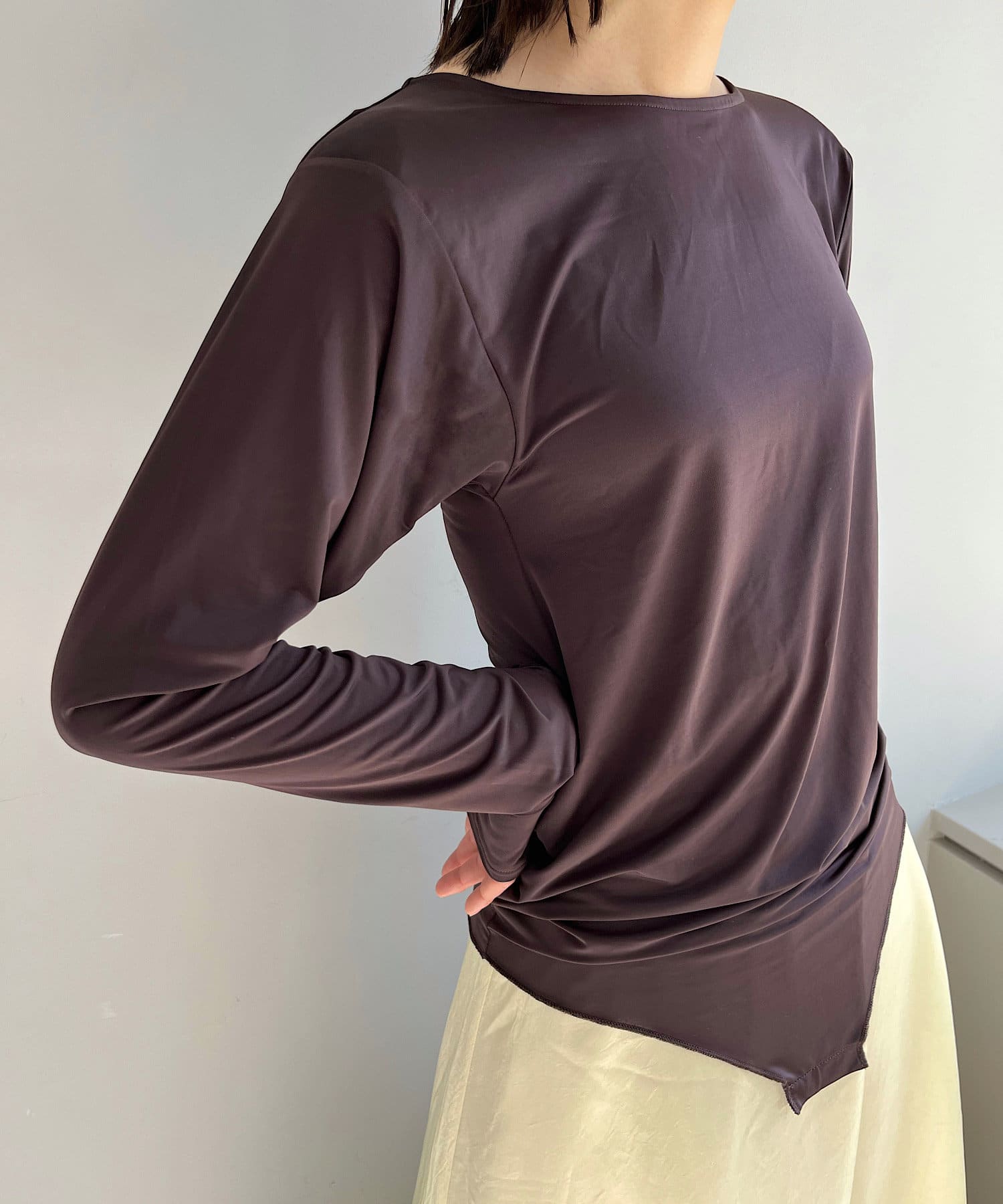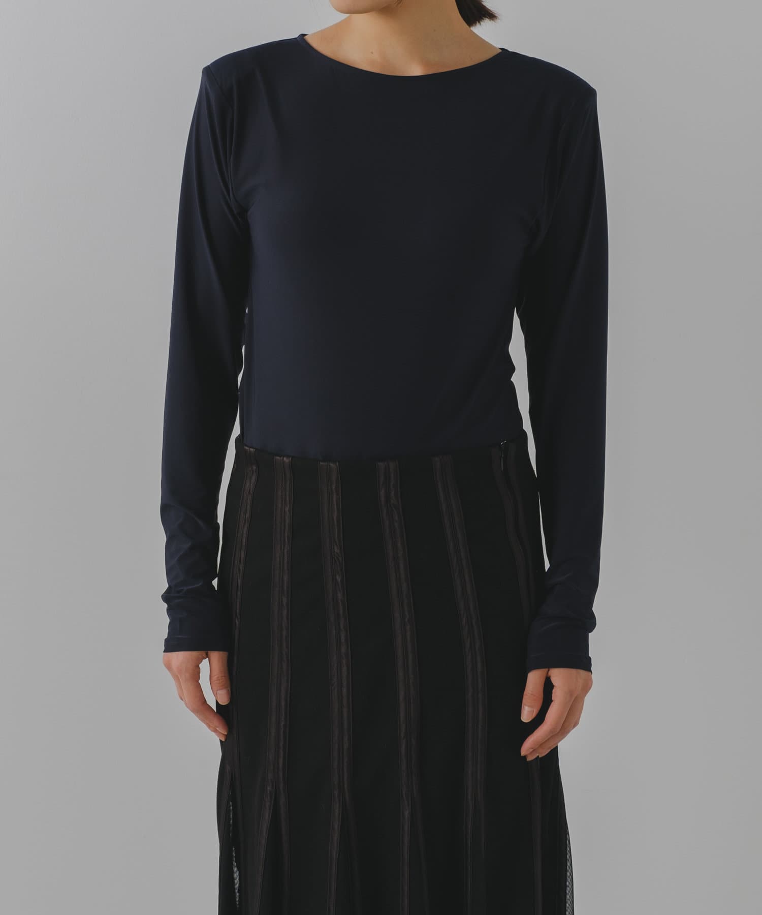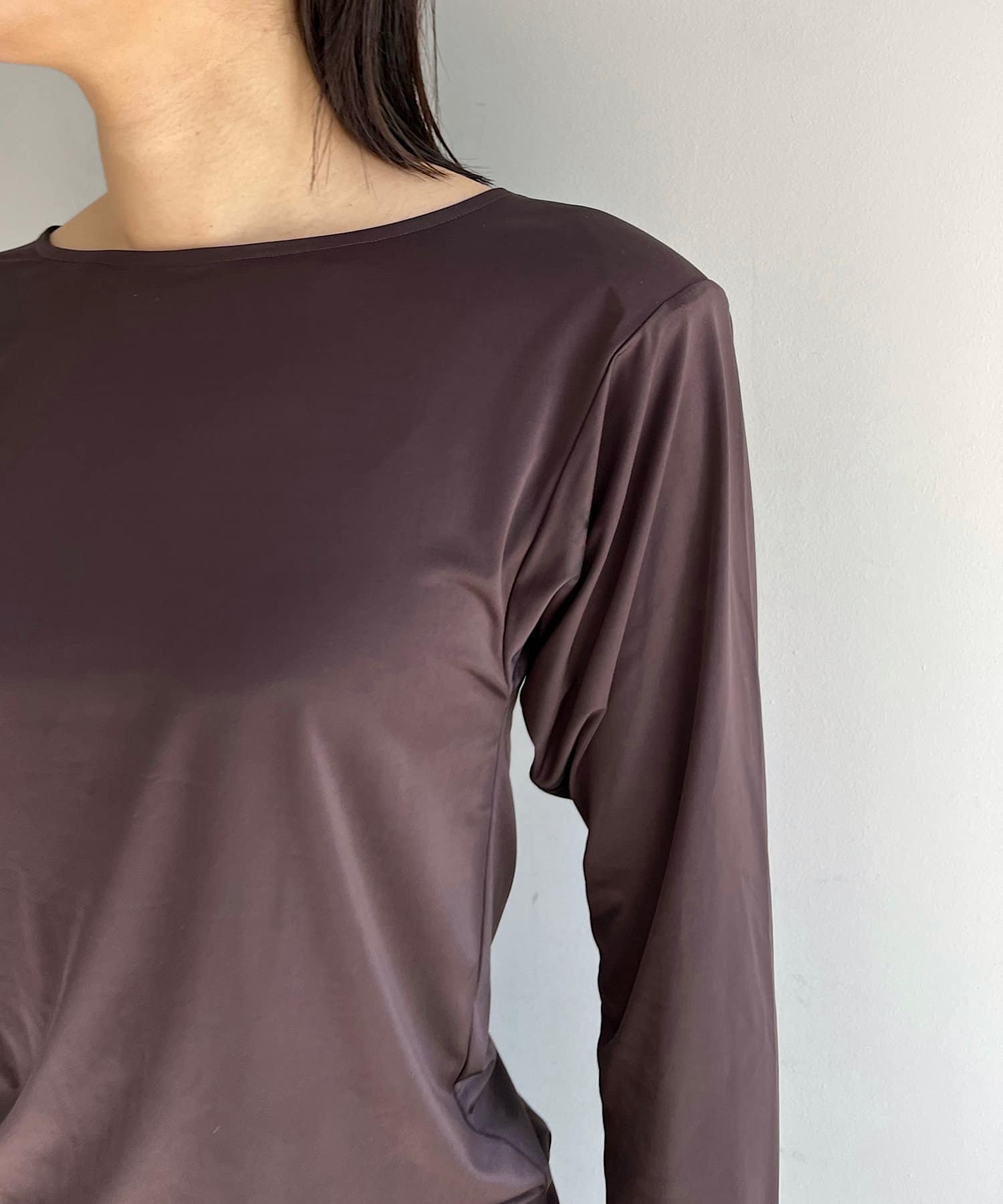 一見シンプルなデザインですが、薄手の肩パッドが内蔵されており上半身の丸みをすっきりとシャープに見せてくれて、1枚着でもぐんとスタイルアップが叶います。