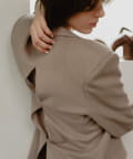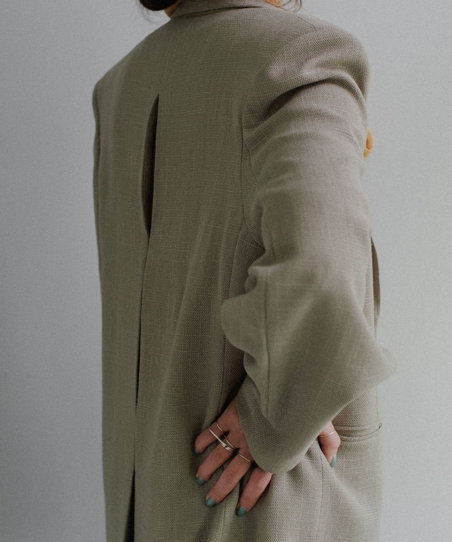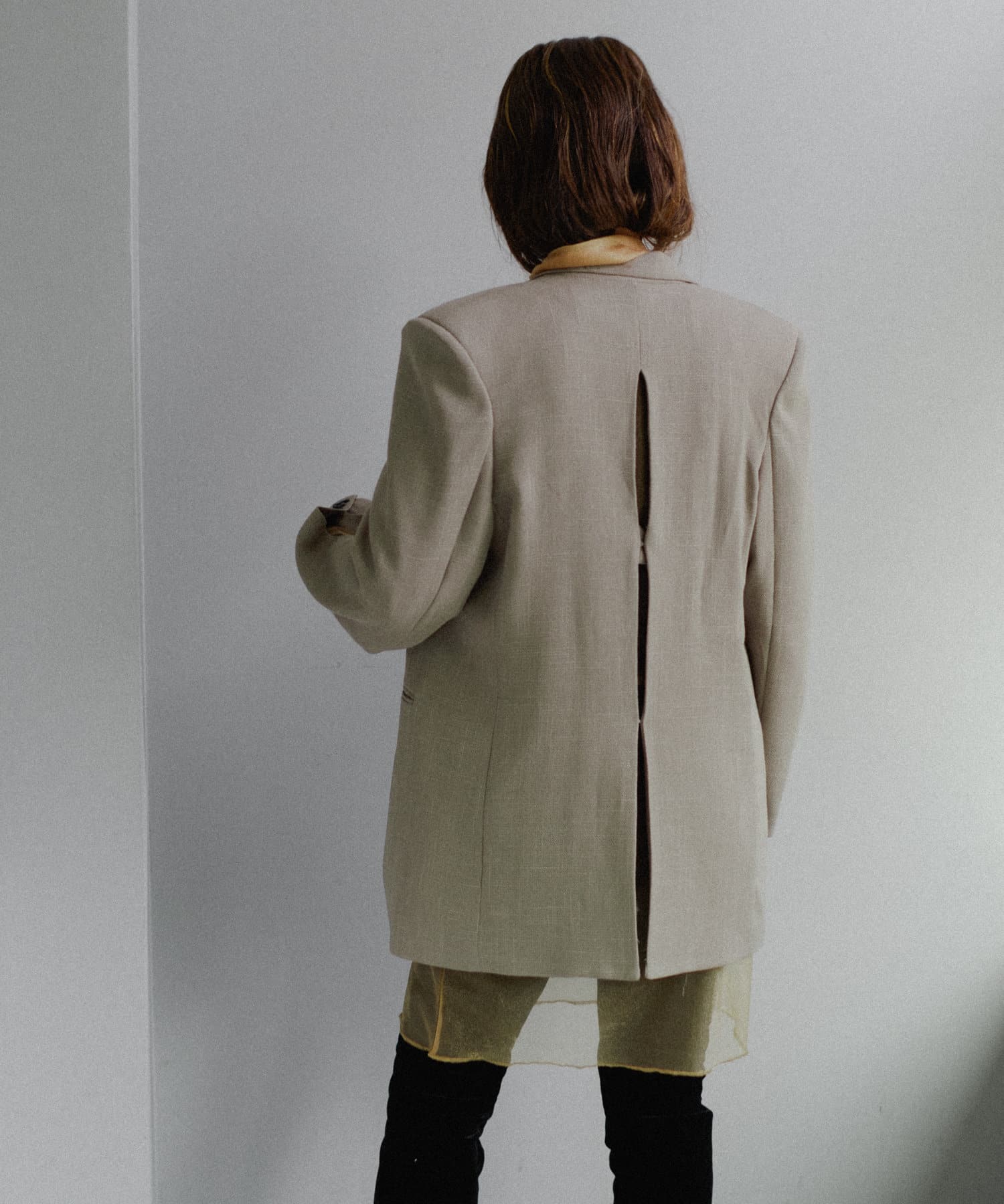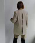 背中にはデザインポイントとして大きなスリットあきを入れており、ホックとタブで開け閉めしてサイズ感を調整していただけるので、窮屈感が苦手な方にも安心して着用いただけます。