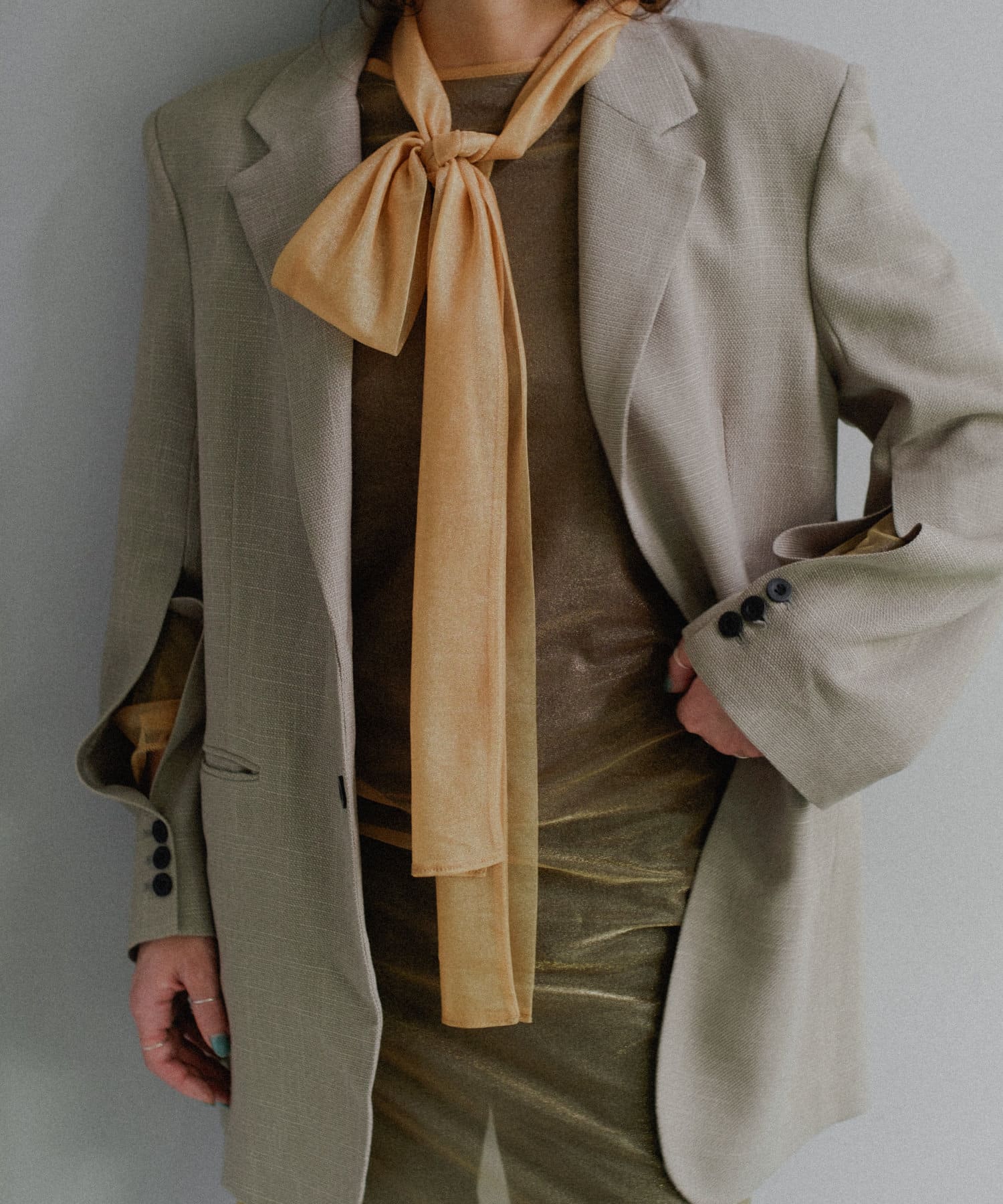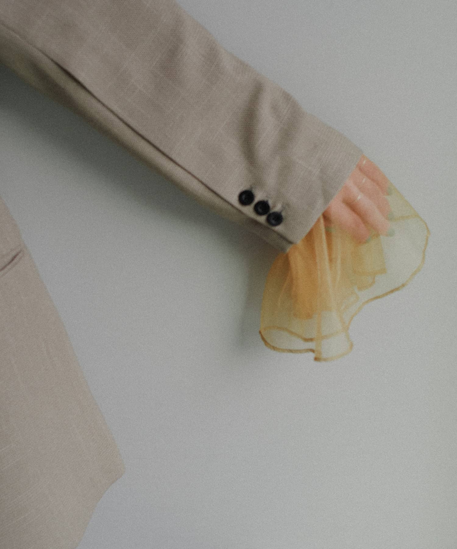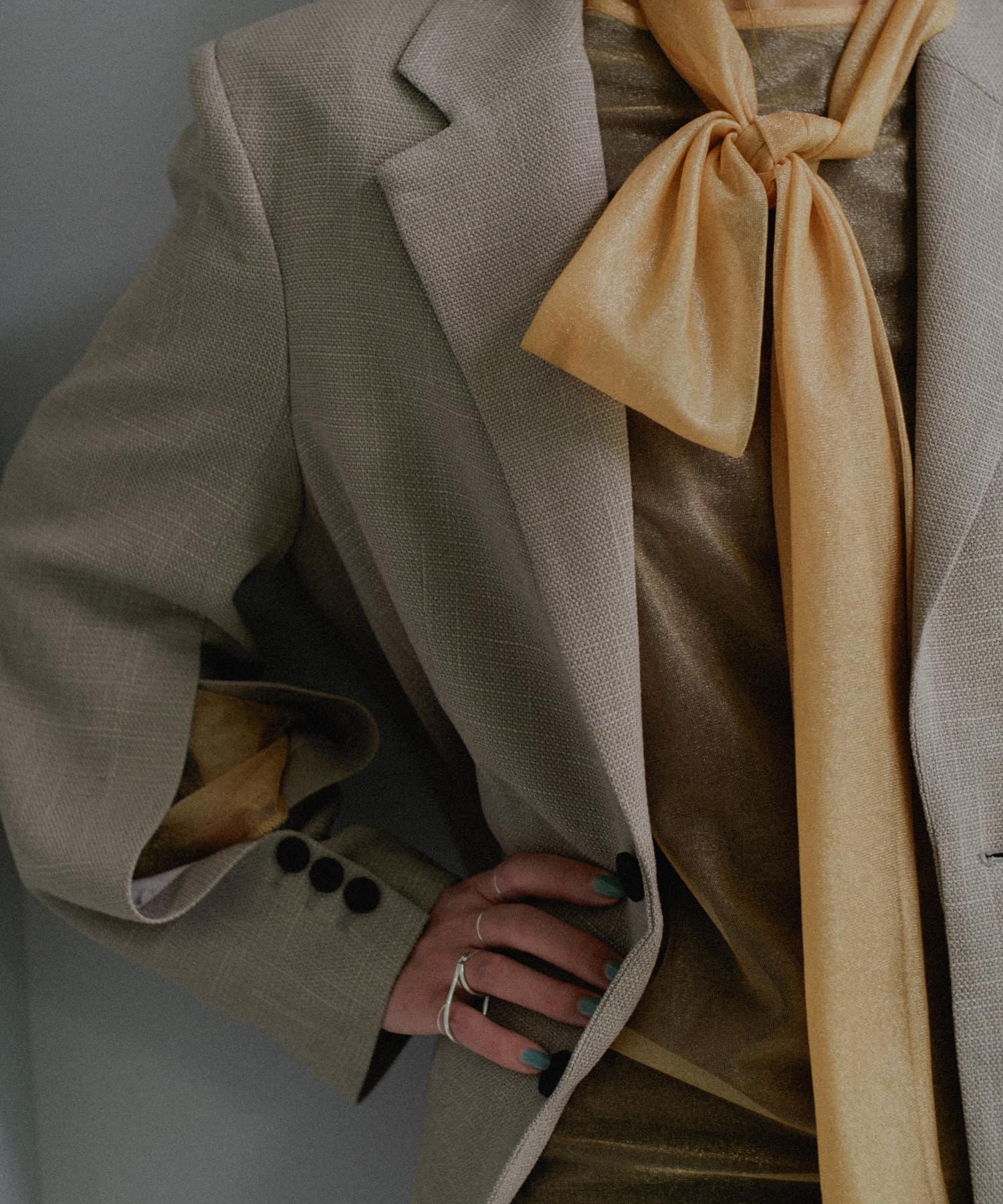 肩パッドの形、袖付きの角度、アームの刳りの深さを調整して、ボディラインをよりシャープに見せられるシルエットづくりに1番拘りました。