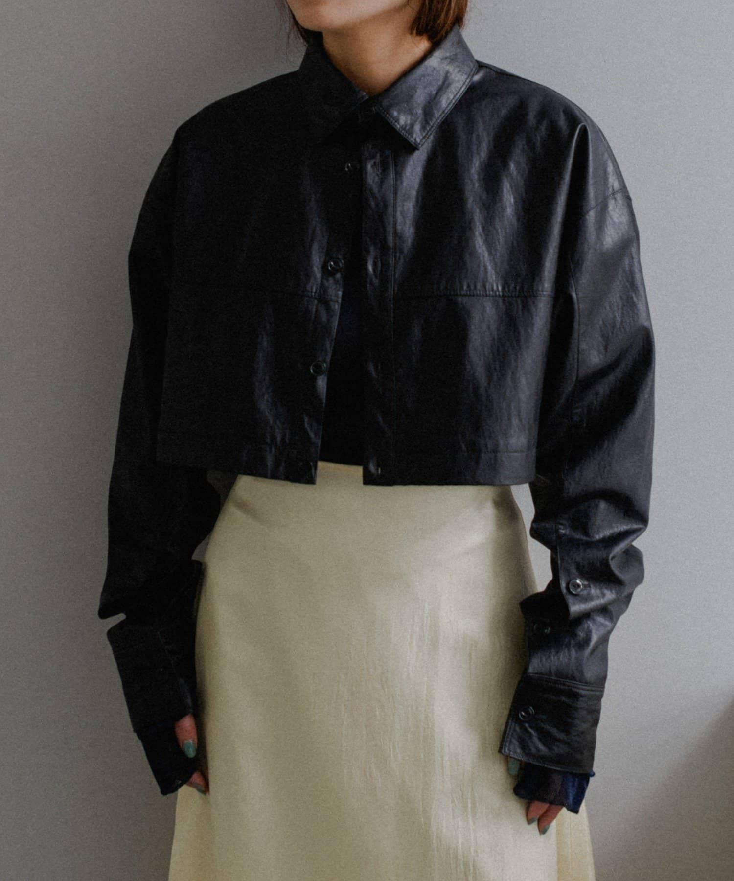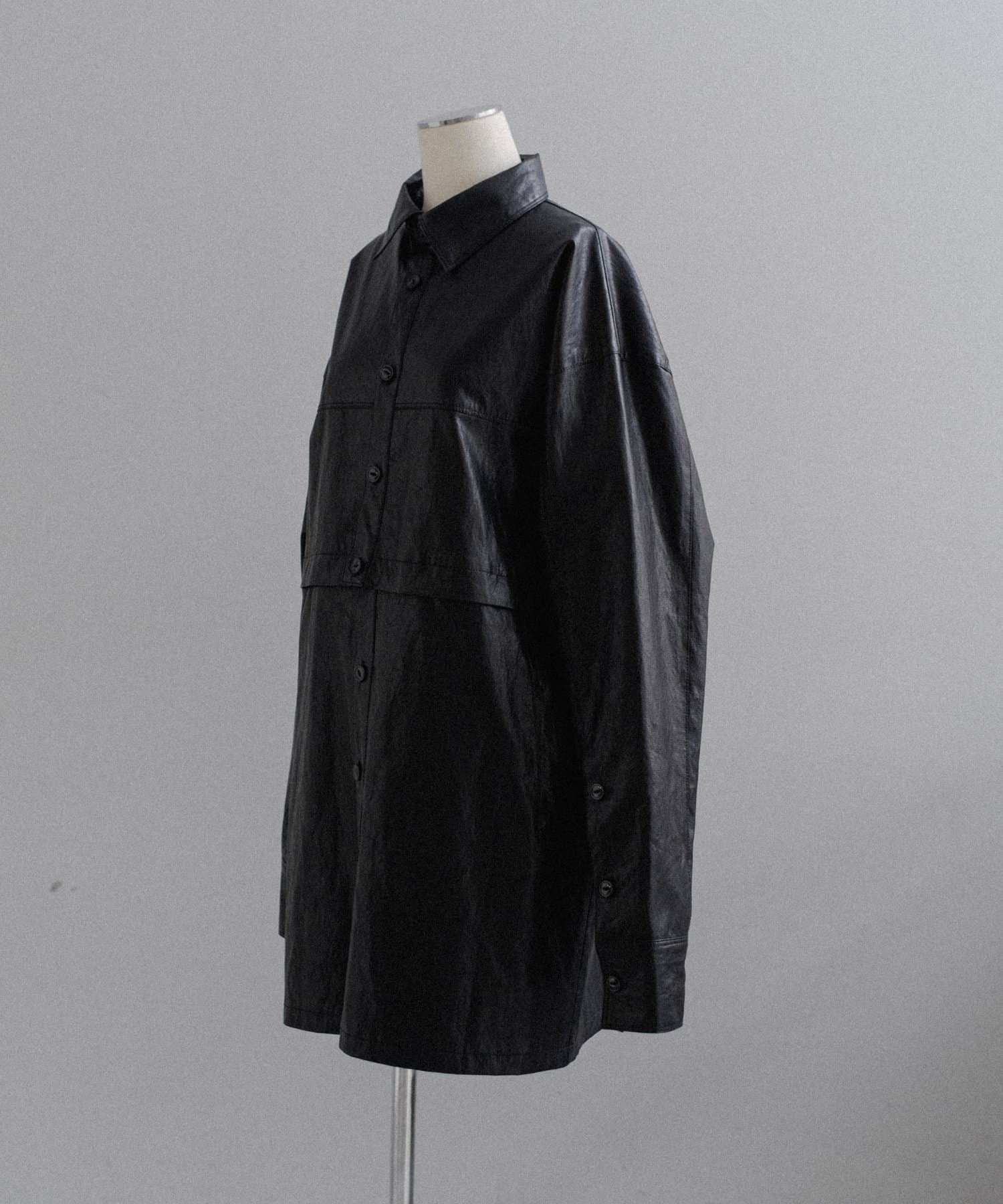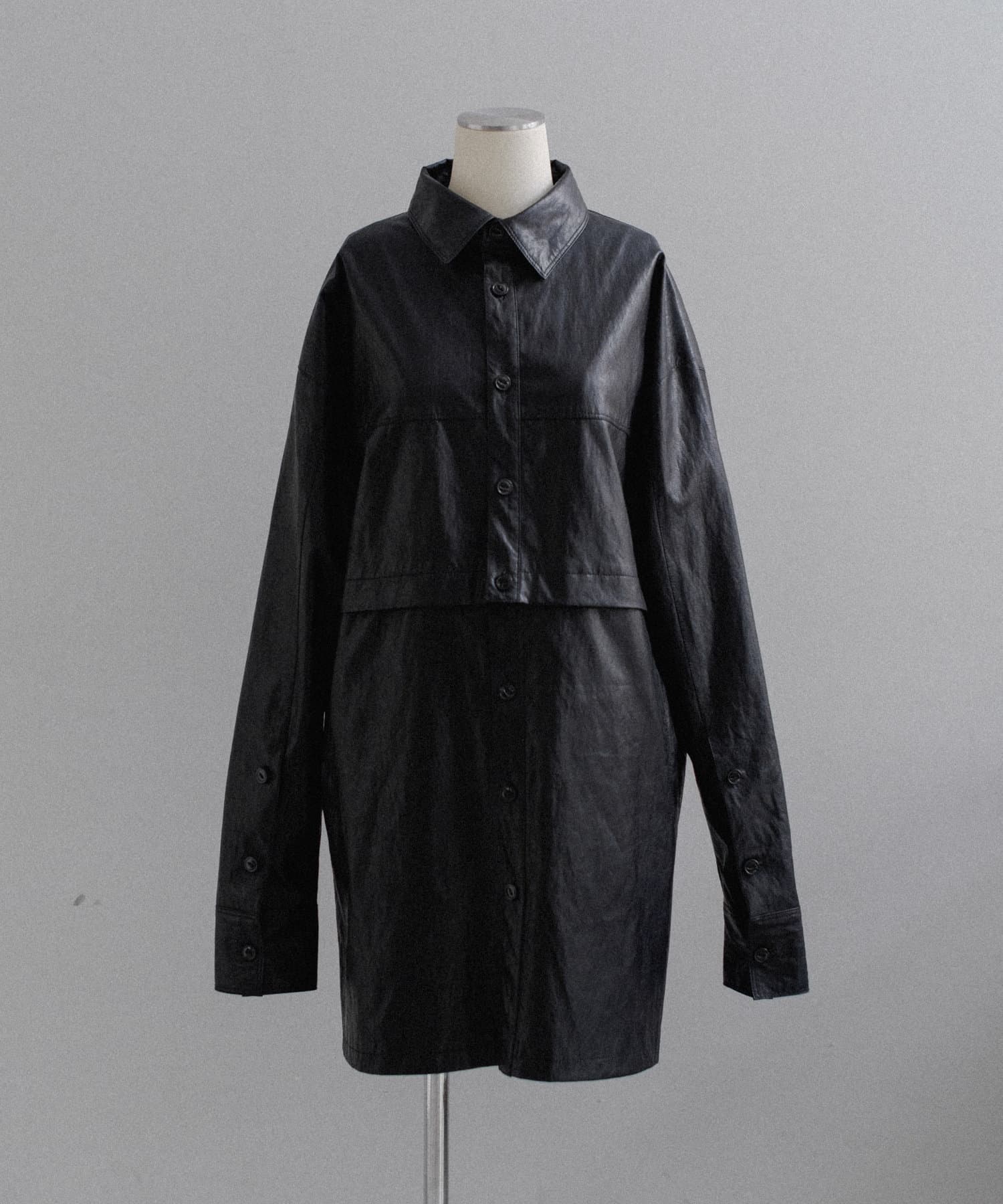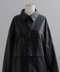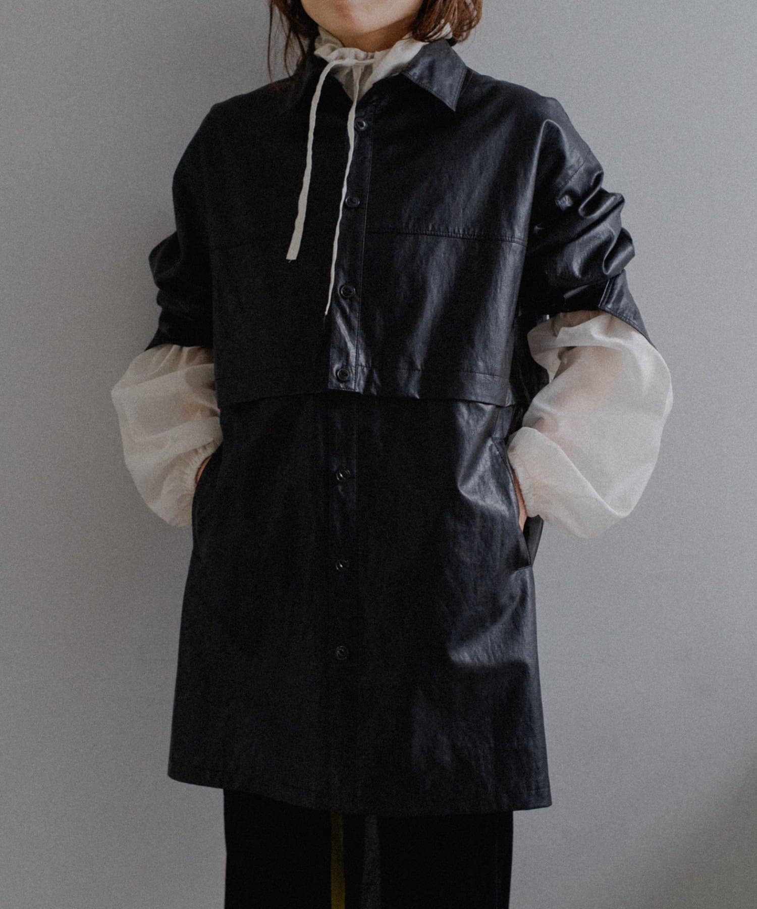 釦のアレンジで長さや形を変化させられる、ファンクショナルなエコレザーコート。一見シンプルなデザインですが、隠れたギミックが沢山盛り込まれた今シーズンのスペシャルピースです。非常に薄手で軽量なエコレザー生地を使用しているため、シャツのように手軽に羽織っていただけます。