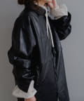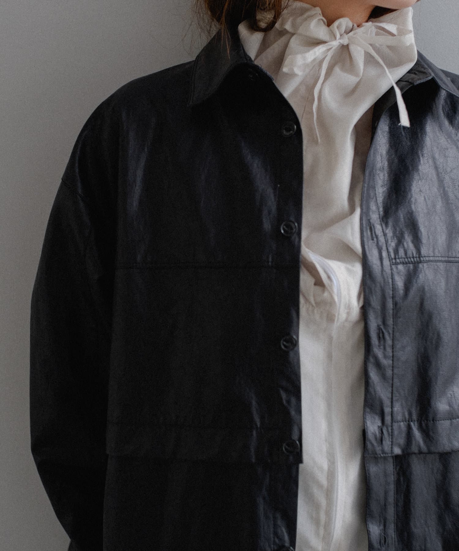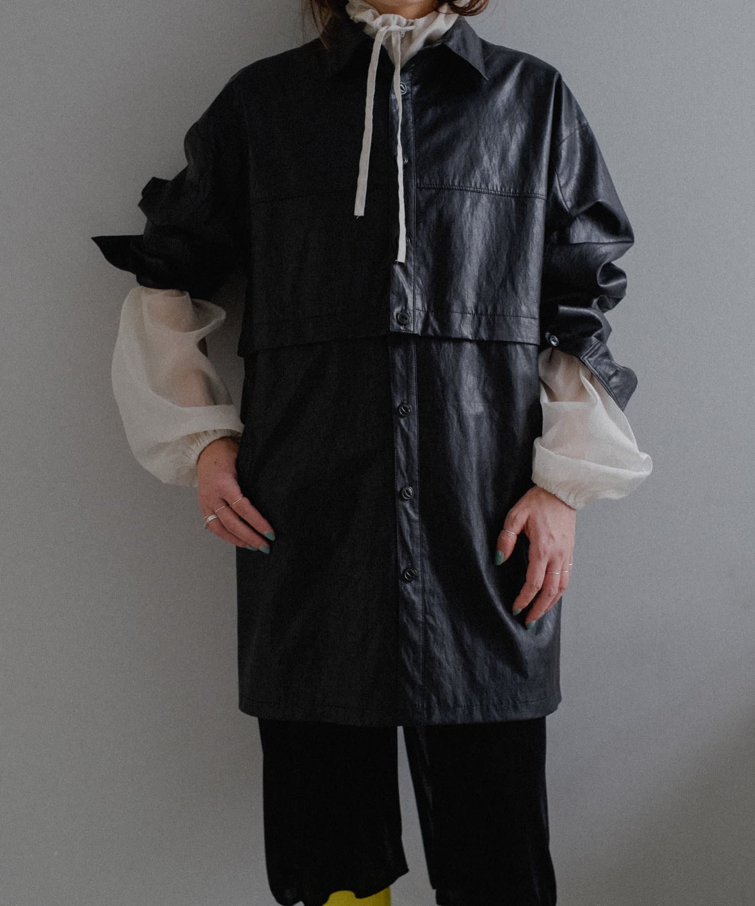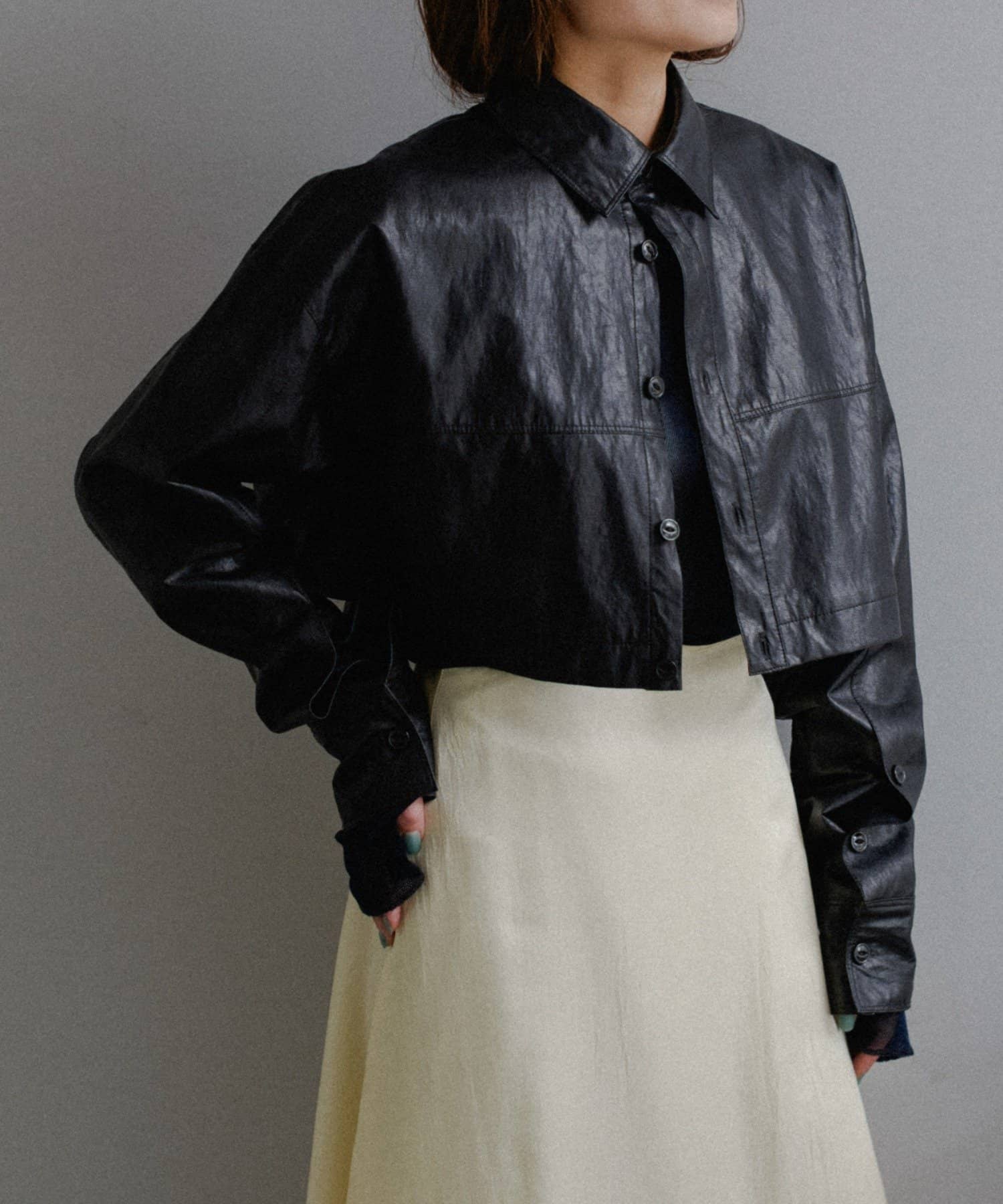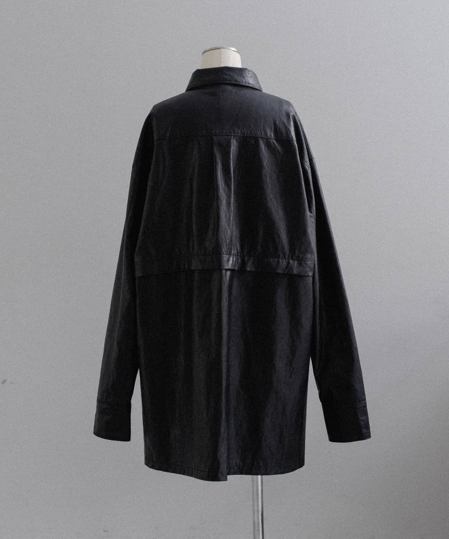 釦のアレンジで長さや形を変化させられる、ファンクショナルなエコレザーコート。一見シンプルなデザインですが、隠れたギミックが沢山盛り込まれた今シーズンのスペシャルピースです。非常に薄手で軽量なエコレザー生地を使用しているため、シャツのように手軽に羽織っていただけます。