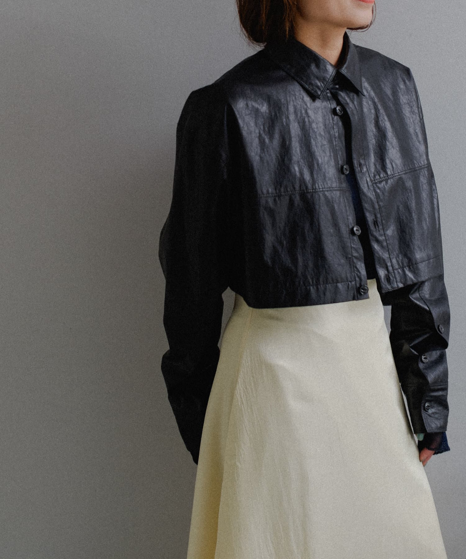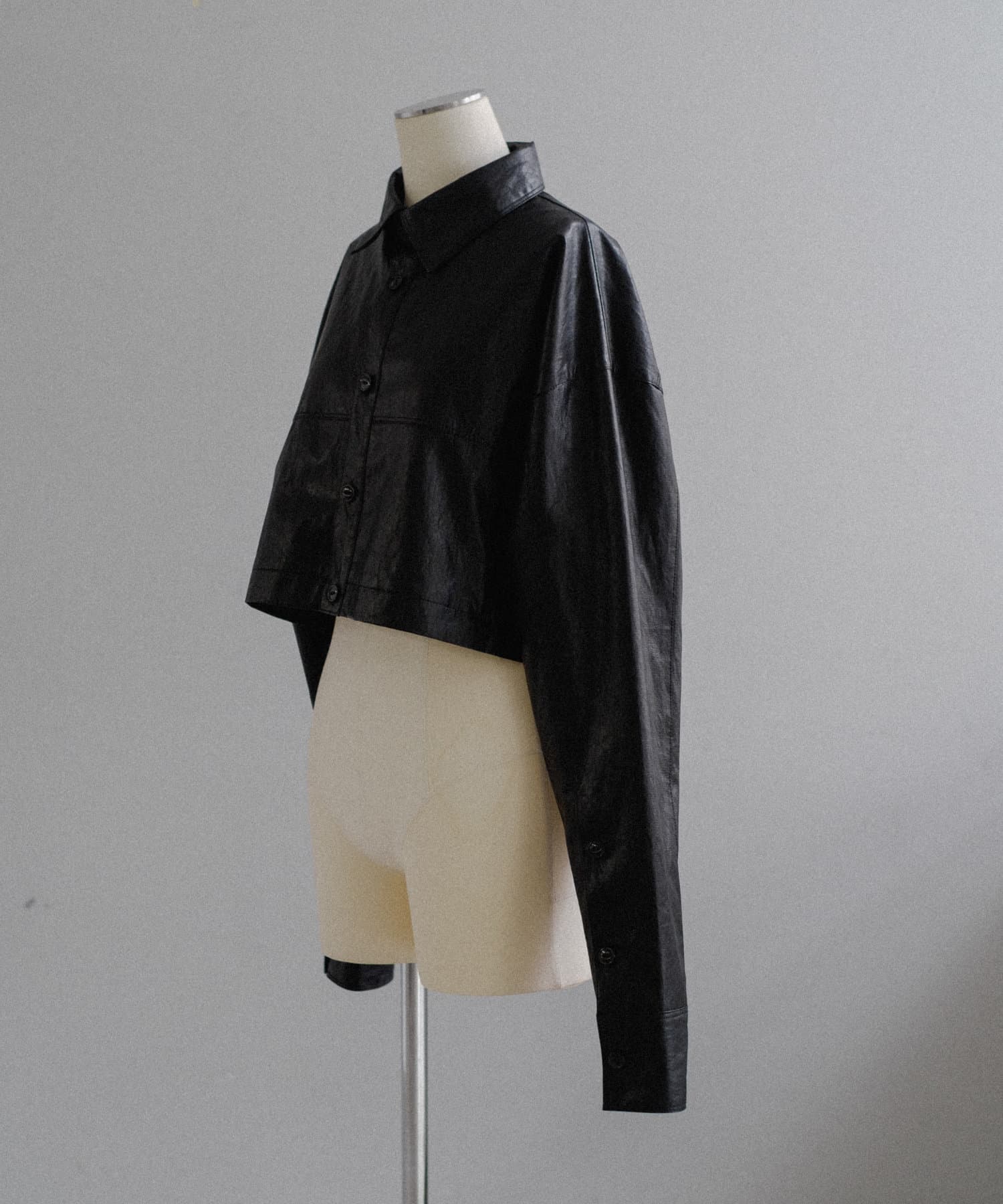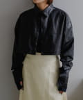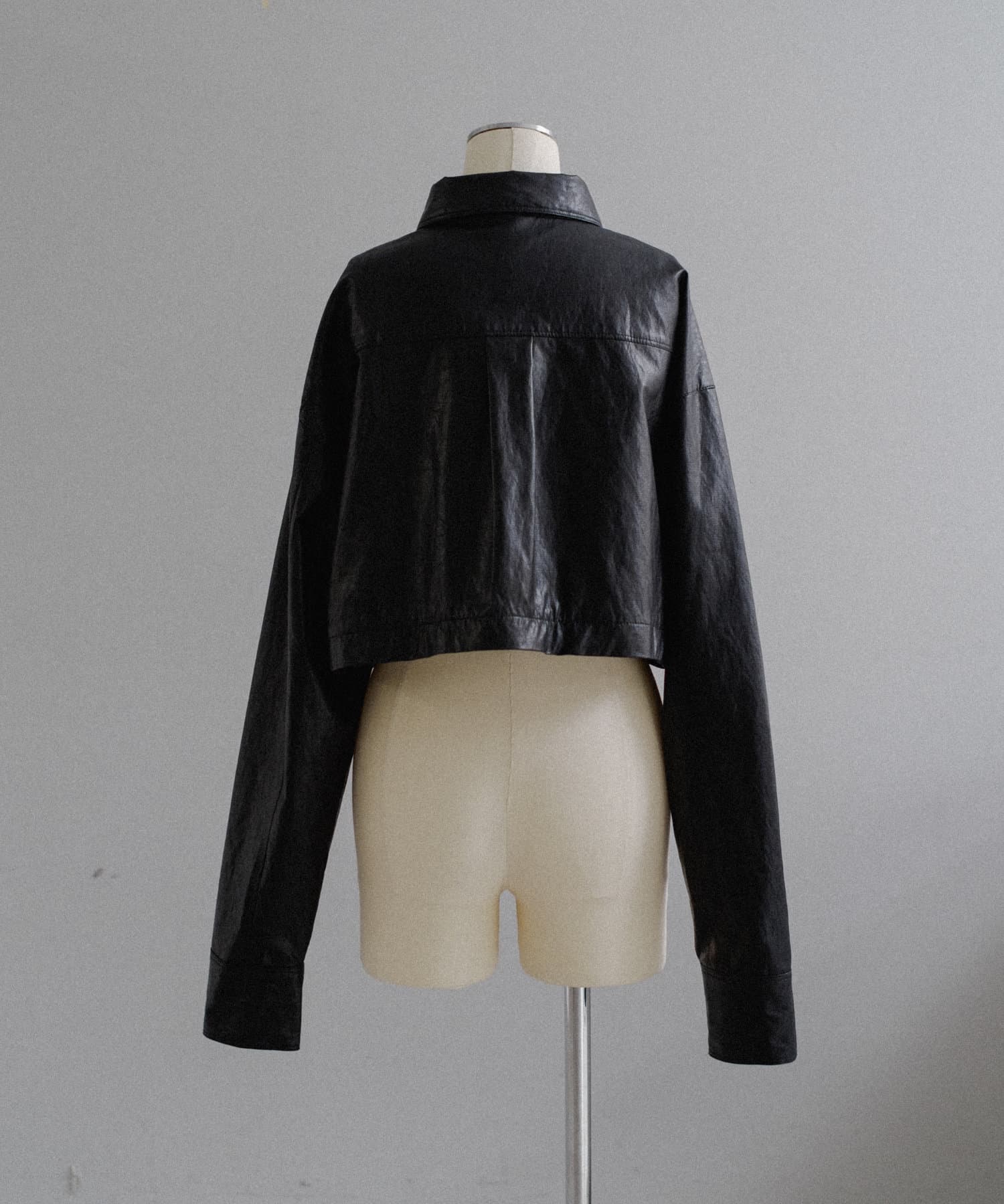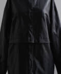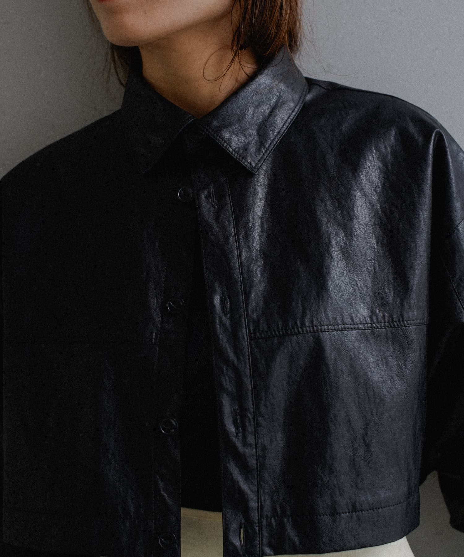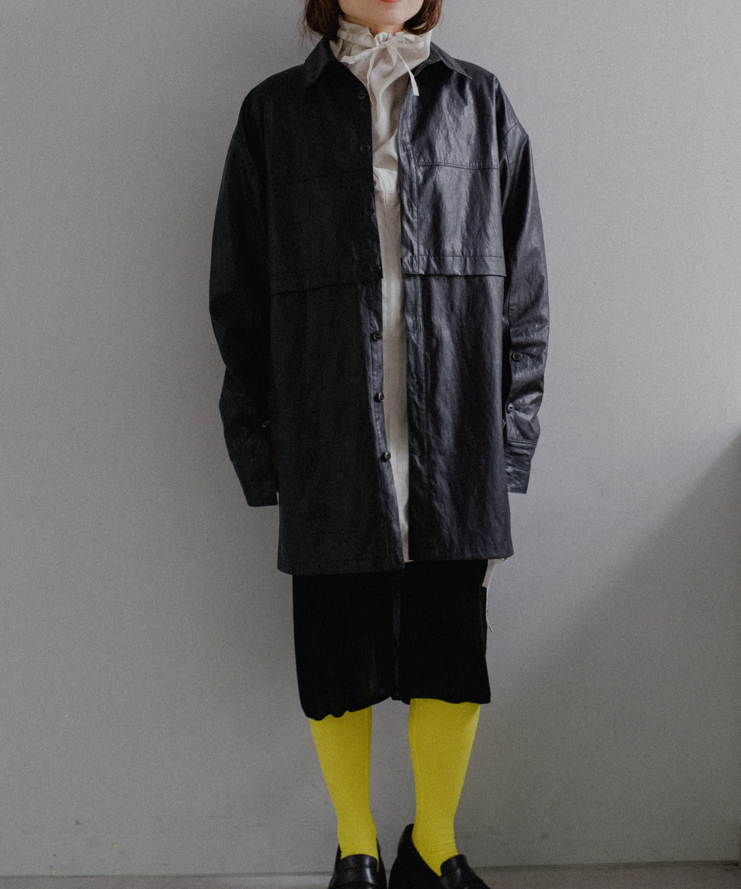 釦のアレンジで長さや形を変化させられる、ファンクショナルなエコレザーコート。一見シンプルなデザインですが、隠れたギミックが沢山盛り込まれた今シーズンのスペシャルピースです。非常に薄手で軽量なエコレザー生地を使用しているため、シャツのように手軽に羽織っていただけます。