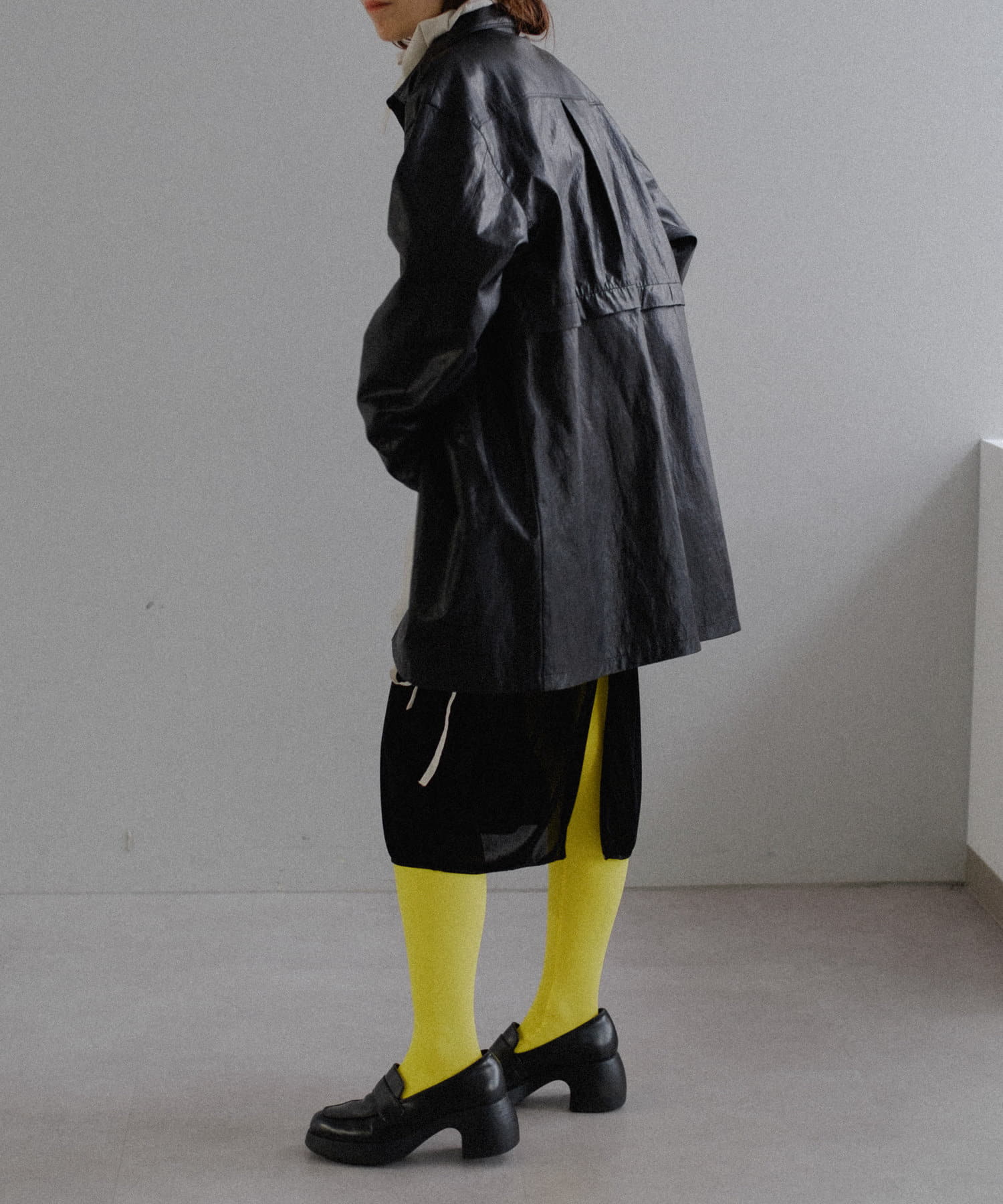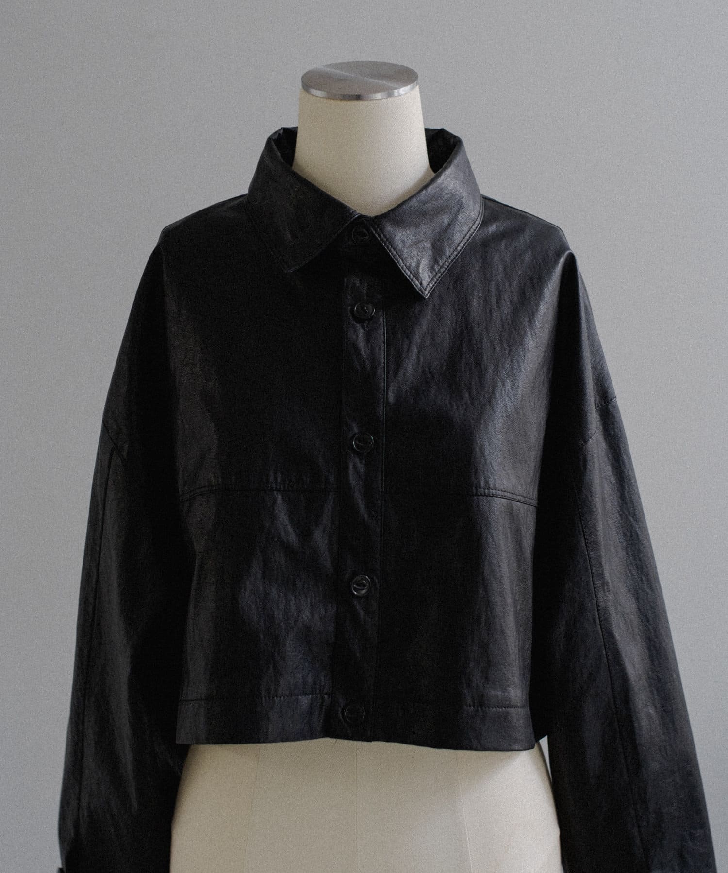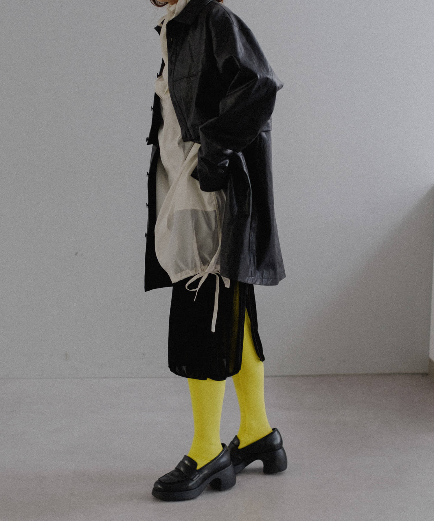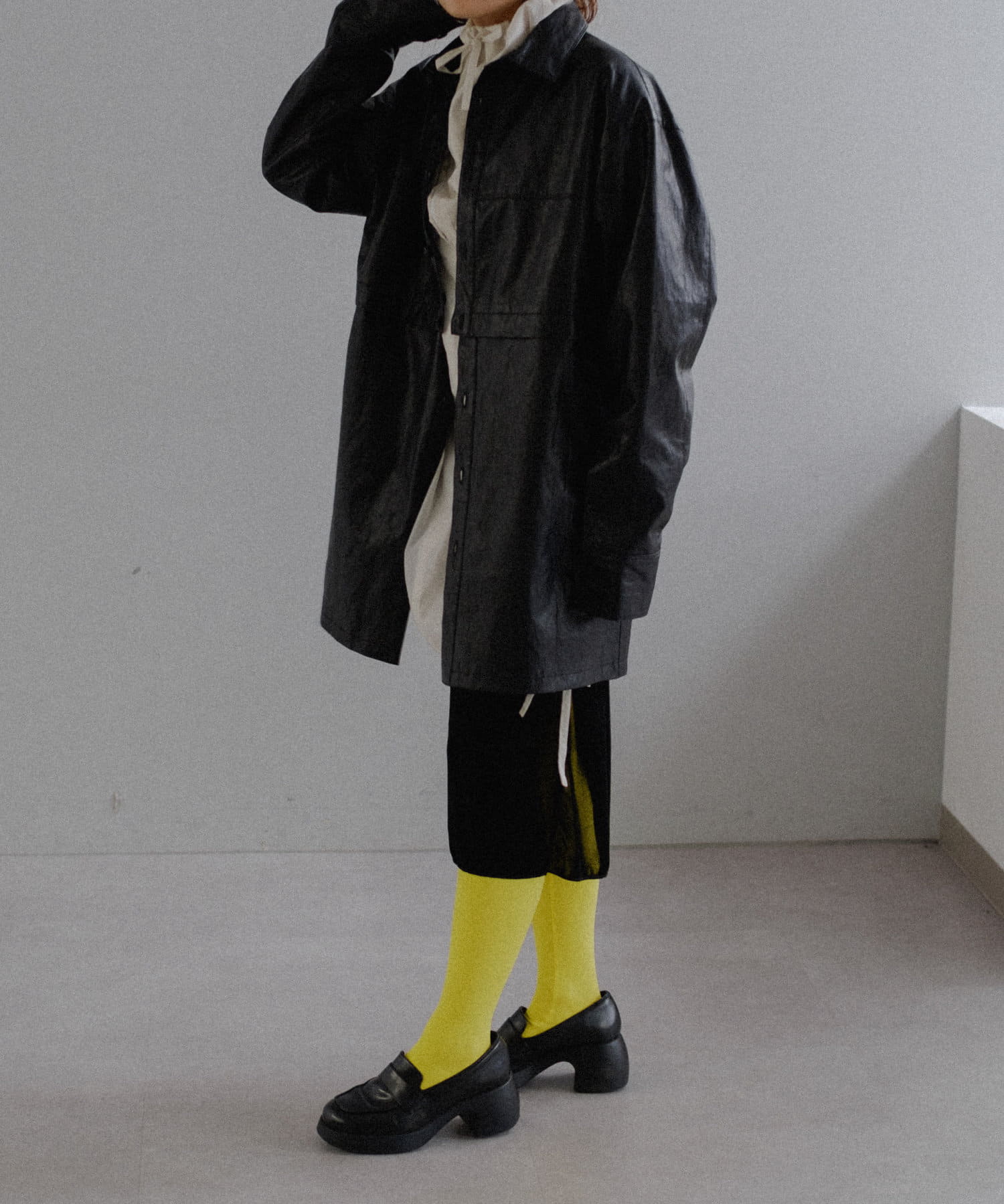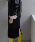 釦のアレンジで長さや形を変化させられる、ファンクショナルなエコレザーコート。一見シンプルなデザインですが、隠れたギミックが沢山盛り込まれた今シーズンのスペシャルピースです。非常に薄手で軽量なエコレザー生地を使用しているため、シャツのように手軽に羽織っていただけます。