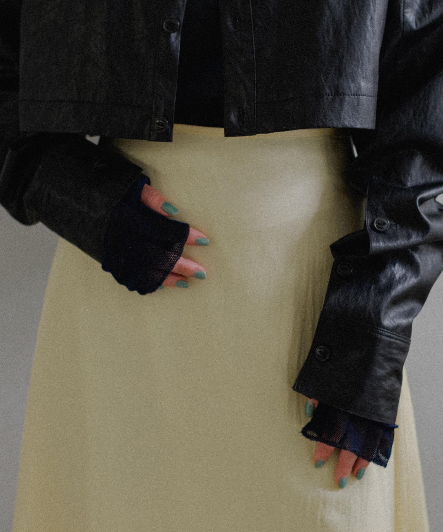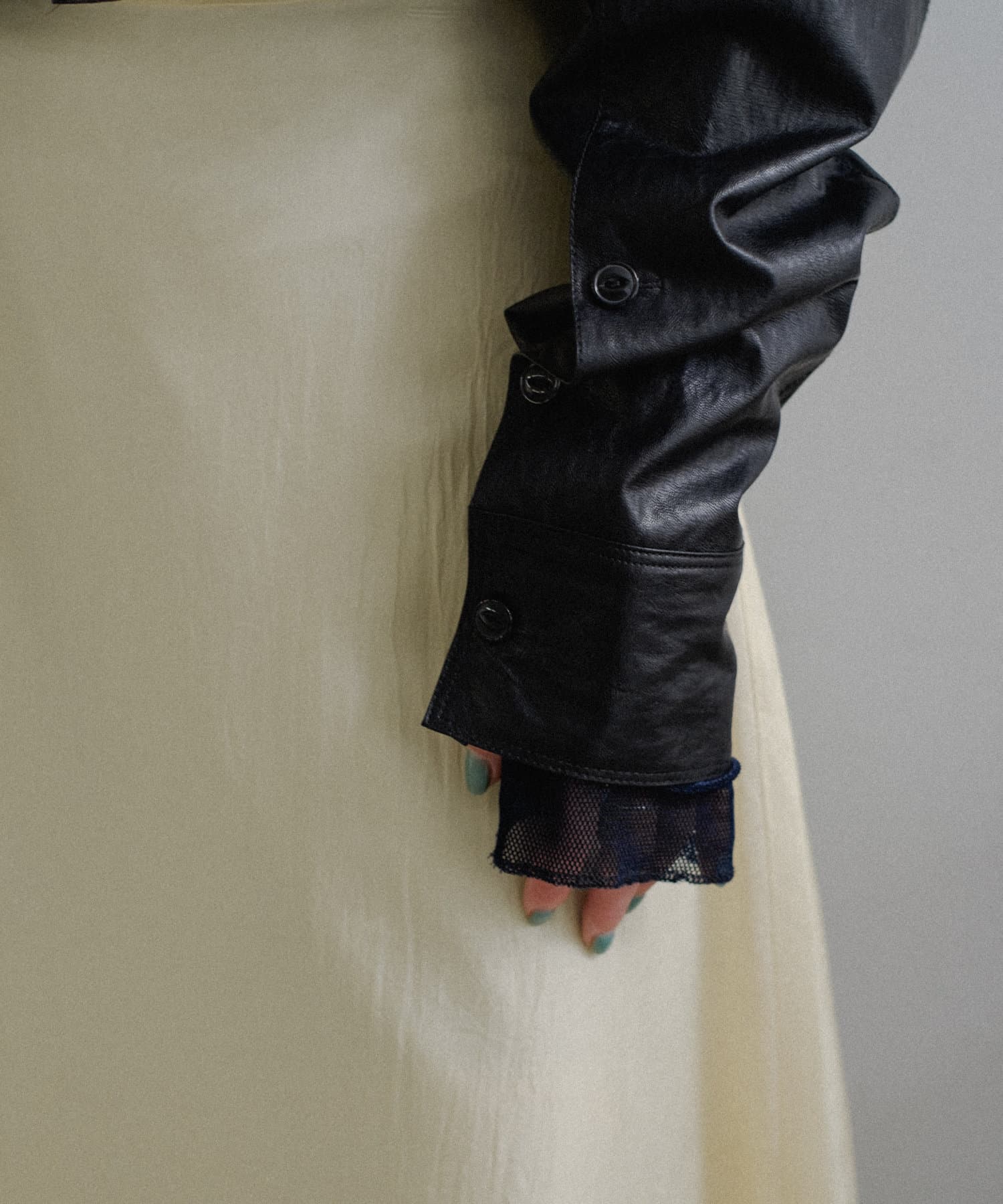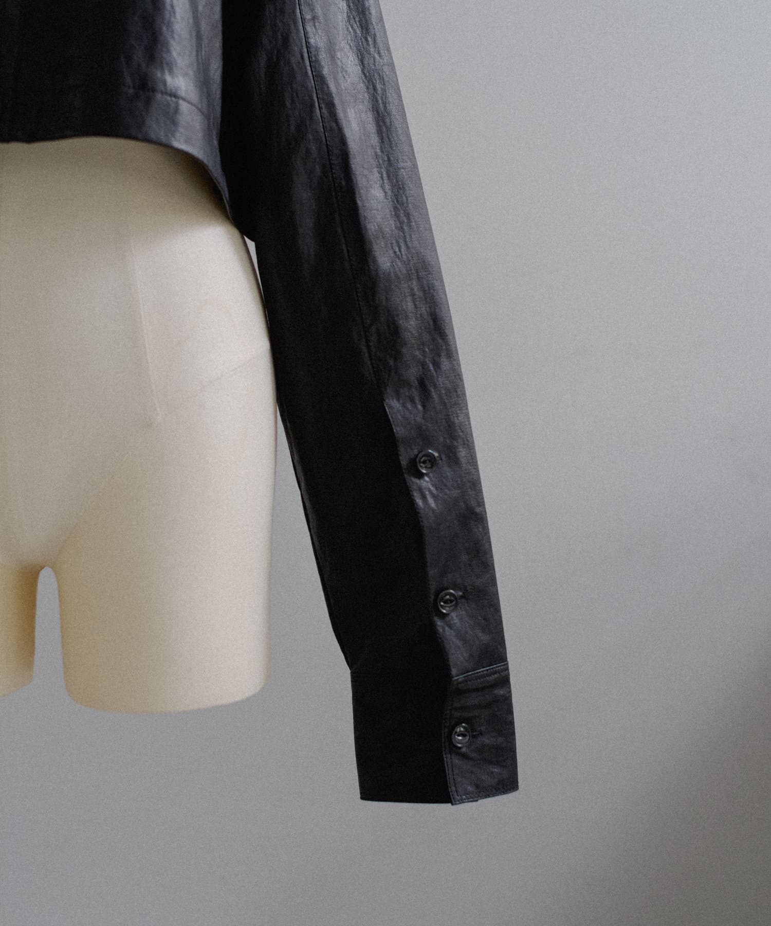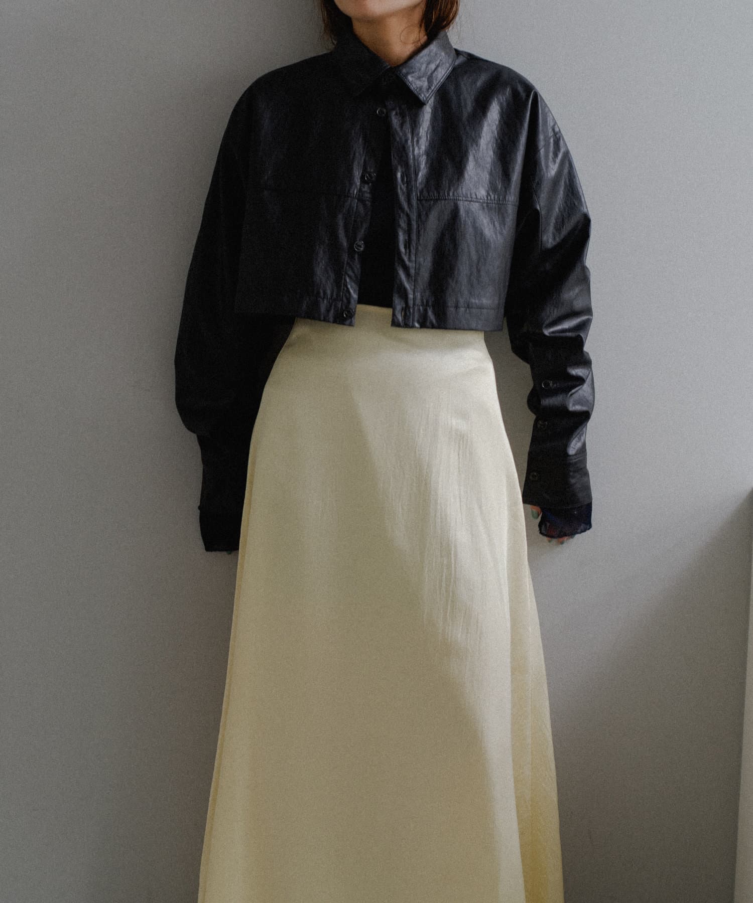 釦のアレンジで長さや形を変化させられる、ファンクショナルなエコレザーコート。一見シンプルなデザインですが、隠れたギミックが沢山盛り込まれた今シーズンのスペシャルピースです。非常に薄手で軽量なエコレザー生地を使用しているため、シャツのように手軽に羽織っていただけます。