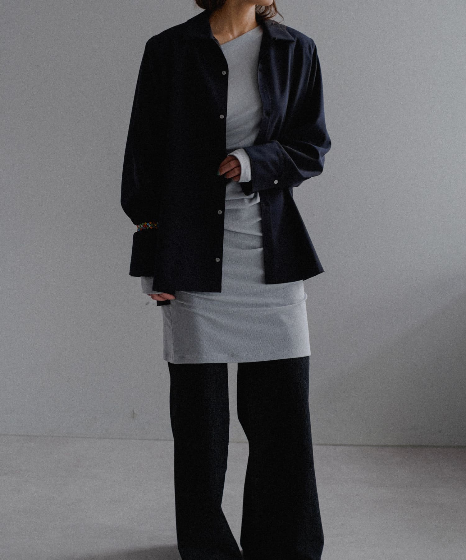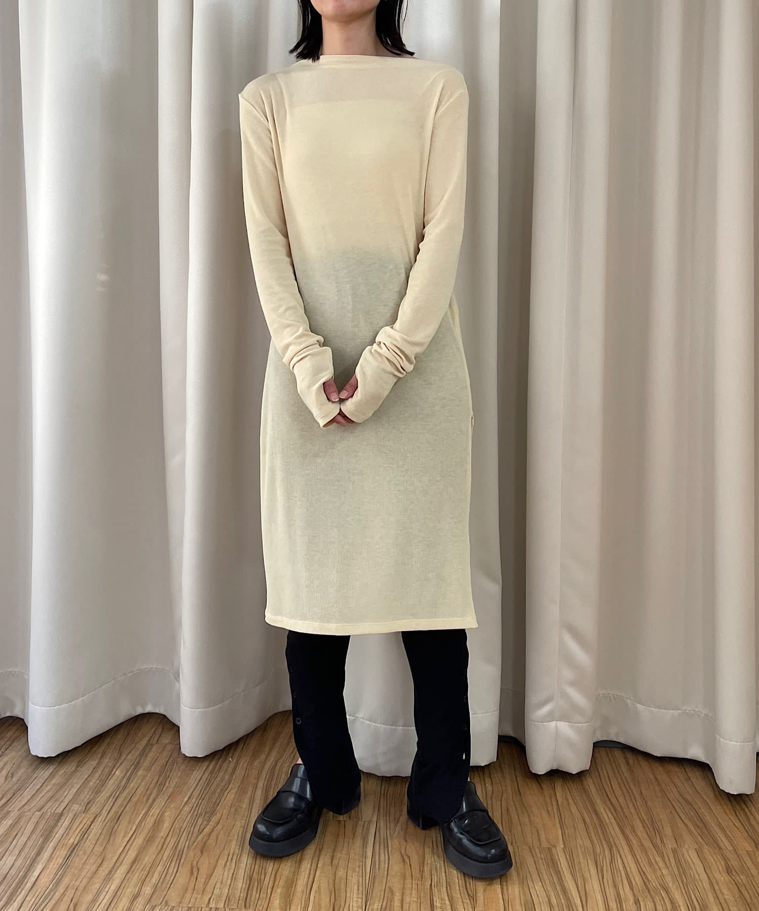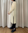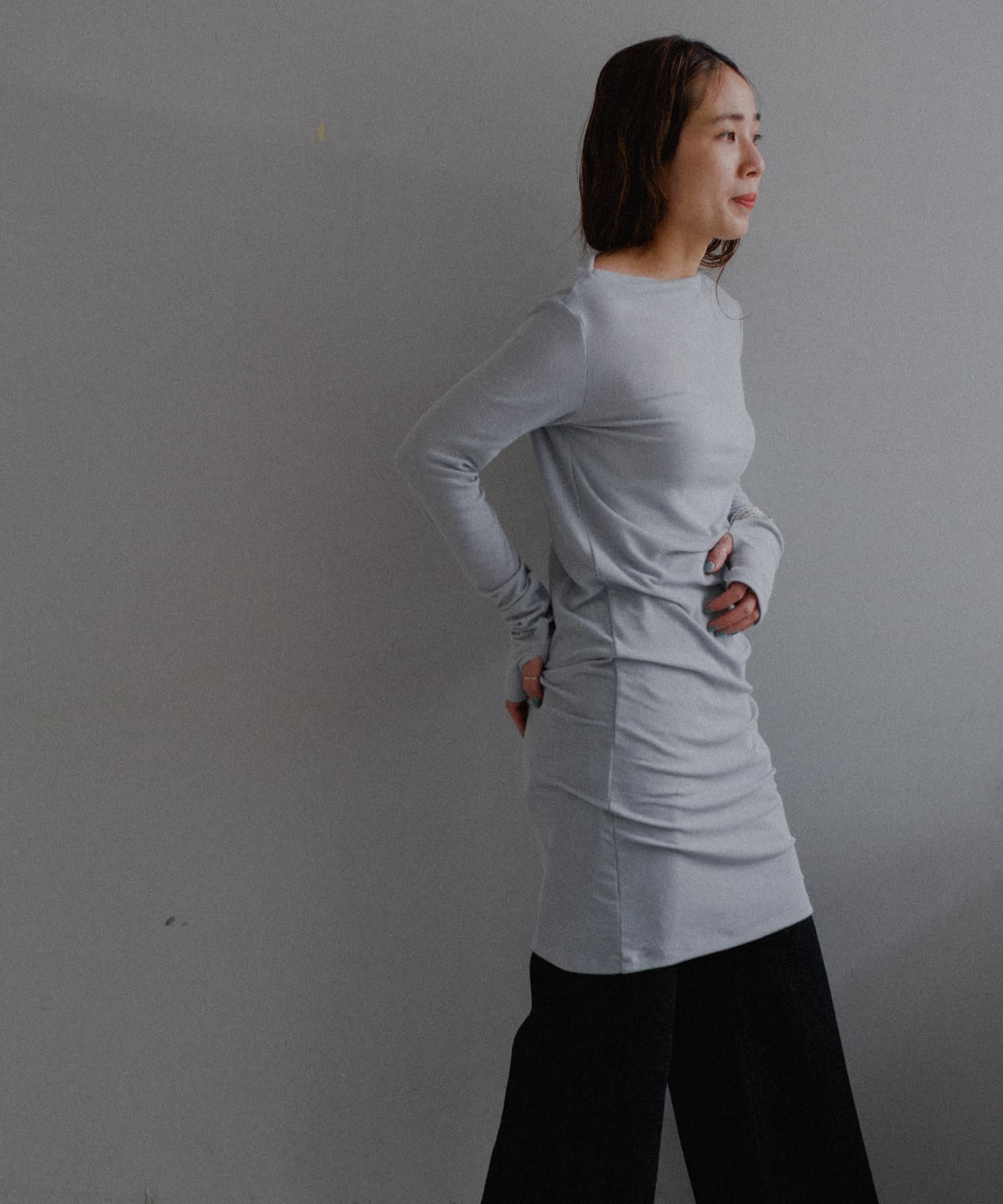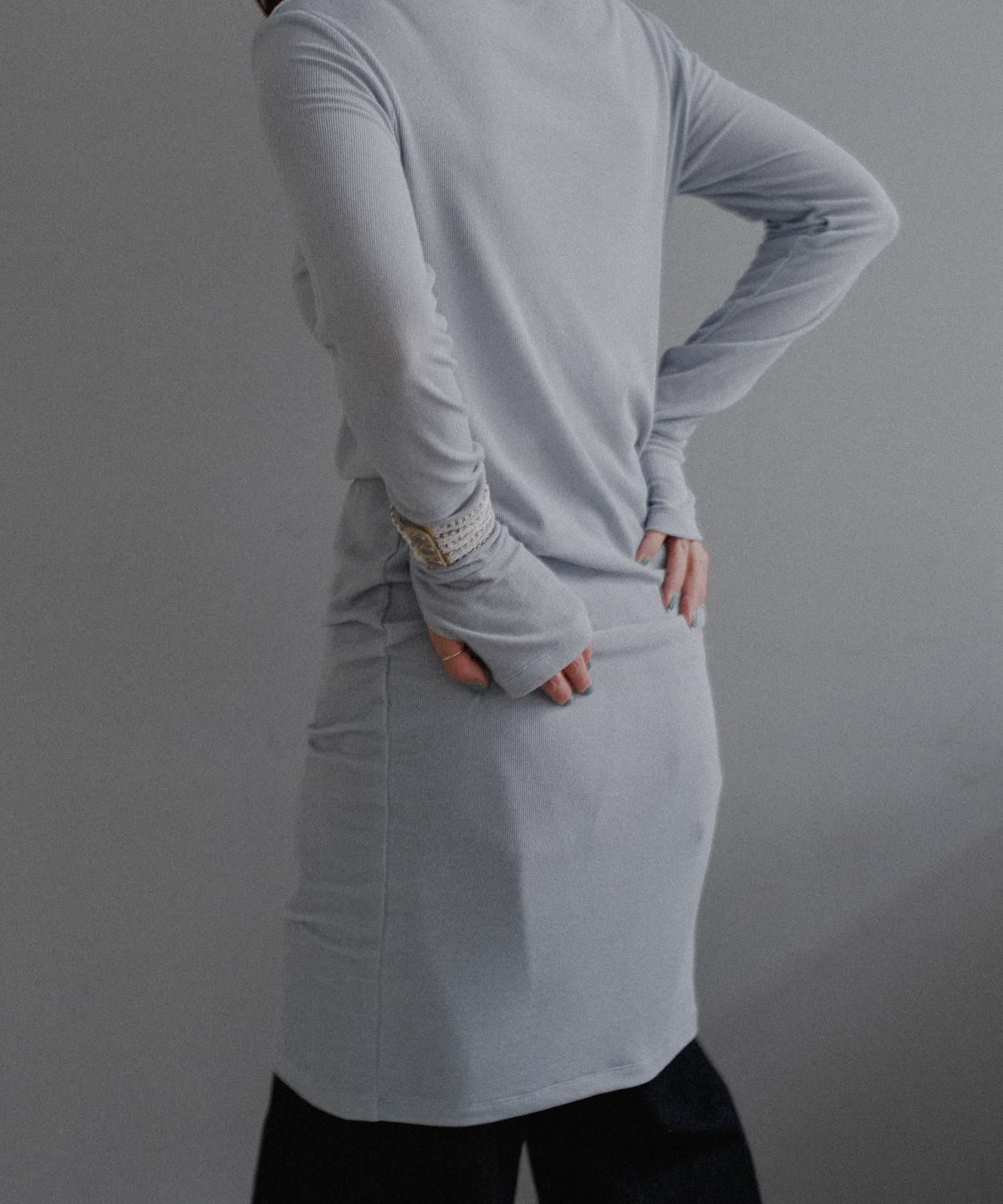 着丈は97cmとしっかりと腰回りが隠れるくらいの長さに設定しており、美しく、程よくボディラインを拾います。両脇にはロングファスナーが付いており、裾から脇下にかけて大きくスリット開きを作ることが出来るため、窮屈感なく着用いただけます。