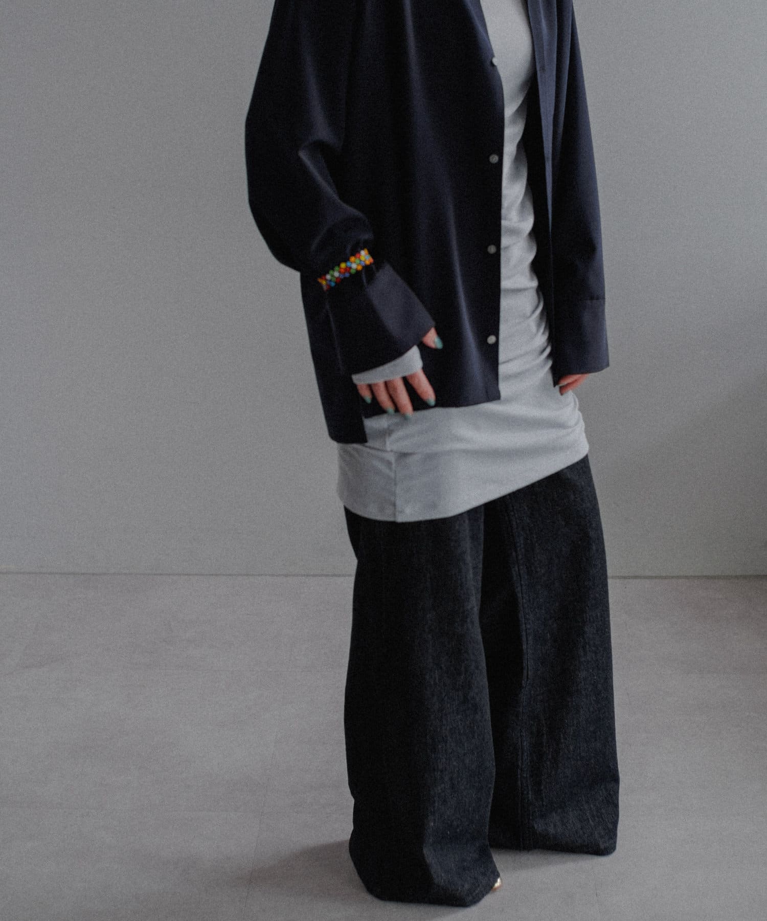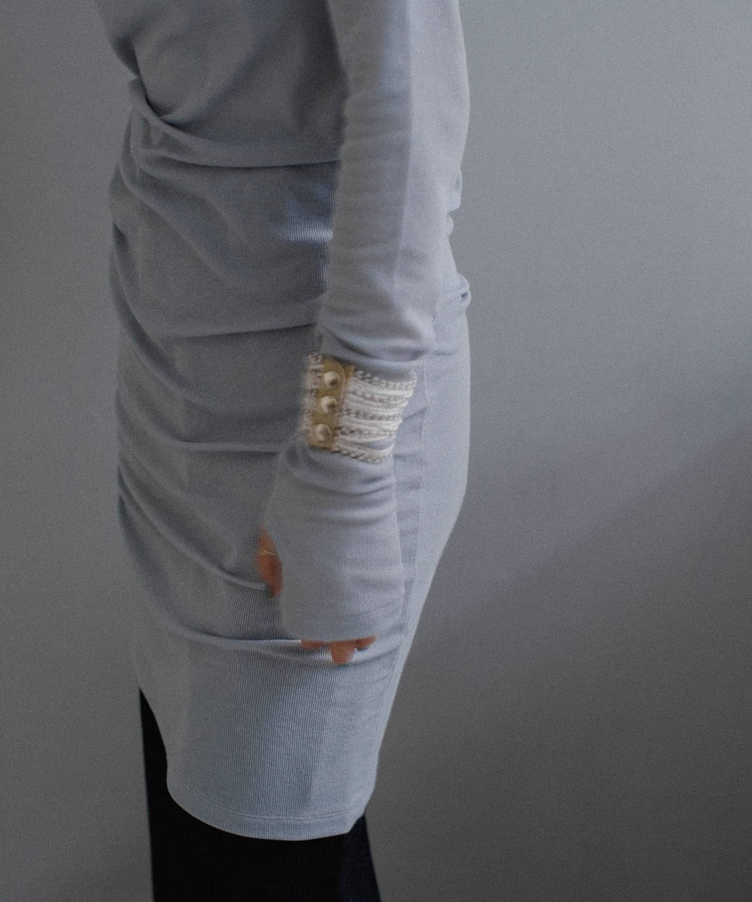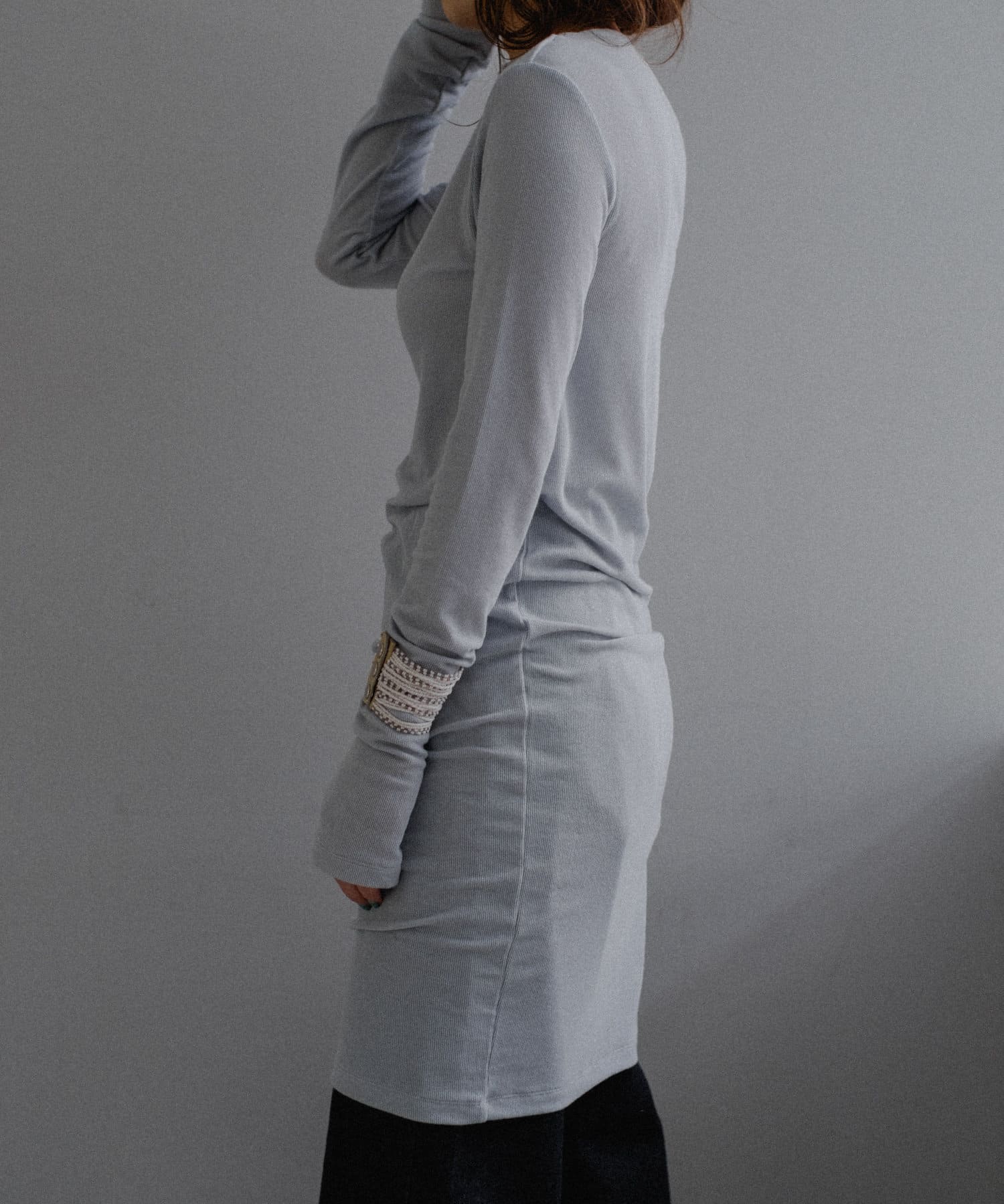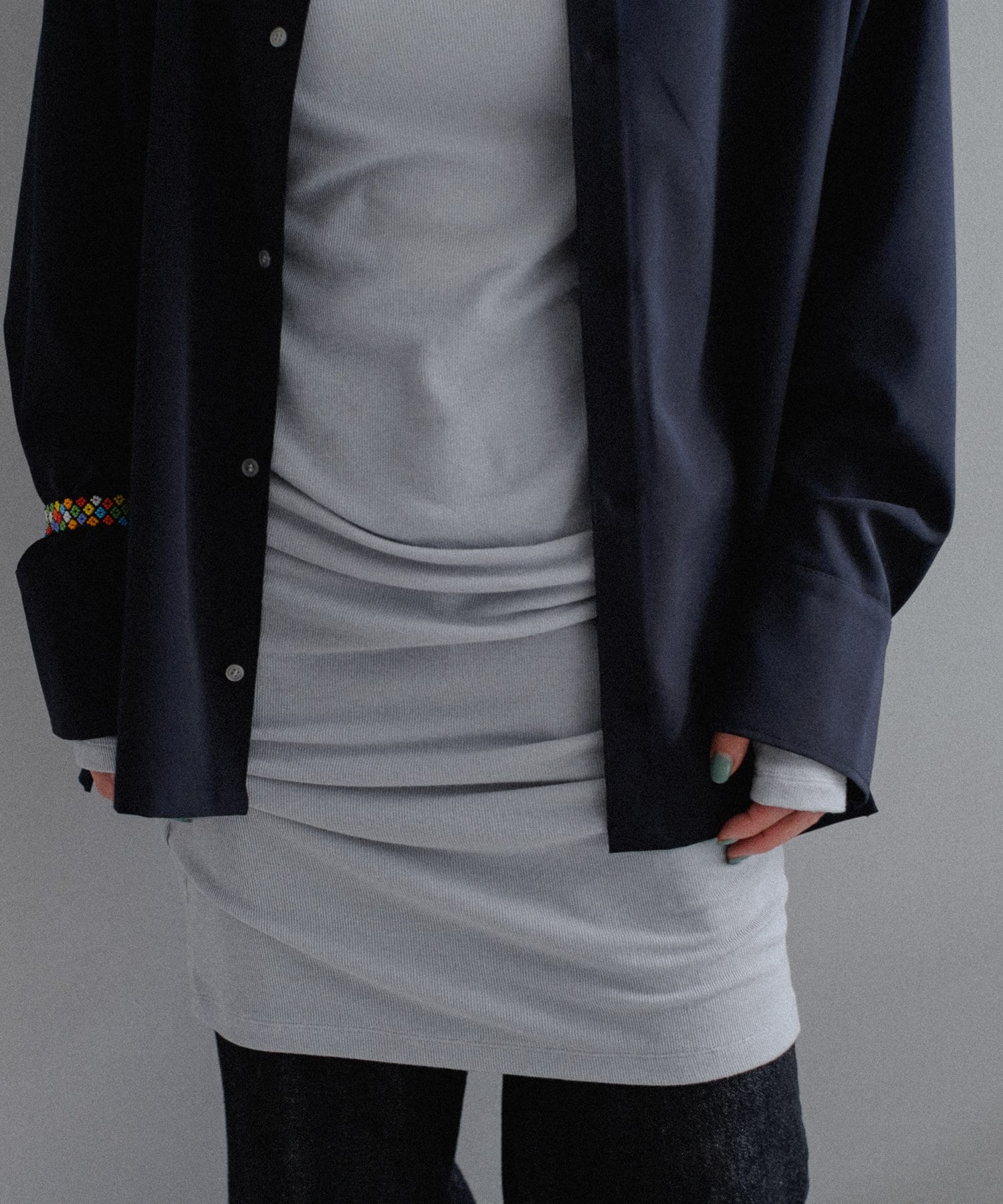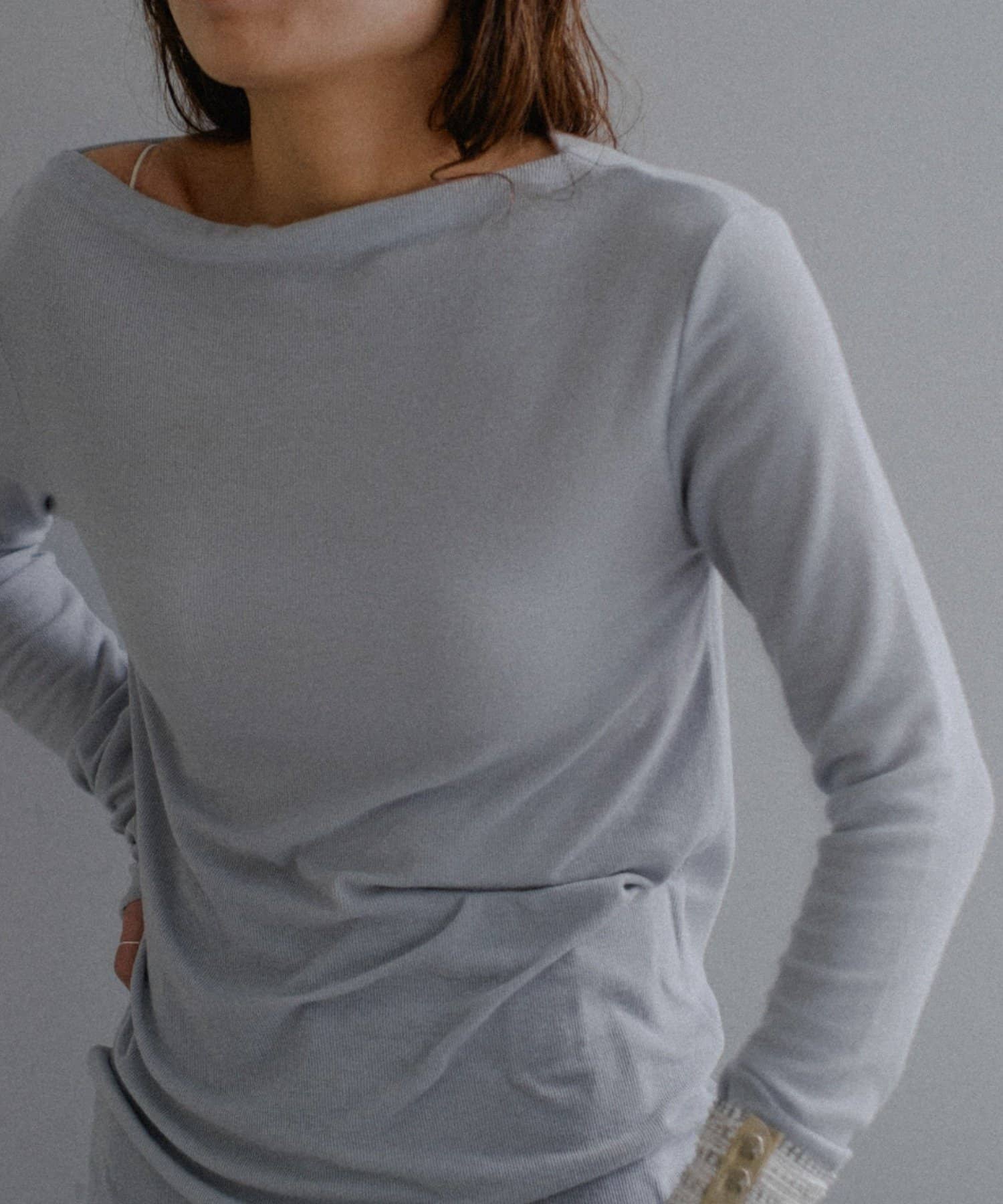 生地はしっかりとキックバックがある伸びやかなリブの生地。絶妙な透け感と、シャリっとしたドライタッチな肌触りが特徴です。