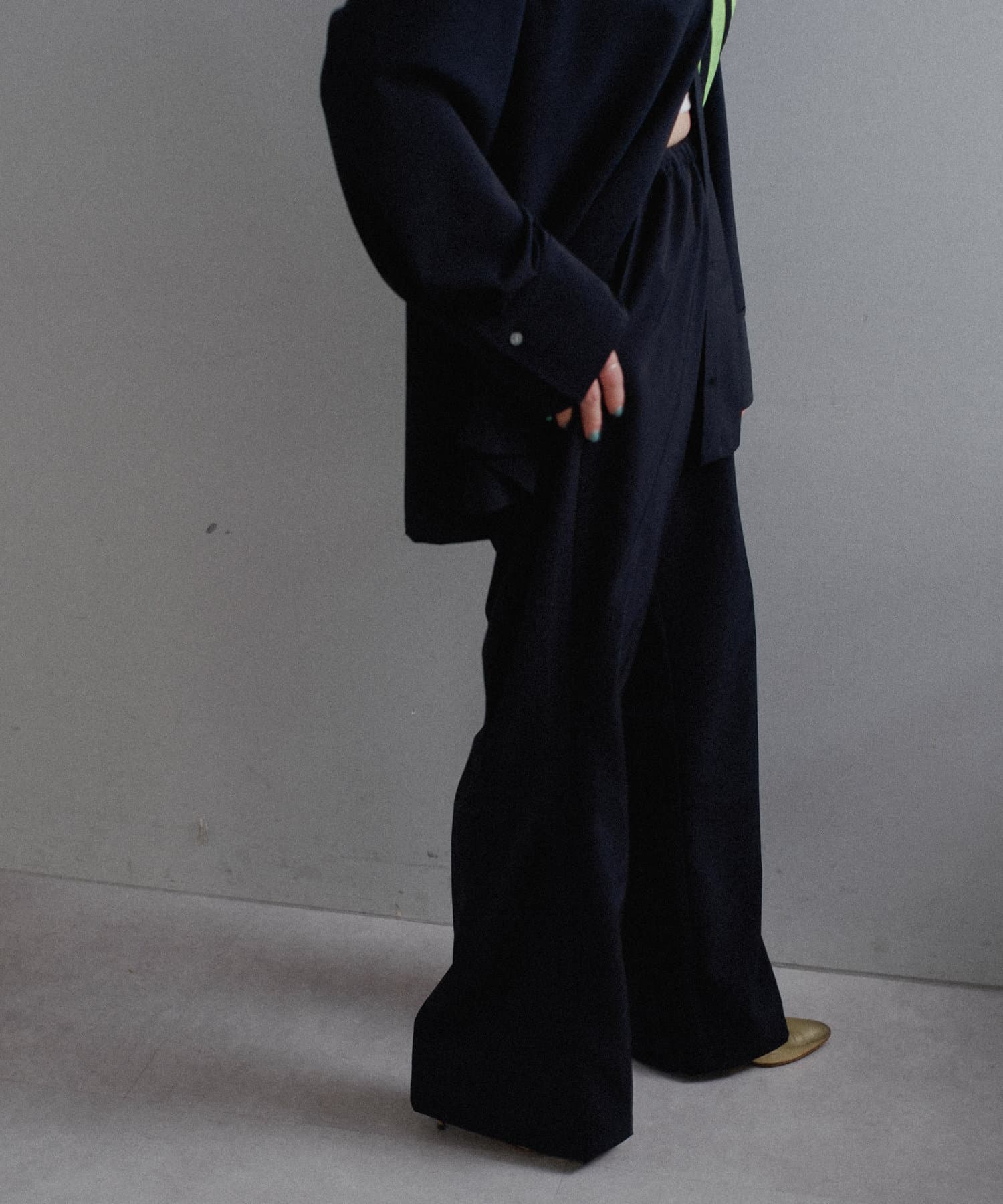 腰回りやヒップはゆったりと大きく、裾巾をやや小さく設定することで自然なカーブのフォルムを作っています。厚底シューズにかぶせるように、ズルズルと履いていただくのがお勧めです。STYLE 03.で展開し非常に好評を頂いていた、Suede touch daily pantsの形を引き継ぎ、脇線を前に振っているので、脚がすっきりと長く見せられスタイルアップが叶います。イージーパンツながら、フォーマルなシーンにも日常着にも手に取りたくなる万能なアイテムです。