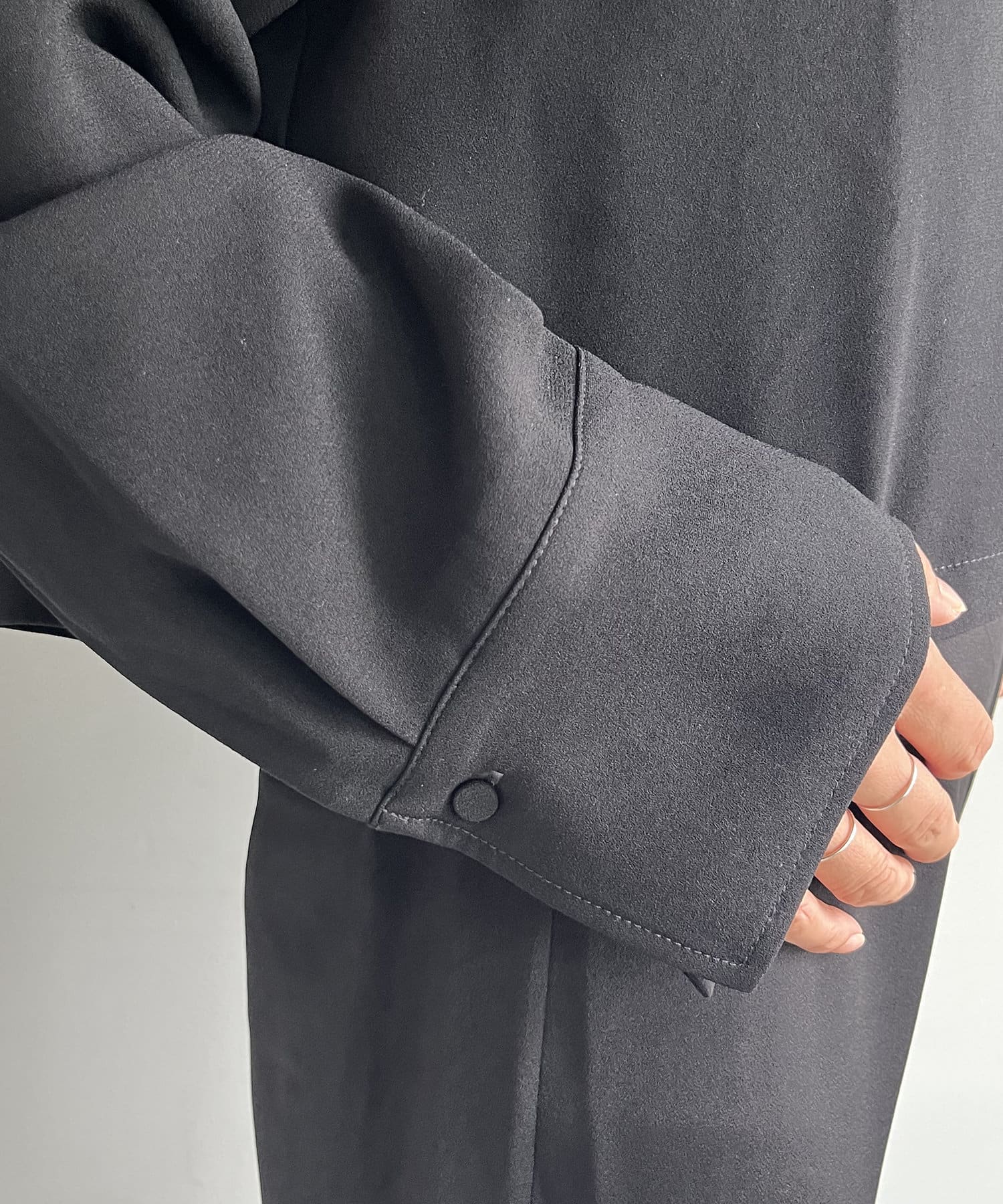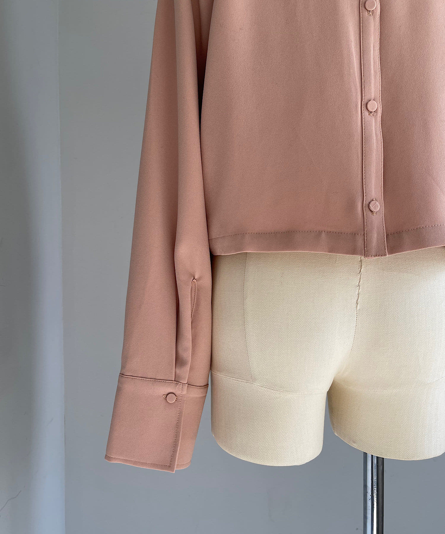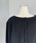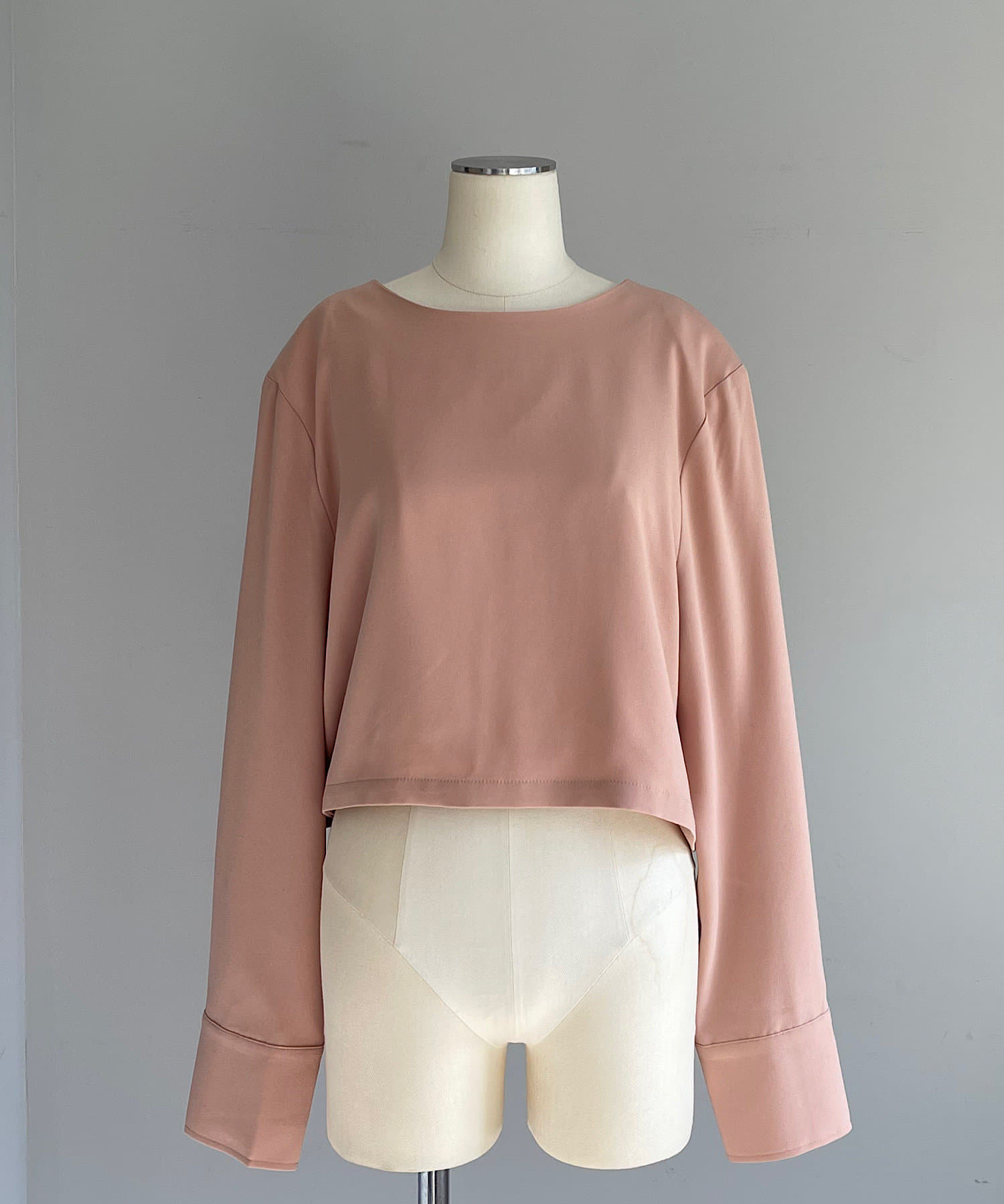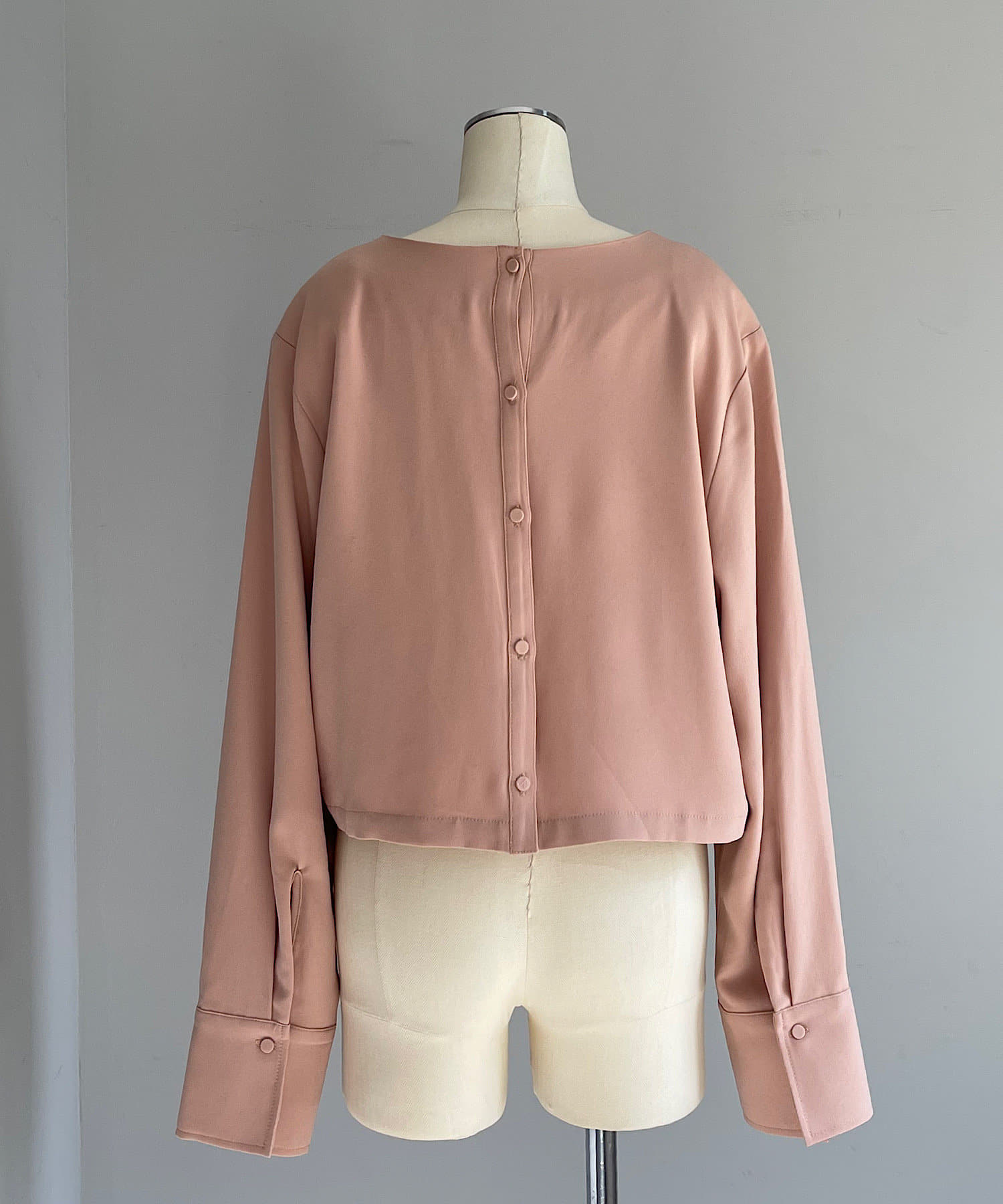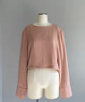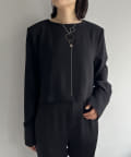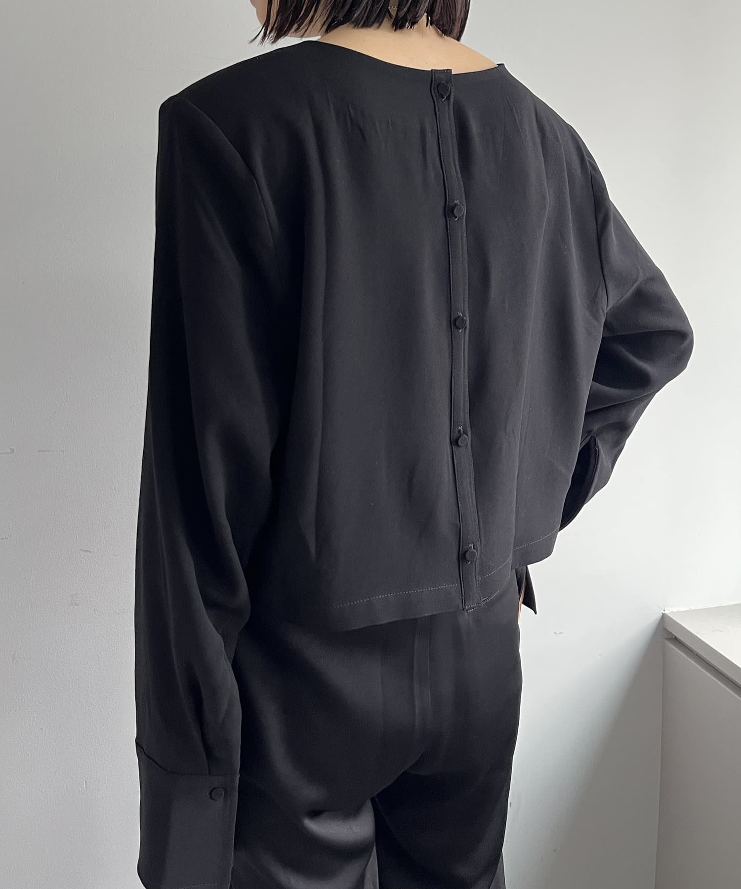 アセテート・ポリエステルのバックサテン生地で仕立てた肩パッド入りのトップス。サラリとした肌離れの良さとシワになりにくい取り扱いのしやすさが嬉しい1着です。