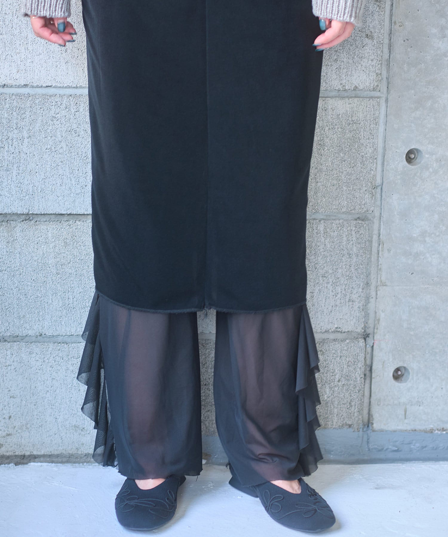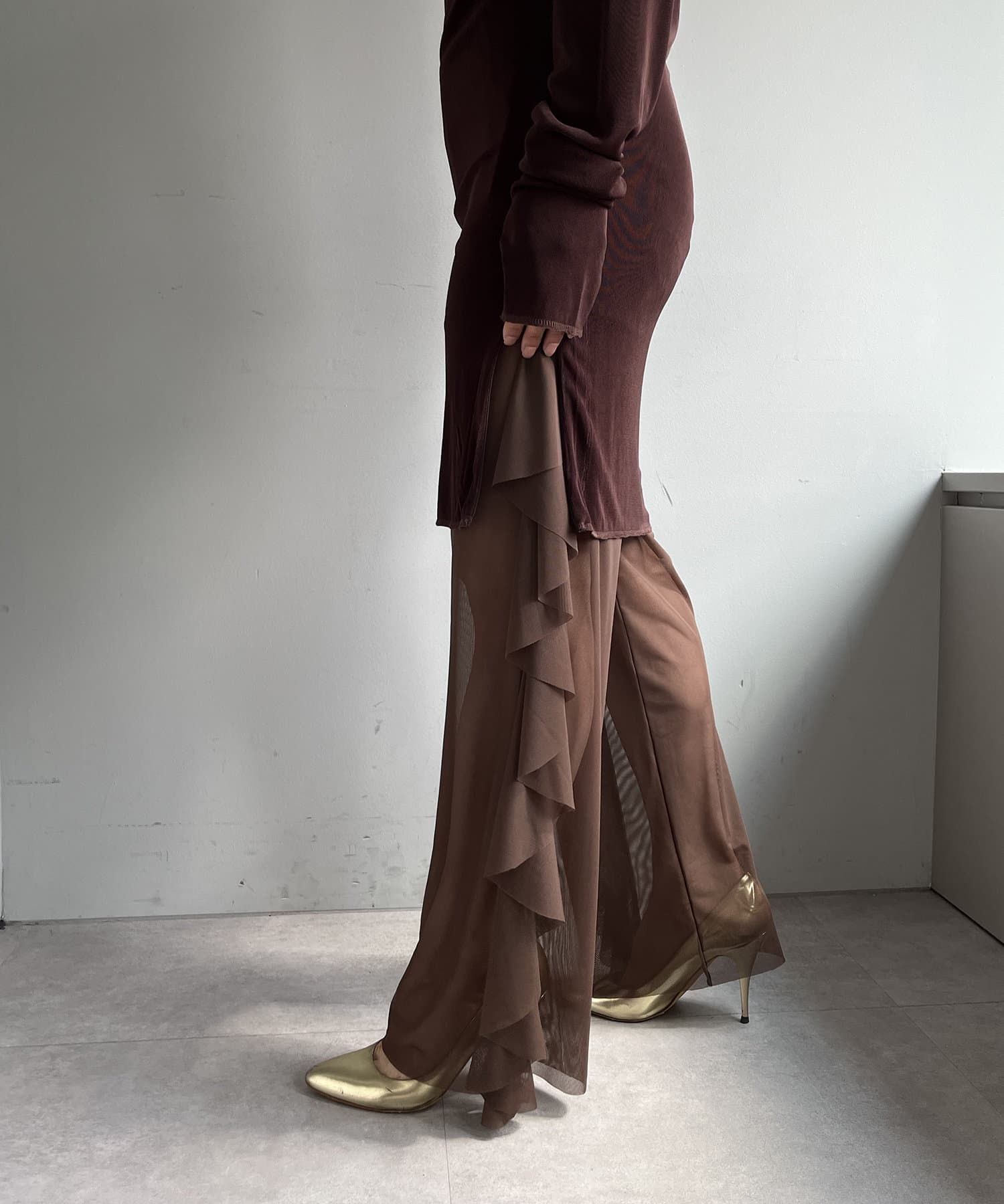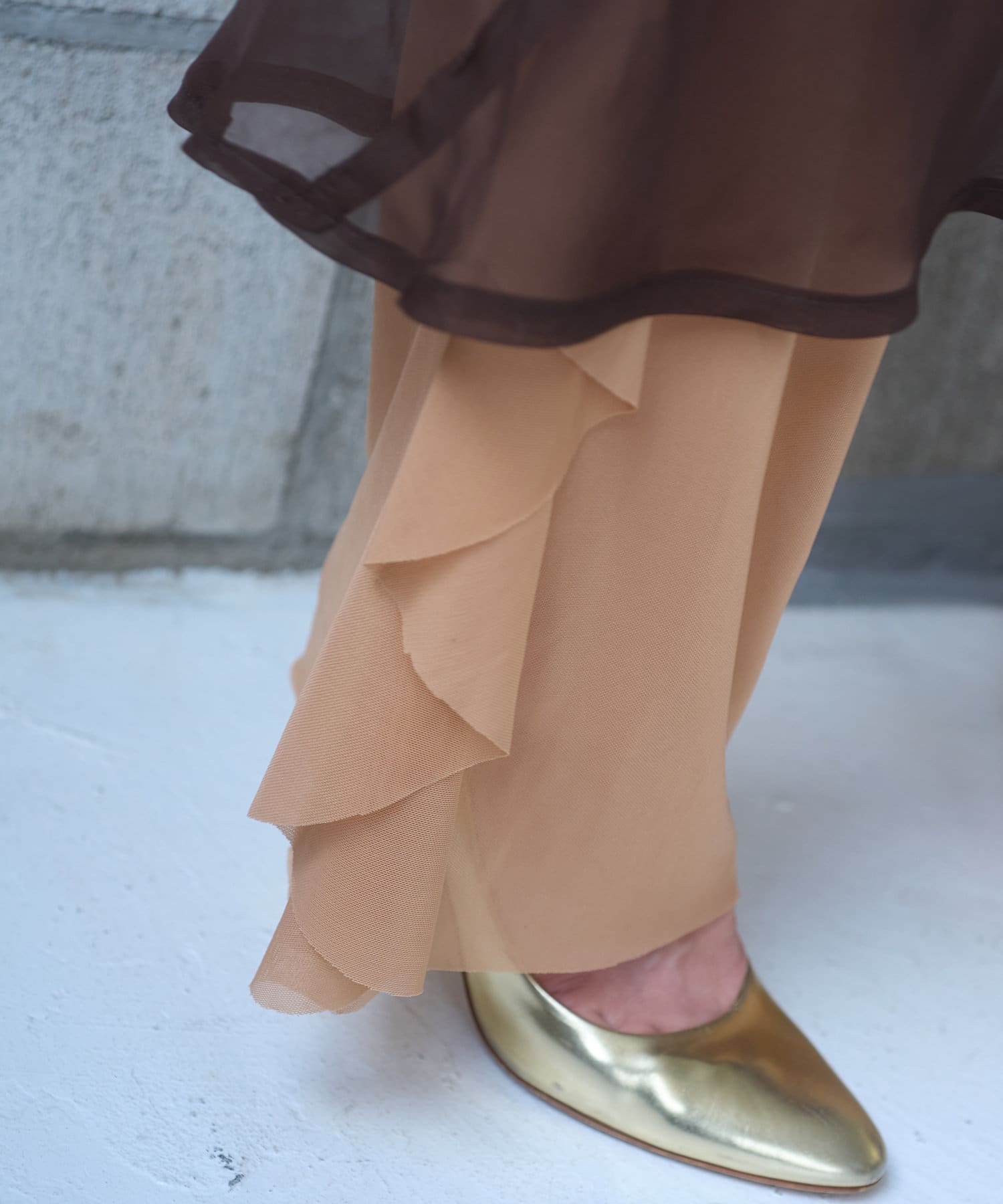 両サイドにラッフルを施しているのが1番のデザインポイント。履くと縦に付いたラッフルが裾に流れて、歩くたびにゆらゆらと動くのが美しく、気分が上がります。