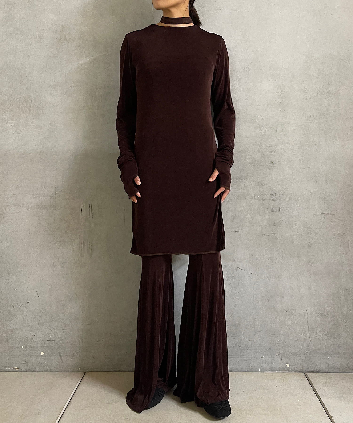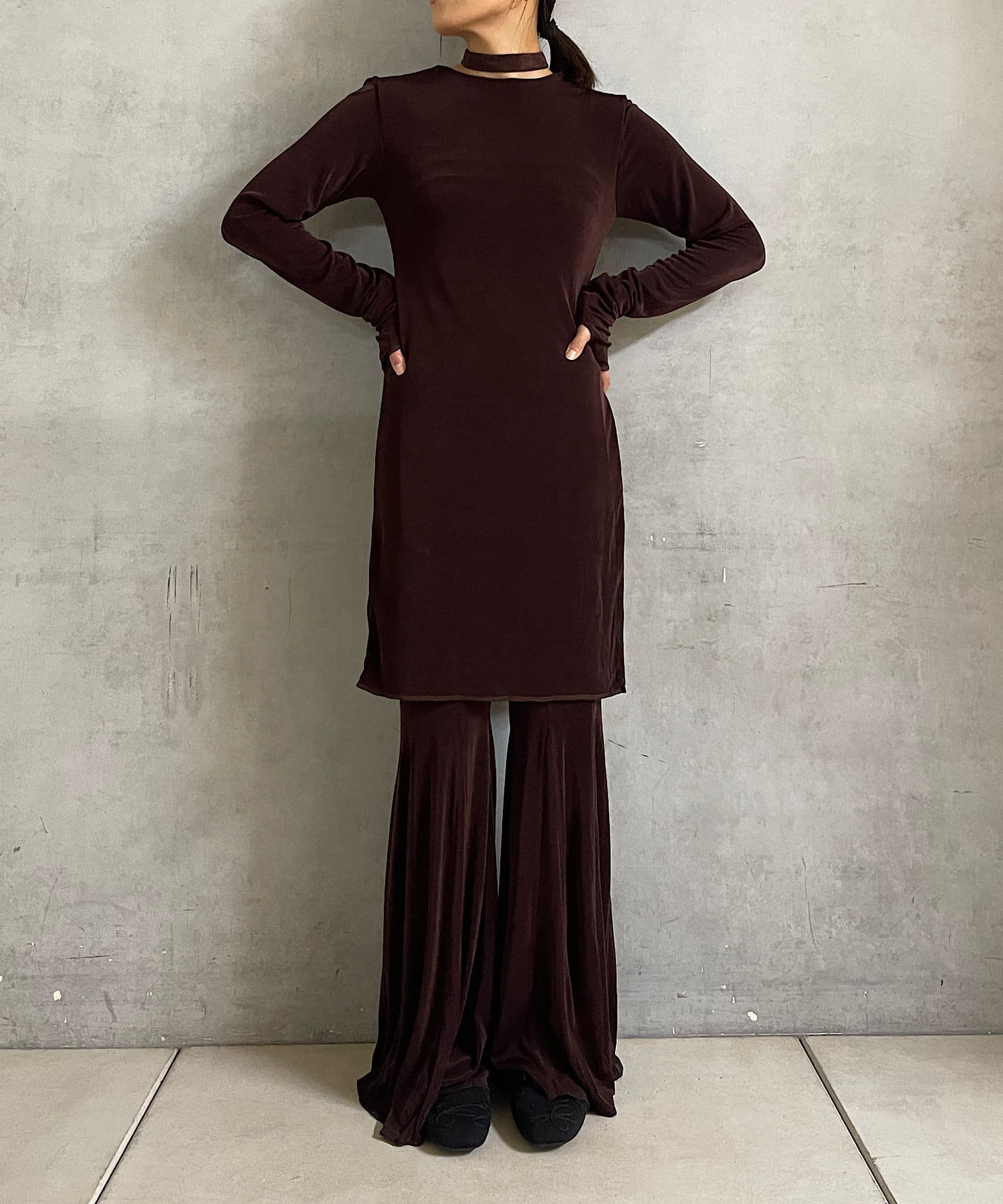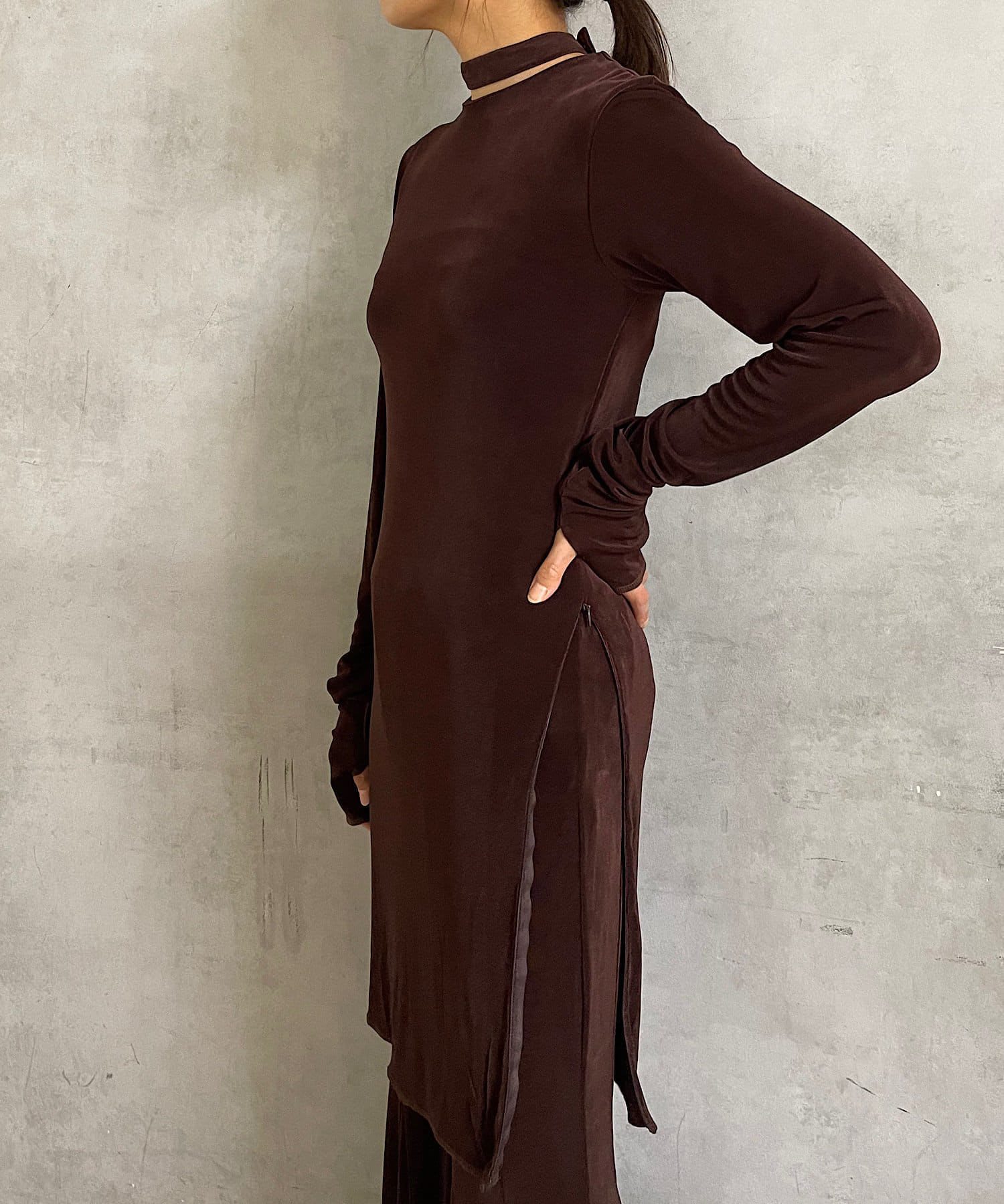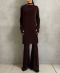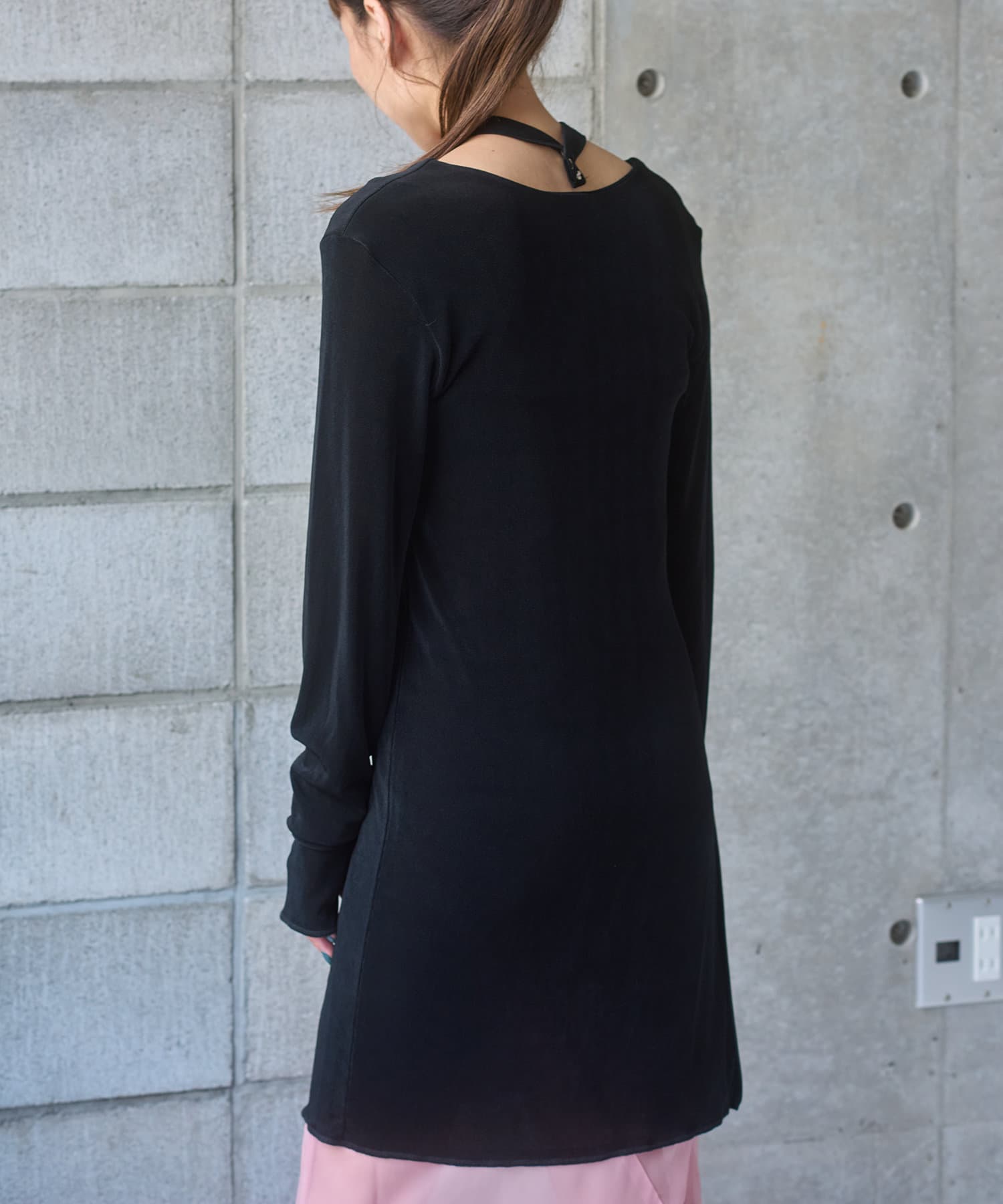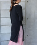 丈は腰回りが隠れるよう長めに設定しています。脇にスリットが調整可能なファスナーを付けているので、窮屈感なく着用いただけて安心です。共生地で展開しているSheer rib flare leggngsとセットアップ着用もおすすめです。また、前後での着用も可能。クルーネックで着用した際は背中側をスッキリと開けて着られるのも嬉しいポイントです。