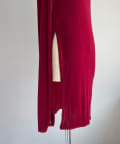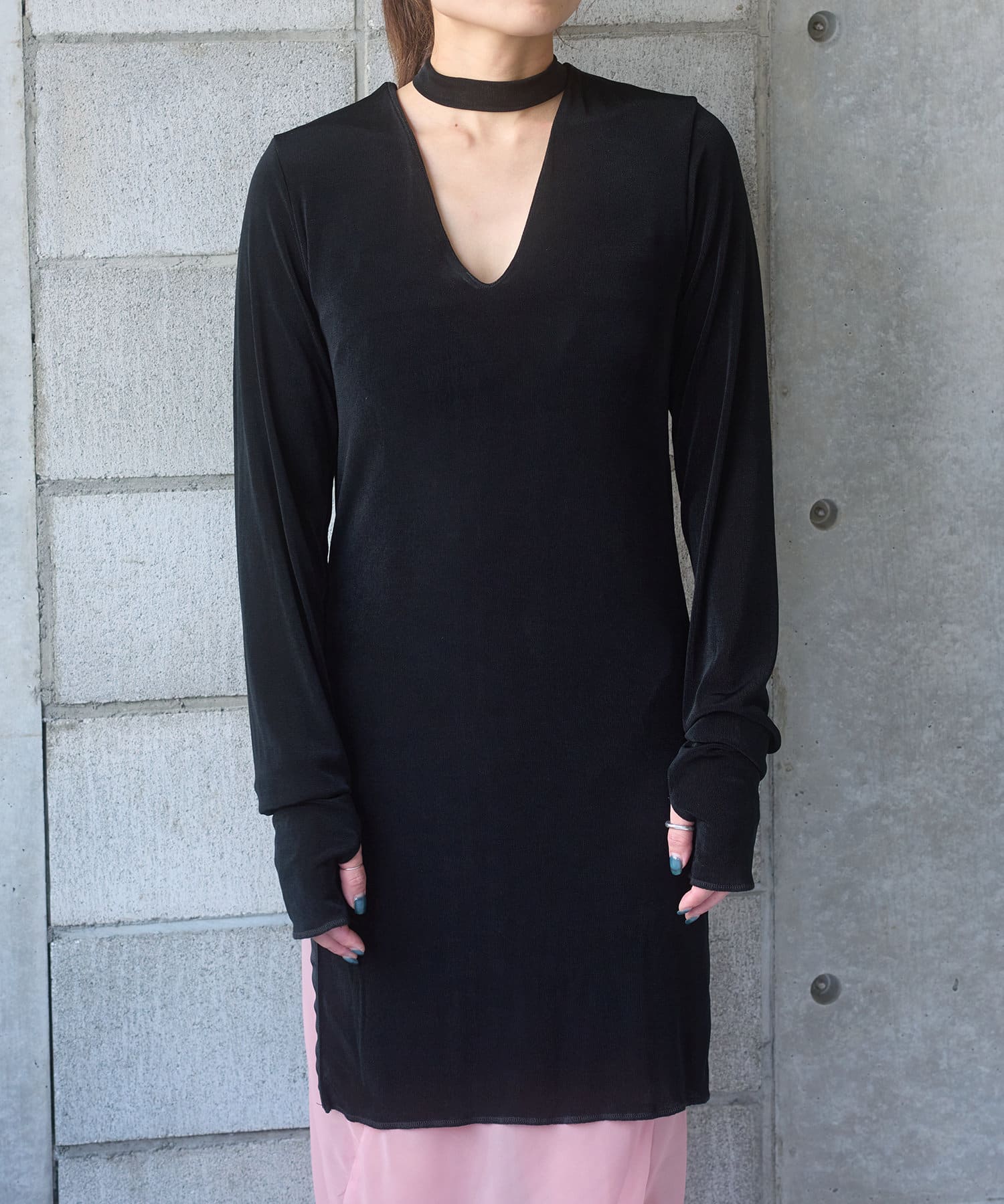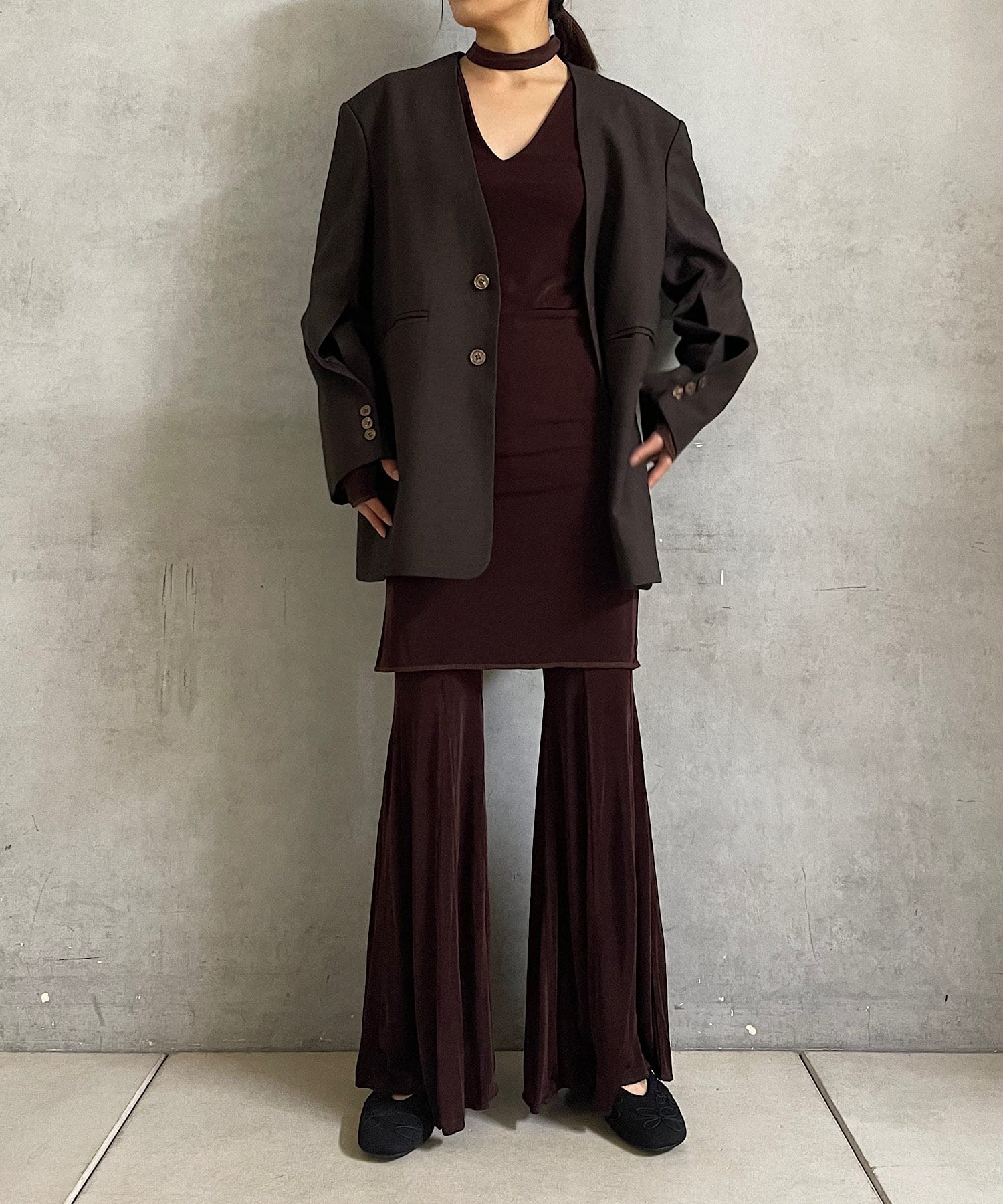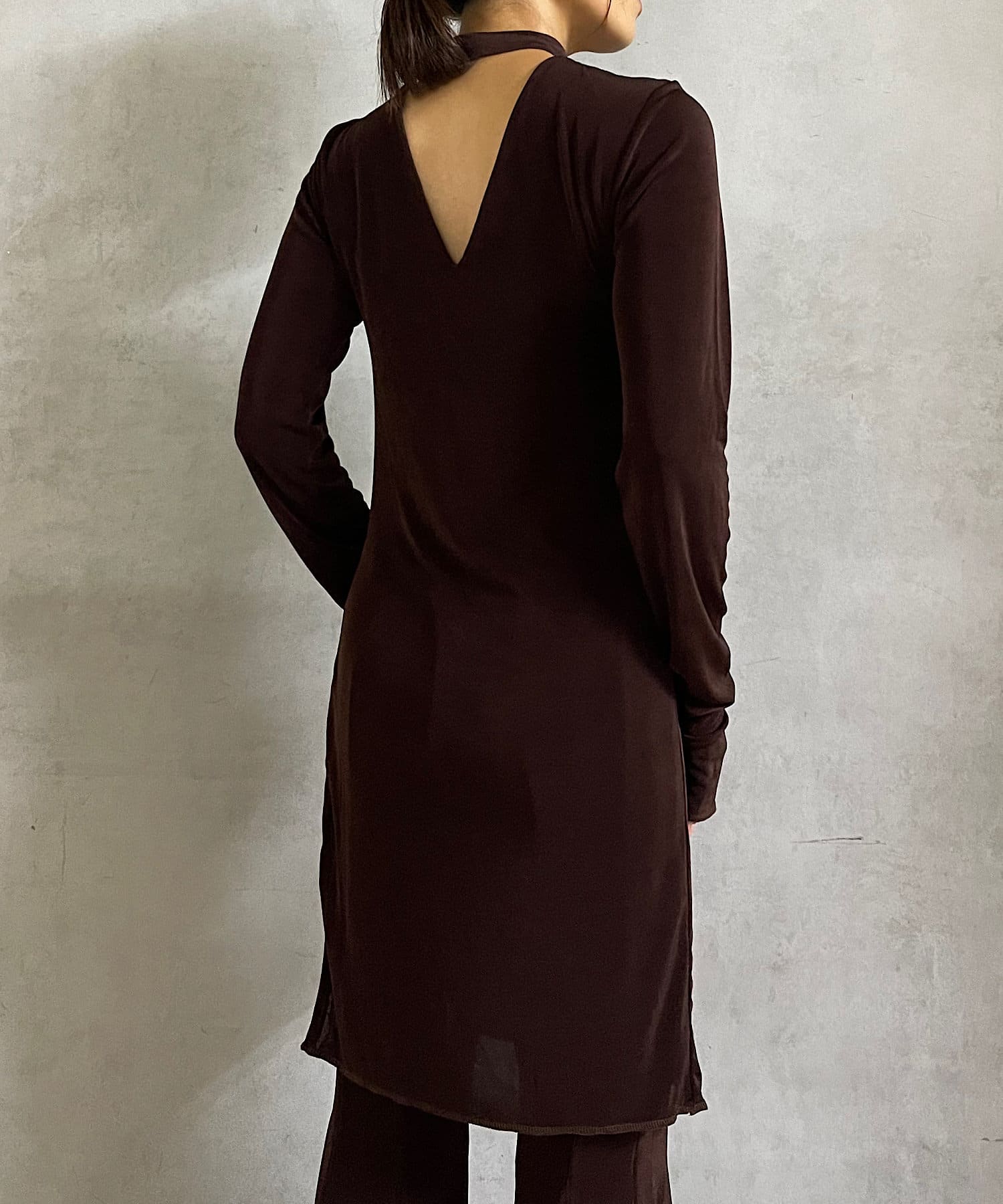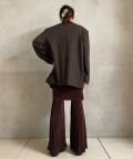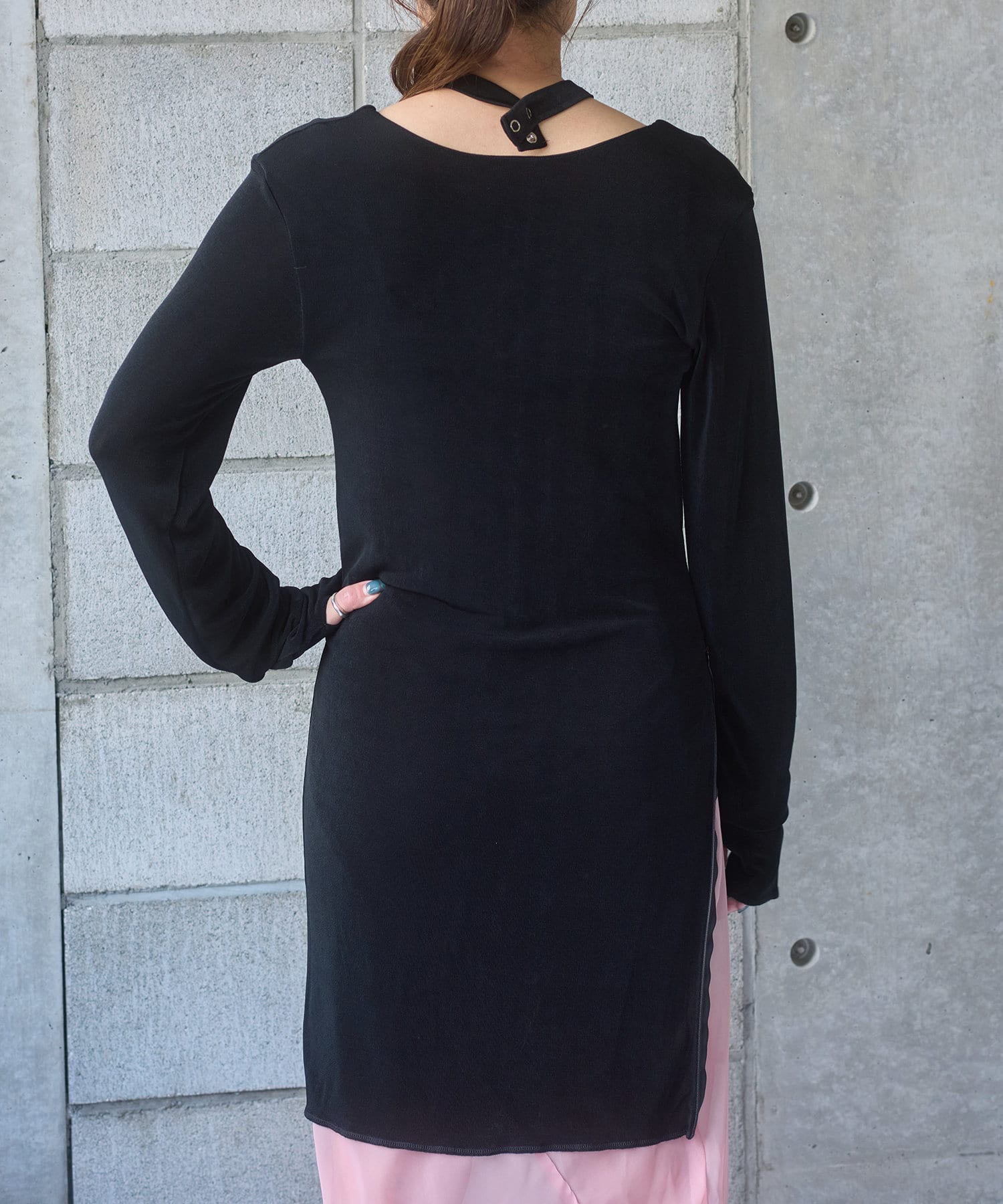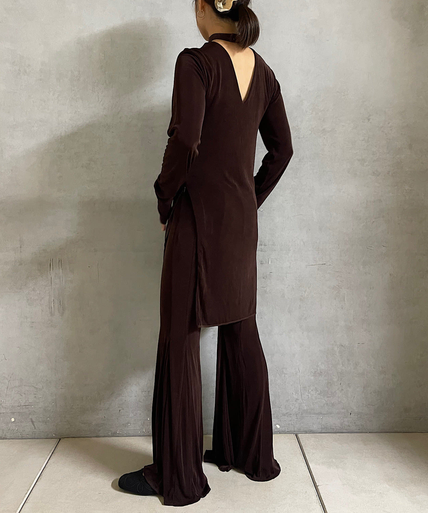 丈は腰回りが隠れるよう長めに設定しています。脇にスリットが調整可能なファスナーを付けているので、窮屈感なく着用いただけて安心です。共生地で展開しているSheer rib flare leggngsとセットアップ着用もおすすめです。また、前後での着用も可能。クルーネックで着用した際は背中側をスッキリと開けて着られるのも嬉しいポイントです。