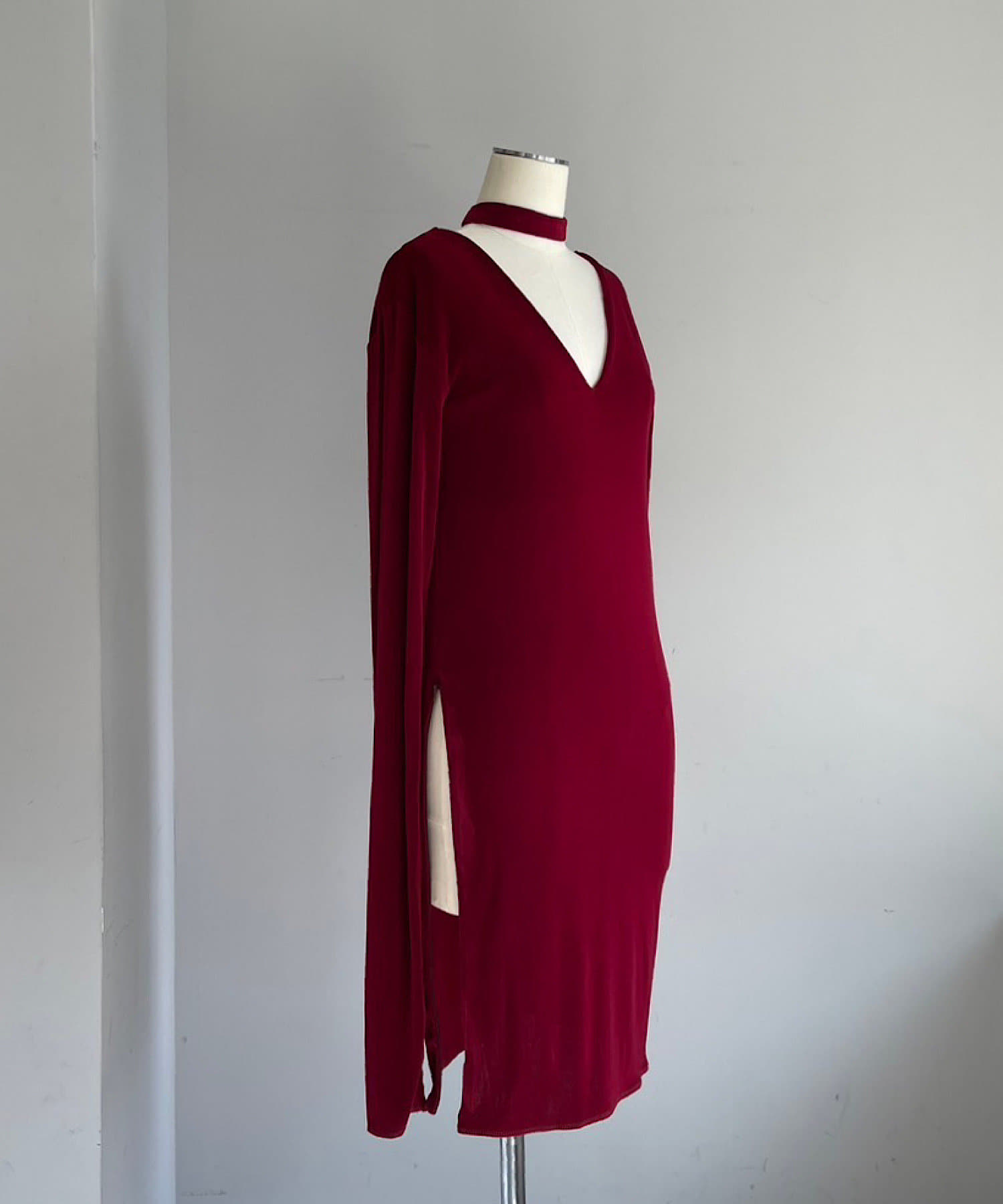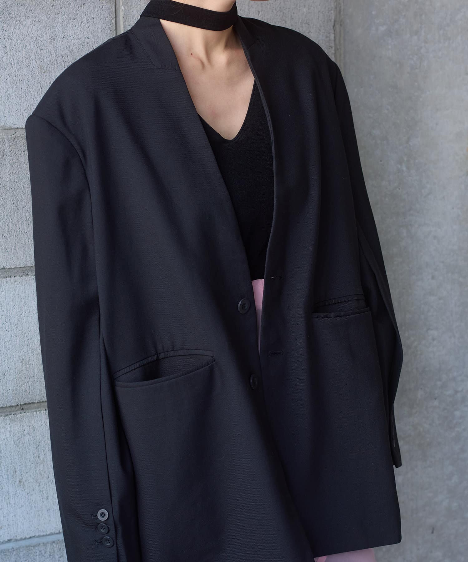特徴は鎖骨周りを美しく見せられる深さのあるVあきのネックライン。ジャケットのフロントボタンを閉めた際に、ギリギリインナーが見えないよう、しっかりと深めに開きを作っています。