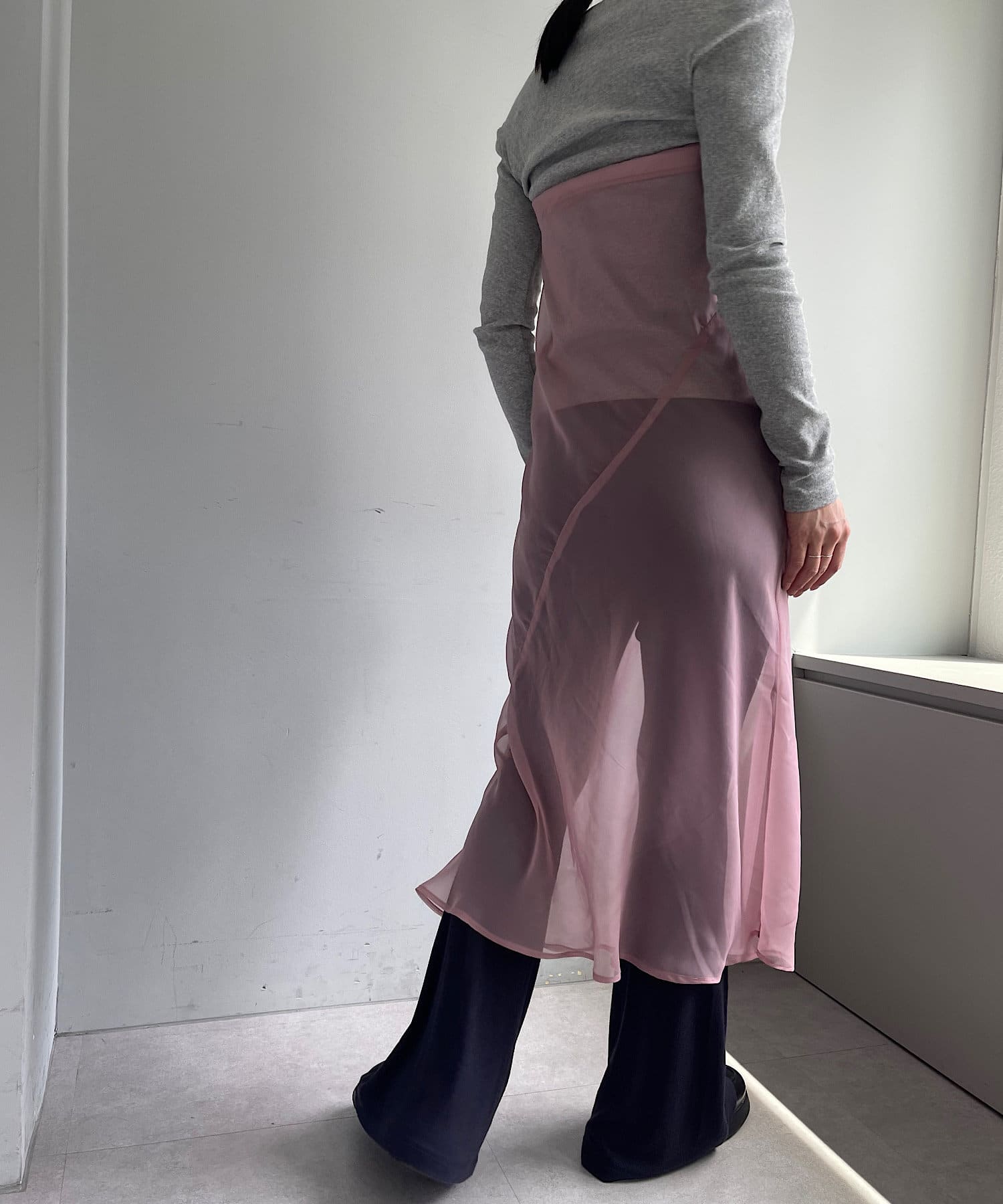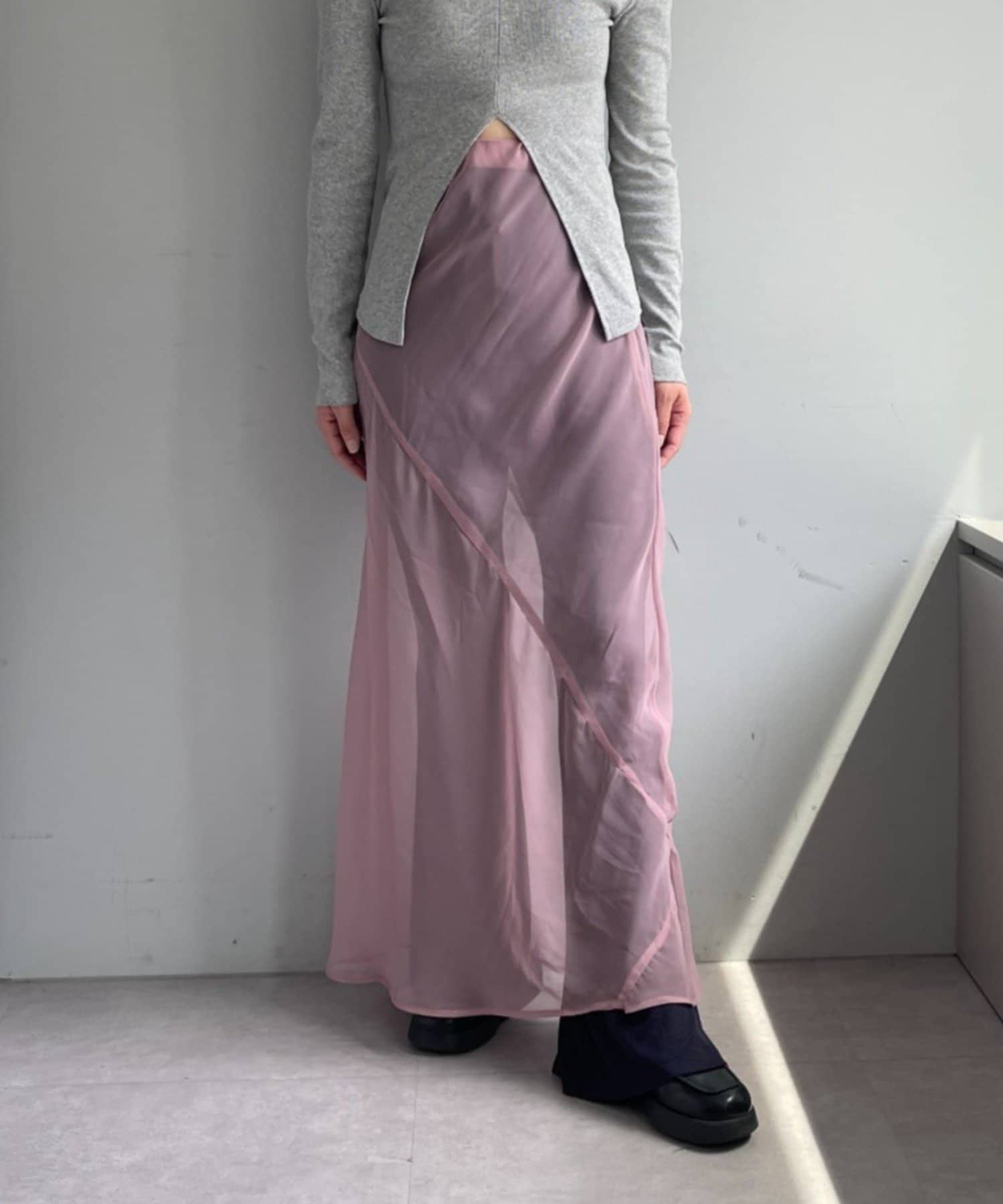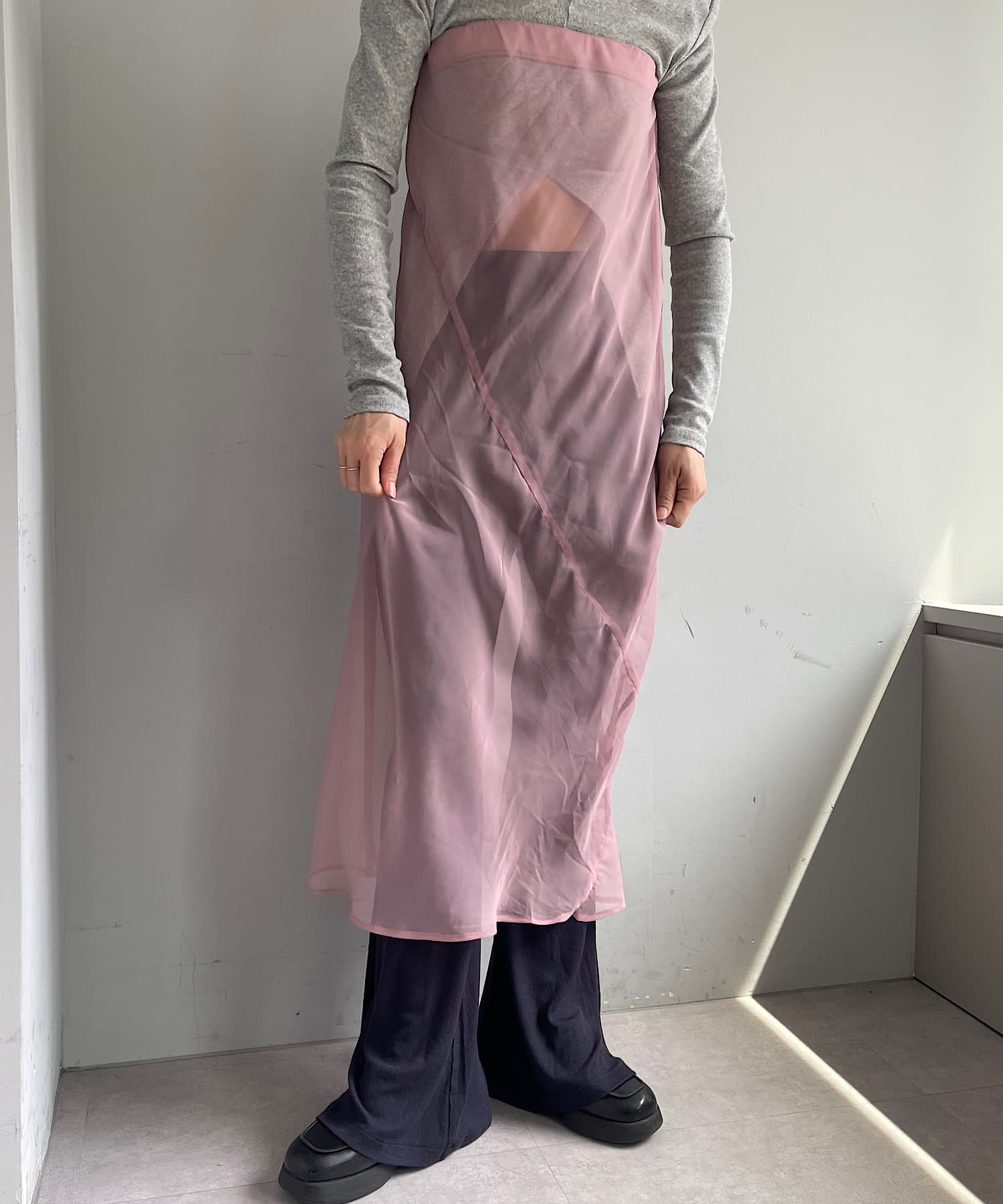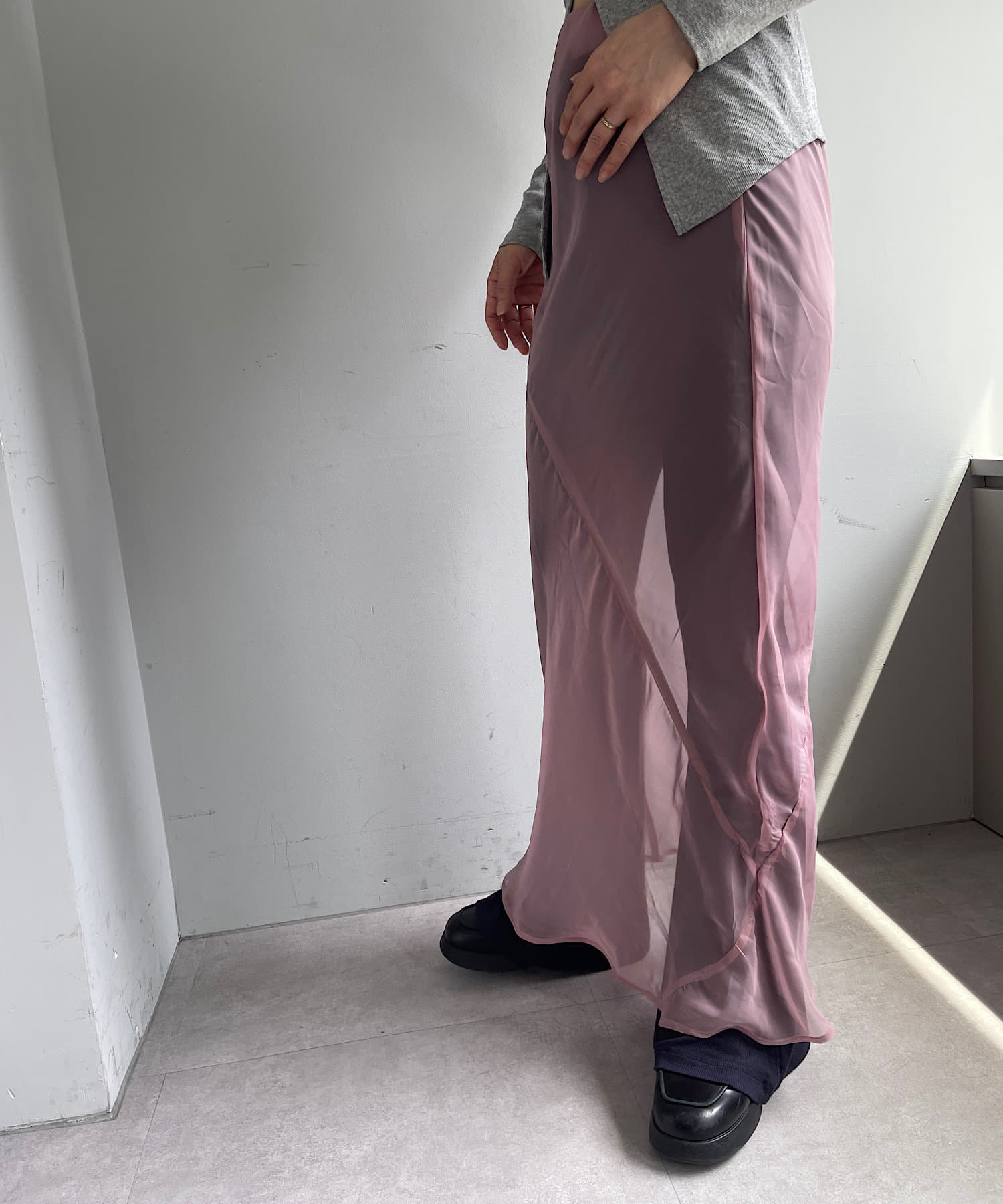 レギンスやタイツなどのレッグウェアーと重ねて、透け感を楽しむために作られたレイヤリング用のシアーロングスカート。