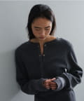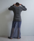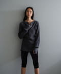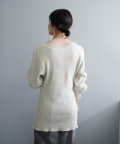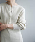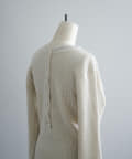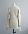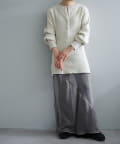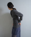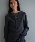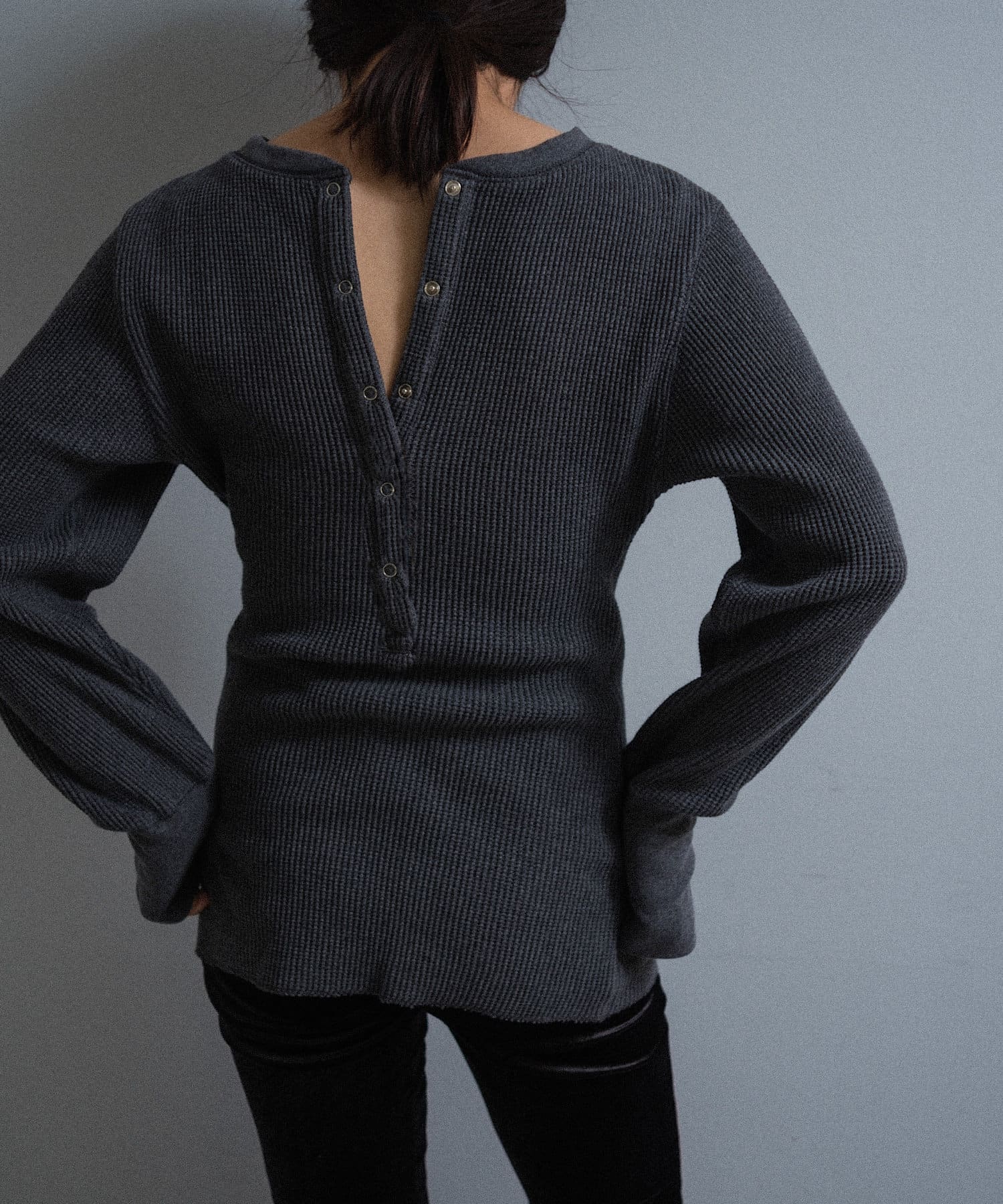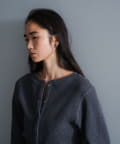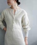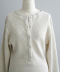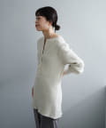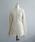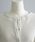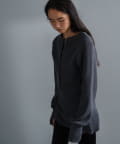 また、ネックデザインが前後で異なり、両面気分を変えて着用が楽しめます。フロントは汗止めも排除したシンプルなクルーネックに。背面はしっかりとヘンリー開きをつけており、シルバーのリングドットボタンでスリットの深さを調整いただくことが可能です。