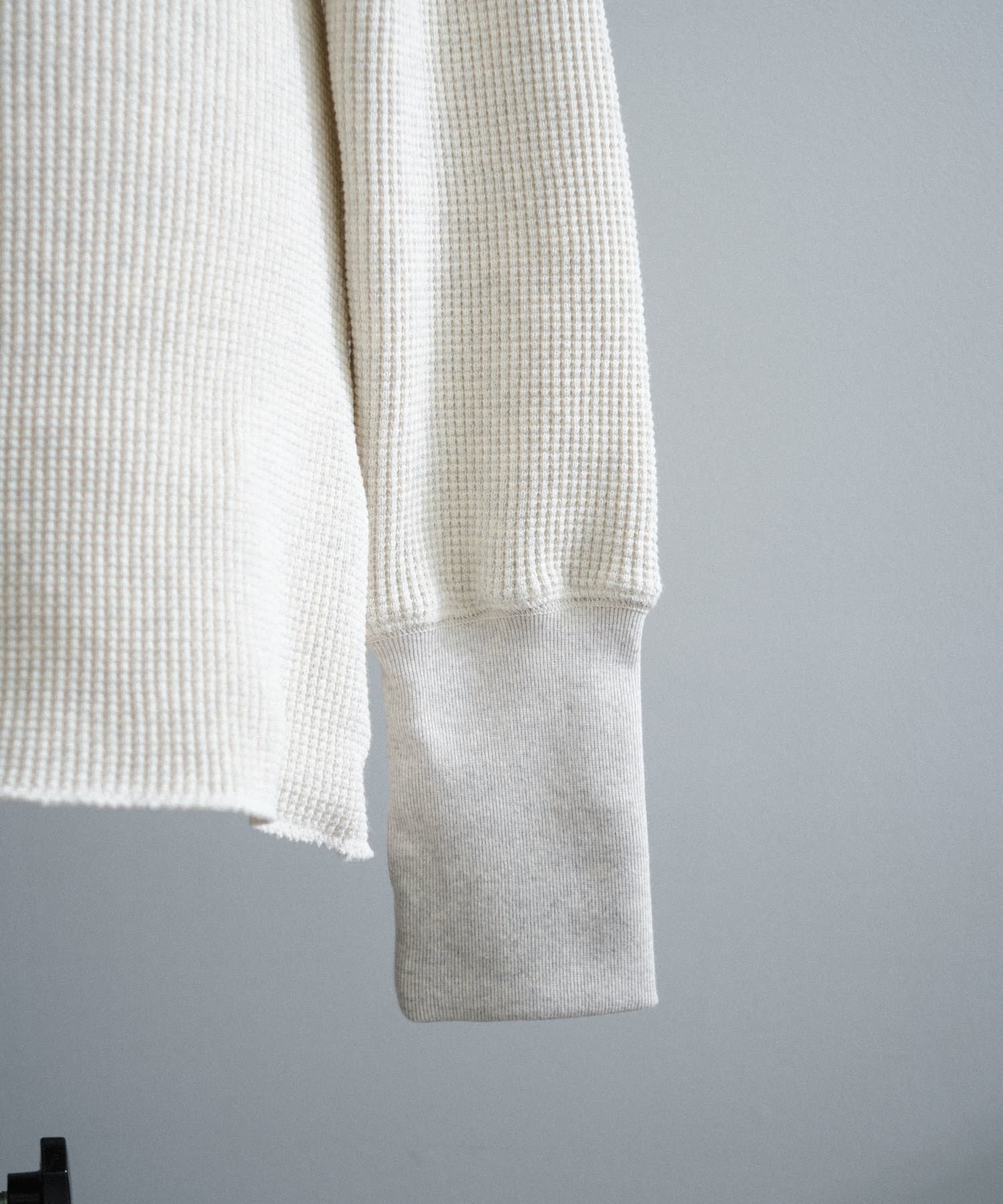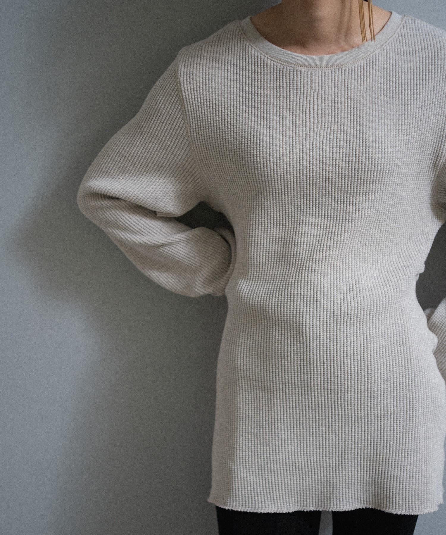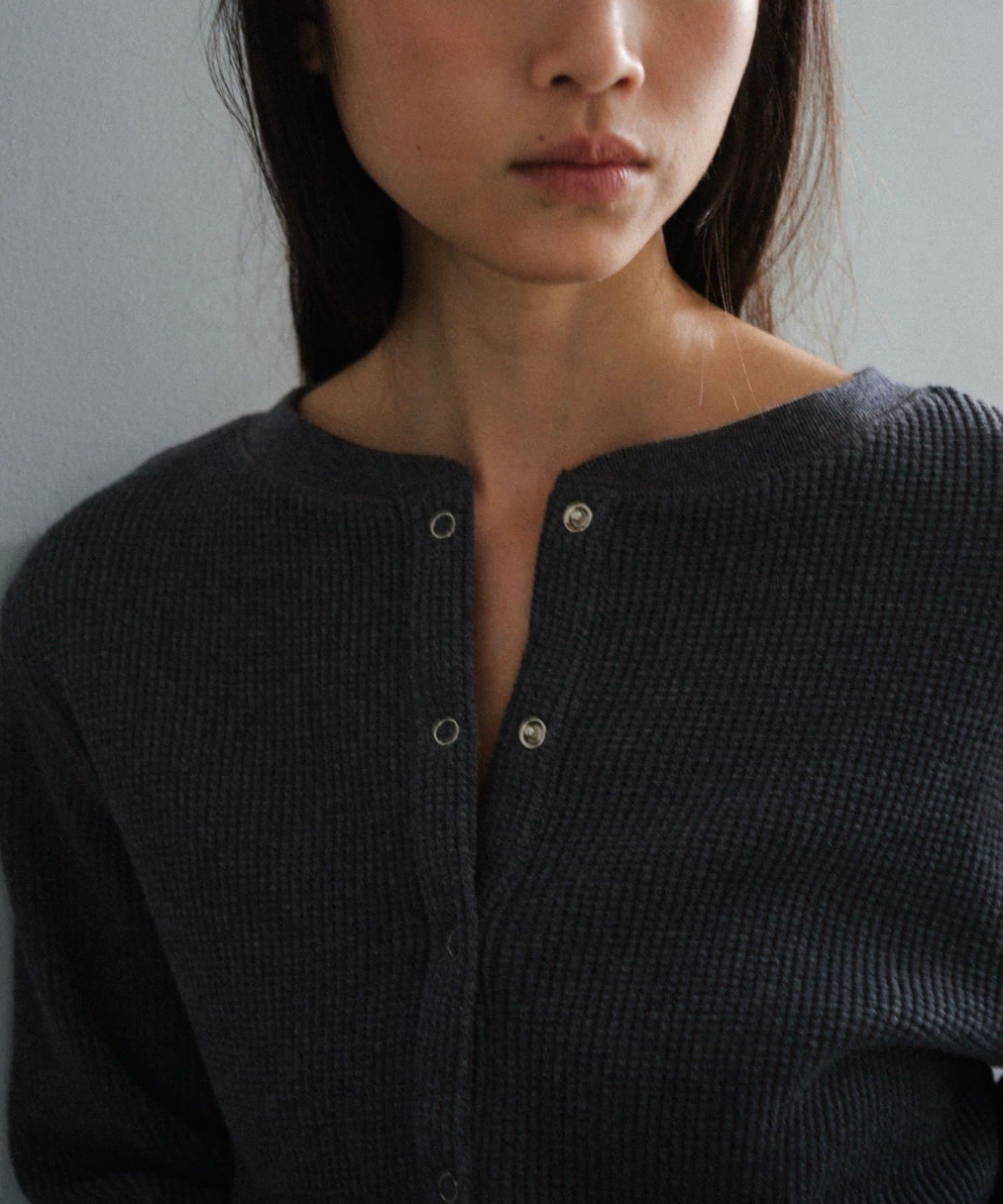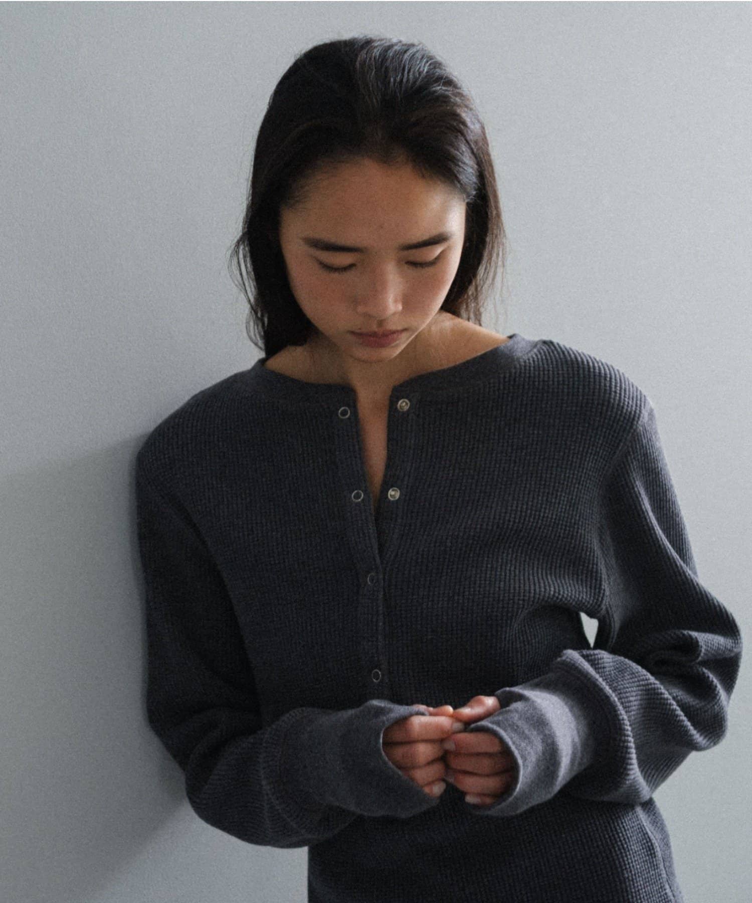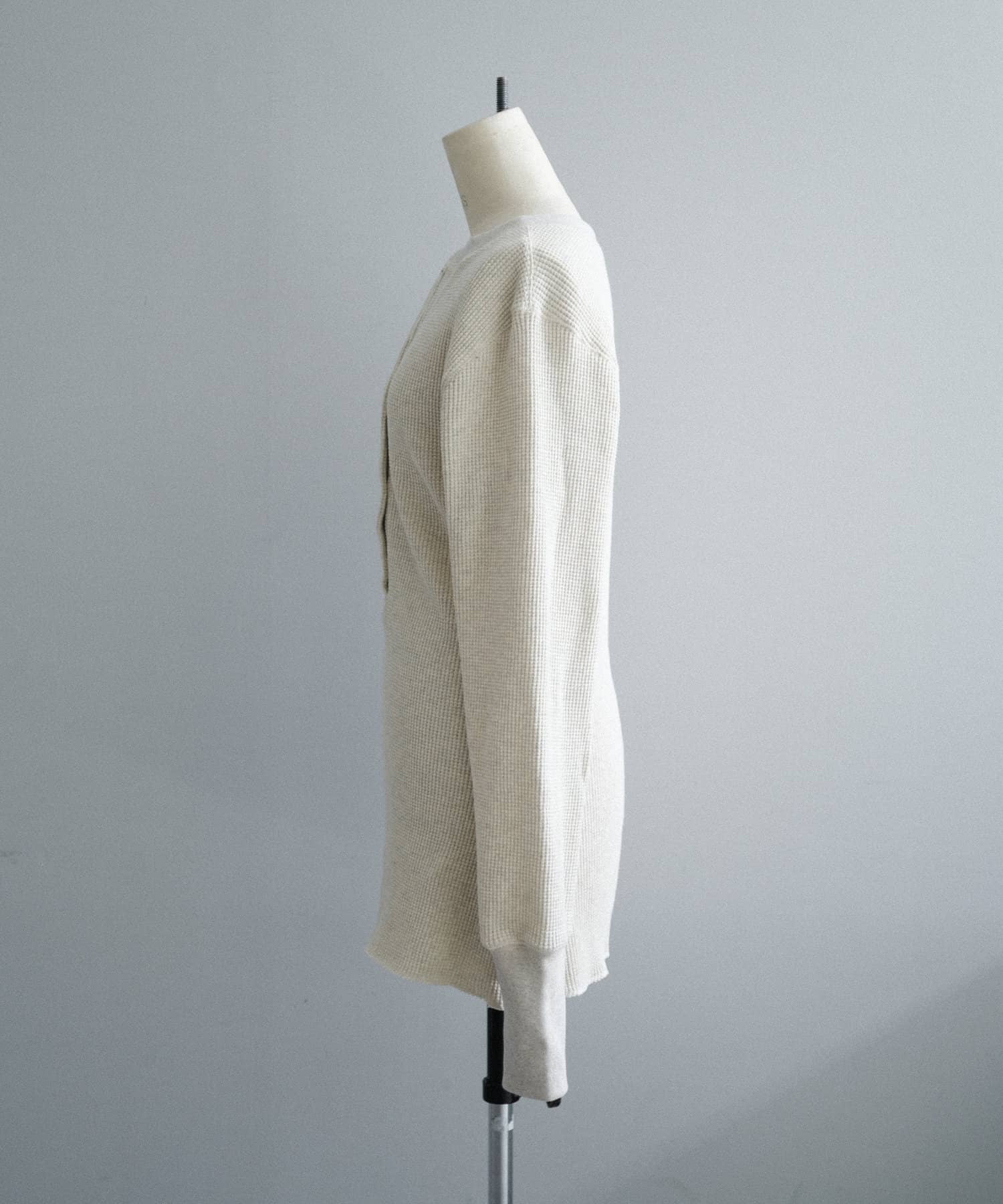 今シーズンはずっと欲しかった、“理想のサーマル”を作りました。特筆すべきポイントは、毎日着てもくたびれないタフで気持ちの良い生地感と、スタイルが綺麗に見えるシルエット。空気の力で撚られたオープンエンド糸を使用した国内生産の綿100%のワッフル生地を採用しており、その独特の膨らみ感ともちもちとした心地よい生地の伸び感が、非常に気持ちが良くずっと着ていたくなる一着です。空紡糸ならではのシャリっとした粗野な表面感も特徴的。