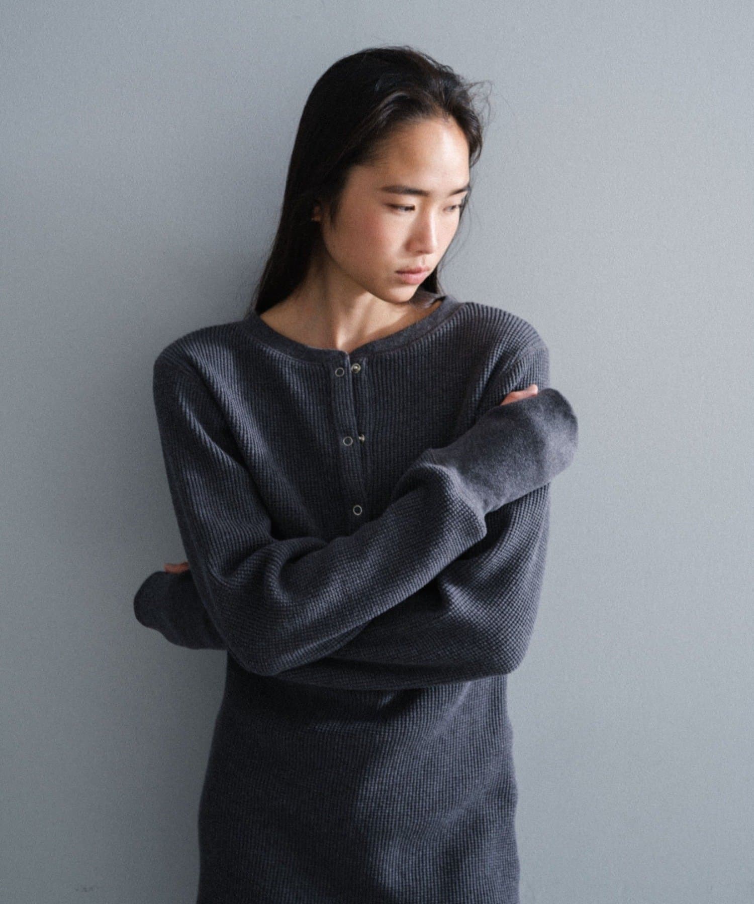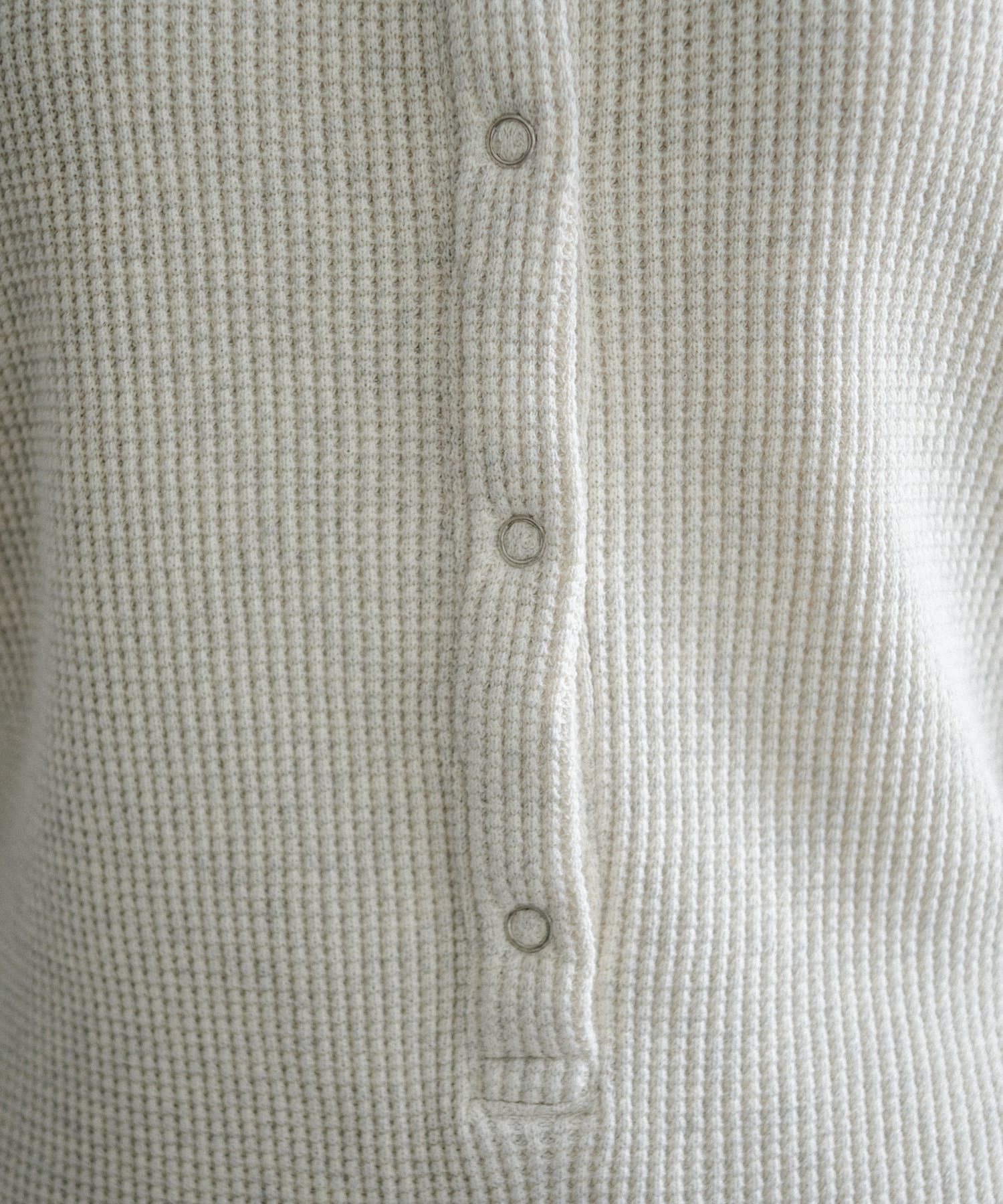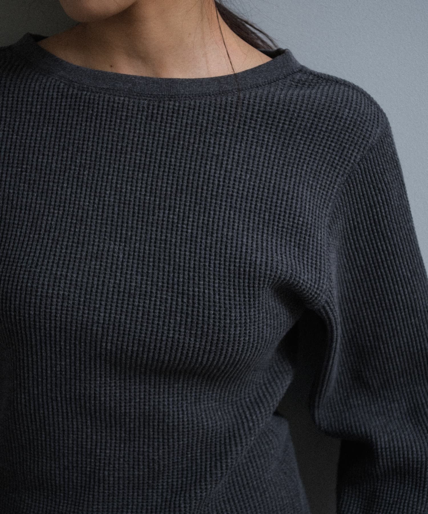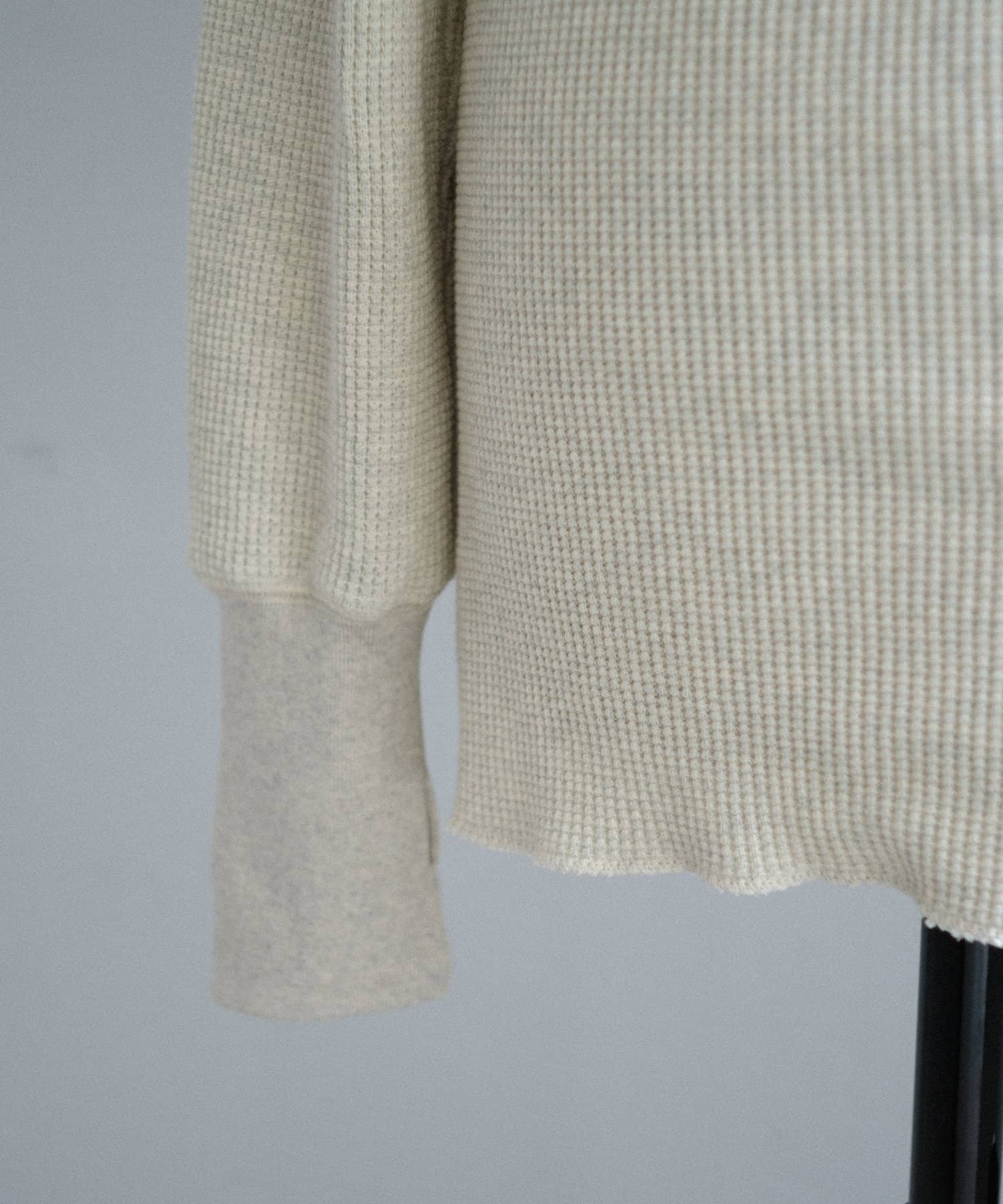 今シーズンはずっと欲しかった、“理想のサーマル”を作りました。特筆すべきポイントは、毎日着てもくたびれないタフで気持ちの良い生地感と、スタイルが綺麗に見えるシルエット。空気の力で撚られたオープンエンド糸を使用した国内生産の綿100%のワッフル生地を採用しており、その独特の膨らみ感ともちもちとした心地よい生地の伸び感が、非常に気持ちが良くずっと着ていたくなる一着です。空紡糸ならではのシャリっとした粗野な表面感も特徴的。