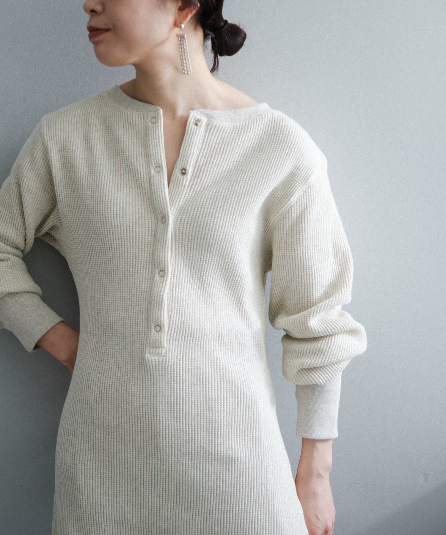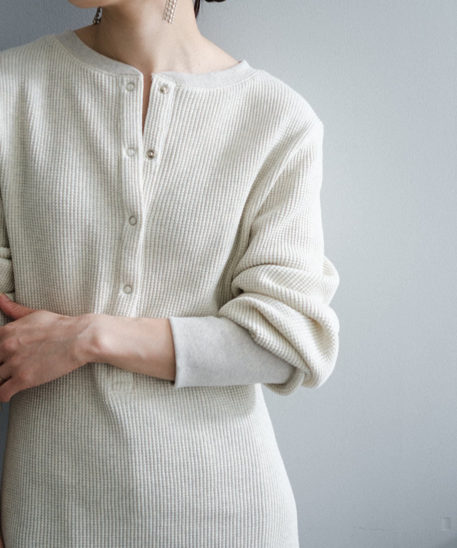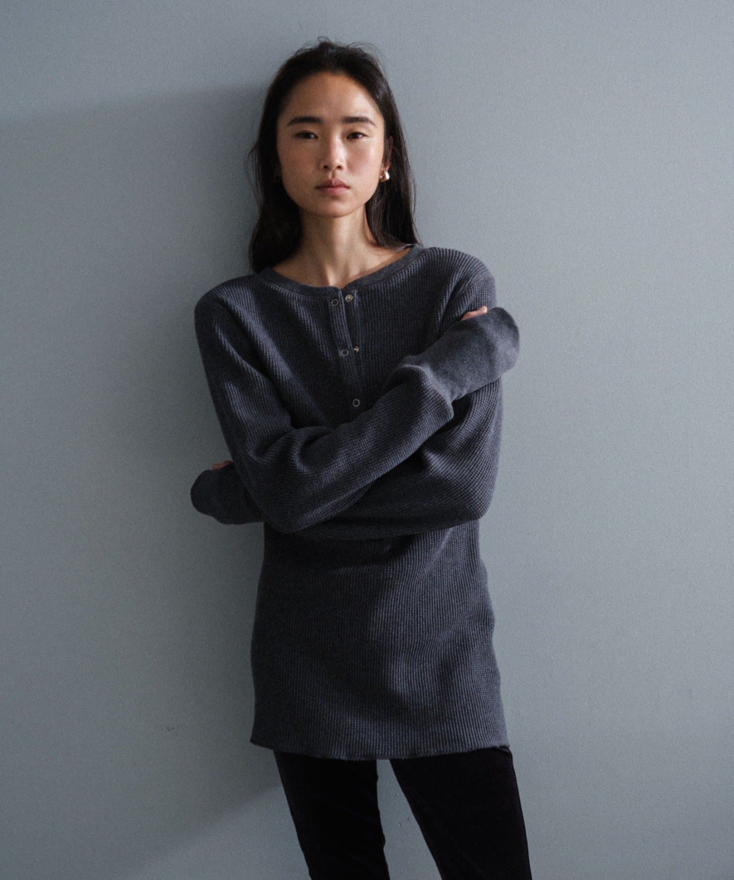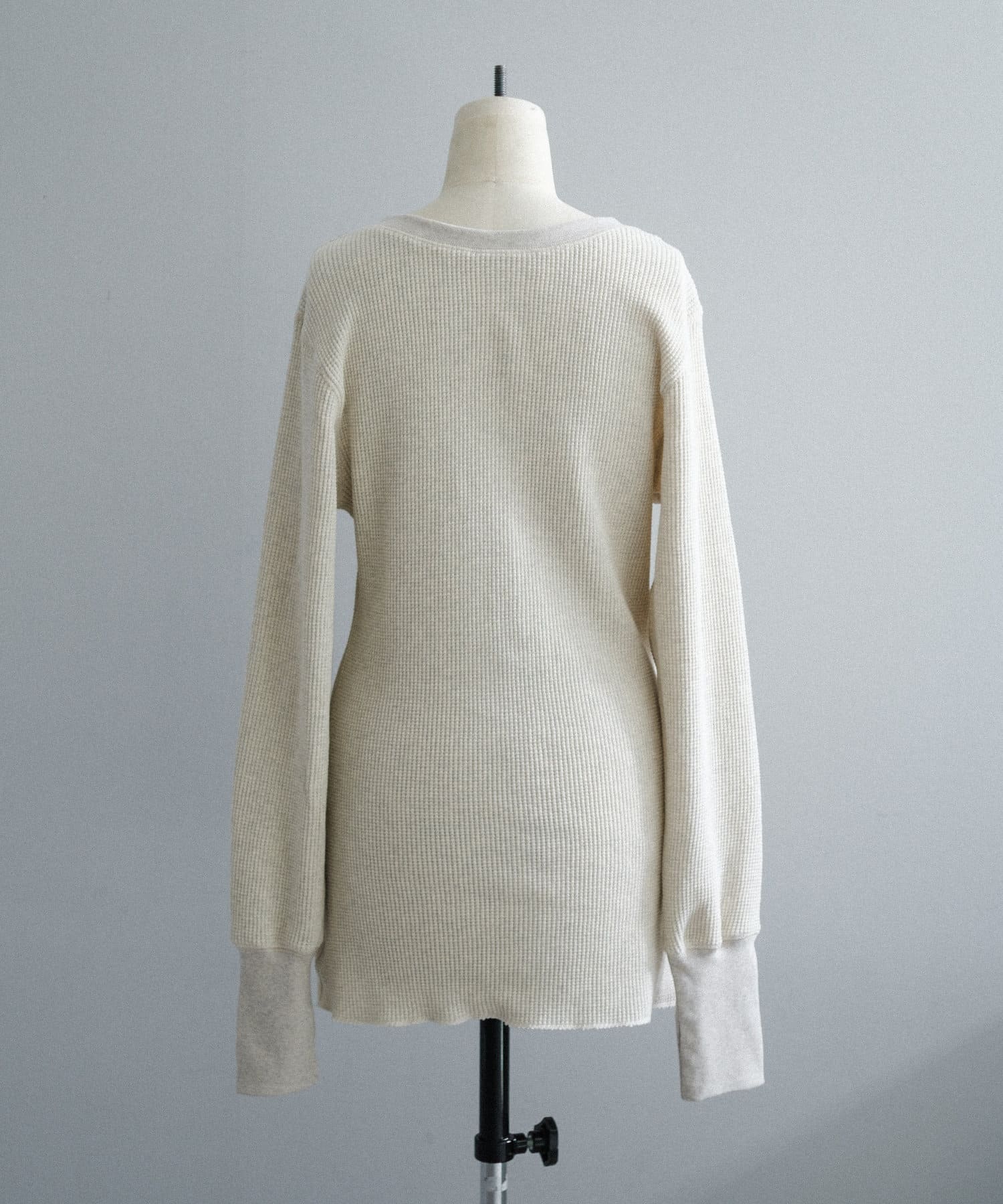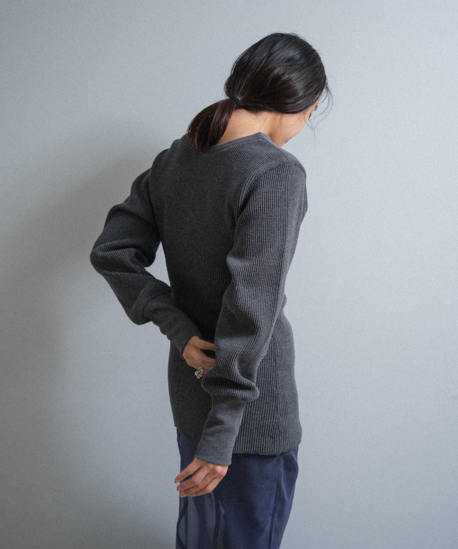 今シーズンはずっと欲しかった、“理想のサーマル”を作りました。特筆すべきポイントは、毎日着てもくたびれないタフで気持ちの良い生地感と、スタイルが綺麗に見えるシルエット。空気の力で撚られたオープンエンド糸を使用した国内生産の綿100%のワッフル生地を採用しており、その独特の膨らみ感ともちもちとした心地よい生地の伸び感が、非常に気持ちが良くずっと着ていたくなる一着です。空紡糸ならではのシャリっとした粗野な表面感も特徴的。