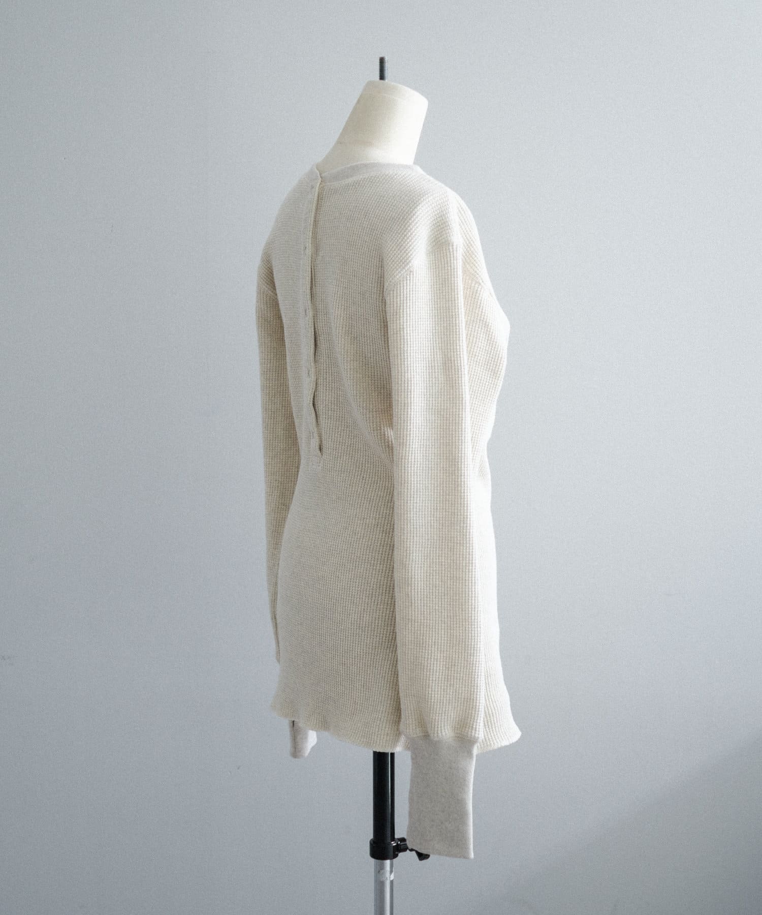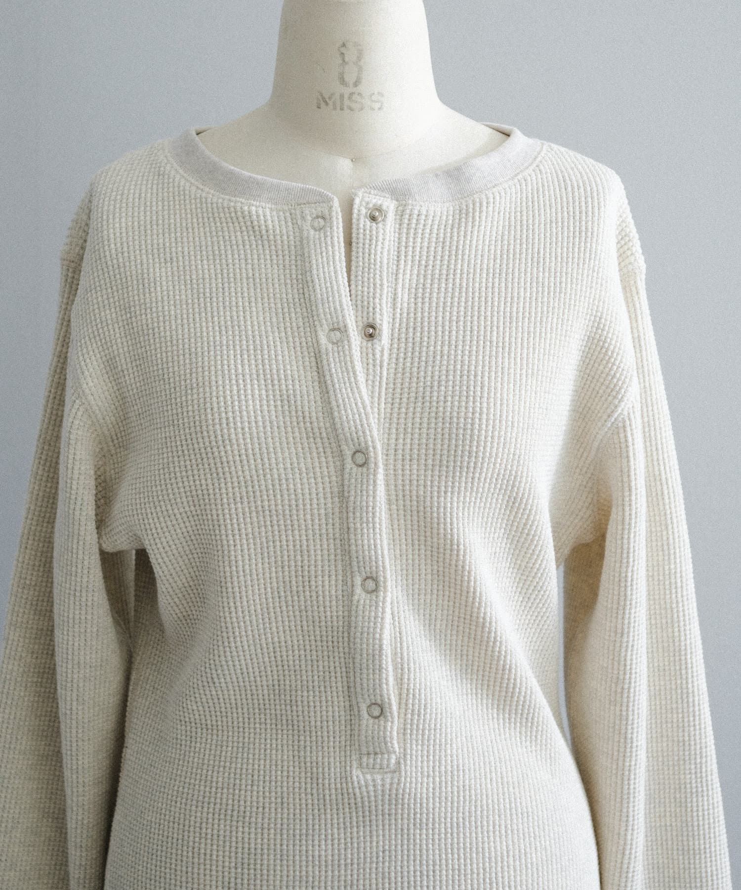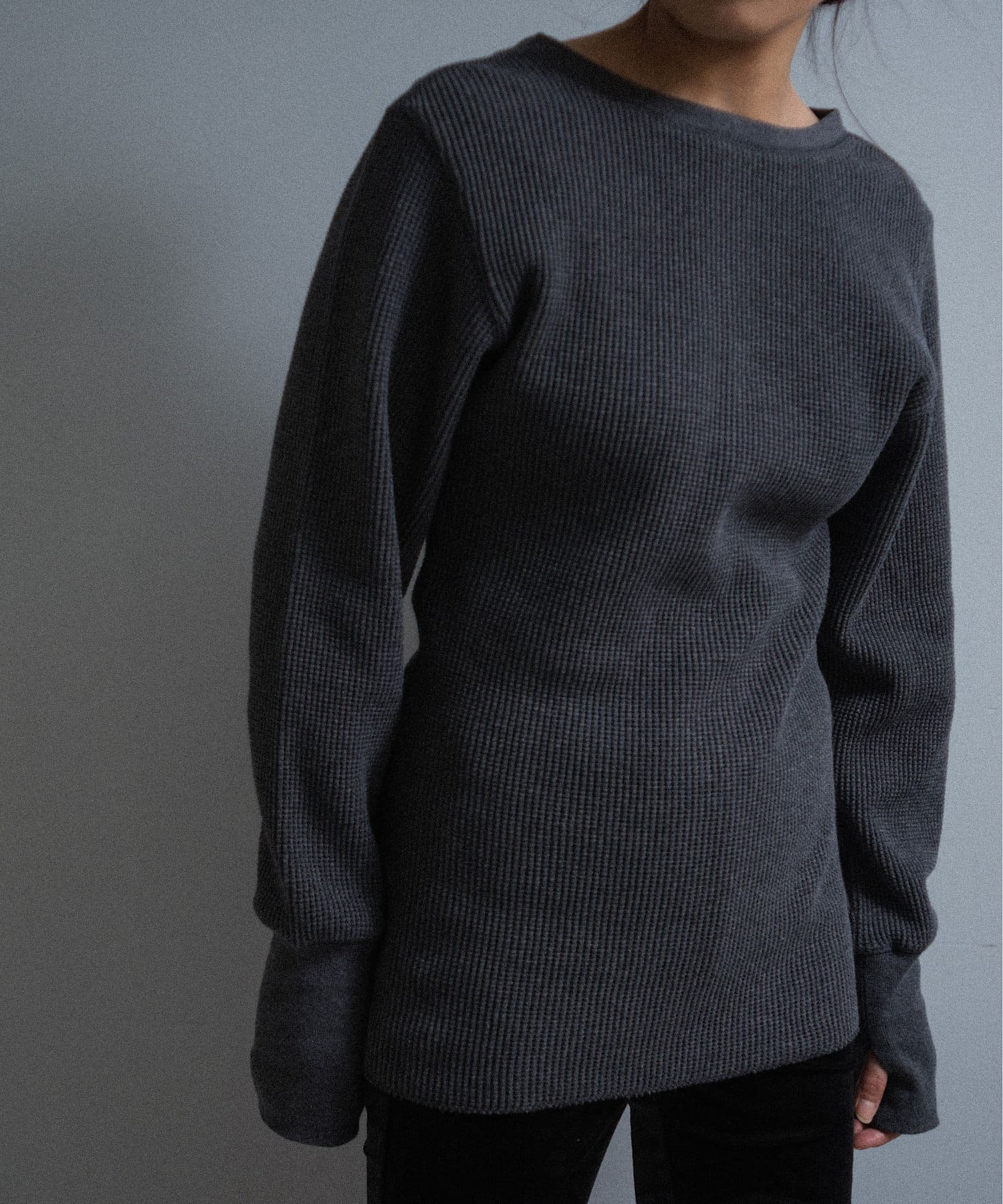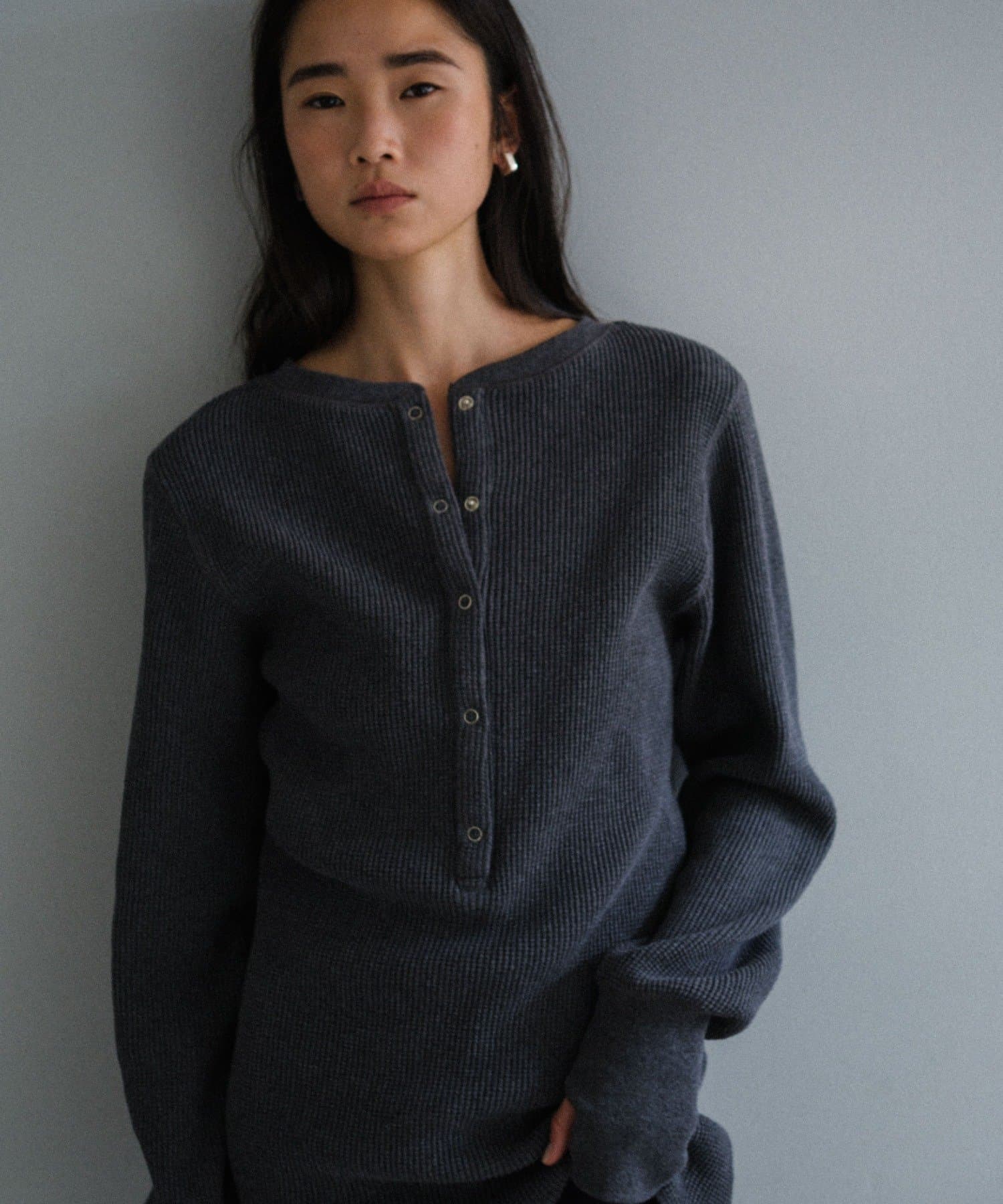 今シーズンはずっと欲しかった、“理想のサーマル”を作りました。特筆すべきポイントは、毎日着てもくたびれないタフで気持ちの良い生地感と、スタイルが綺麗に見えるシルエット。空気の力で撚られたオープンエンド糸を使用した国内生産の綿100%のワッフル生地を採用しており、その独特の膨らみ感ともちもちとした心地よい生地の伸び感が、非常に気持ちが良くずっと着ていたくなる一着です。空紡糸ならではのシャリっとした粗野な表面感も特徴的。