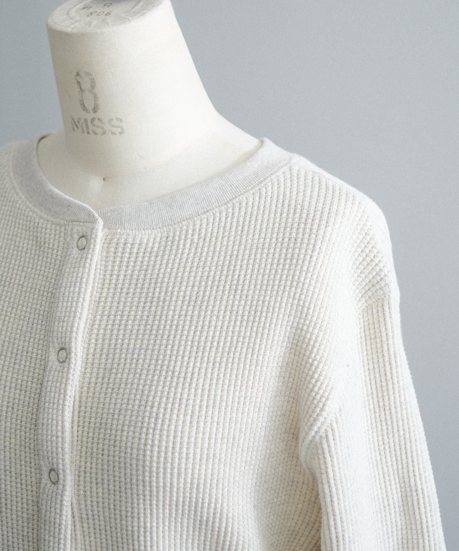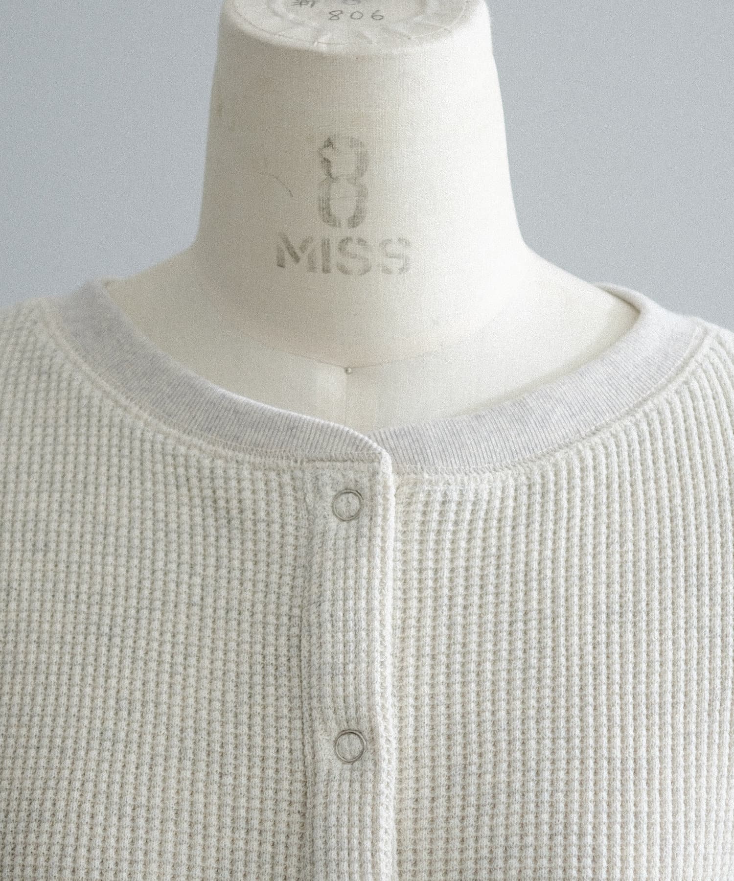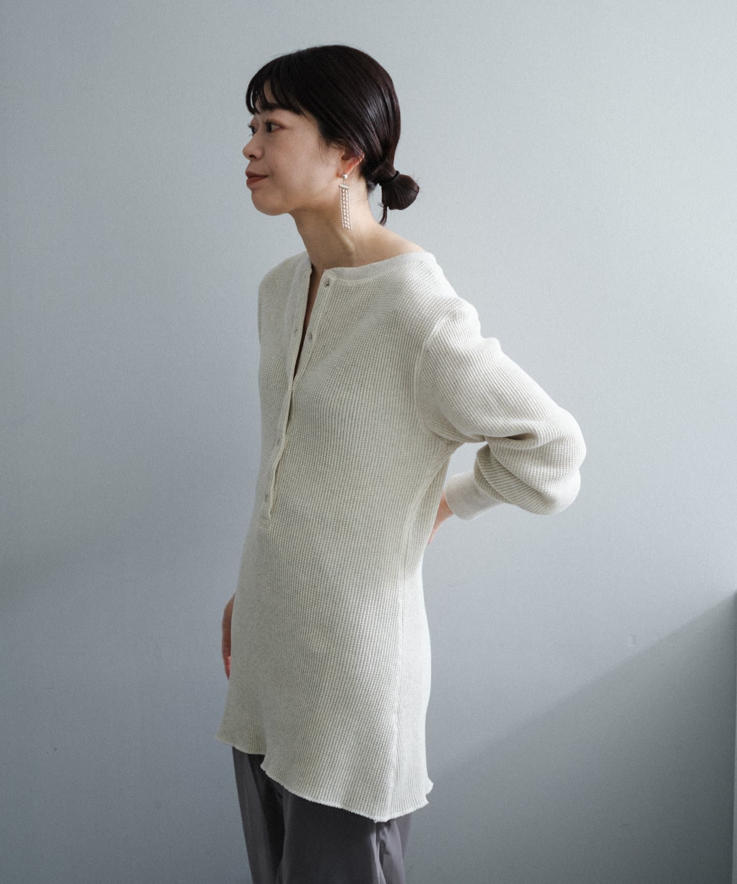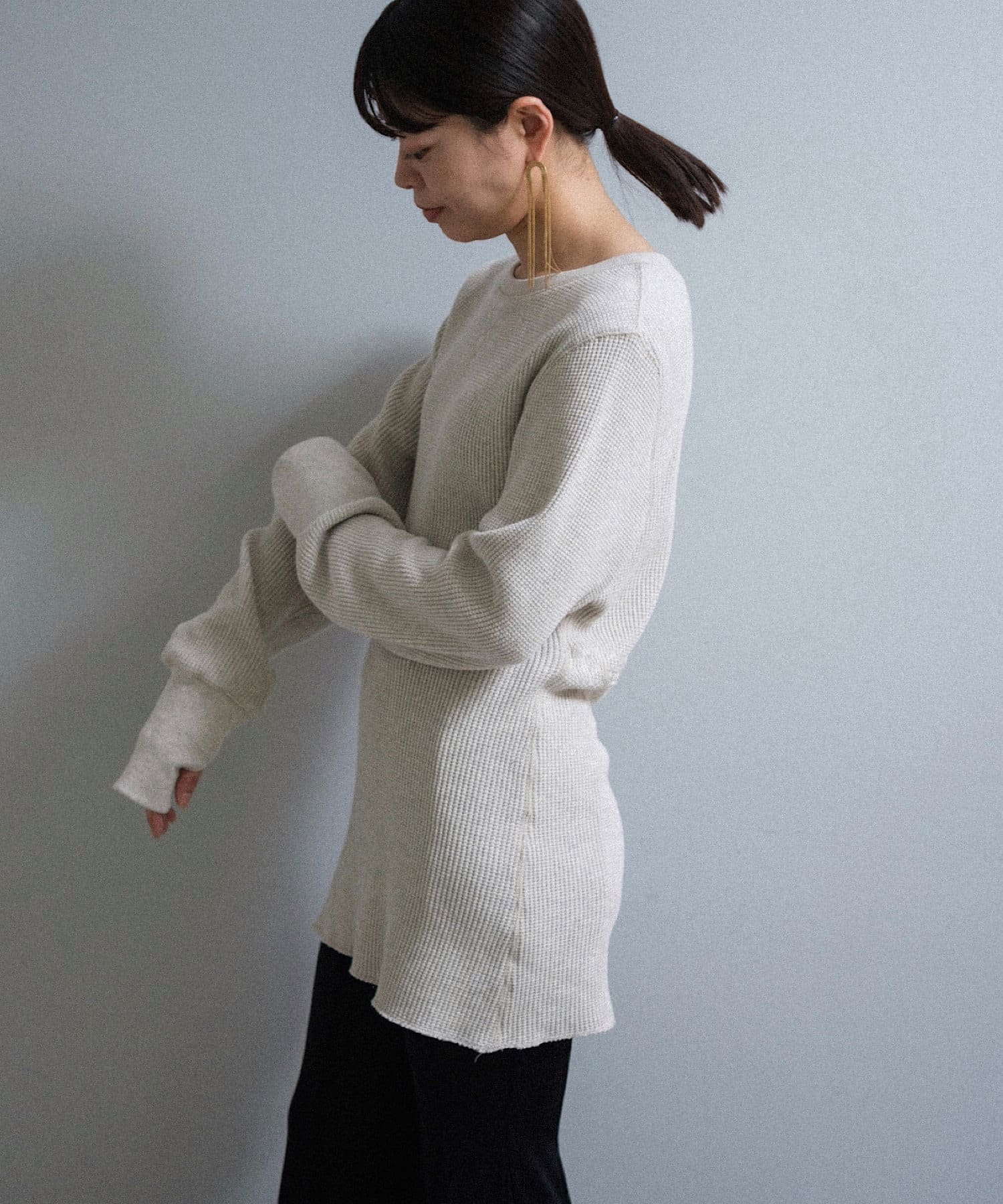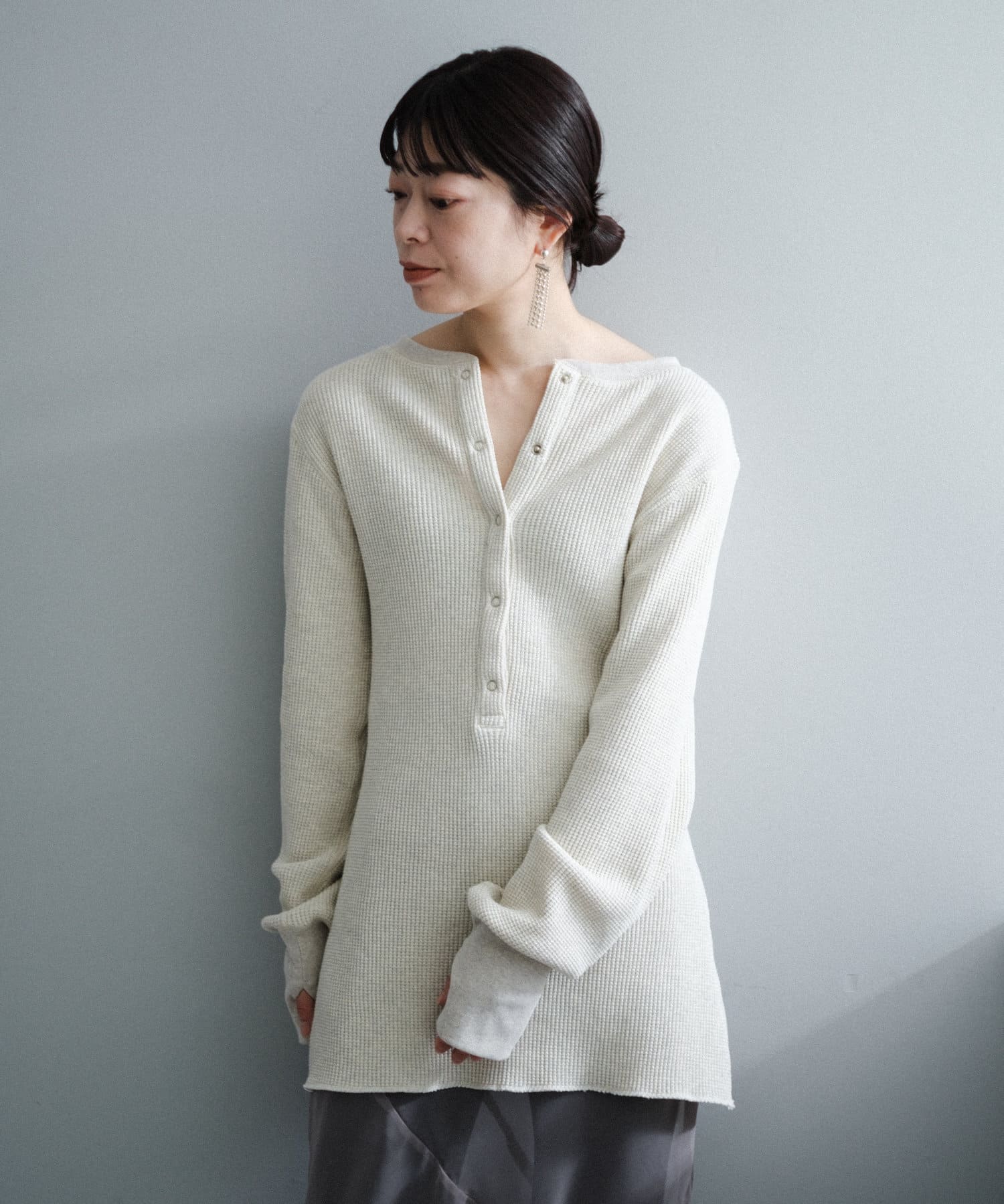 今シーズンはずっと欲しかった、“理想のサーマル”を作りました。特筆すべきポイントは、毎日着てもくたびれないタフで気持ちの良い生地感と、スタイルが綺麗に見えるシルエット。空気の力で撚られたオープンエンド糸を使用した国内生産の綿100%のワッフル生地を採用しており、その独特の膨らみ感ともちもちとした心地よい生地の伸び感が、非常に気持ちが良くずっと着ていたくなる一着です。空紡糸ならではのシャリっとした粗野な表面感も特徴的。