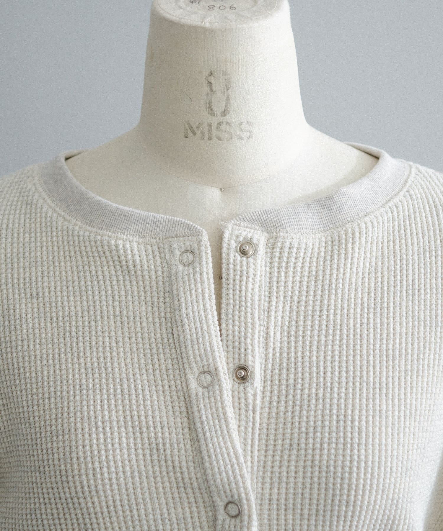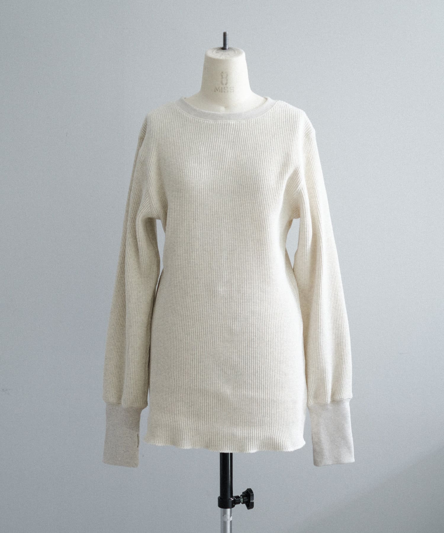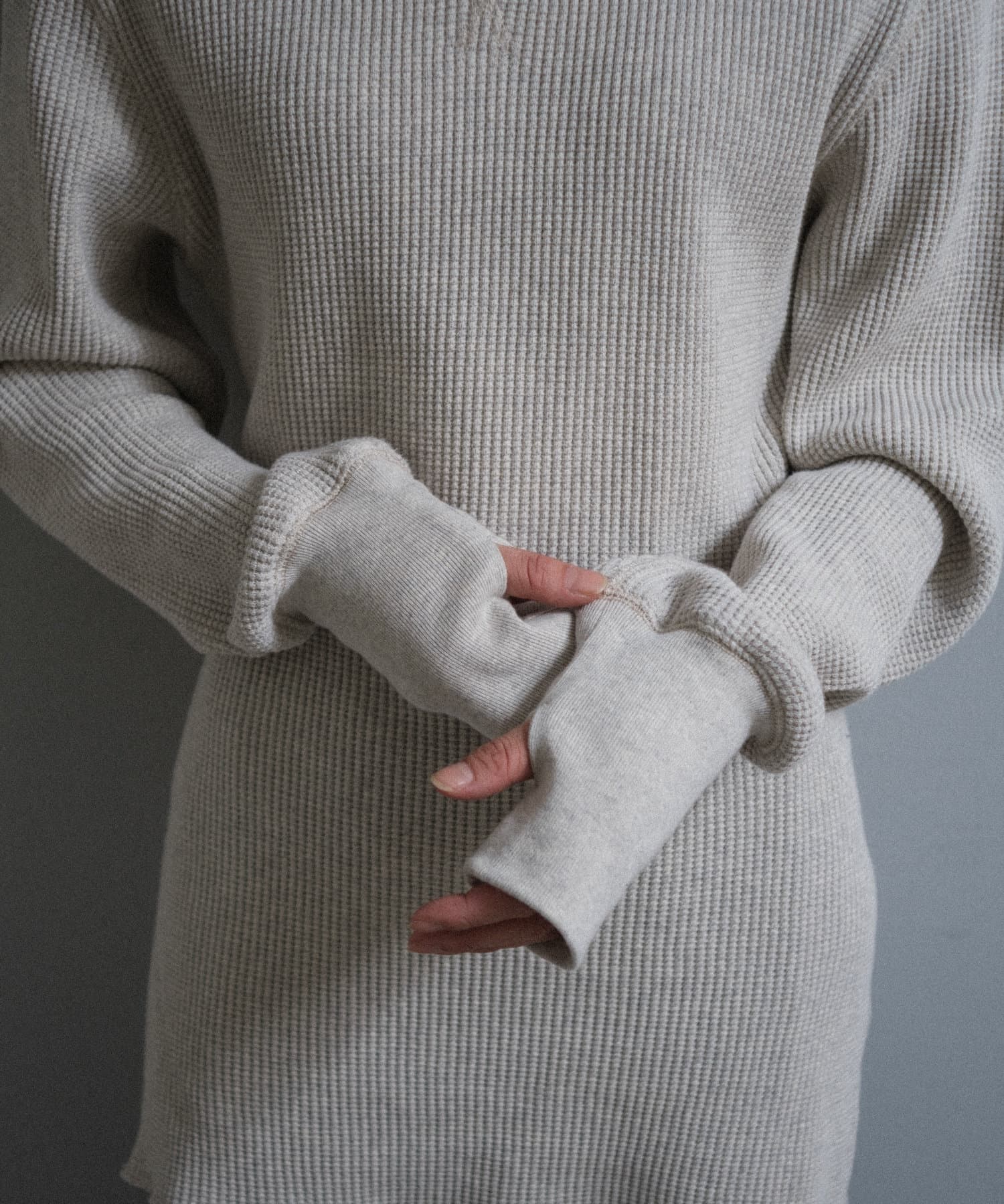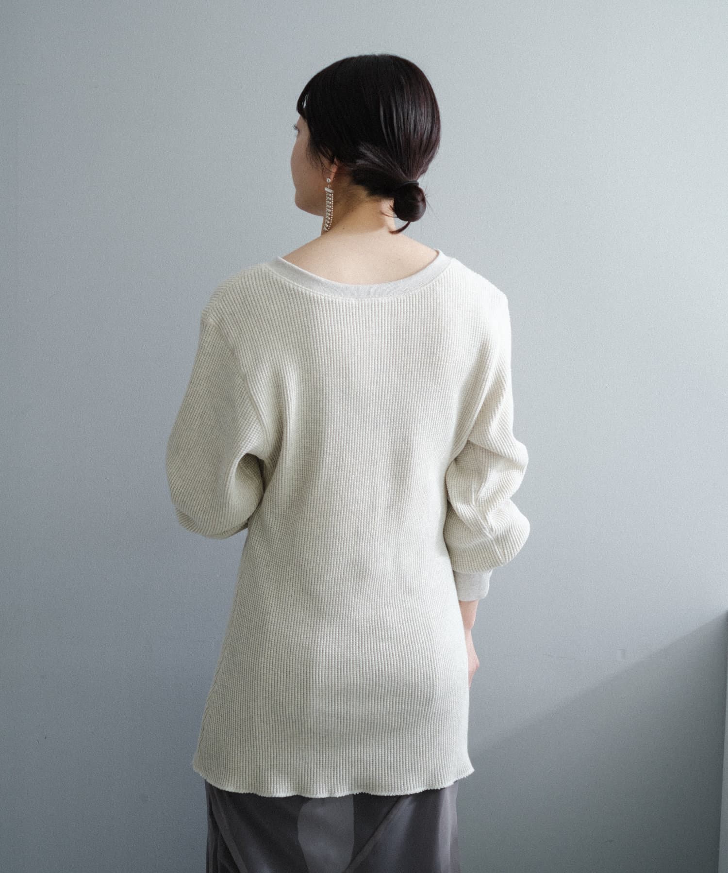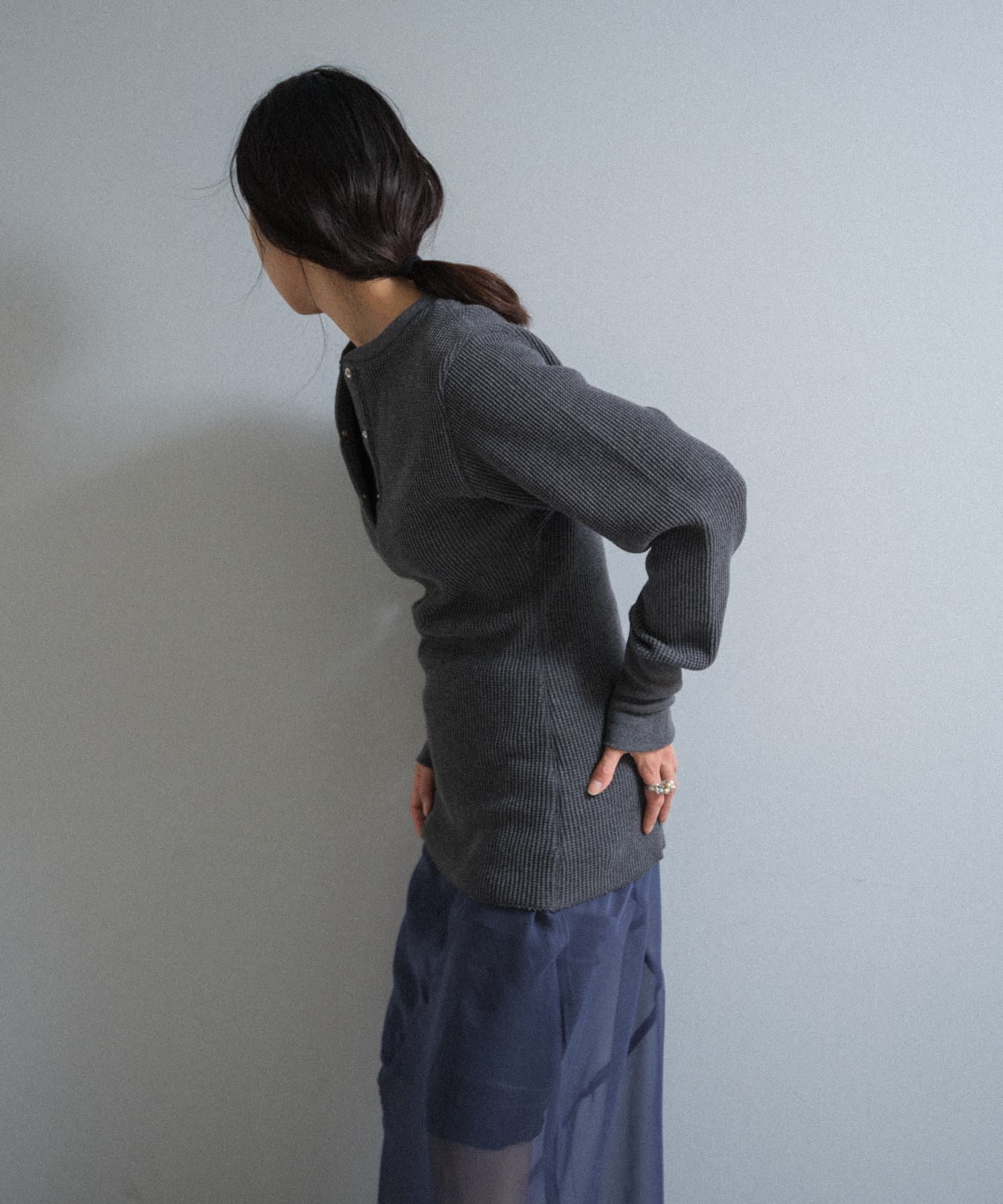 今シーズンはずっと欲しかった、“理想のサーマル”を作りました。特筆すべきポイントは、毎日着てもくたびれないタフで気持ちの良い生地感と、スタイルが綺麗に見えるシルエット。空気の力で撚られたオープンエンド糸を使用した国内生産の綿100%のワッフル生地を採用しており、その独特の膨らみ感ともちもちとした心地よい生地の伸び感が、非常に気持ちが良くずっと着ていたくなる一着です。空紡糸ならではのシャリっとした粗野な表面感も特徴的。
