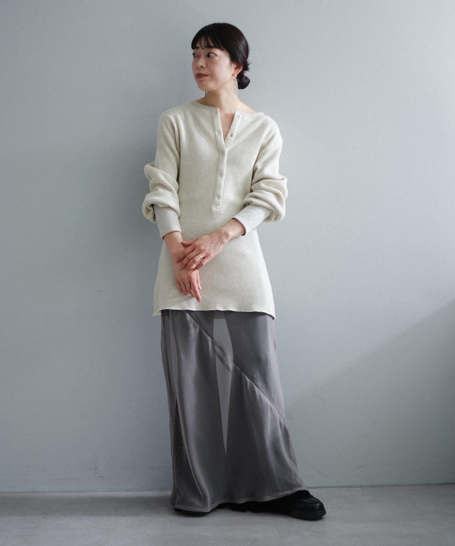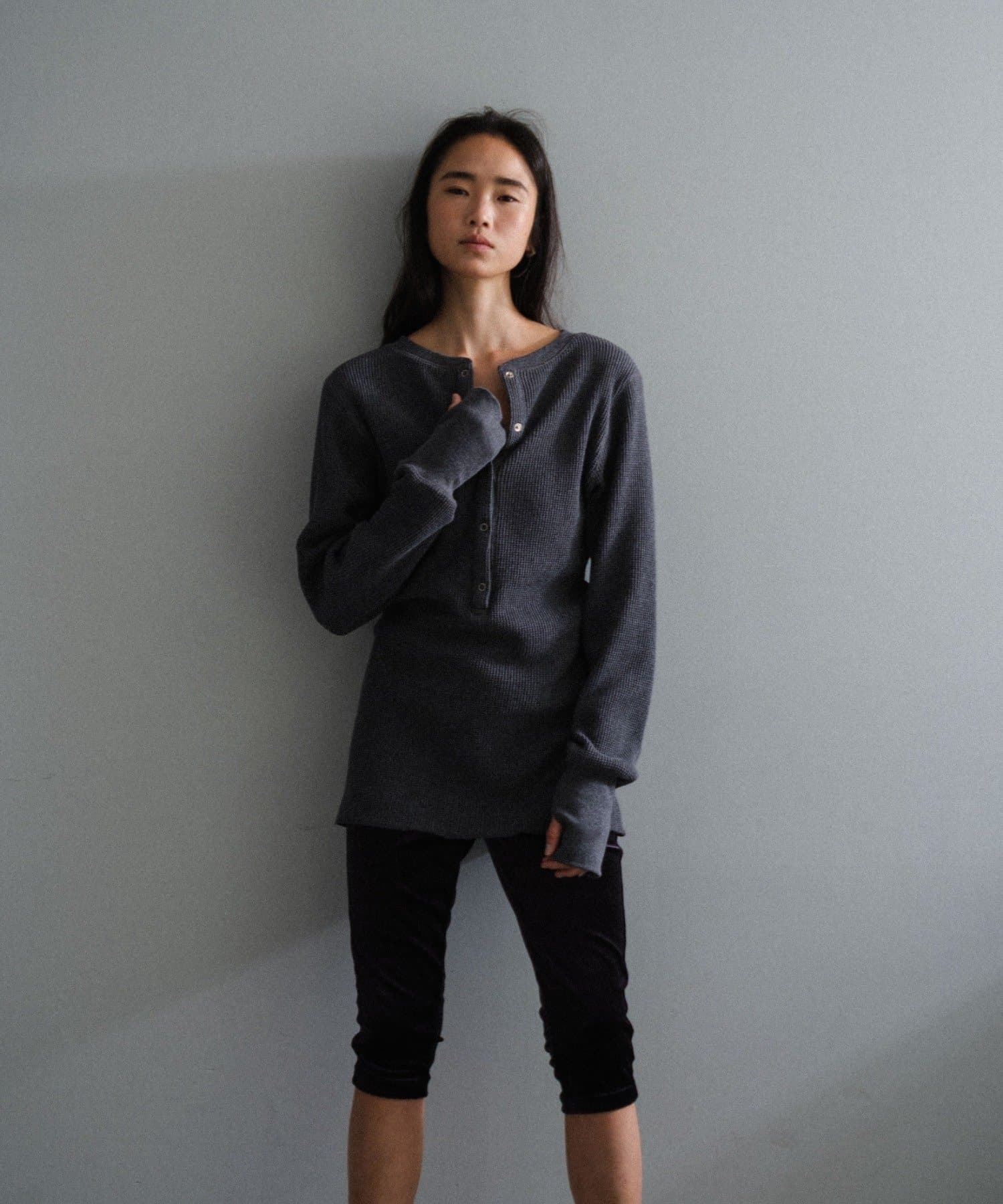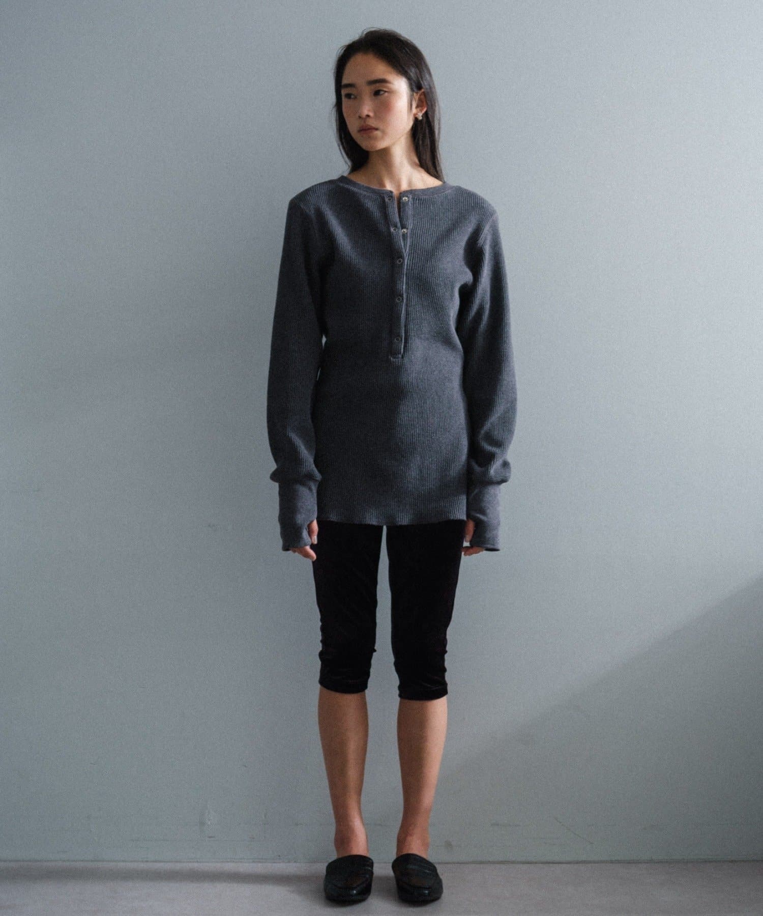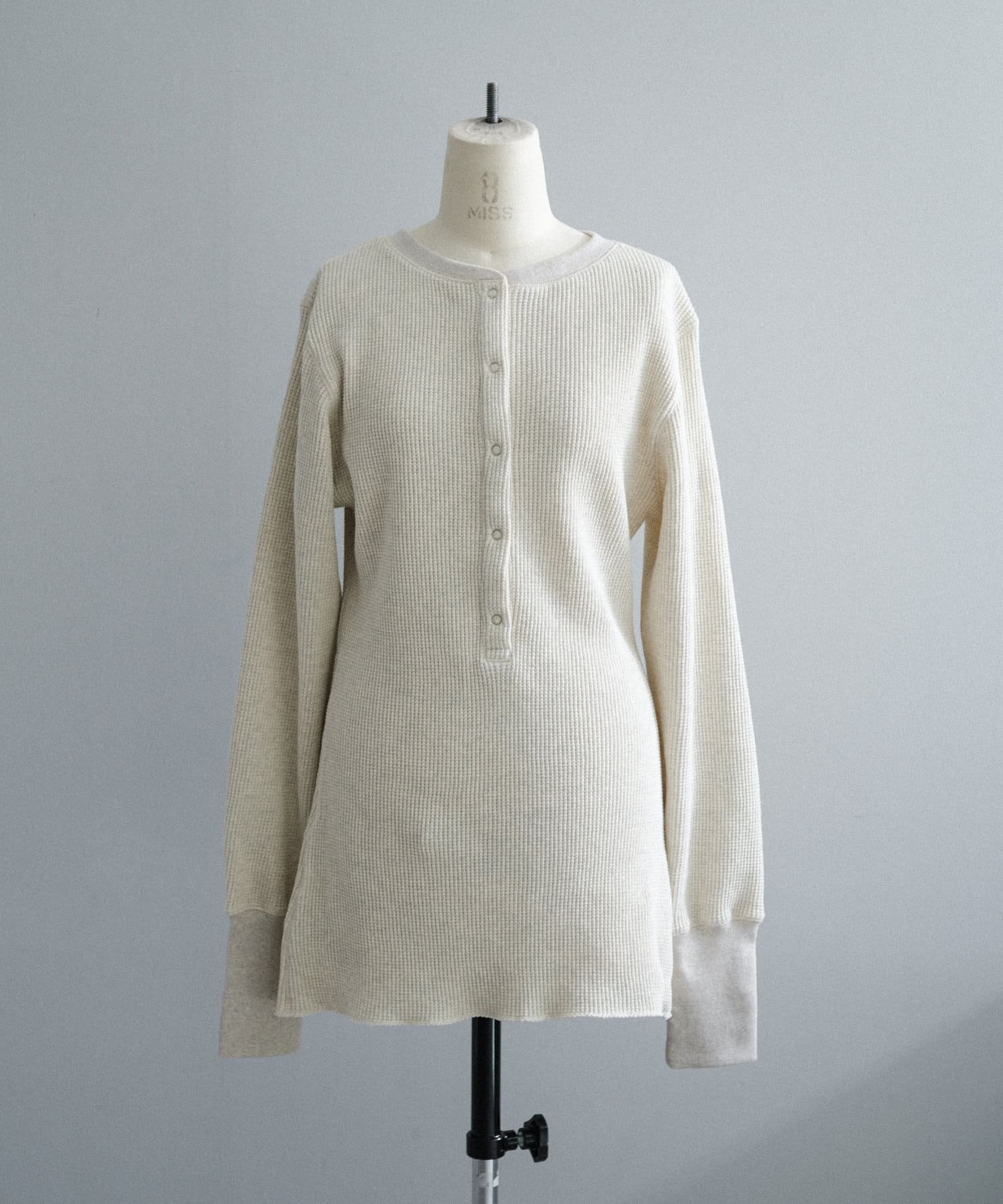 今シーズンはずっと欲しかった、“理想のサーマル”を作りました。特筆すべきポイントは、毎日着てもくたびれないタフで気持ちの良い生地感と、スタイルが綺麗に見えるシルエット。空気の力で撚られたオープンエンド糸を使用した国内生産の綿100%のワッフル生地を採用しており、その独特の膨らみ感ともちもちとした心地よい生地の伸び感が、非常に気持ちが良くずっと着ていたくなる一着です。空紡糸ならではのシャリっとした粗野な表面感も特徴的。