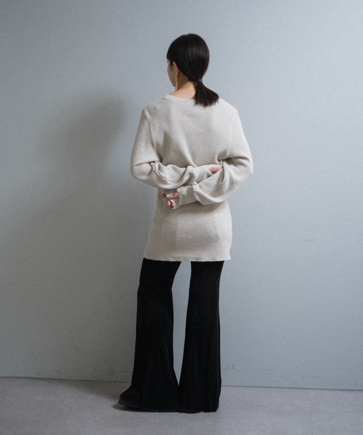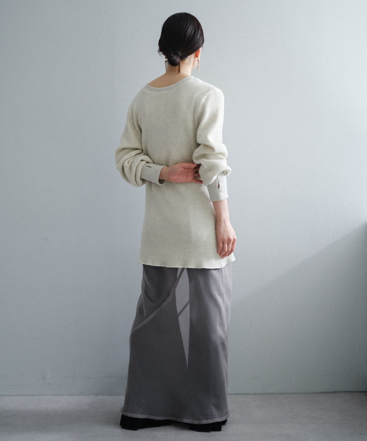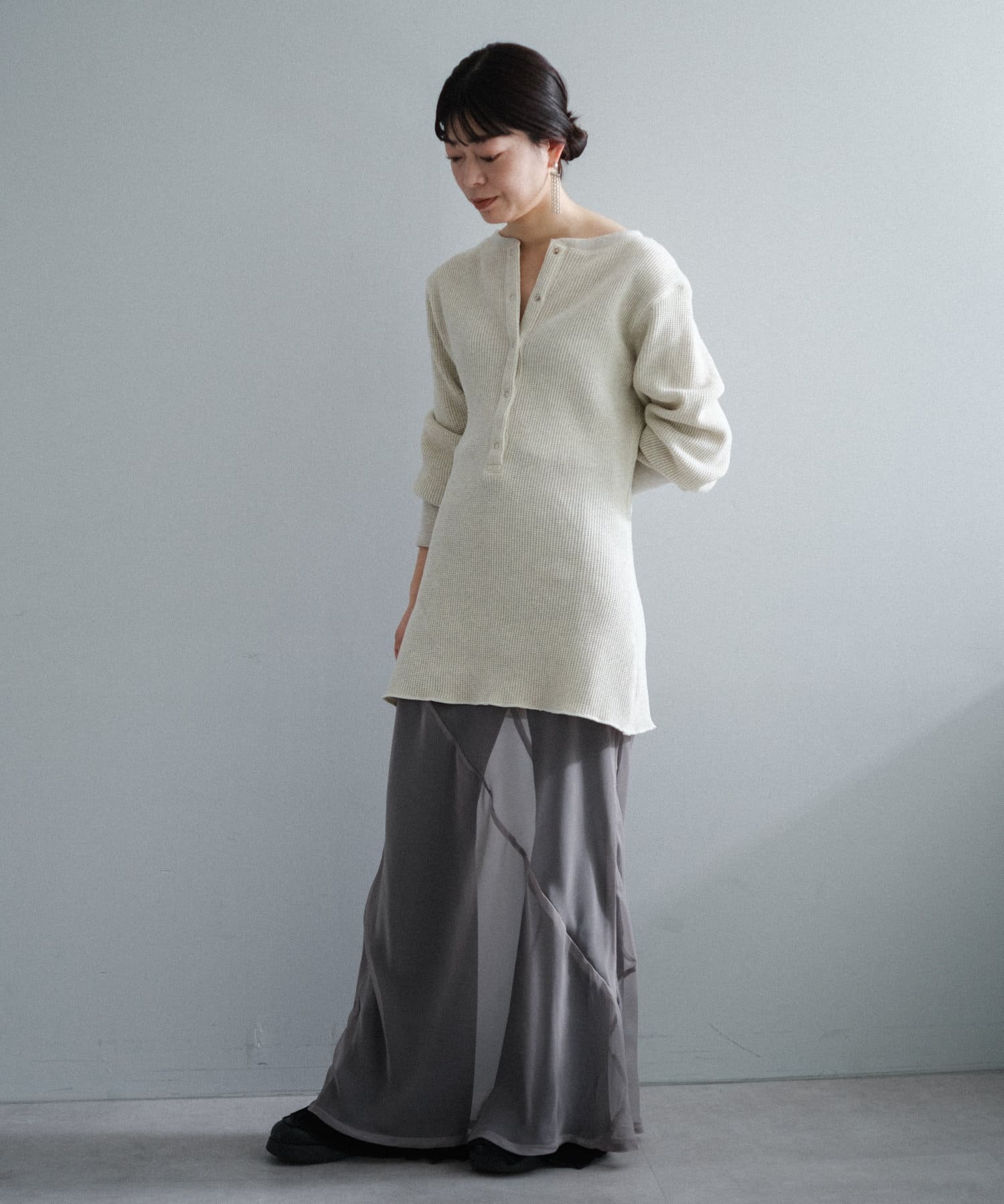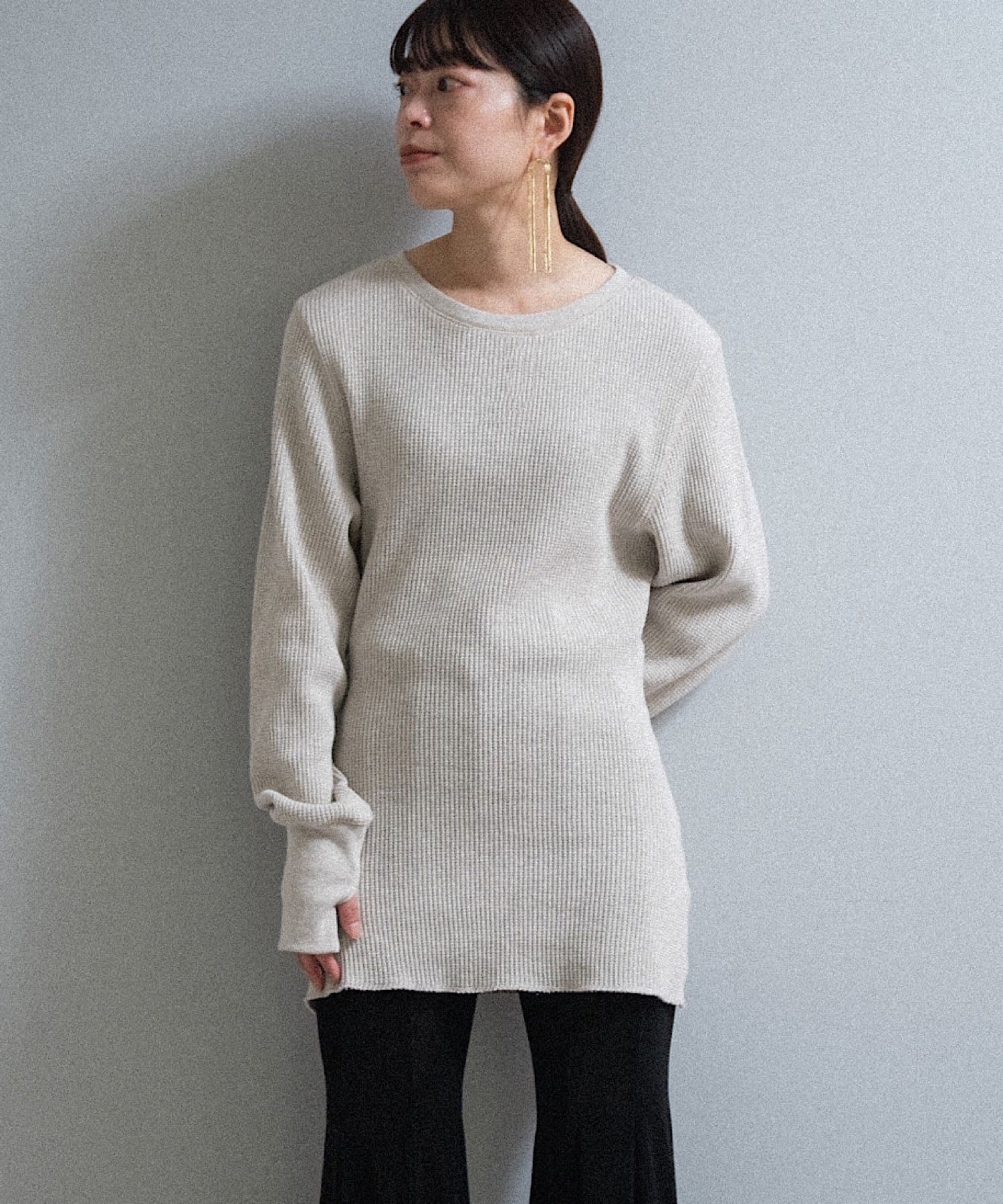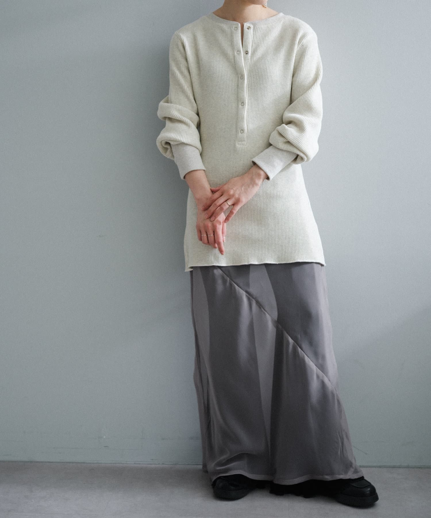 今シーズンはずっと欲しかった、“理想のサーマル”を作りました。特筆すべきポイントは、毎日着てもくたびれないタフで気持ちの良い生地感と、スタイルが綺麗に見えるシルエット。空気の力で撚られたオープンエンド糸を使用した国内生産の綿100%のワッフル生地を採用しており、その独特の膨らみ感ともちもちとした心地よい生地の伸び感が、非常に気持ちが良くずっと着ていたくなる一着です。空紡糸ならではのシャリっとした粗野な表面感も特徴的。
