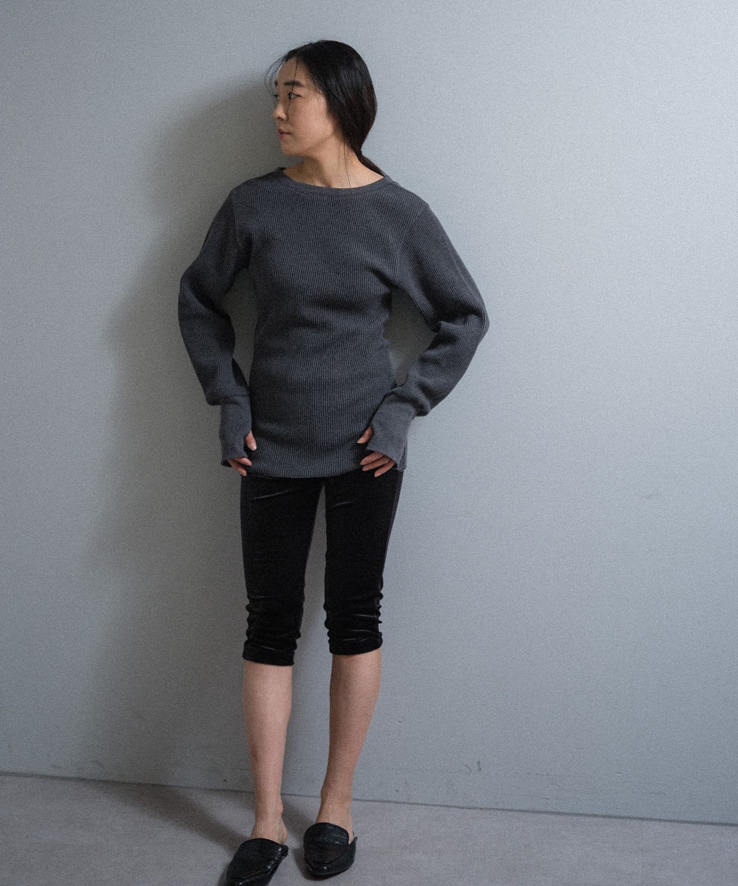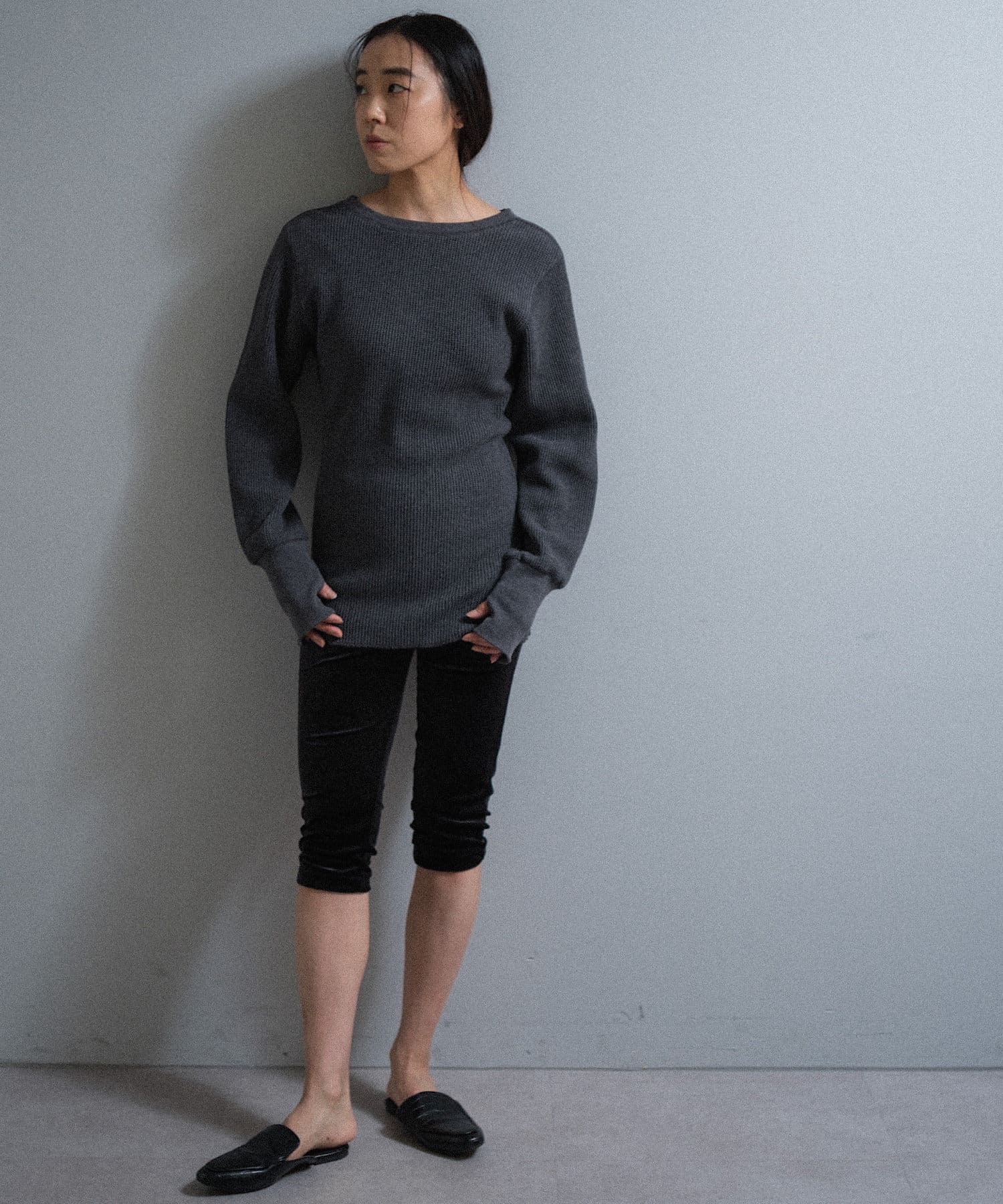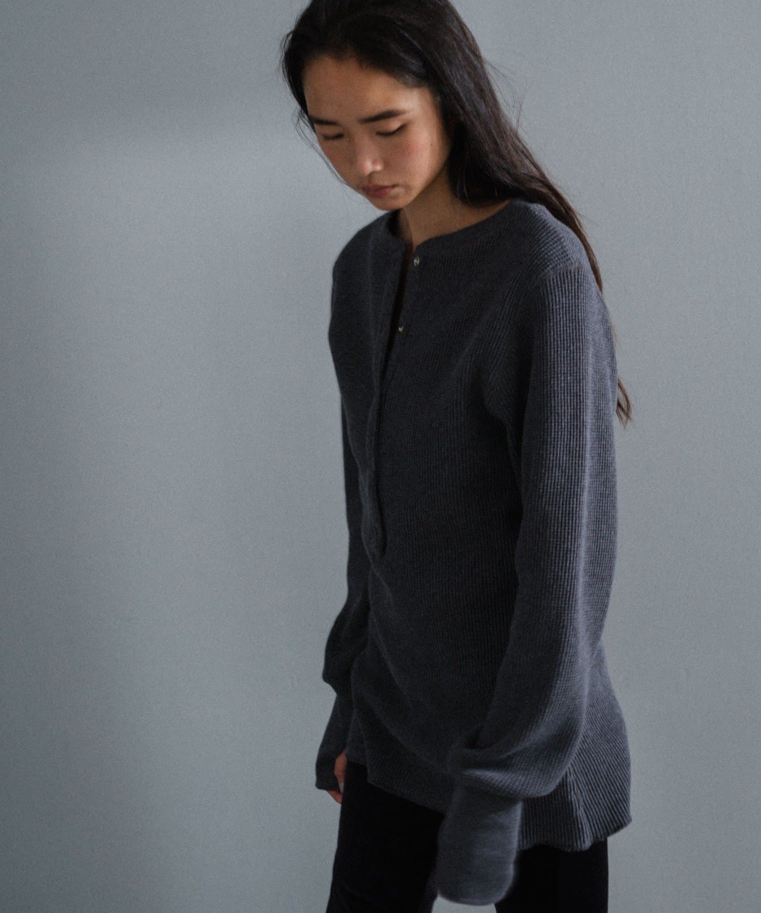 カラーは杢糸を使用した雰囲気の良いチャコールと、白ほど明るすぎず顔がくすまないライトグレー。どちらも捨てがたい万能な2色です。