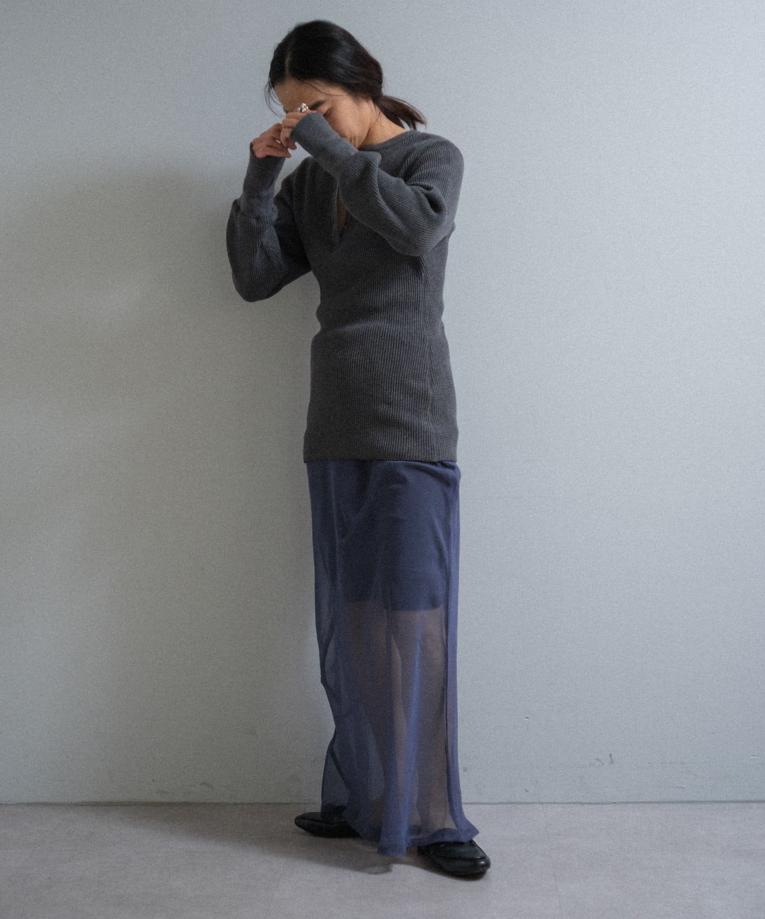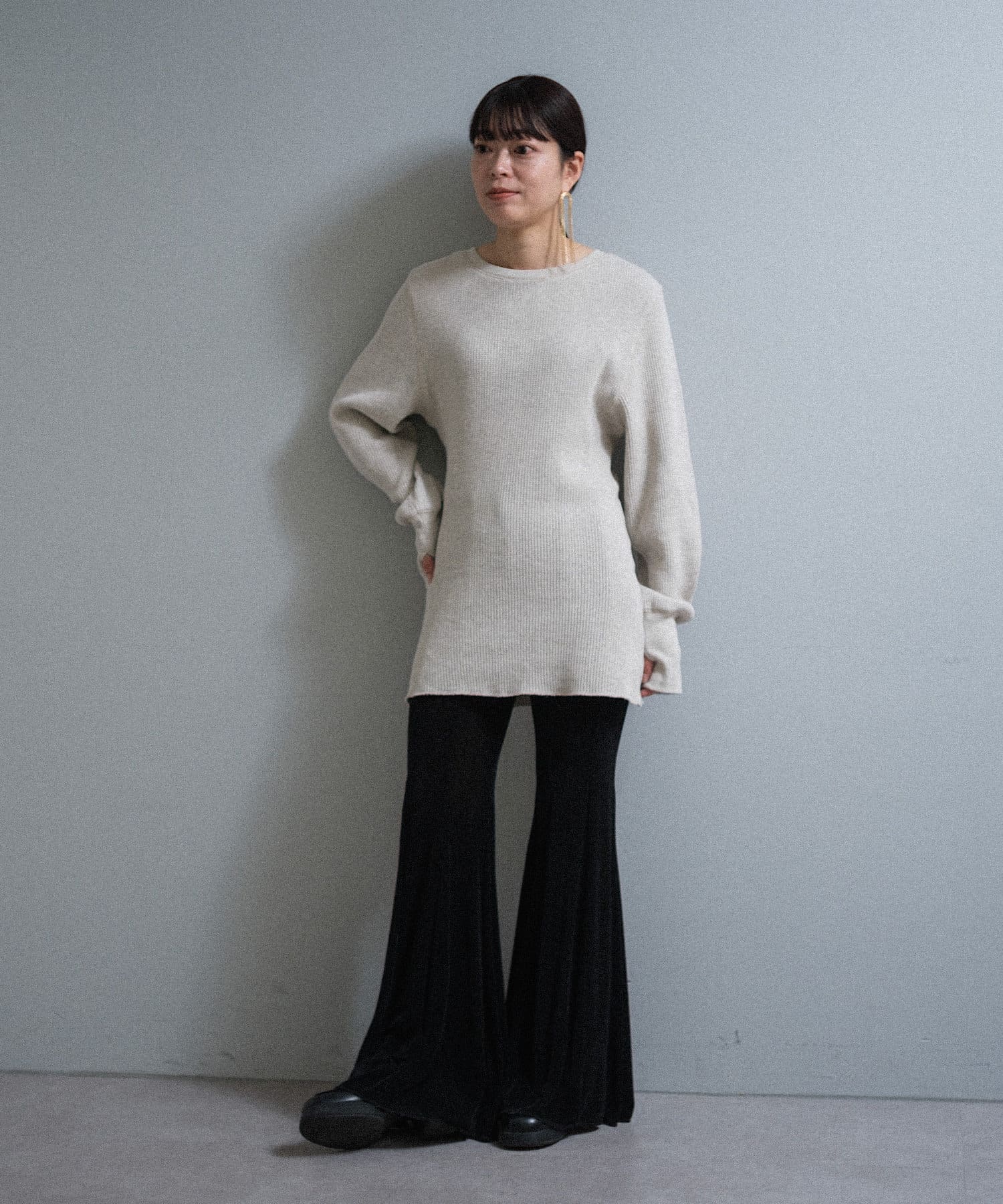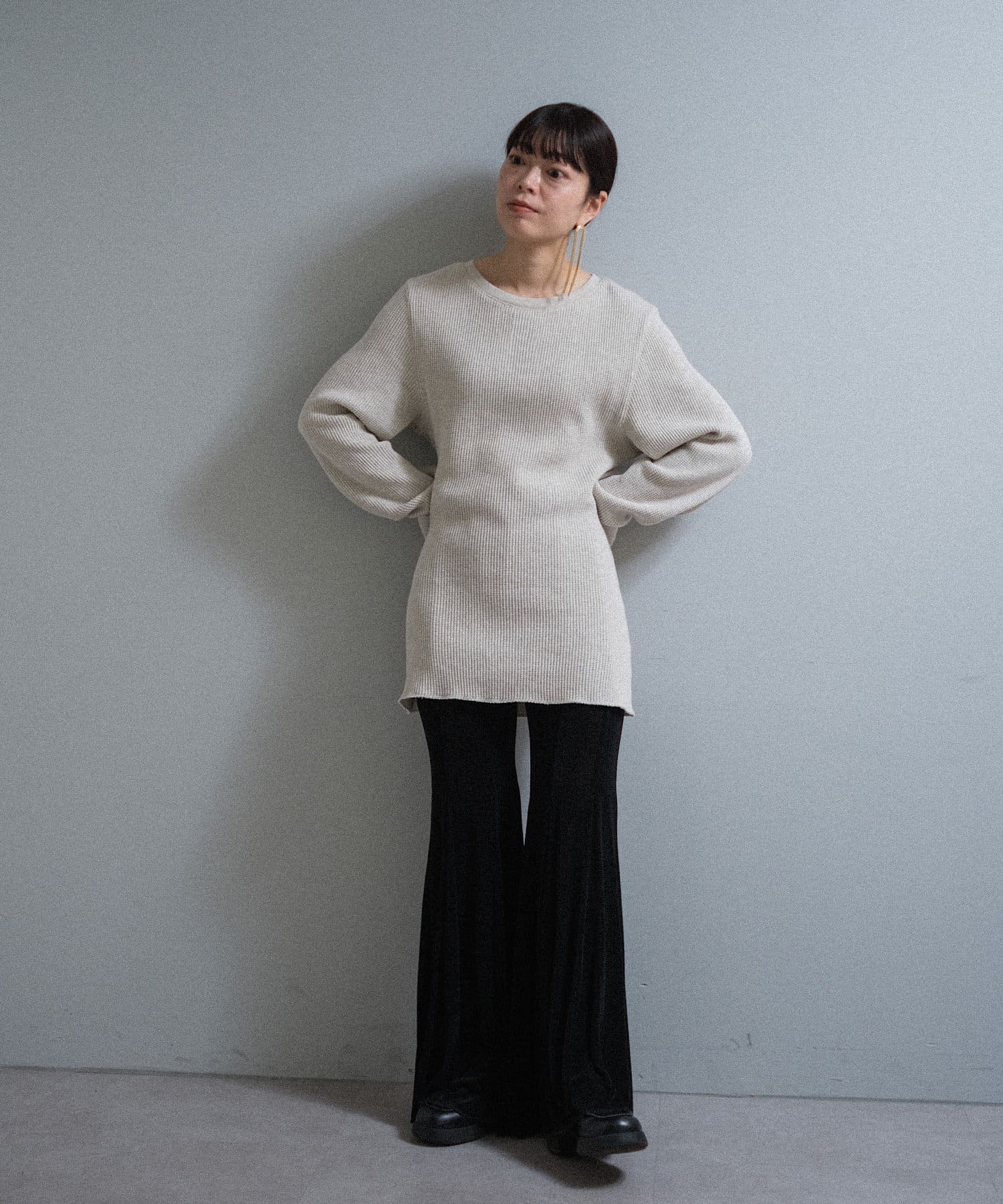 カラーは杢糸を使用した雰囲気の良いチャコールと、白ほど明るすぎず顔がくすまないライトグレー。どちらも捨てがたい万能な2色です。