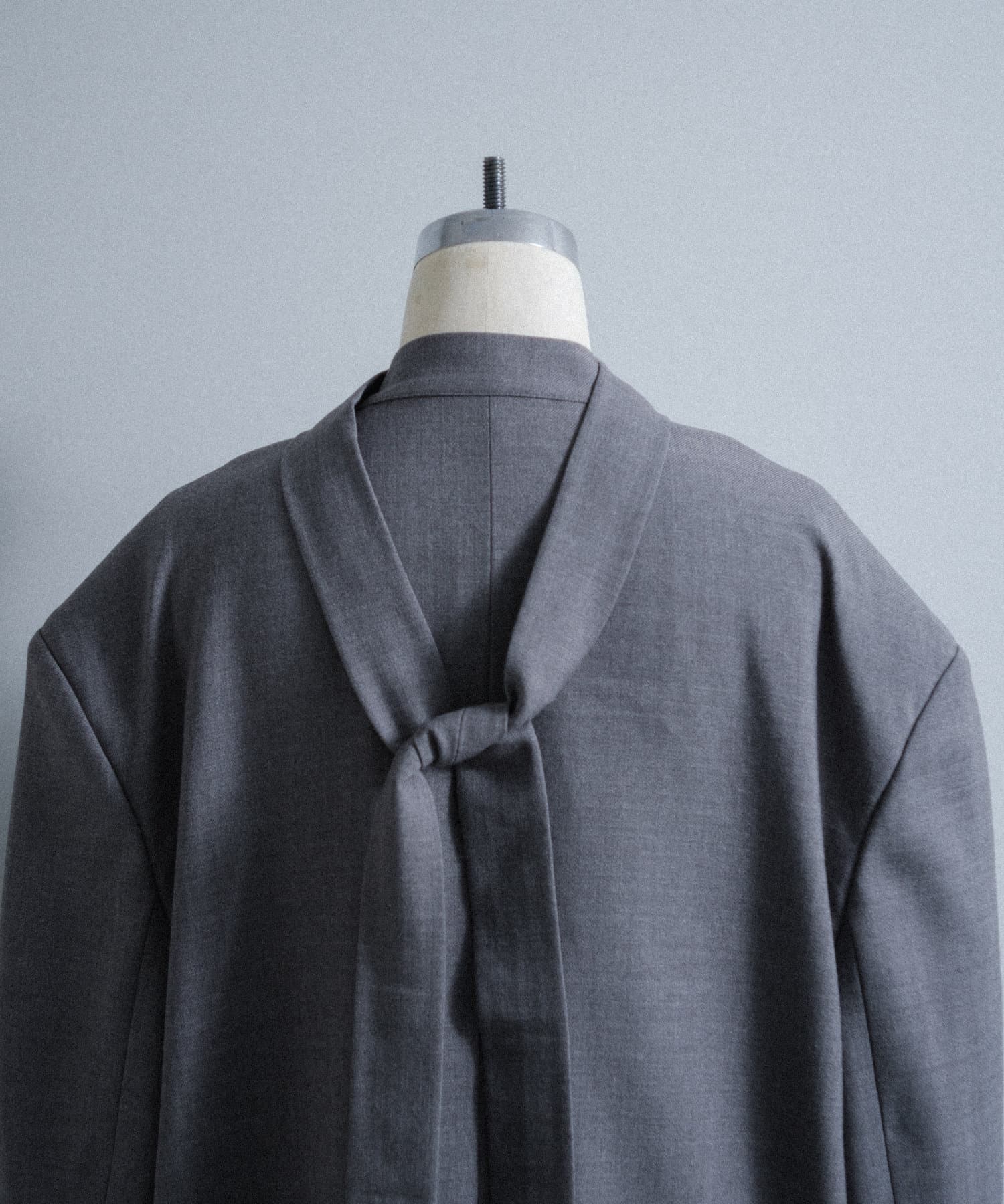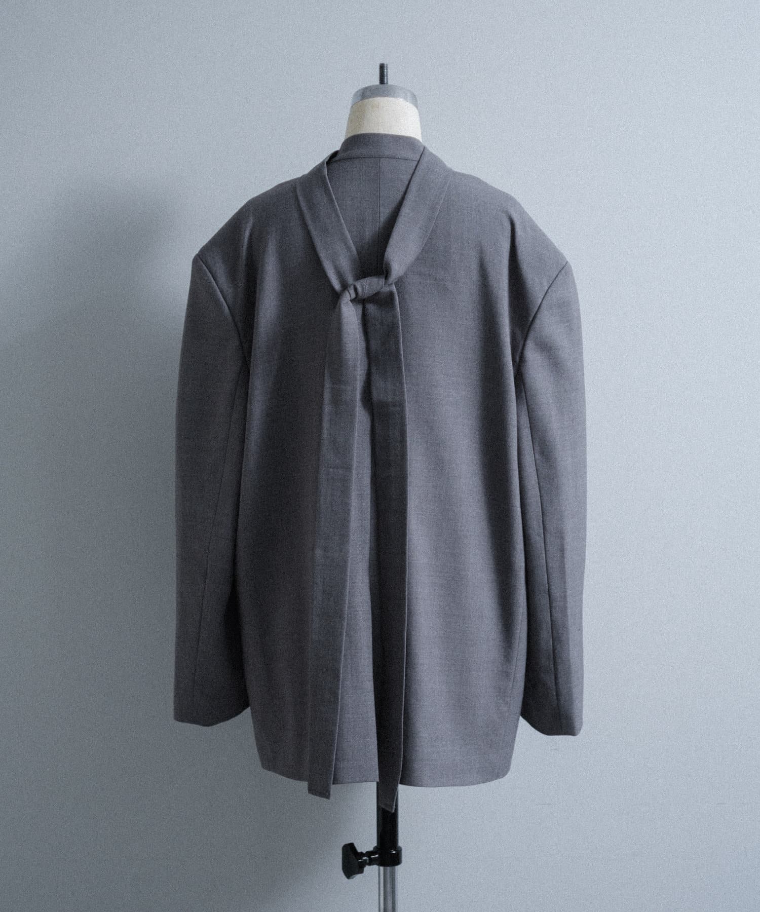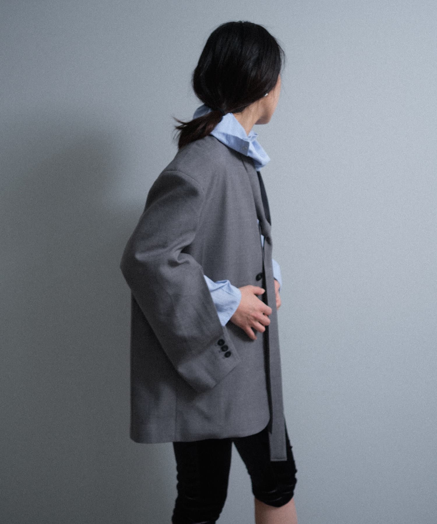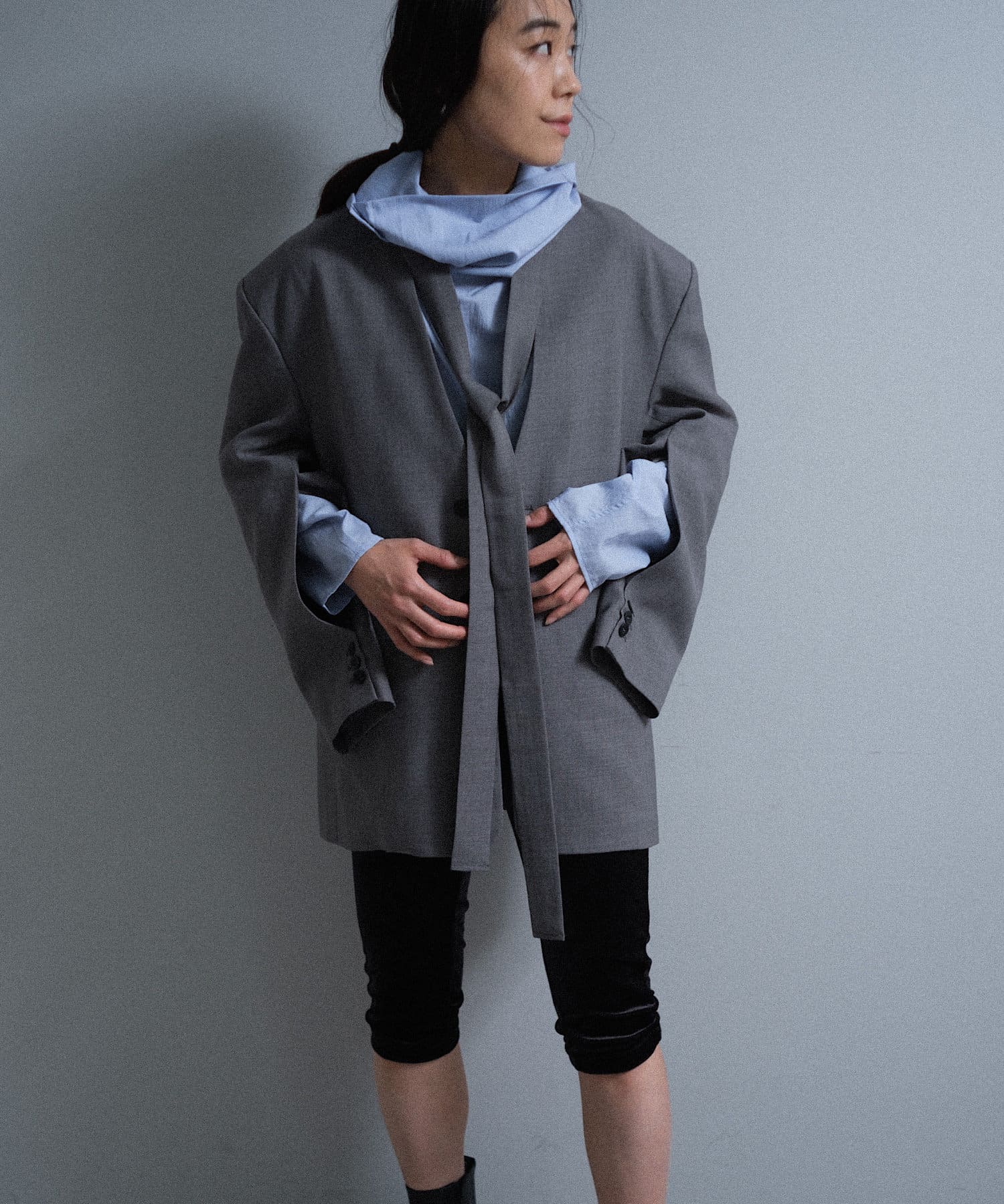 シャツやブラウスなどを中に重ねやすいよう、ジャケットの襟は取り払っています。付属で着脱可能なボウタイリボンをSETにしているので、首元が寂しい時は首元に巻いたり、ベルトとして腰に巻いたり、自由にアレンジしてお使いください。