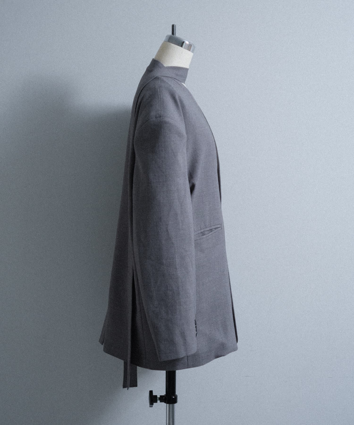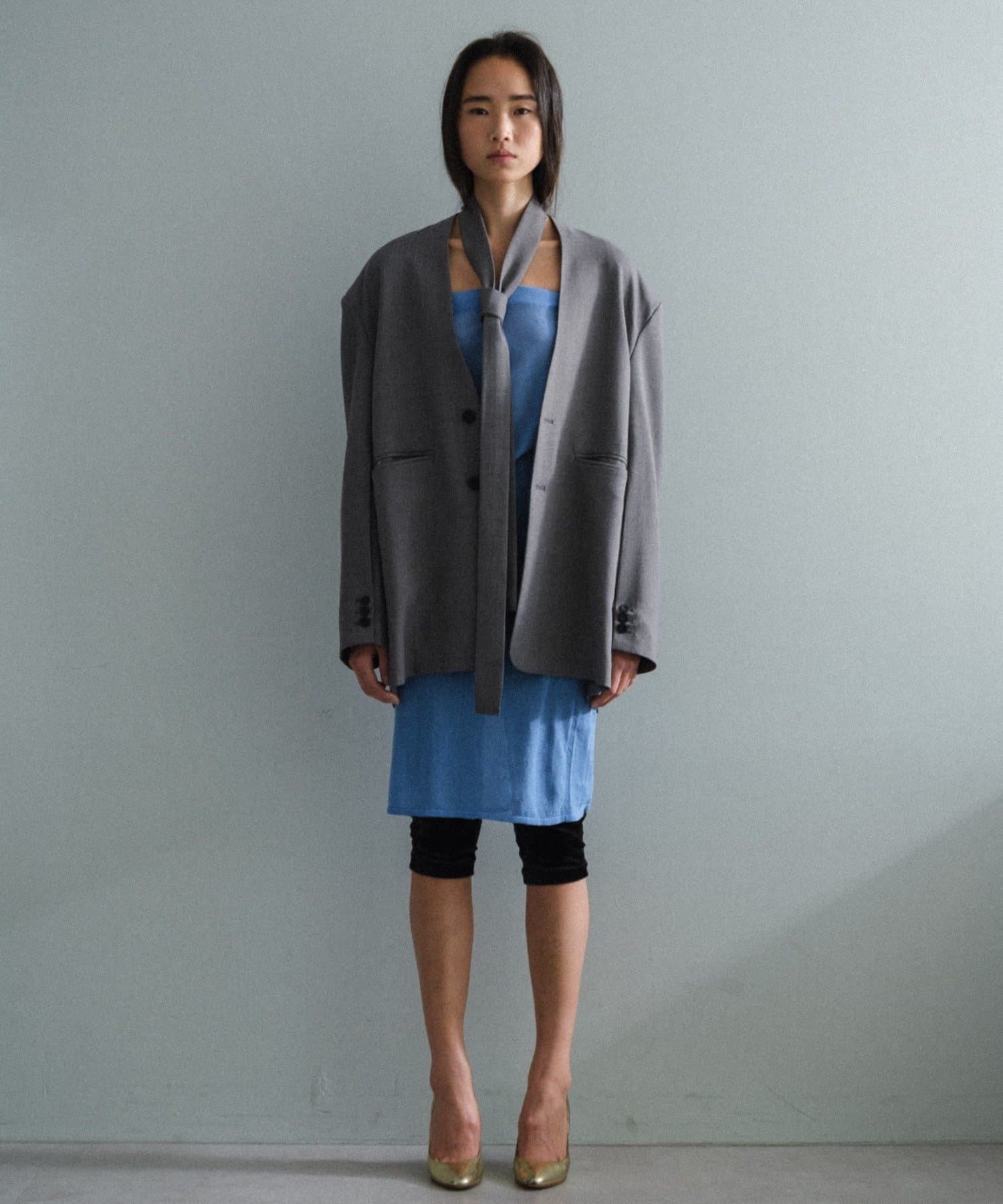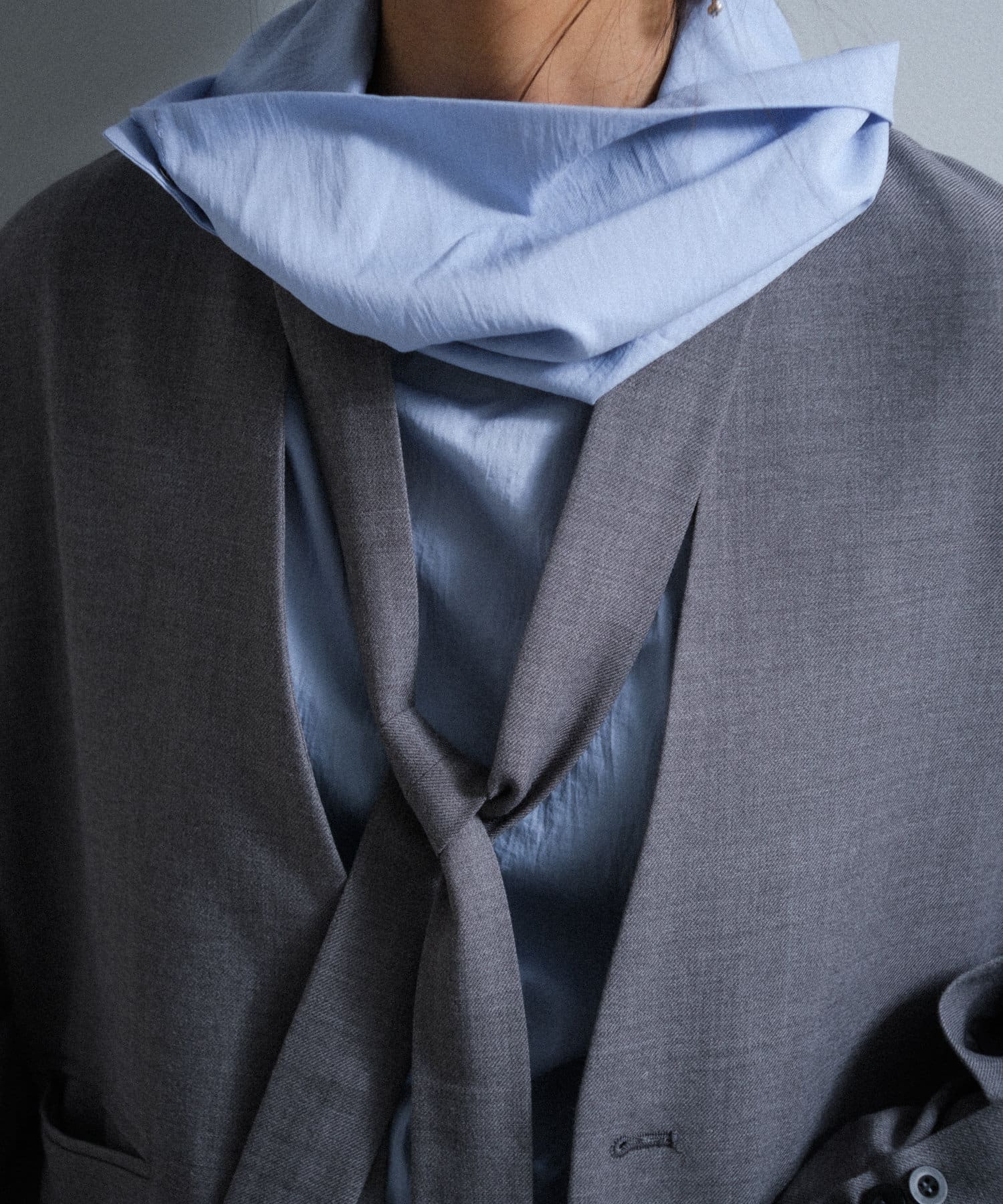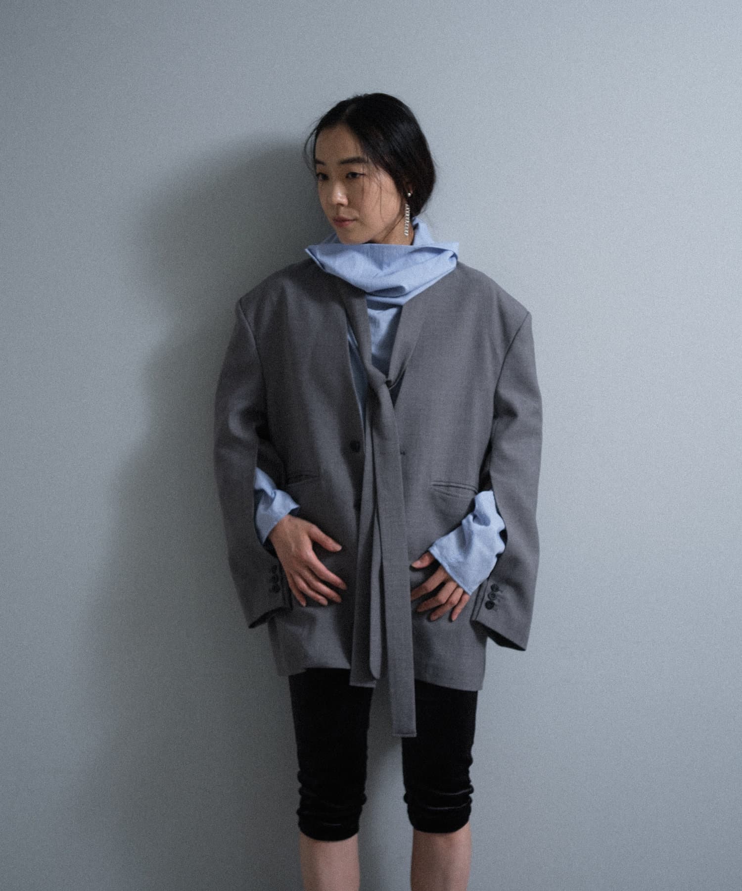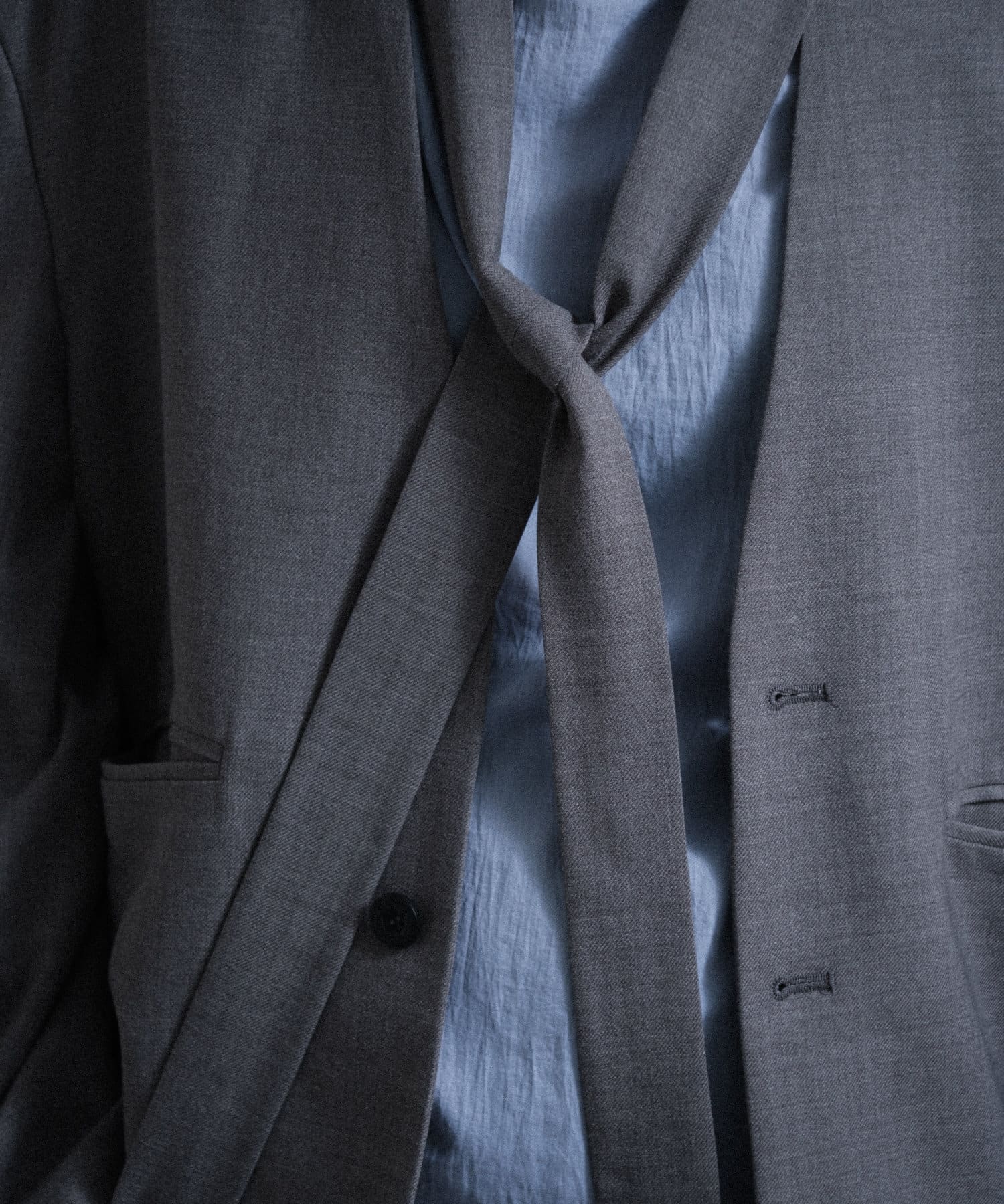 シャツやブラウスなどを中に重ねやすいよう、ジャケットの襟は取り払っています。付属で着脱可能なボウタイリボンをSETにしているので、首元が寂しい時は首元に巻いたり、ベルトとして腰に巻いたり、自由にアレンジしてお使いください。
