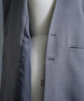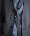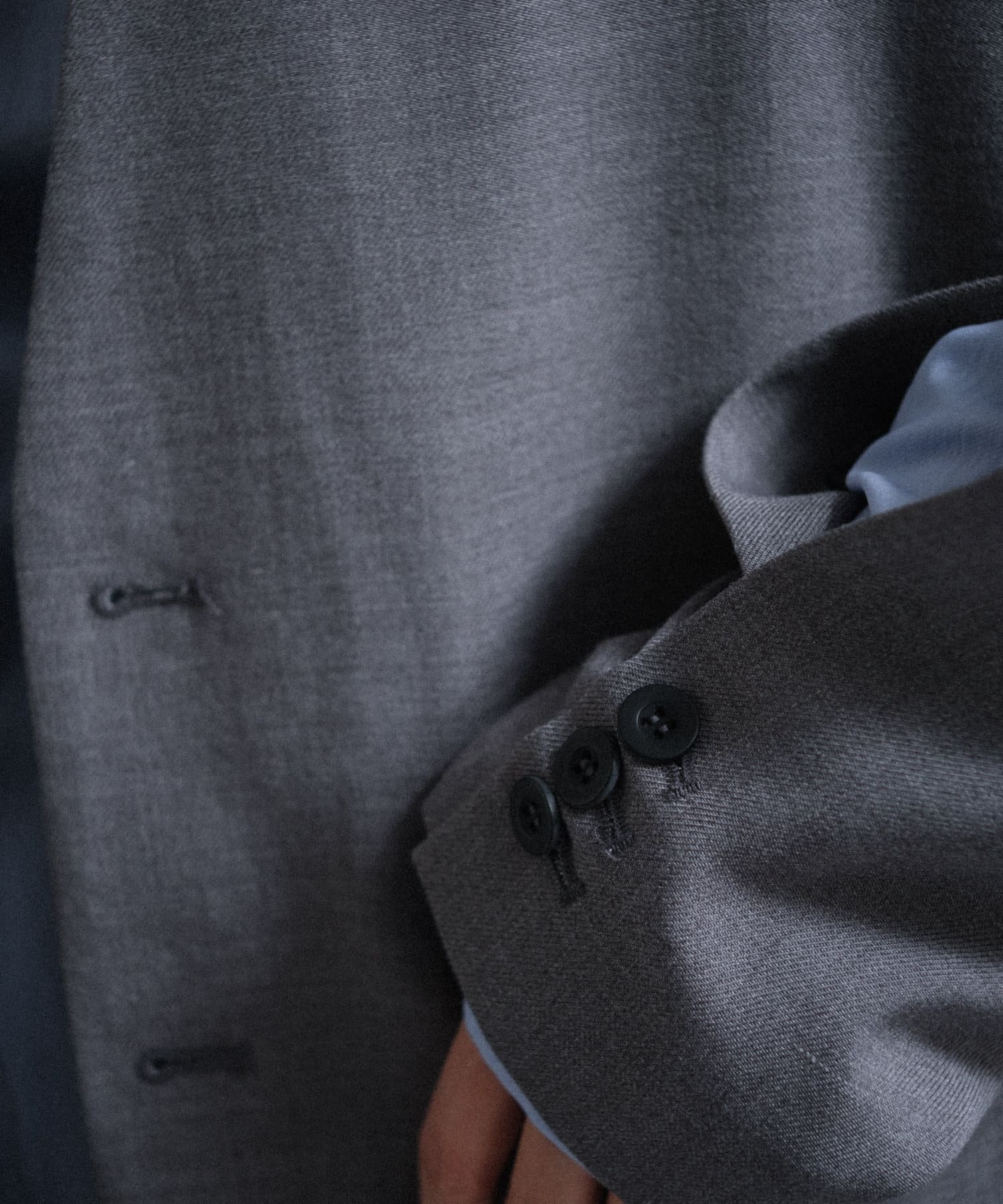 使用した生地は、ノンミュールジングウール(羊に苦痛を与えるミュールジングをせずに自然なままに飼育された羊から刈り取ったウール)を50%、リサイクルポリエステルを50%使用して仕立てられた日本生産のツイル生地。マニッシュでクラシカルなムードがありながら、微光沢のある上品で美しい生地です。厚すぎず薄すぎず季節の幅広く使える万能な中肉素材です。