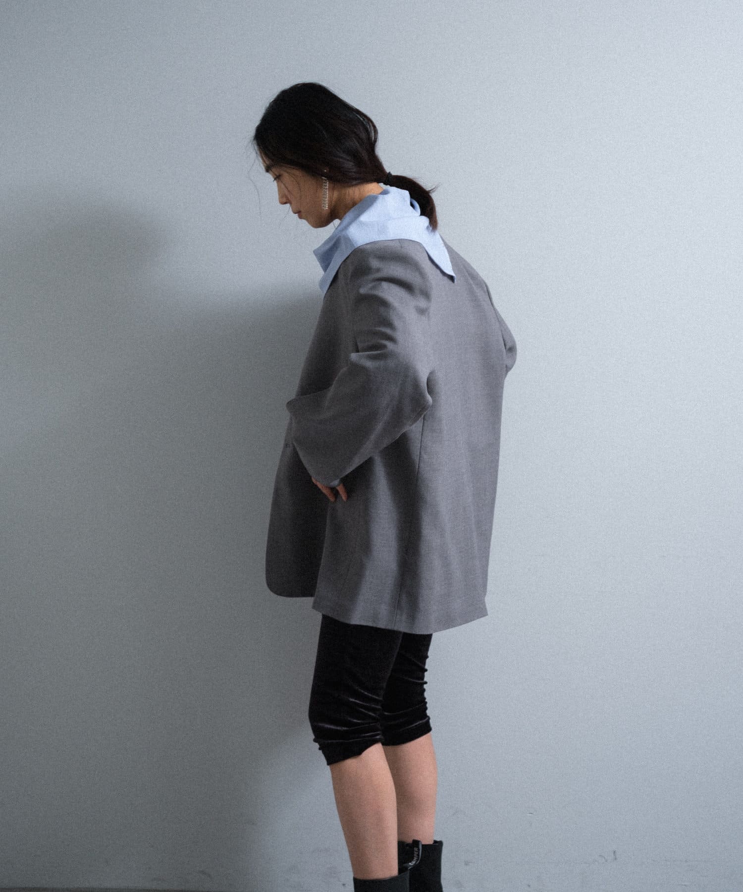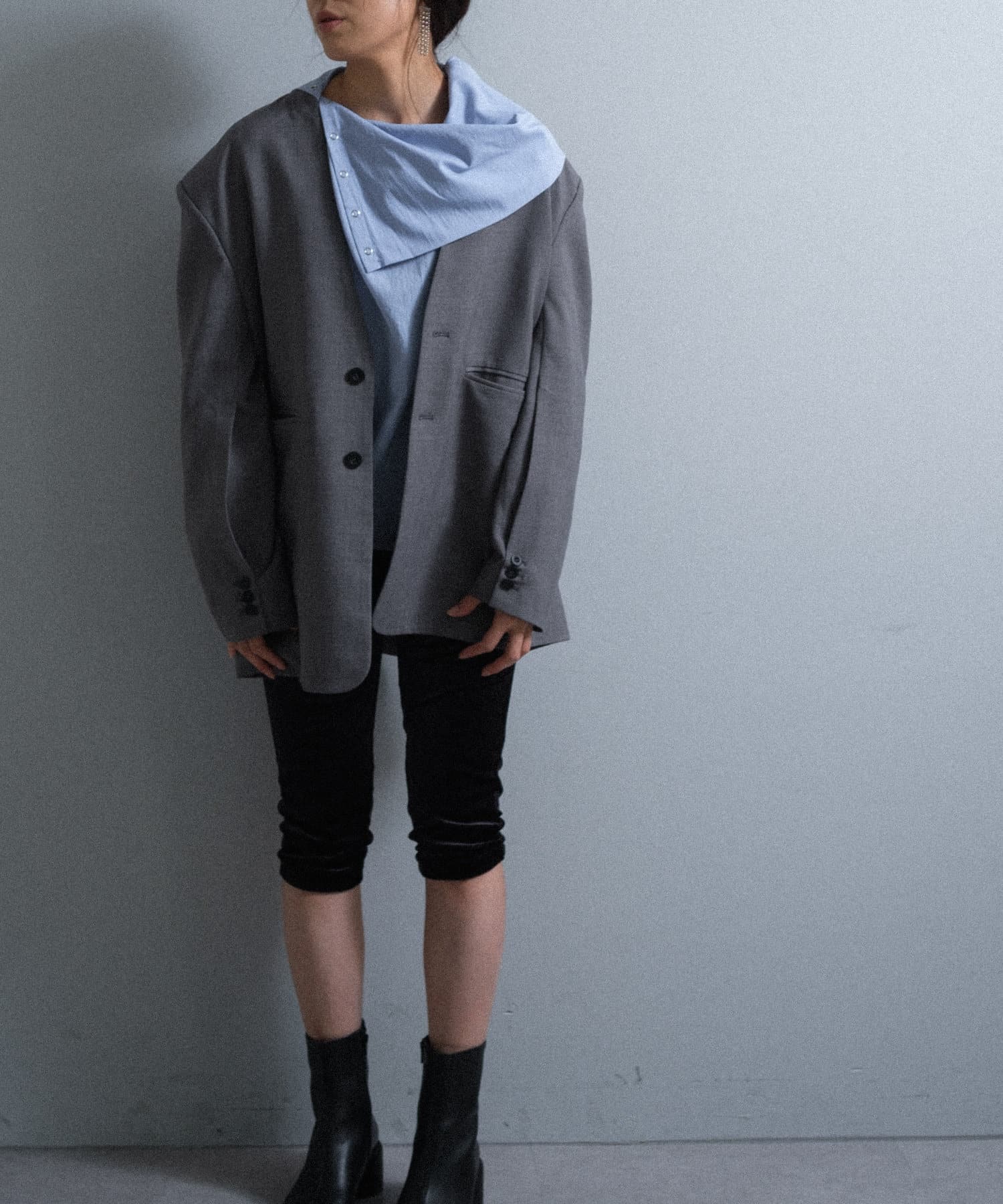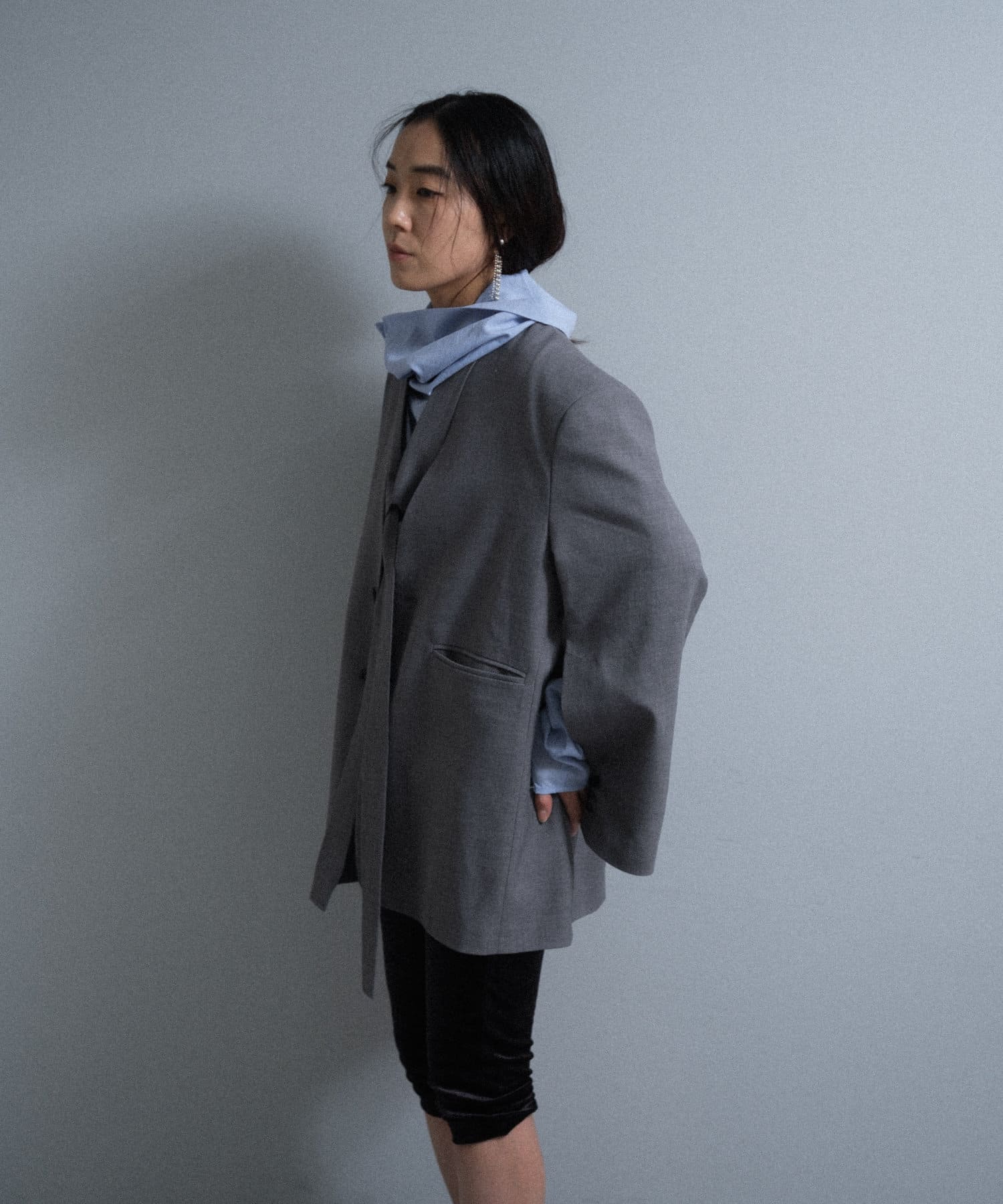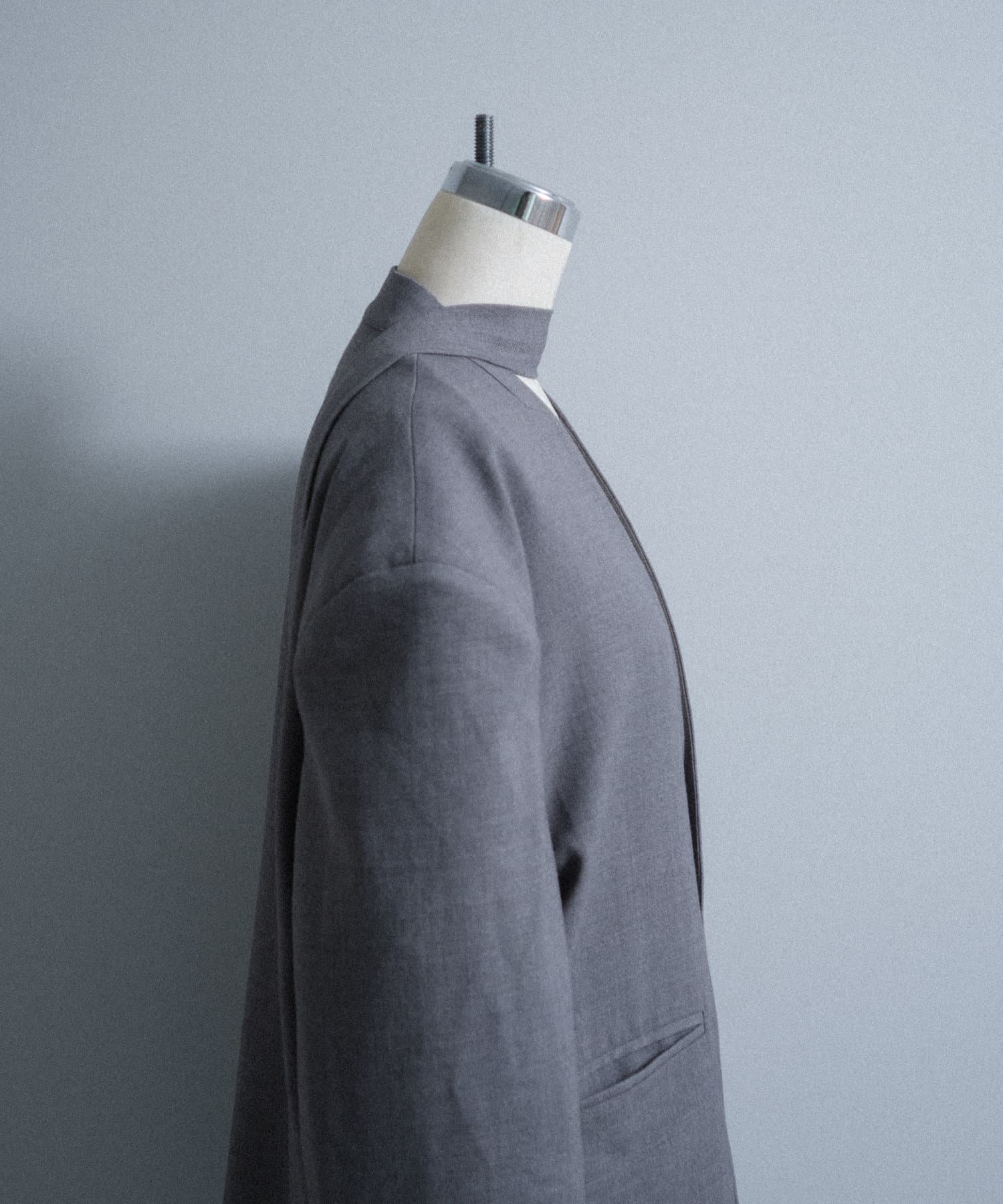 ぶかっと肩を落としたようなオーバーサイズのシルエットが気分なダッドジャケット。前シーズンから引き続き、襟なしのビッグジャケットが気分です。新しく、今シーズンのシーズナルカラーである淡いライトグレーを作りました。